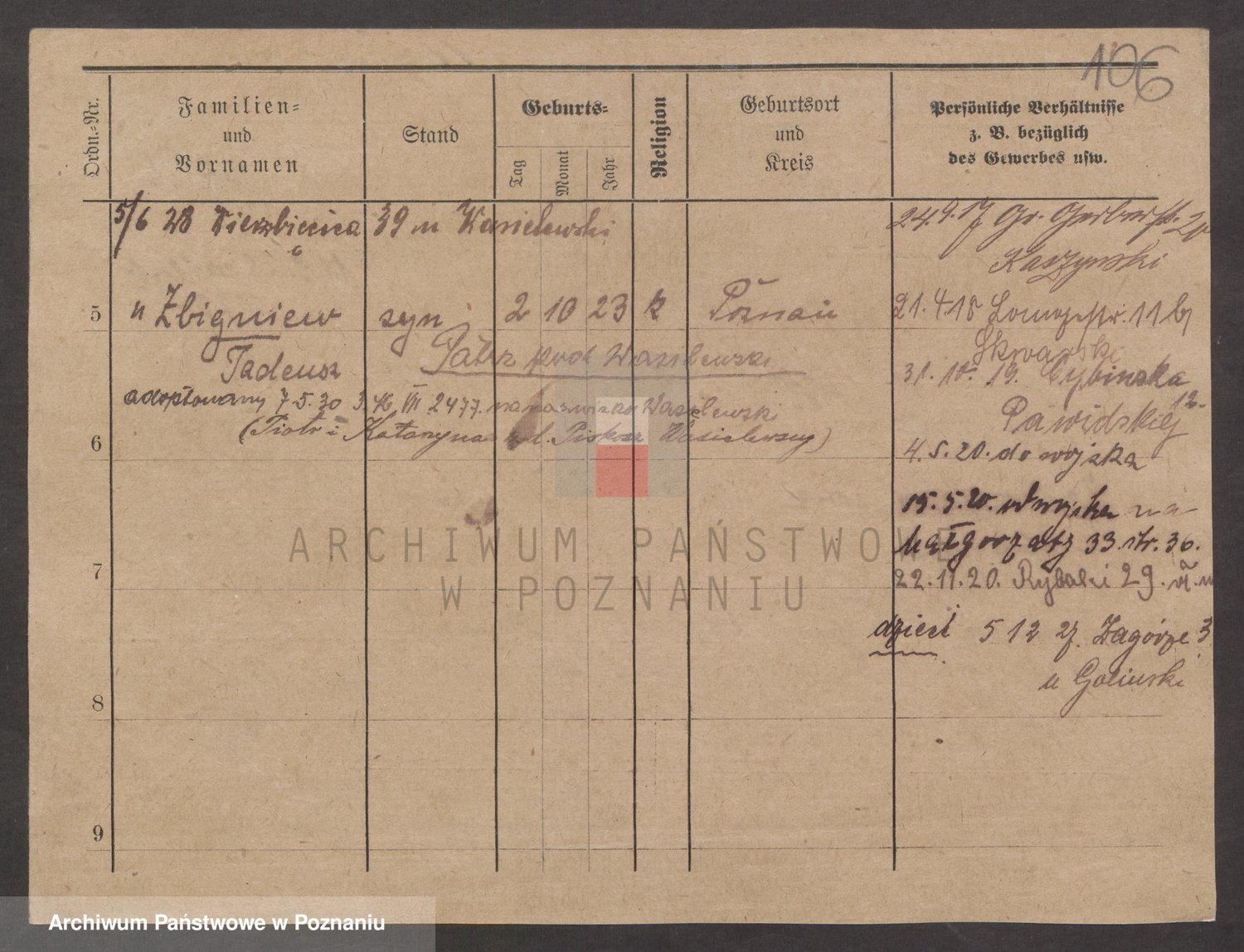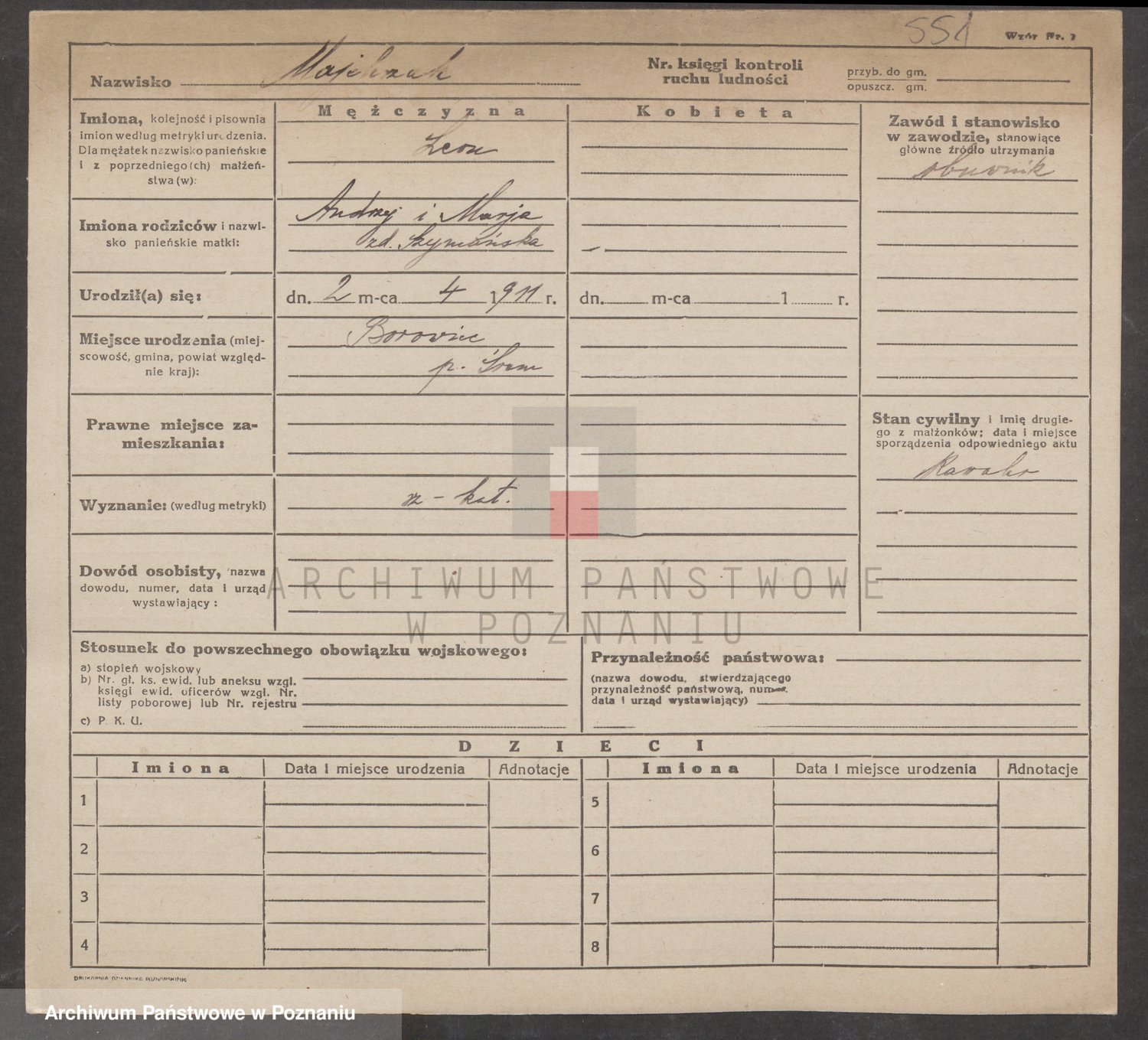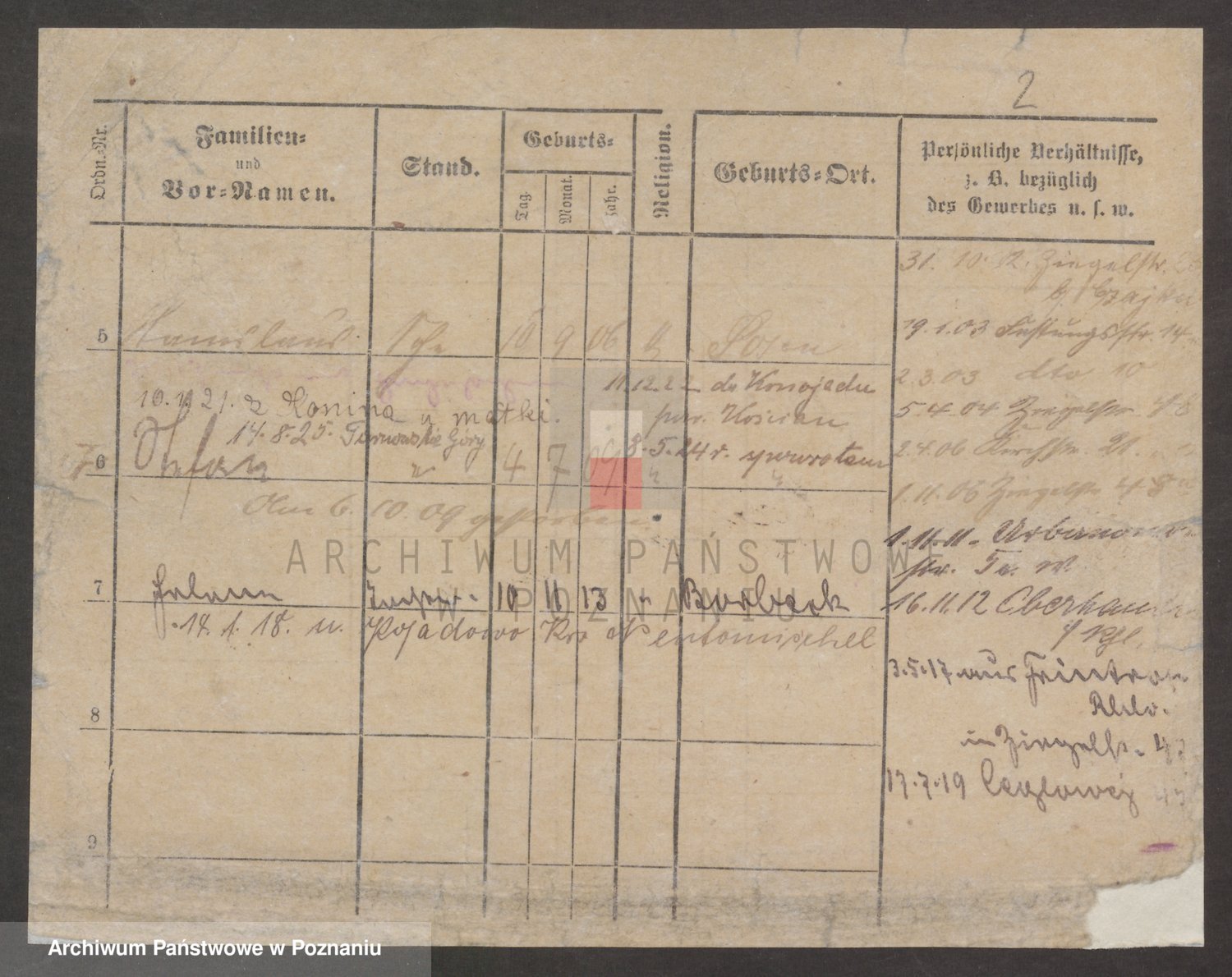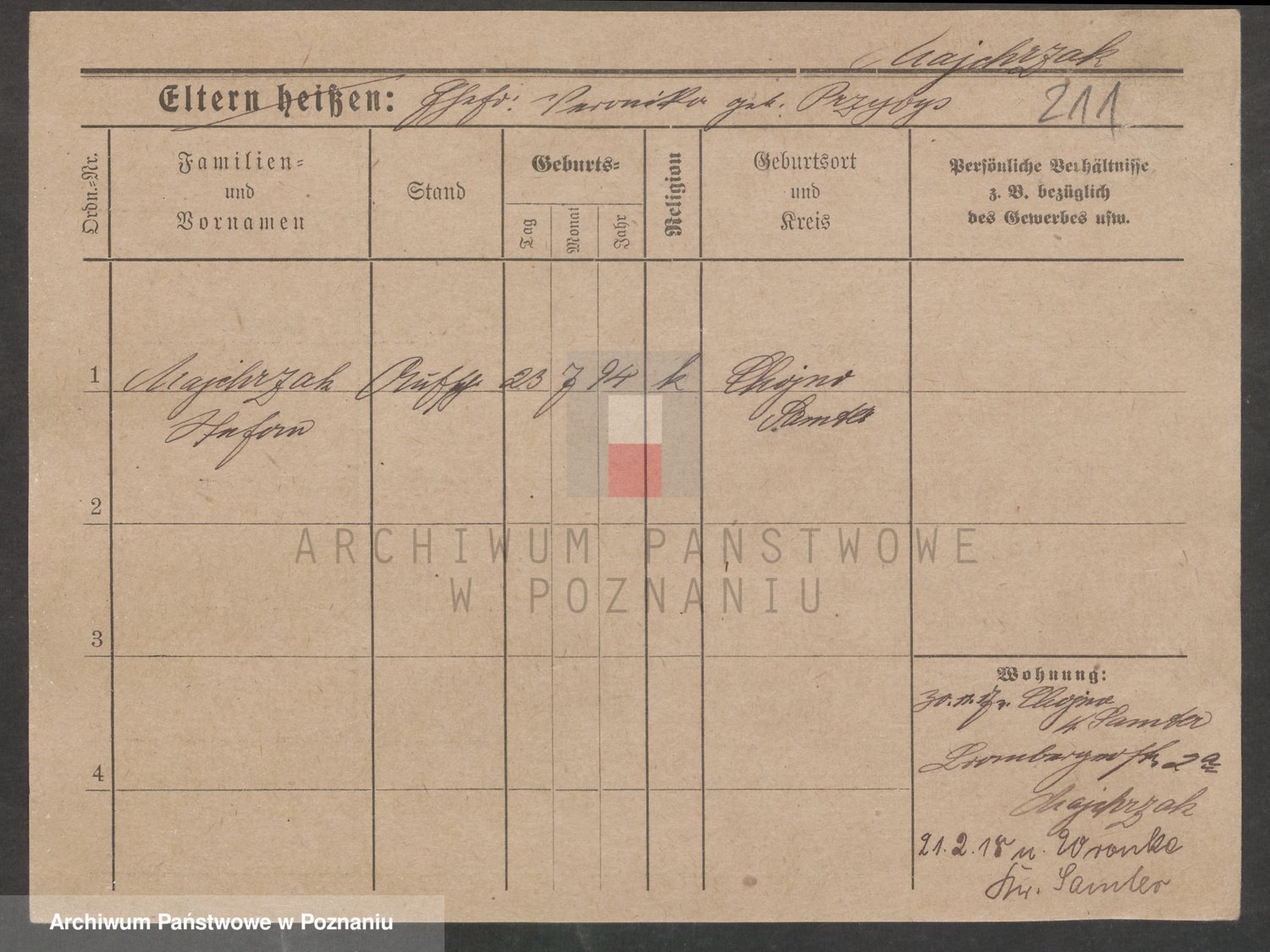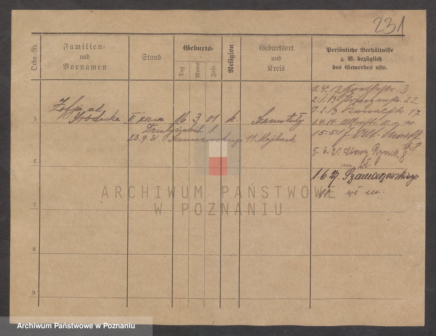 Podgląd karty osobowej dostępny jest po kliknięciu na nazwisko lub ikonkę karty. Można dokonywać powiększenia (ikony na górze) lub przechodzić między kolejnymi skanami (strzałki po bokach).