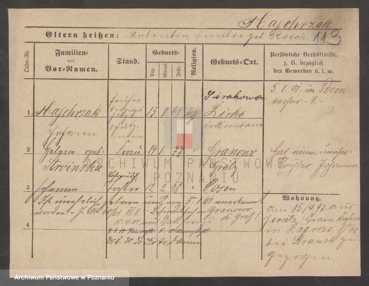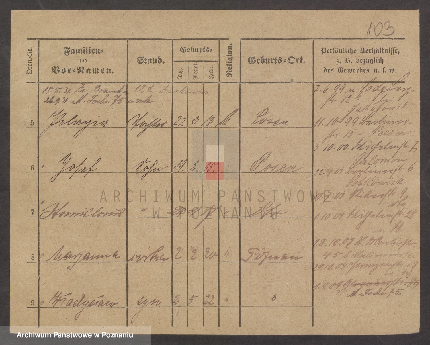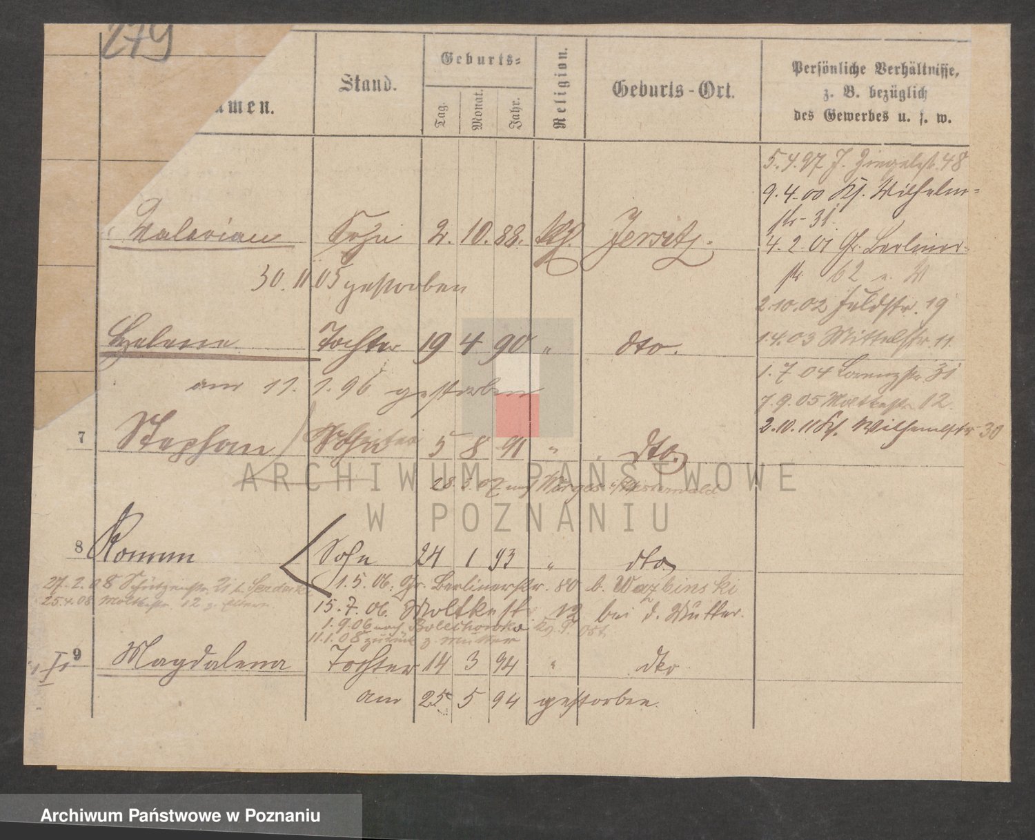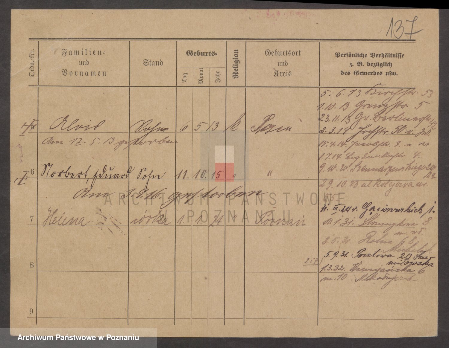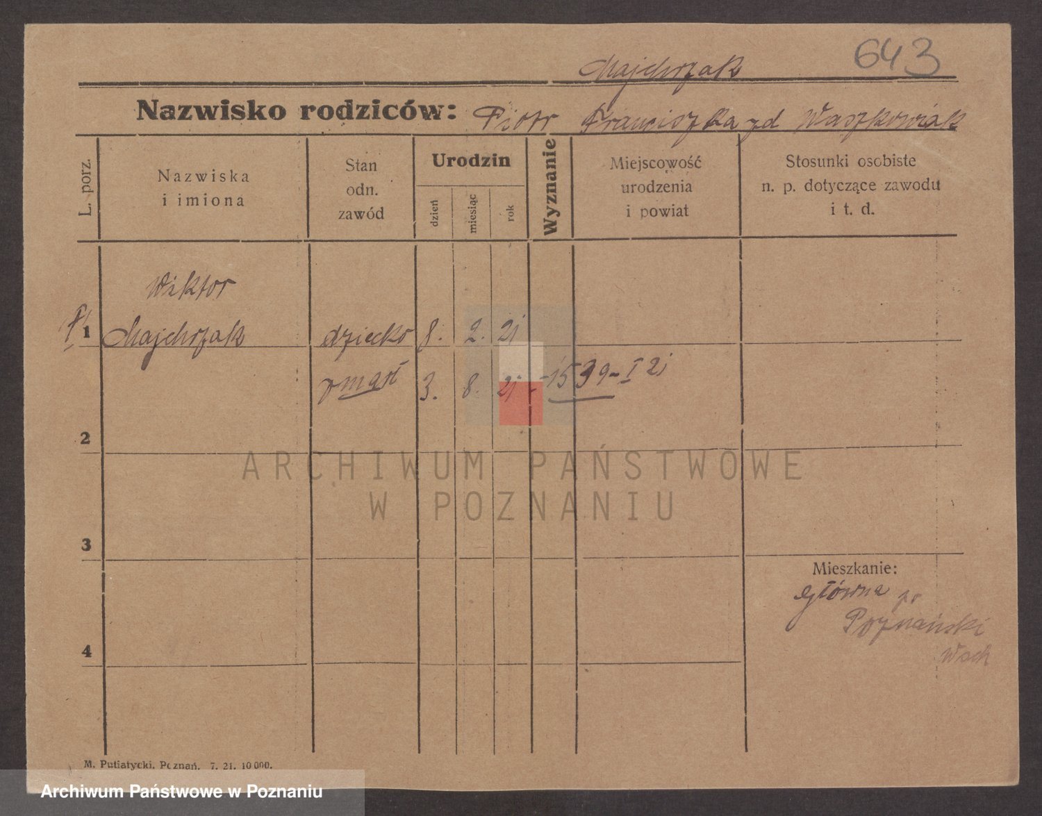 Podgląd karty osobowej dostępny jest po kliknięciu na nazwisko lub ikonkę karty. Można dokonywać powiększenia (ikony na górze) lub przechodzić między kolejnymi skanami (strzałki po bokach).