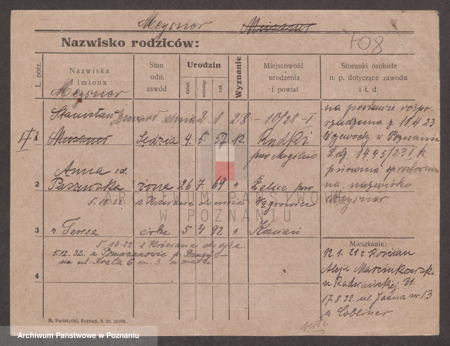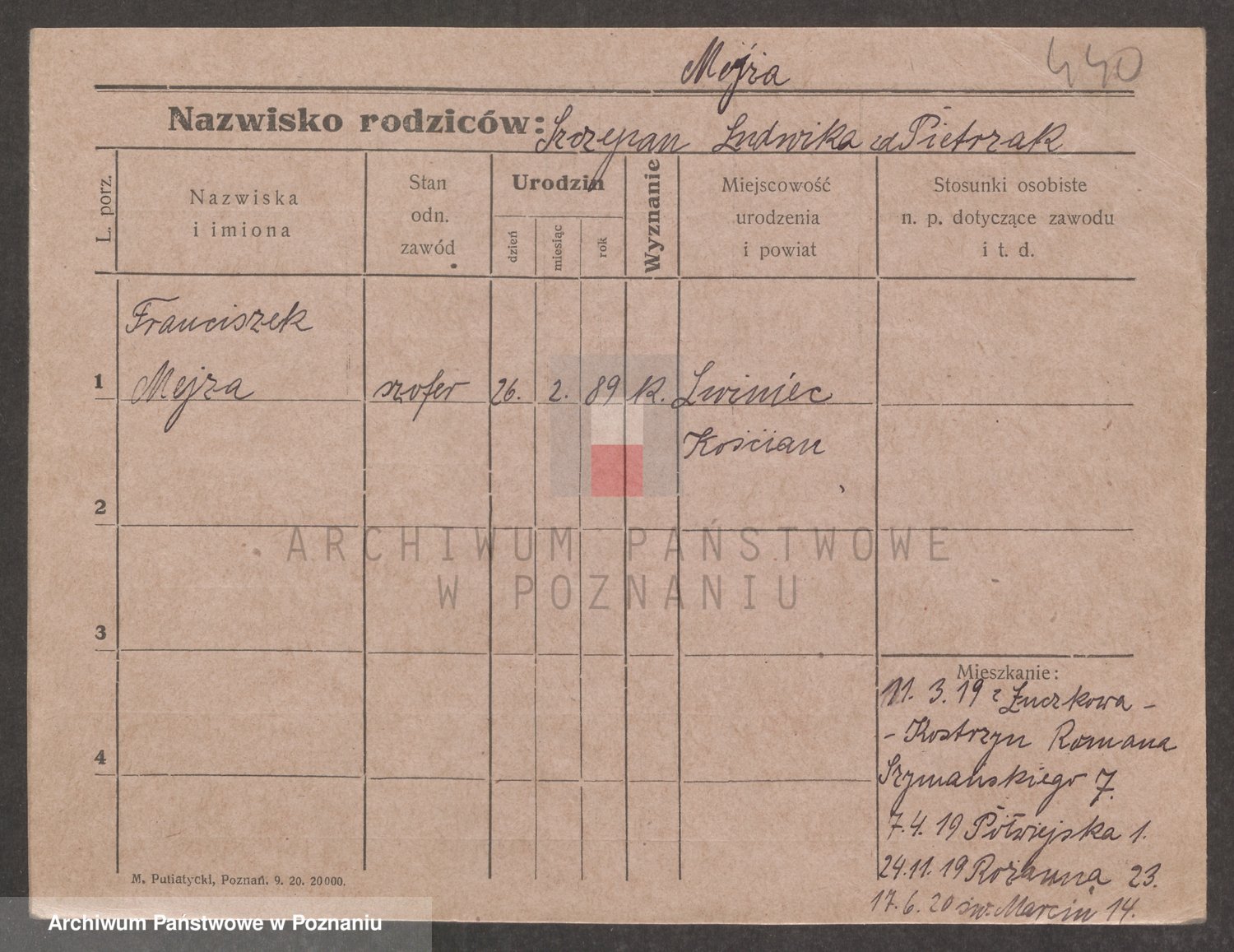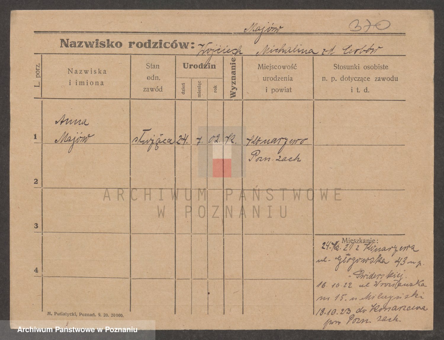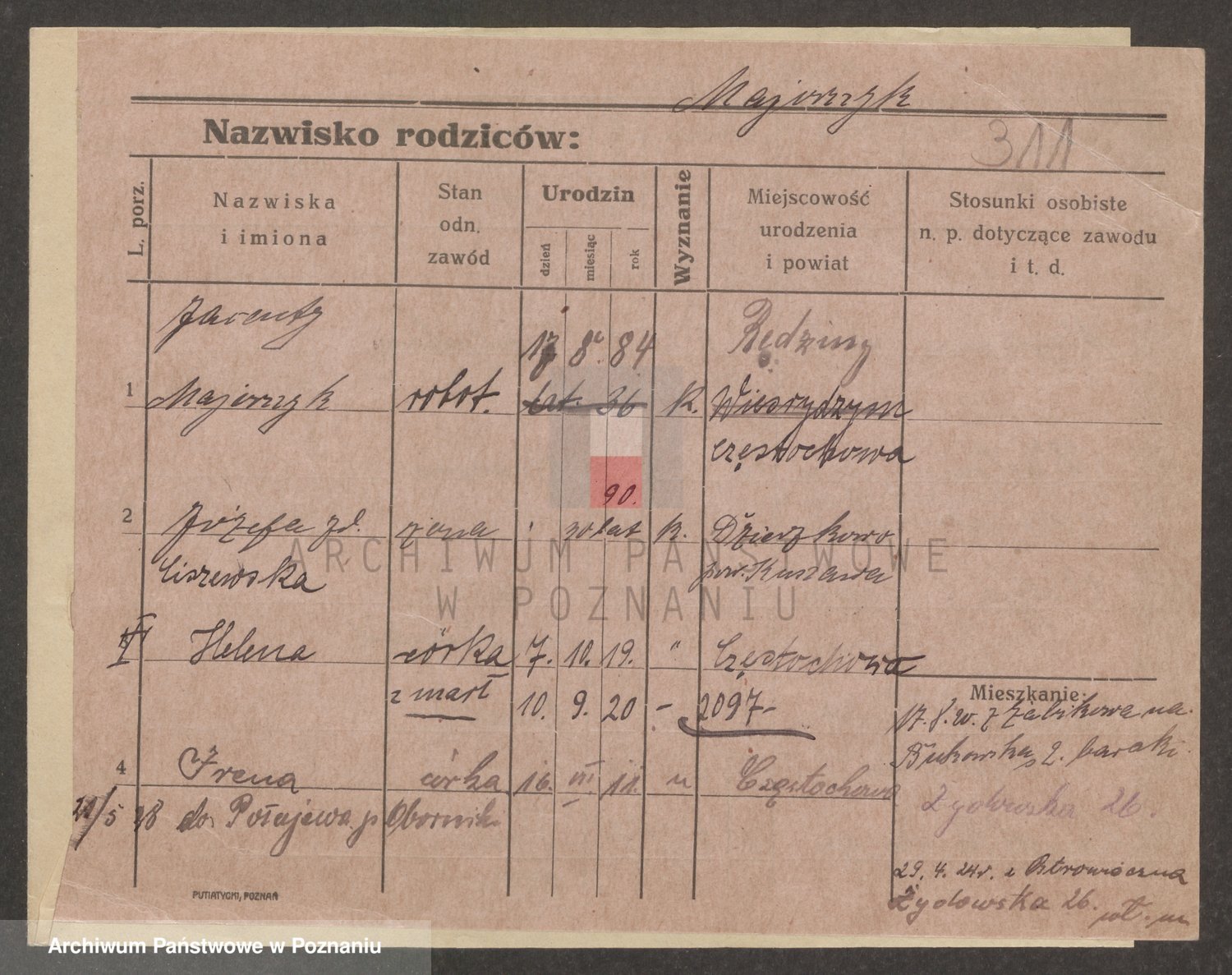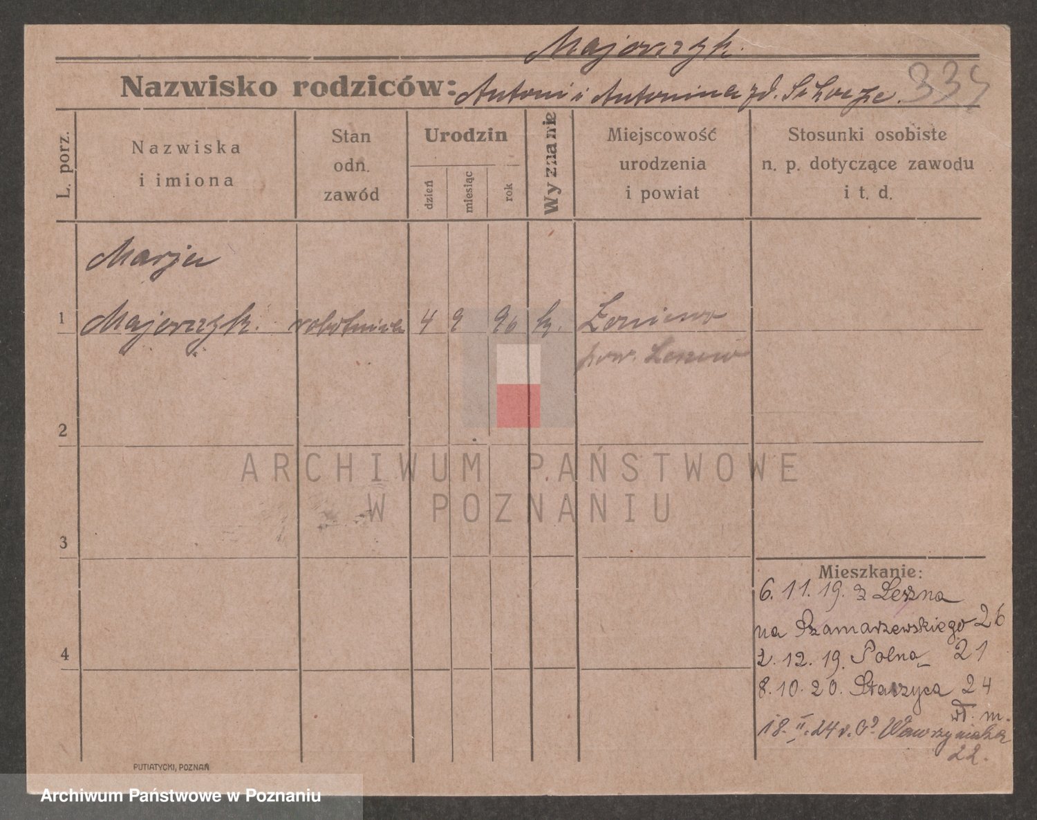 Podgląd karty osobowej dostępny jest po kliknięciu na nazwisko lub ikonkę karty. Można dokonywać powiększenia (ikony na górze) lub przechodzić między kolejnymi skanami (strzałki po bokach).