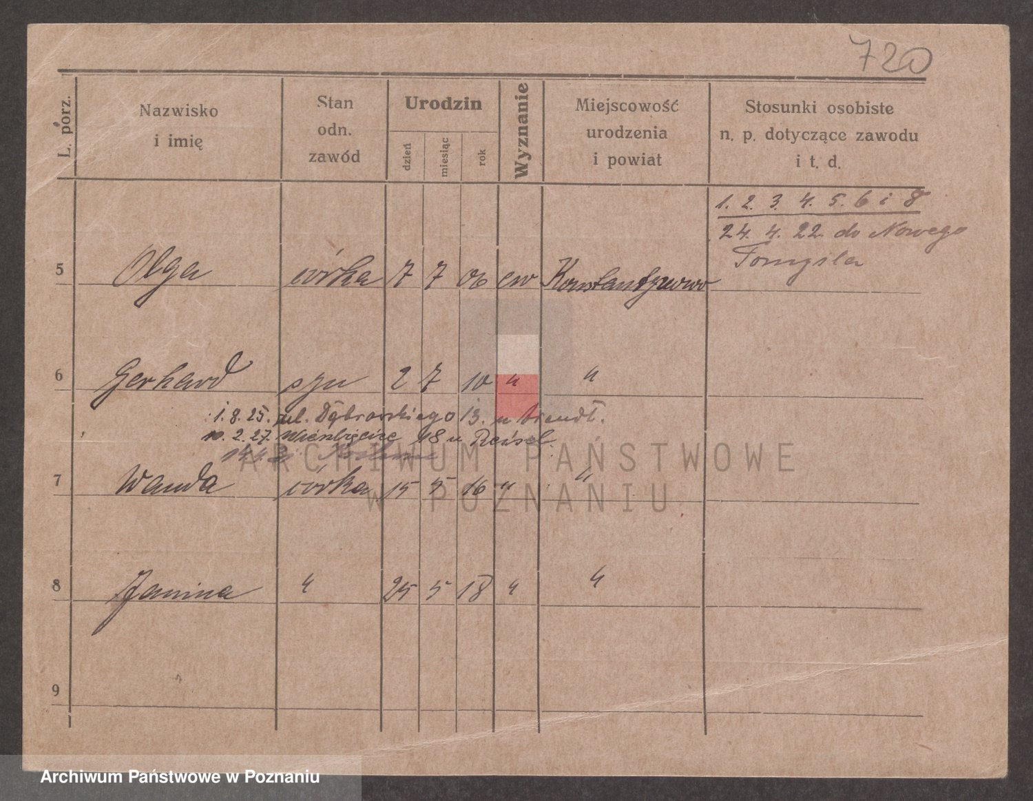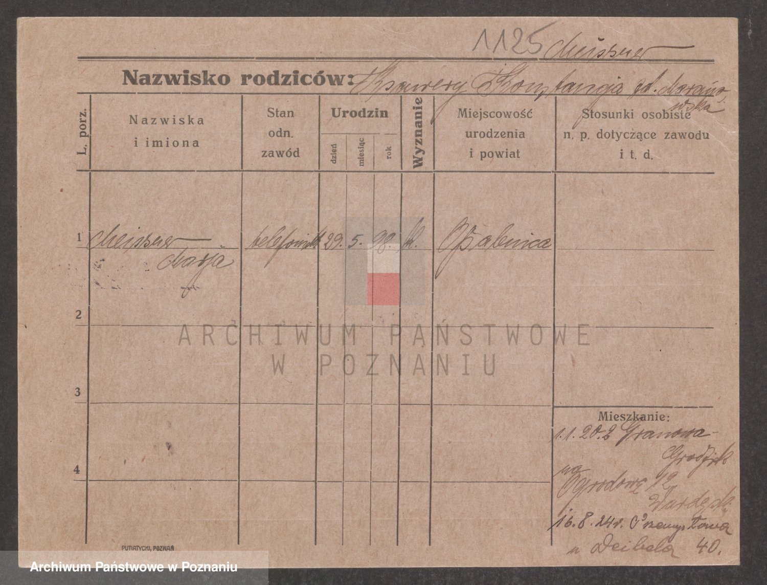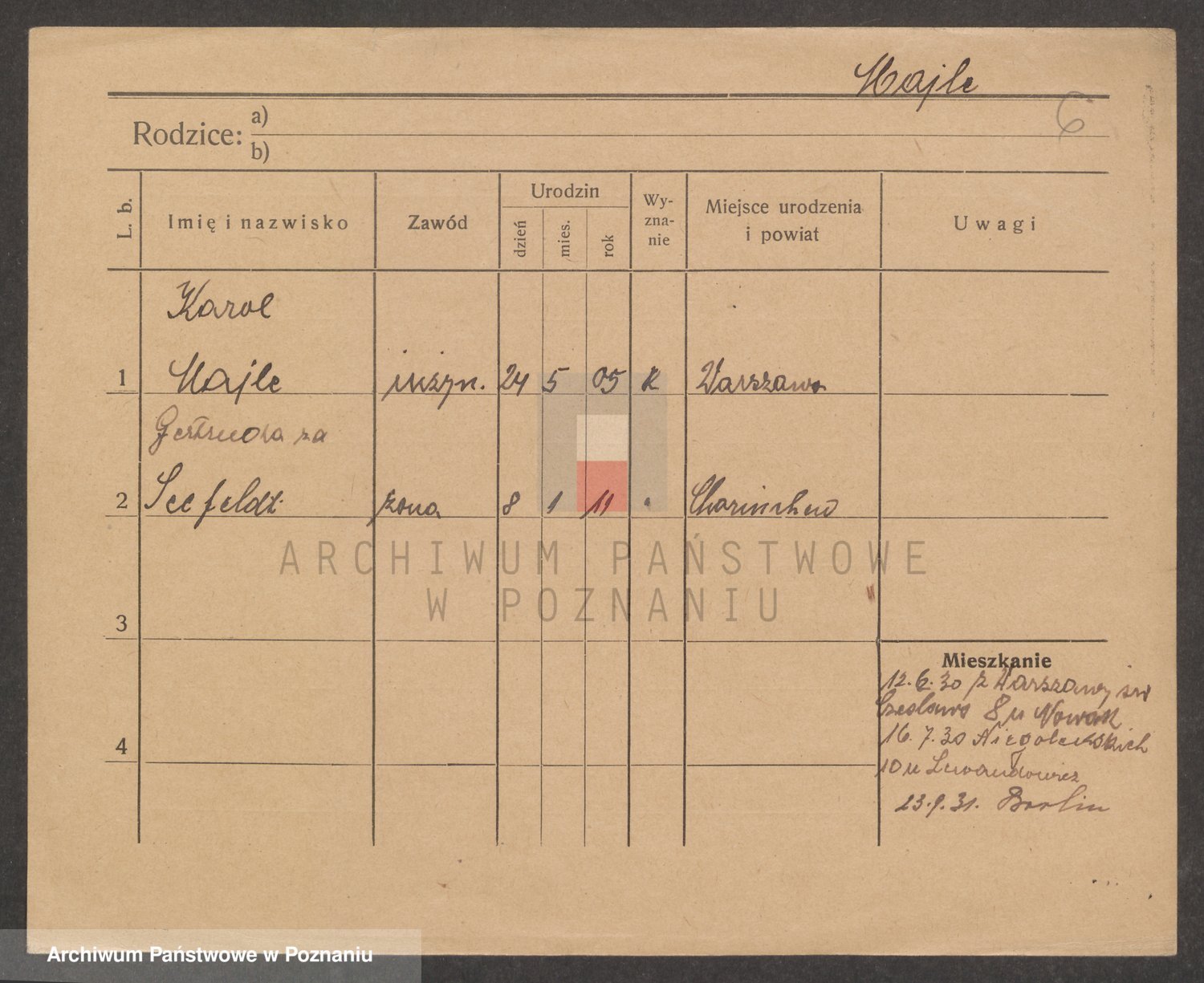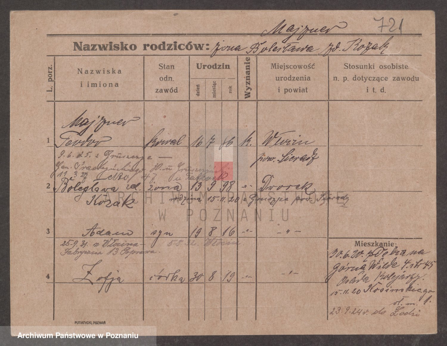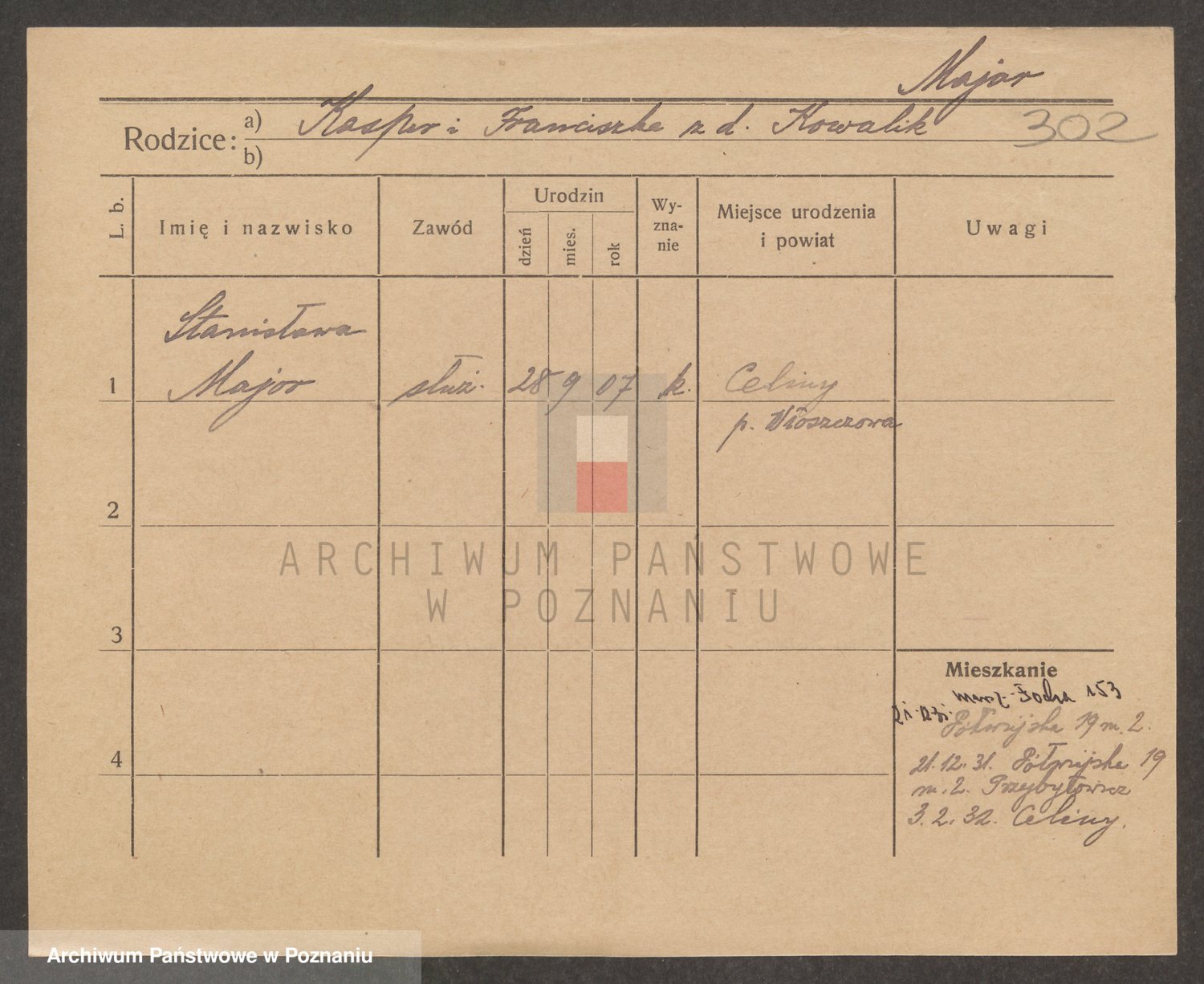 Podgląd karty osobowej dostępny jest po kliknięciu na nazwisko lub ikonkę karty. Można dokonywać powiększenia (ikony na górze) lub przechodzić między kolejnymi skanami (strzałki po bokach).