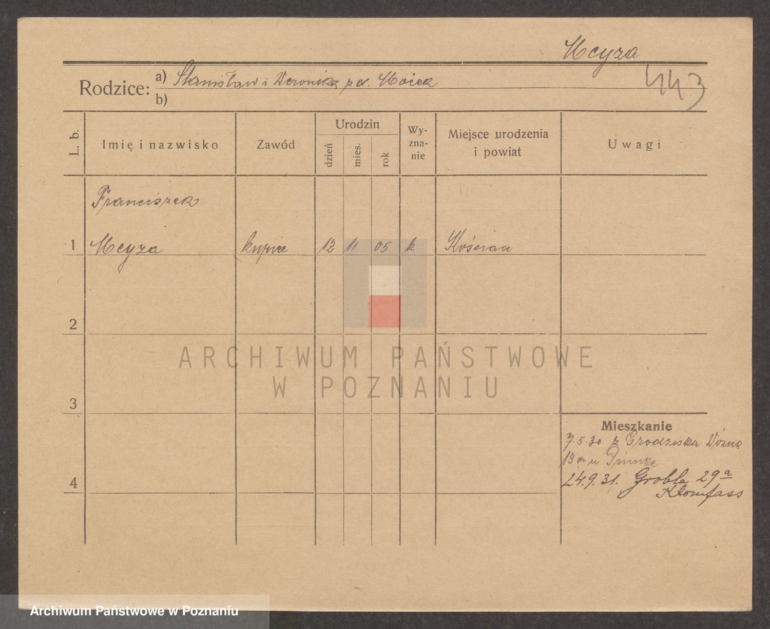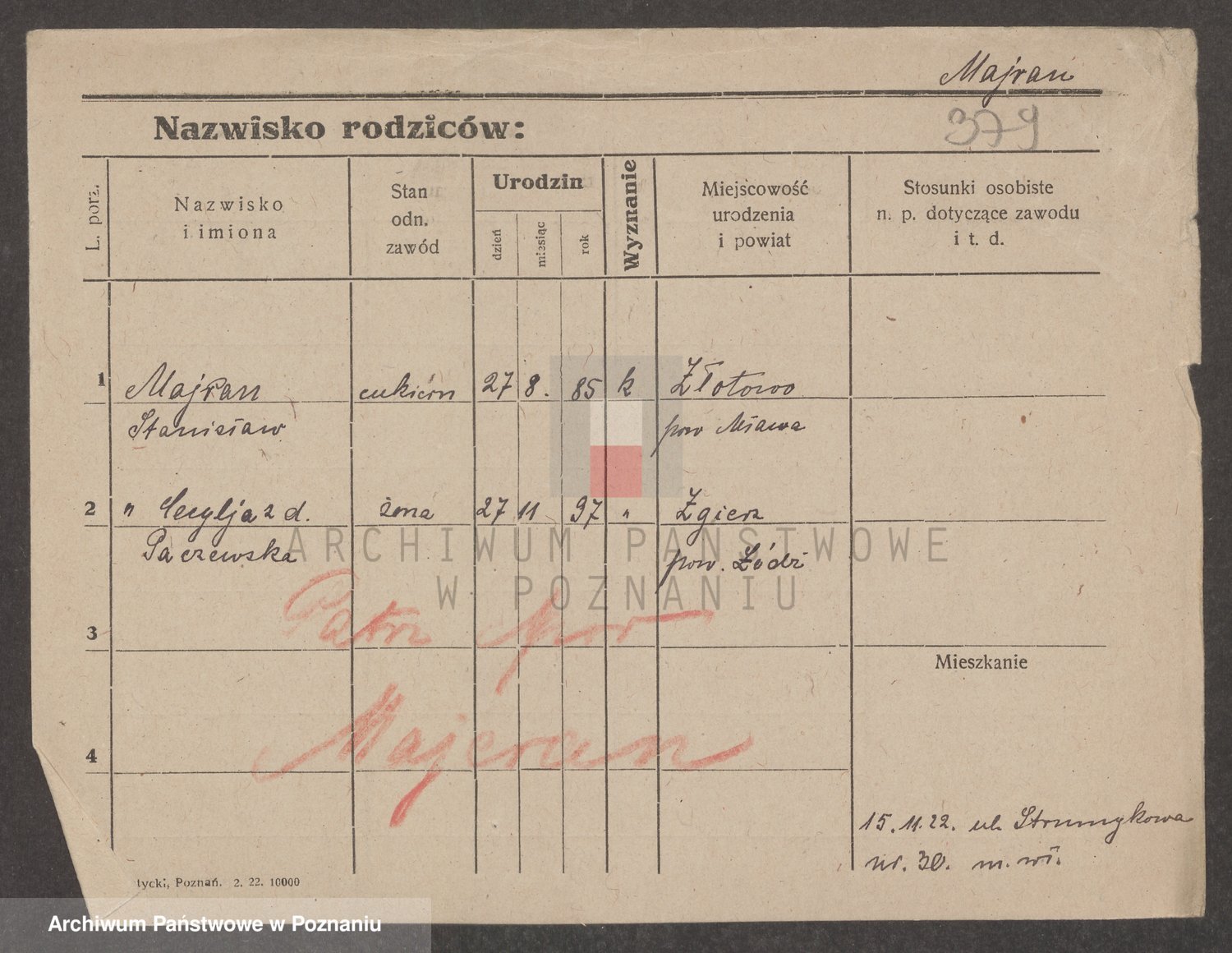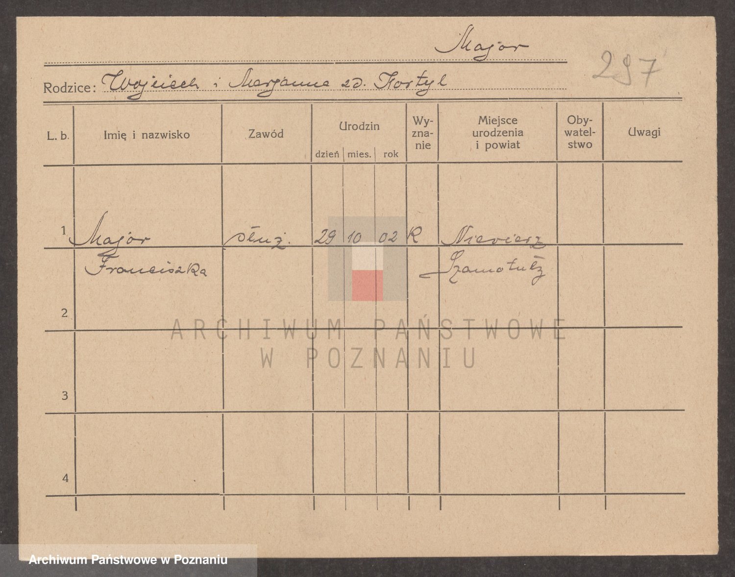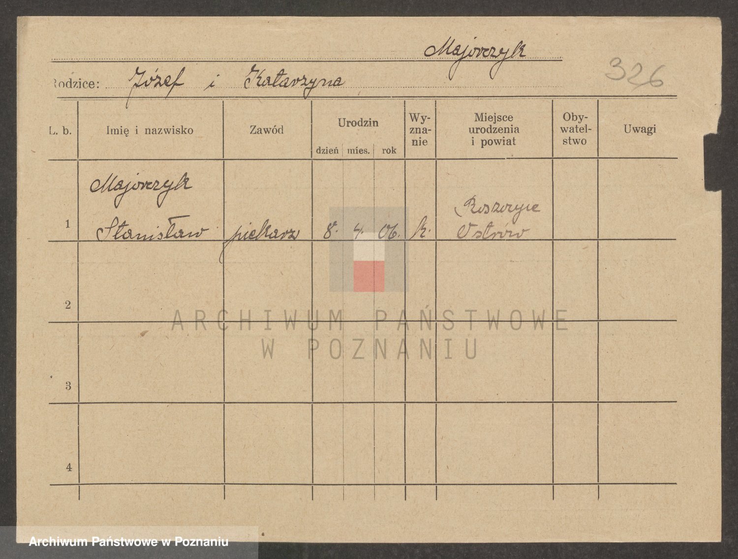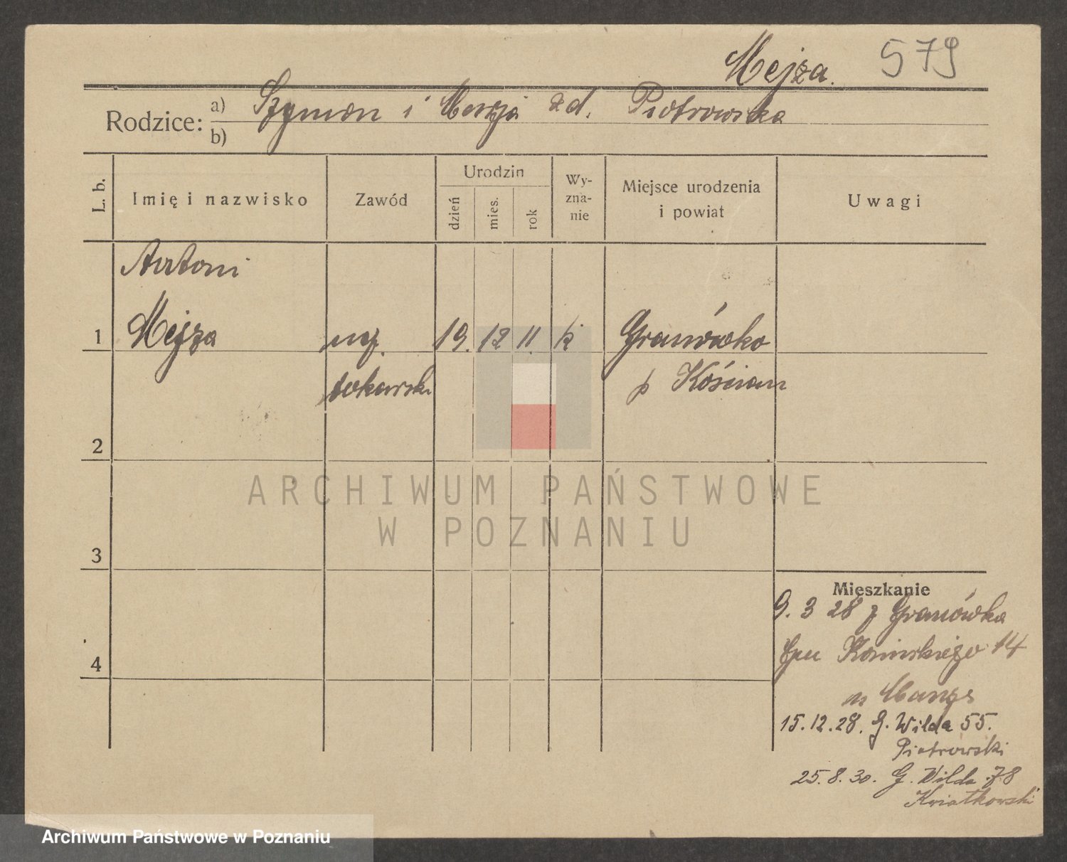 Podgląd karty osobowej dostępny jest po kliknięciu na nazwisko lub ikonkę karty. Można dokonywać powiększenia (ikony na górze) lub przechodzić między kolejnymi skanami (strzałki po bokach).
