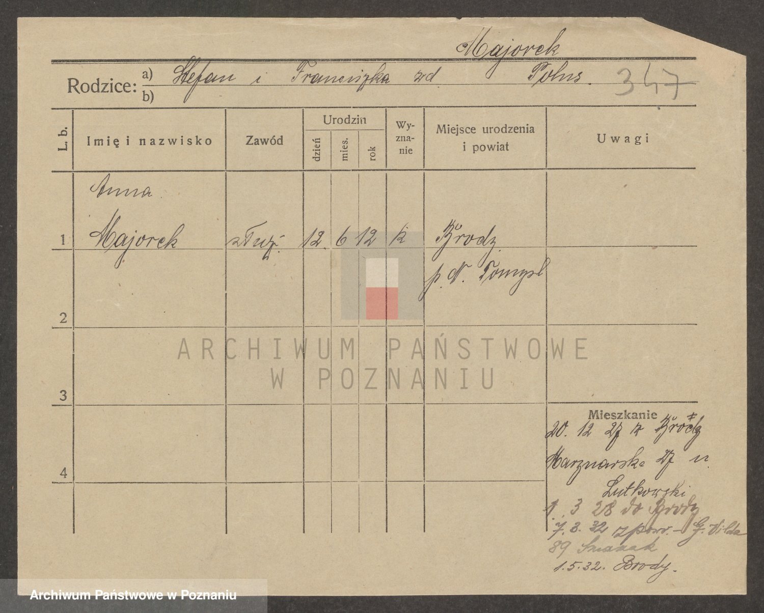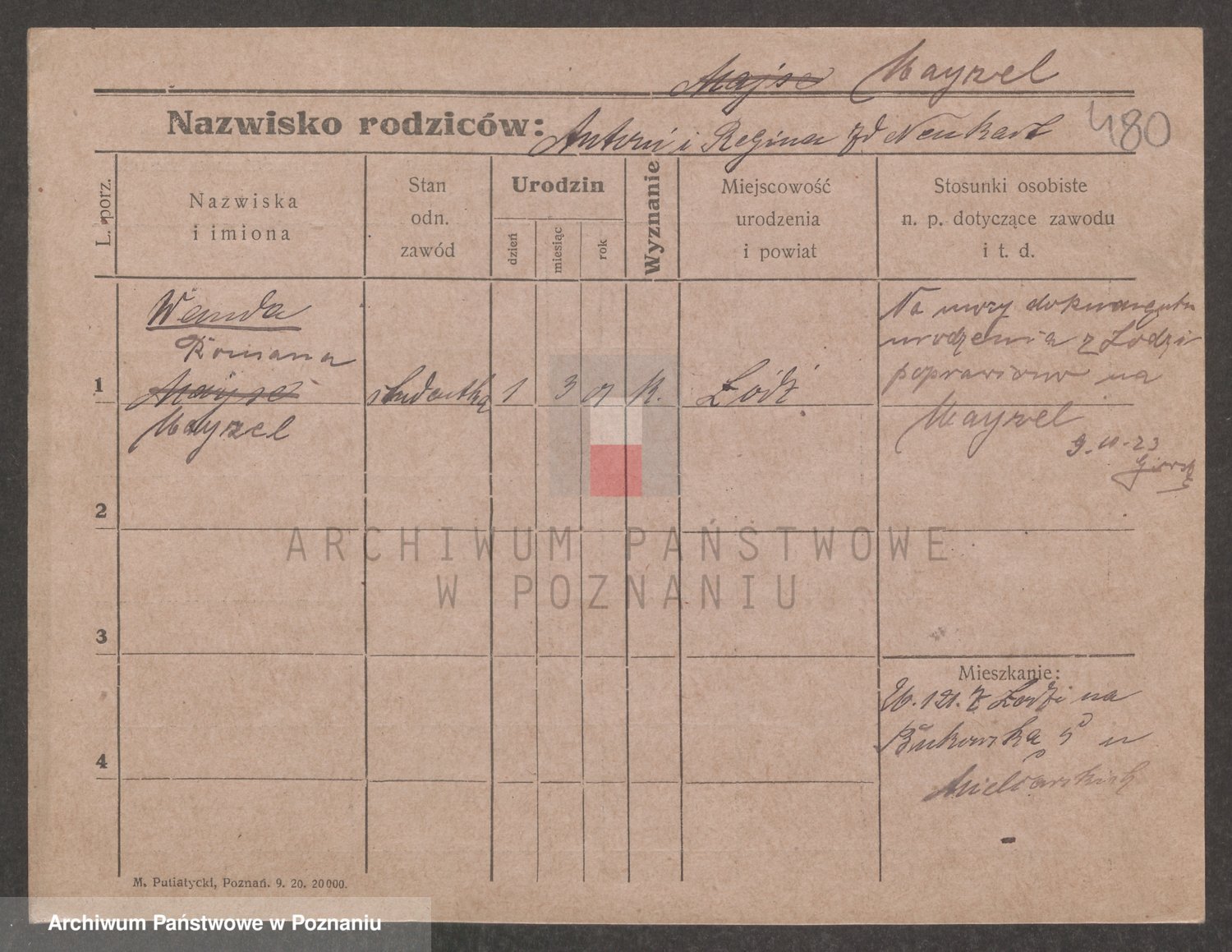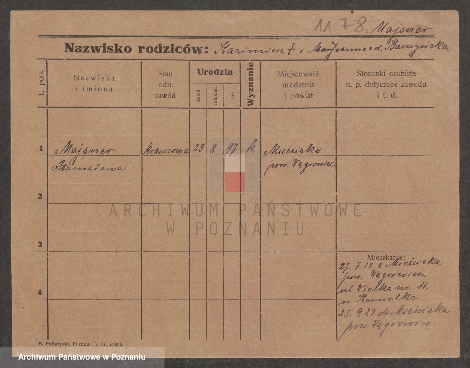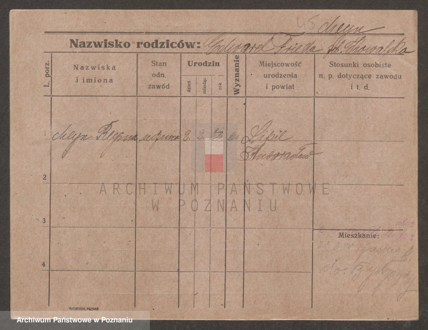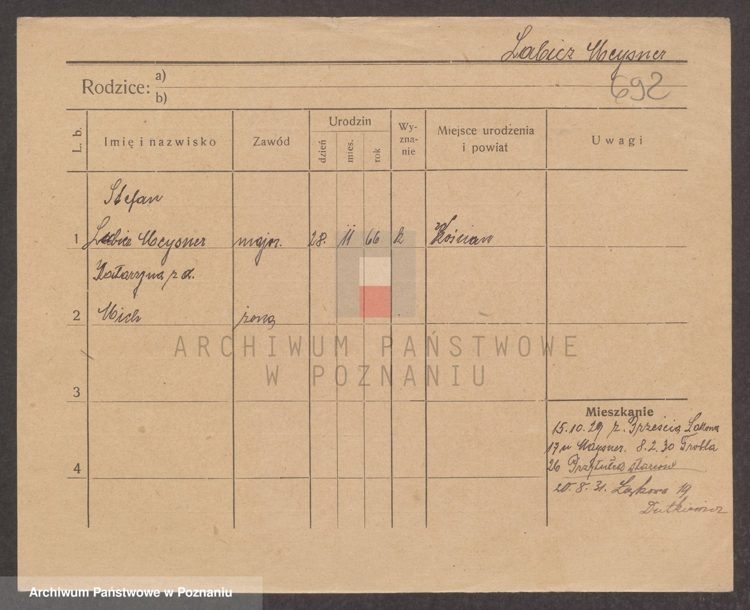 Podgląd karty osobowej dostępny jest po kliknięciu na nazwisko lub ikonkę karty. Można dokonywać powiększenia (ikony na górze) lub przechodzić między kolejnymi skanami (strzałki po bokach).