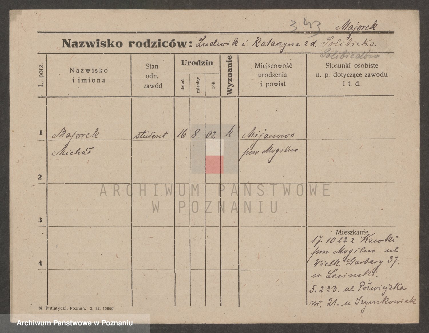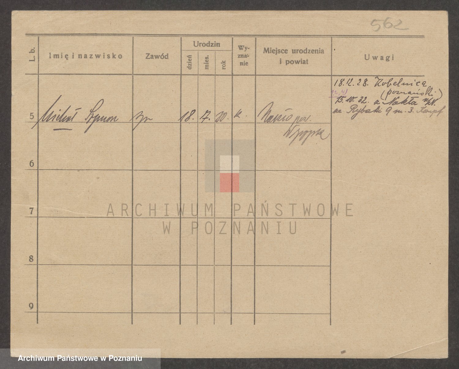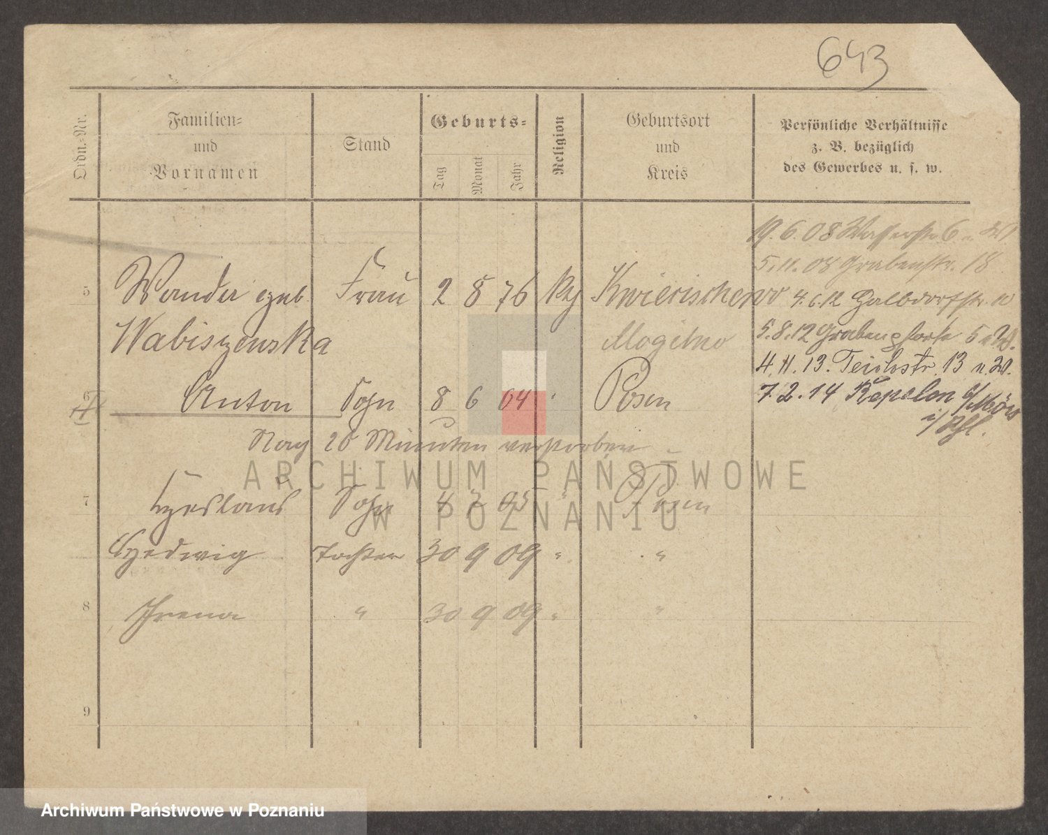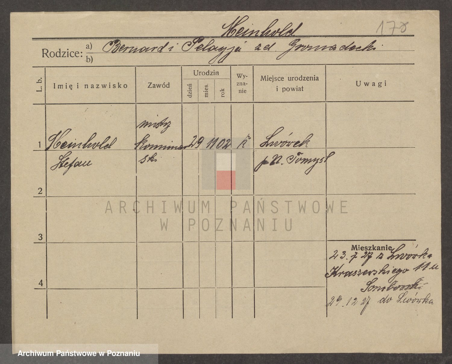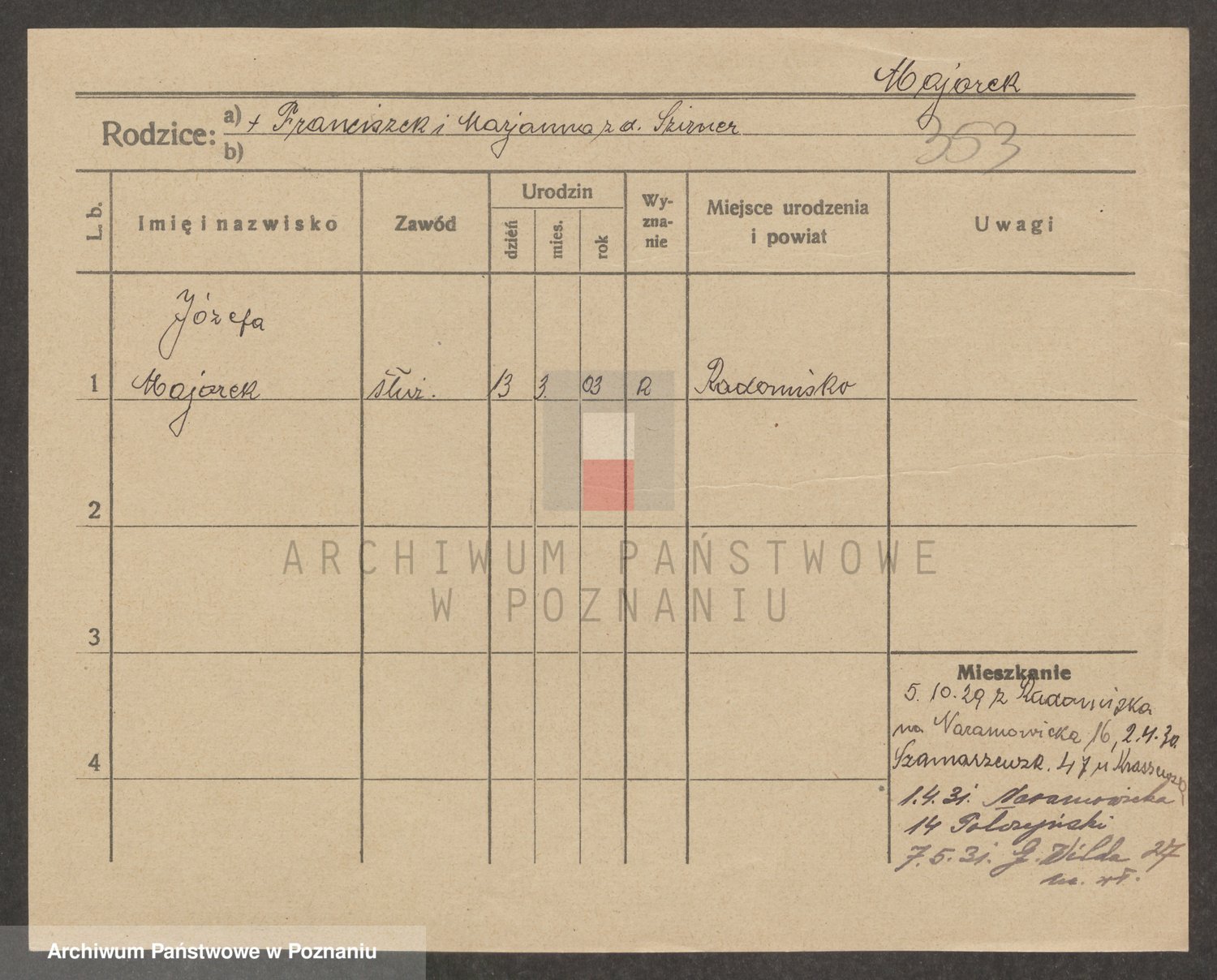 Podgląd karty osobowej dostępny jest po kliknięciu na nazwisko lub ikonkę karty. Można dokonywać powiększenia (ikony na górze) lub przechodzić między kolejnymi skanami (strzałki po bokach).