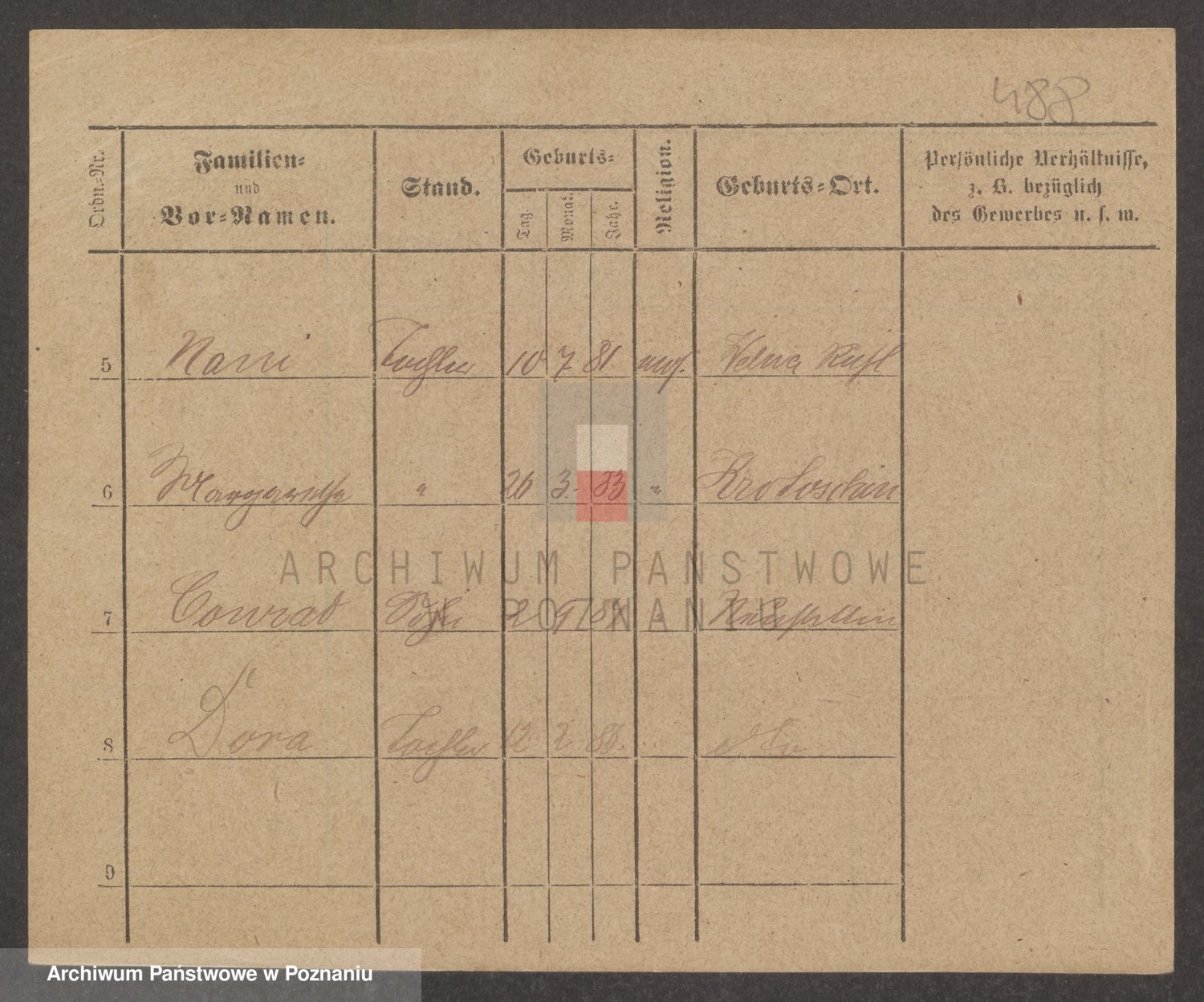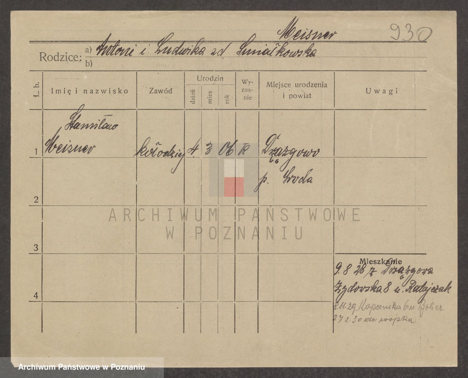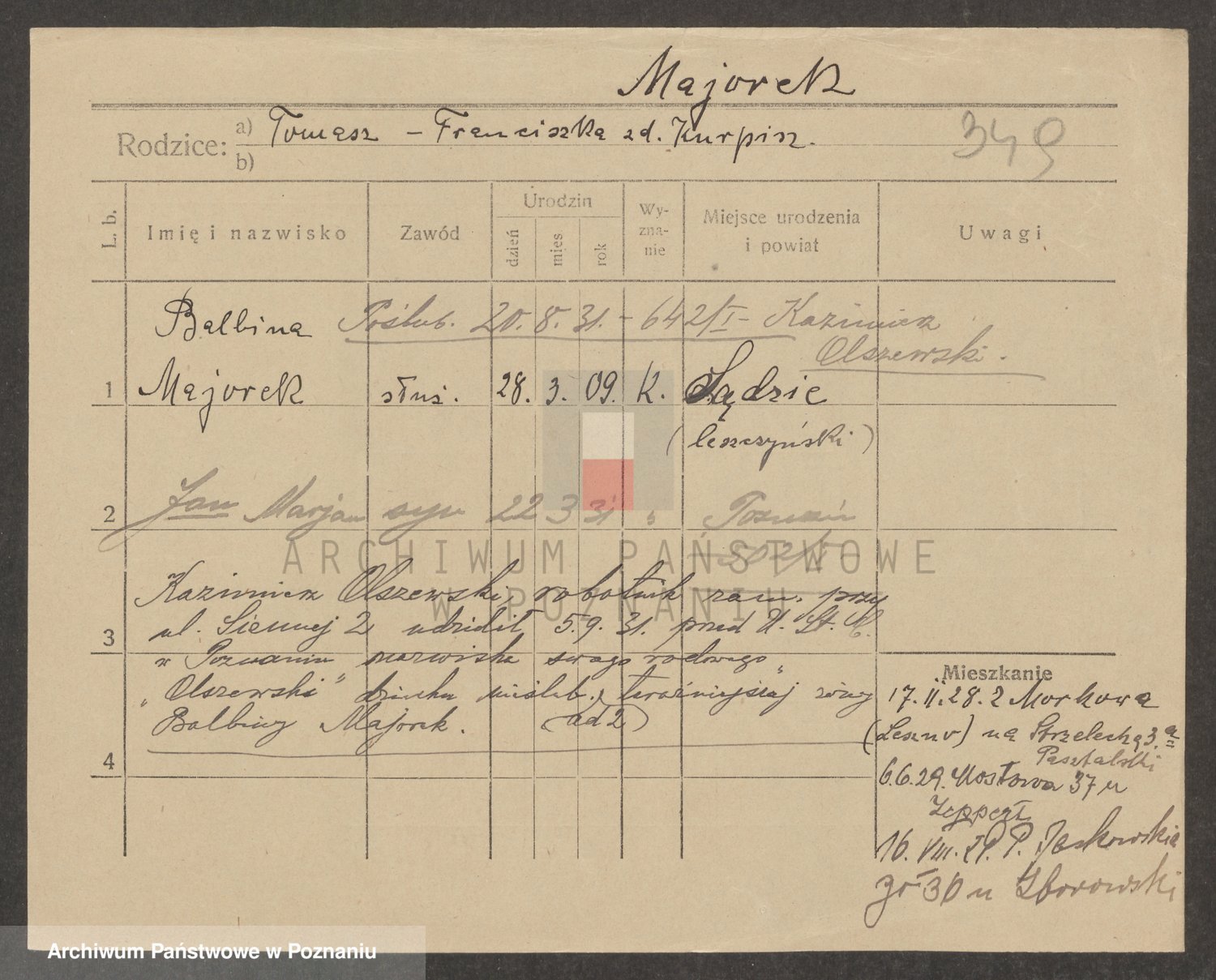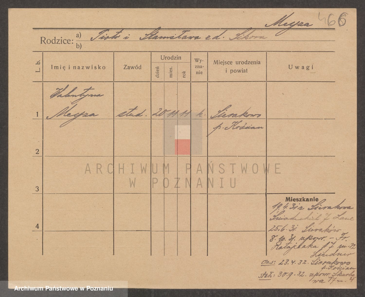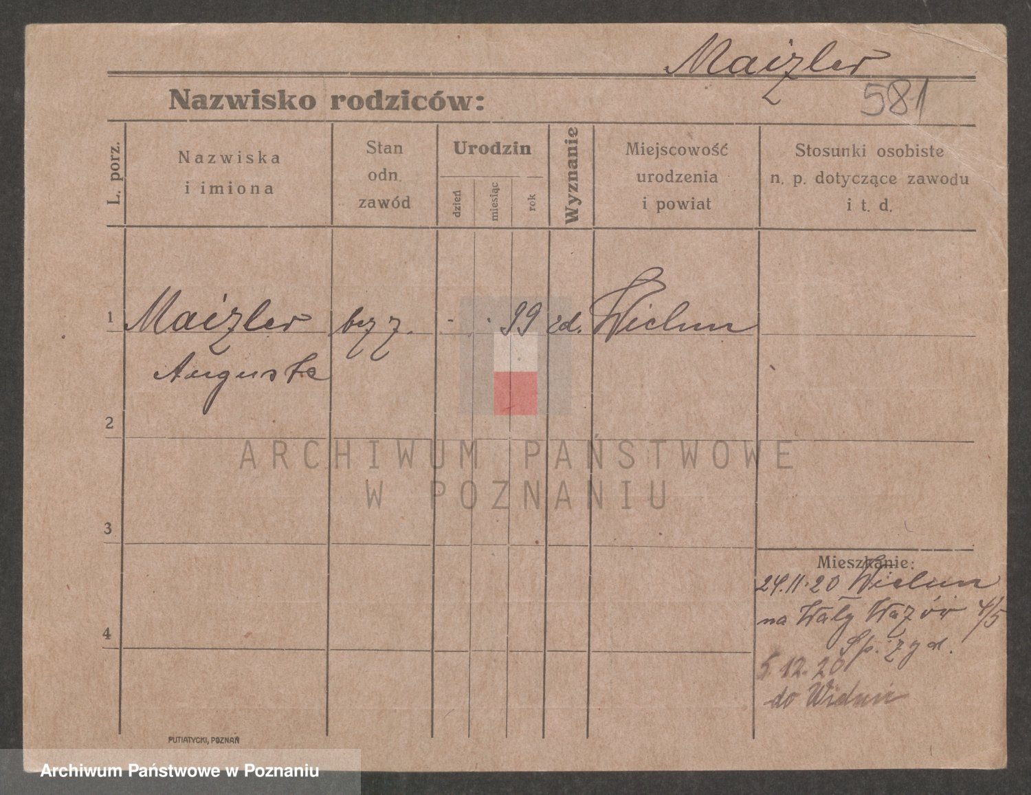 Podgląd karty osobowej dostępny jest po kliknięciu na nazwisko lub ikonkę karty. Można dokonywać powiększenia (ikony na górze) lub przechodzić między kolejnymi skanami (strzałki po bokach).