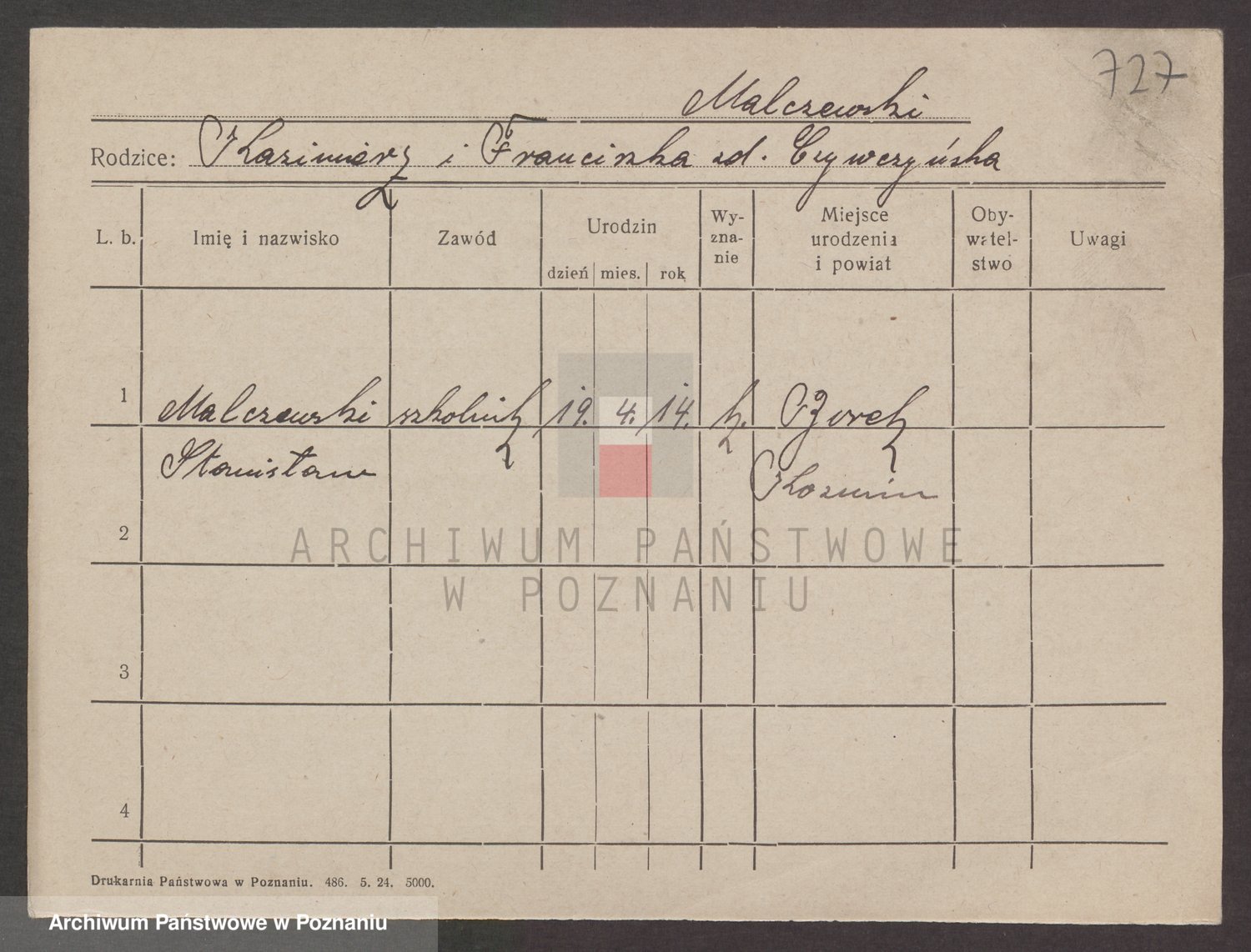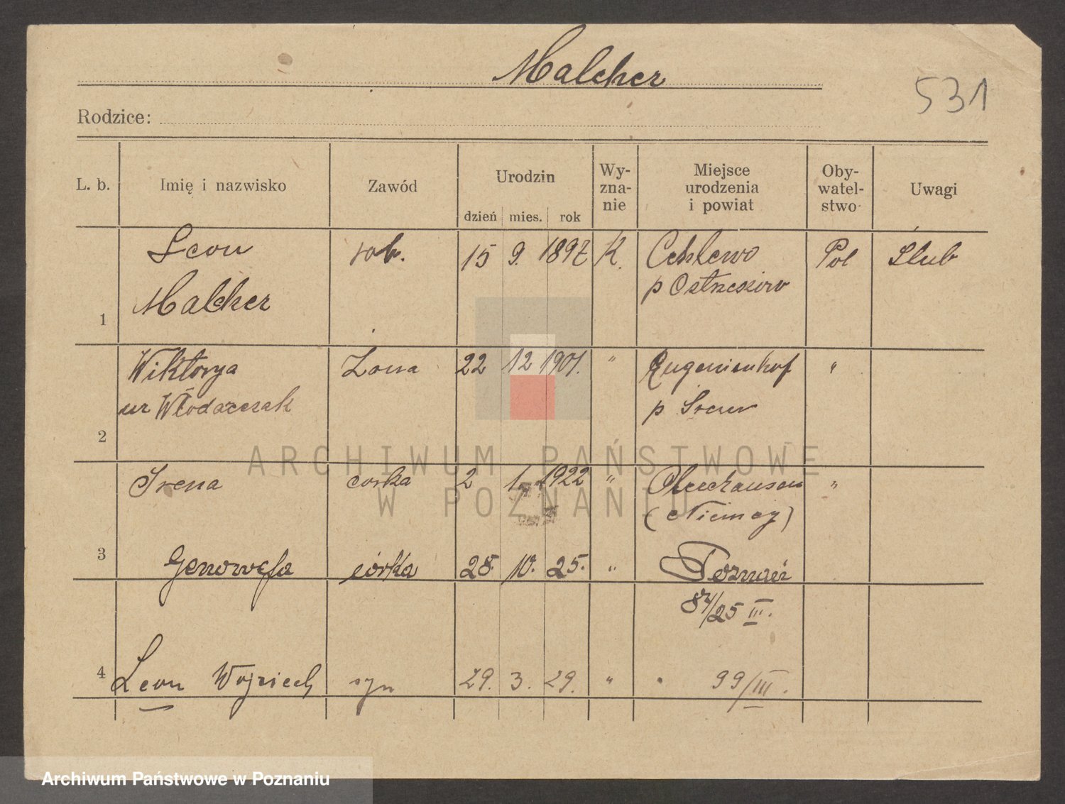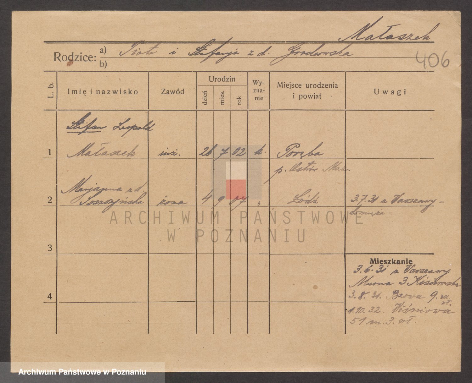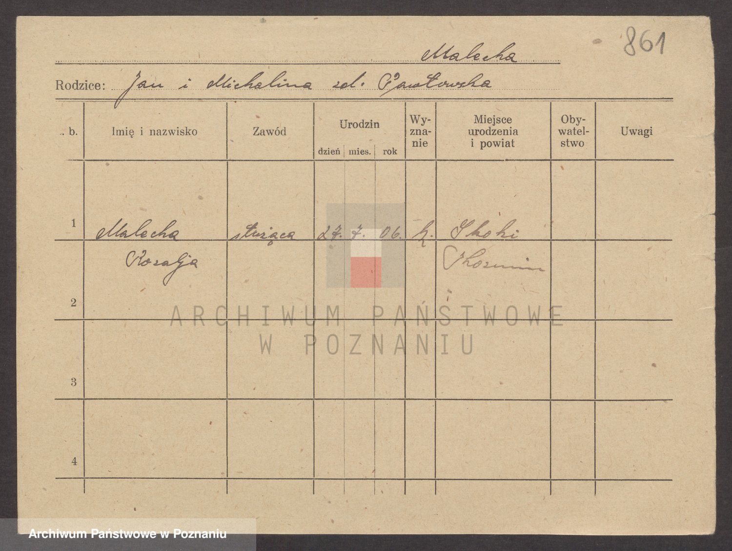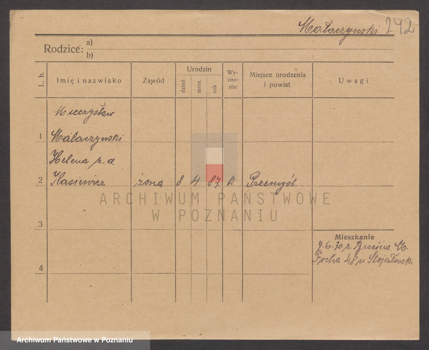 Podgląd karty osobowej dostępny jest po kliknięciu na nazwisko lub ikonkę karty. Można dokonywać powiększenia (ikony na górze) lub przechodzić między kolejnymi skanami (strzałki po bokach).