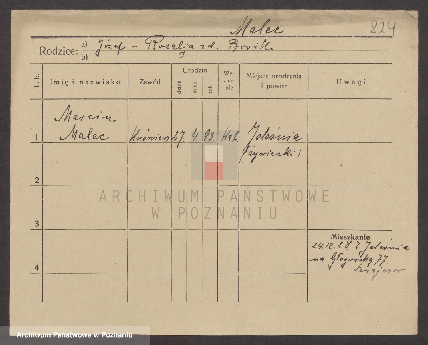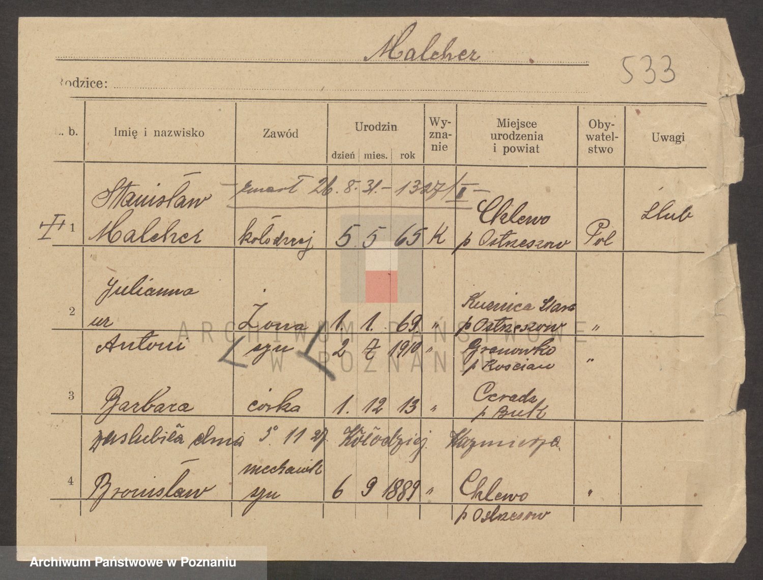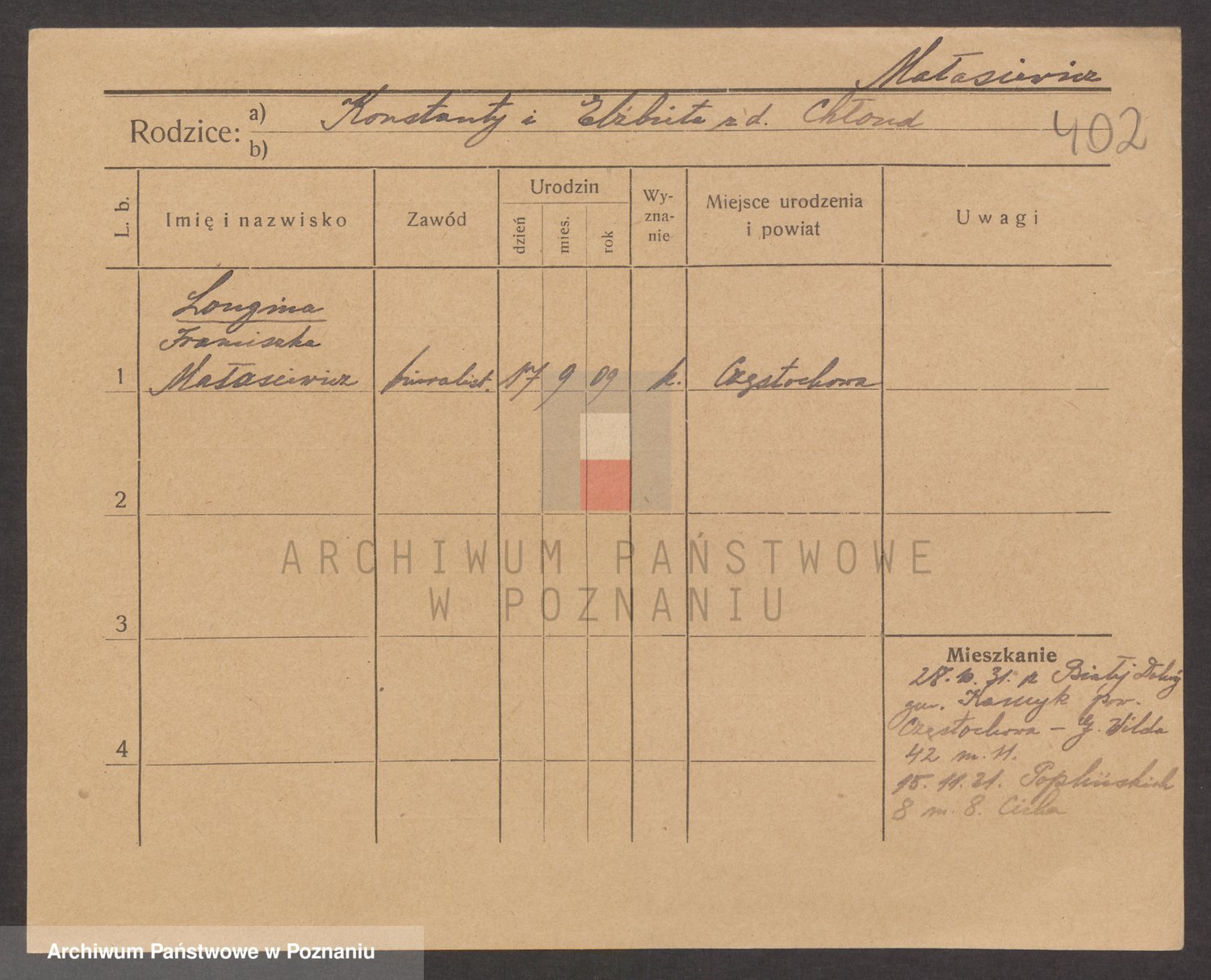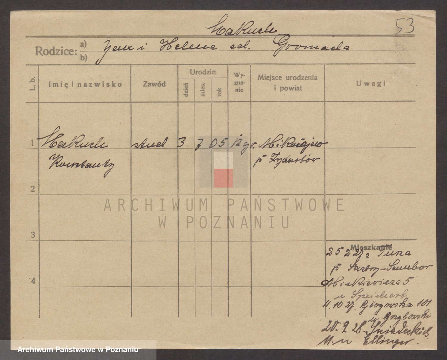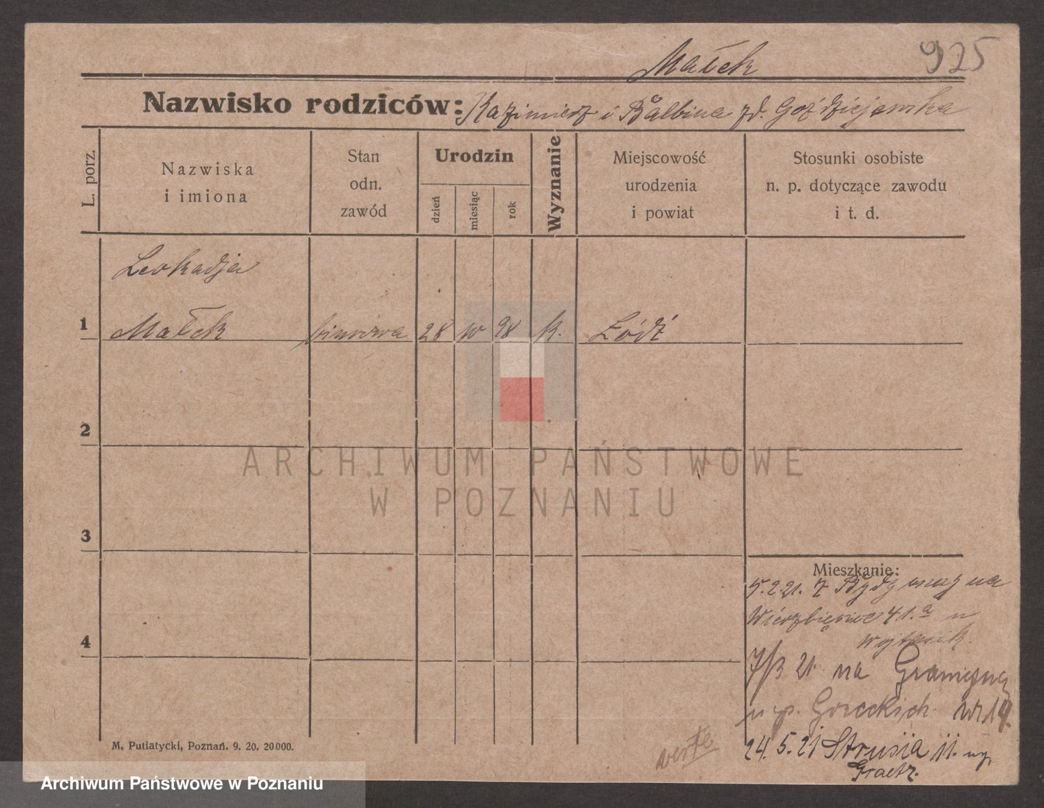 Podgląd karty osobowej dostępny jest po kliknięciu na nazwisko lub ikonkę karty. Można dokonywać powiększenia (ikony na górze) lub przechodzić między kolejnymi skanami (strzałki po bokach).