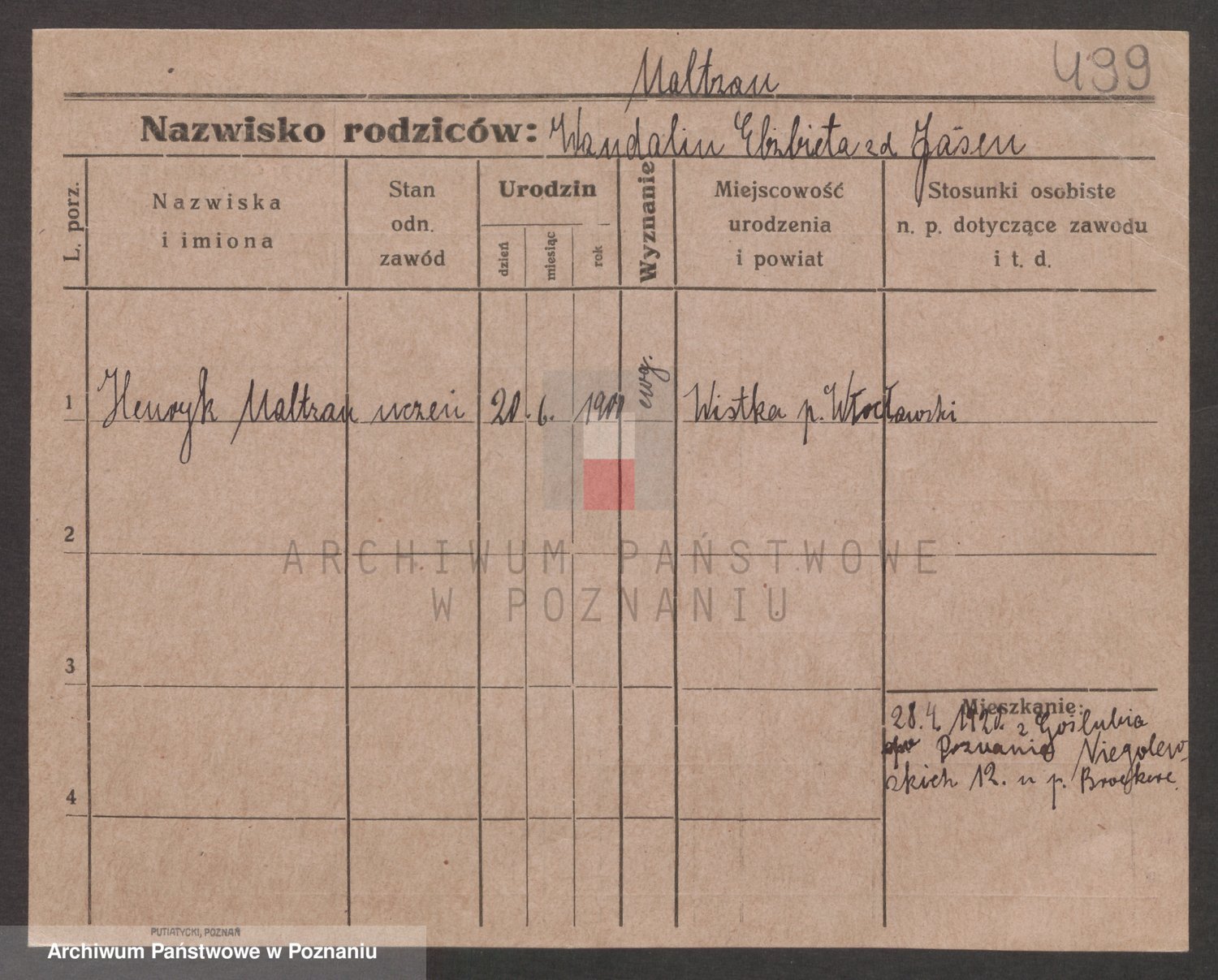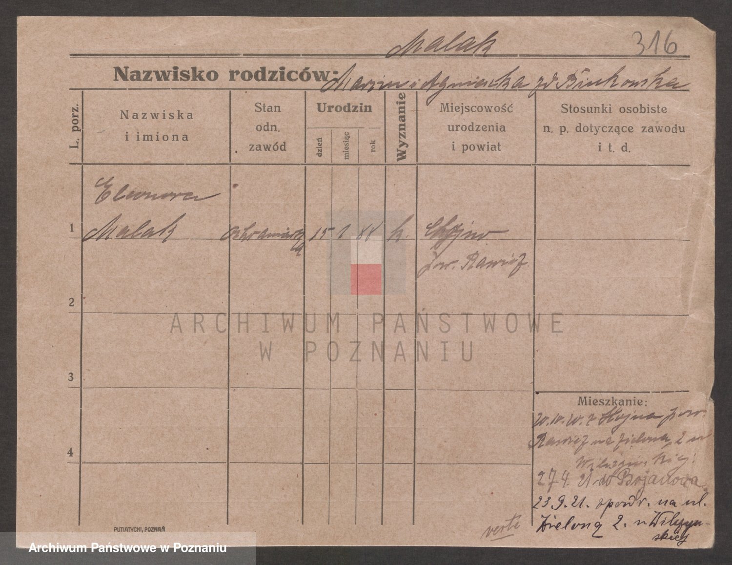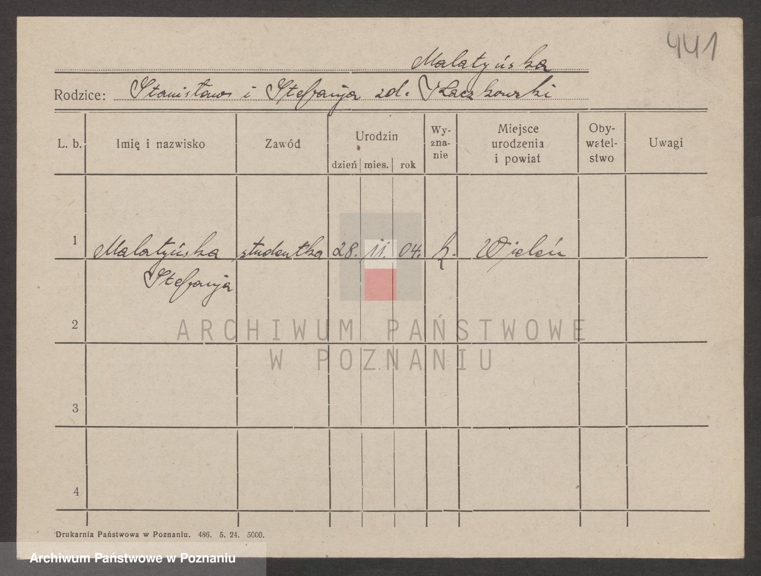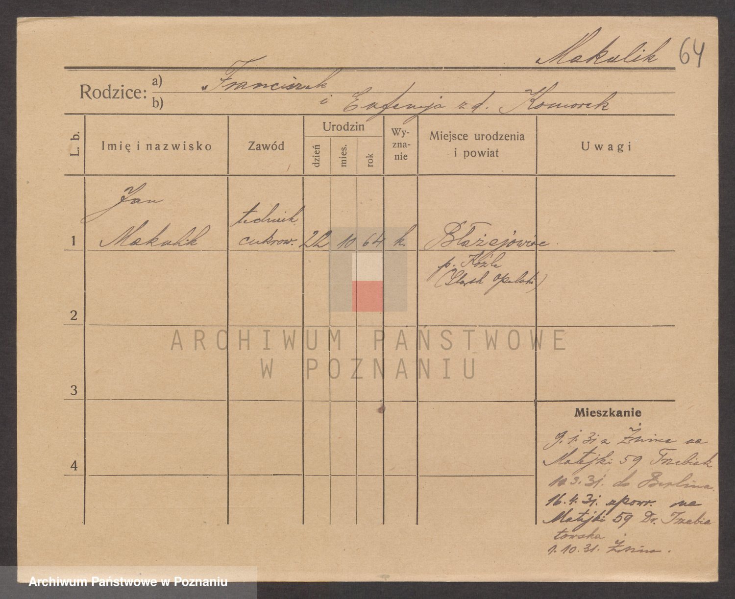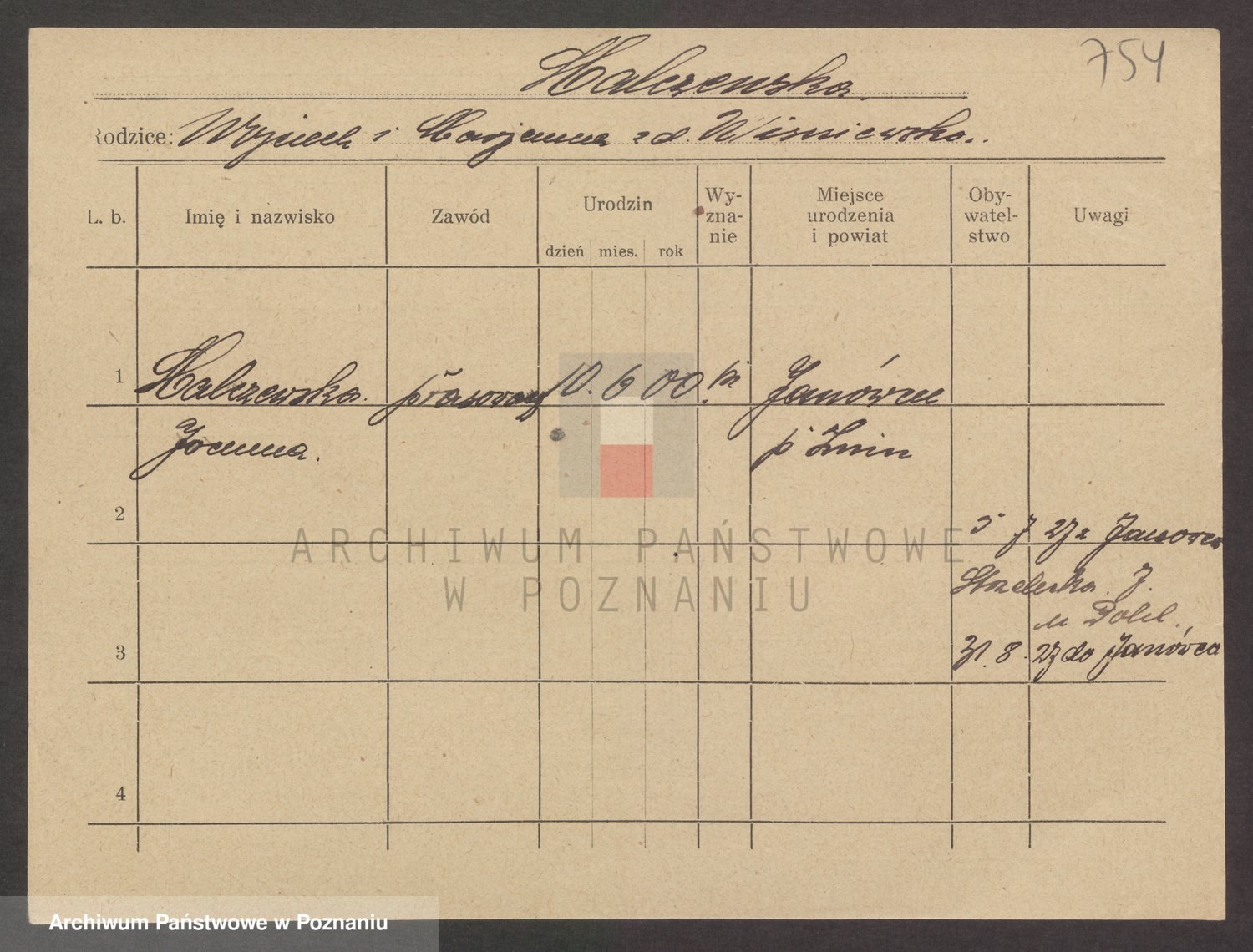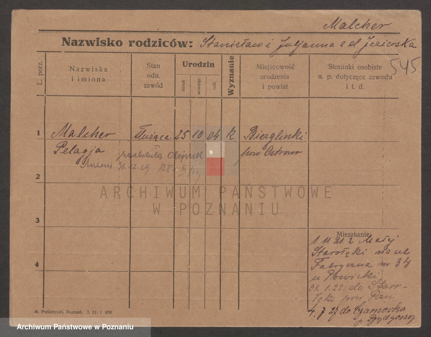 Podgląd karty osobowej dostępny jest po kliknięciu na nazwisko lub ikonkę karty. Można dokonywać powiększenia (ikony na górze) lub przechodzić między kolejnymi skanami (strzałki po bokach).