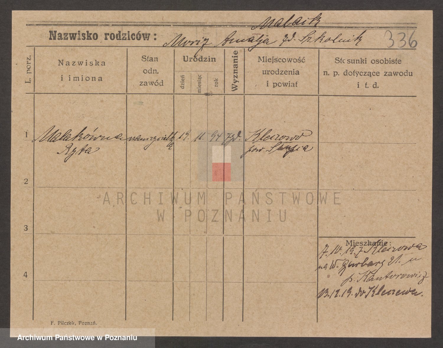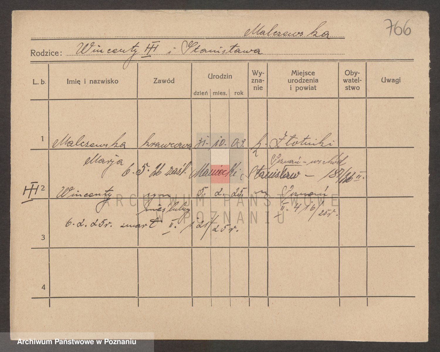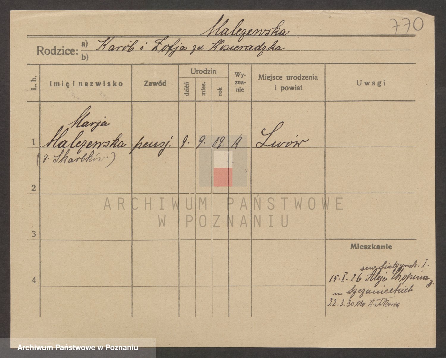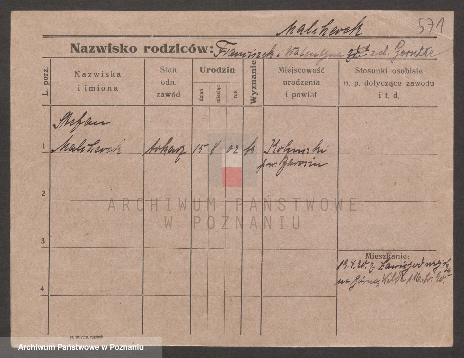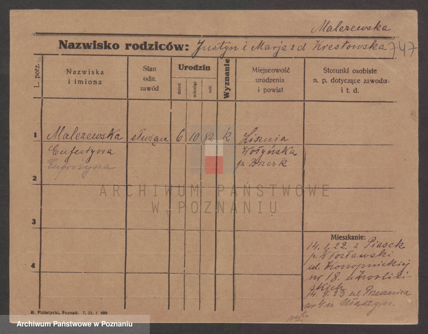 Podgląd karty osobowej dostępny jest po kliknięciu na nazwisko lub ikonkę karty. Można dokonywać powiększenia (ikony na górze) lub przechodzić między kolejnymi skanami (strzałki po bokach).