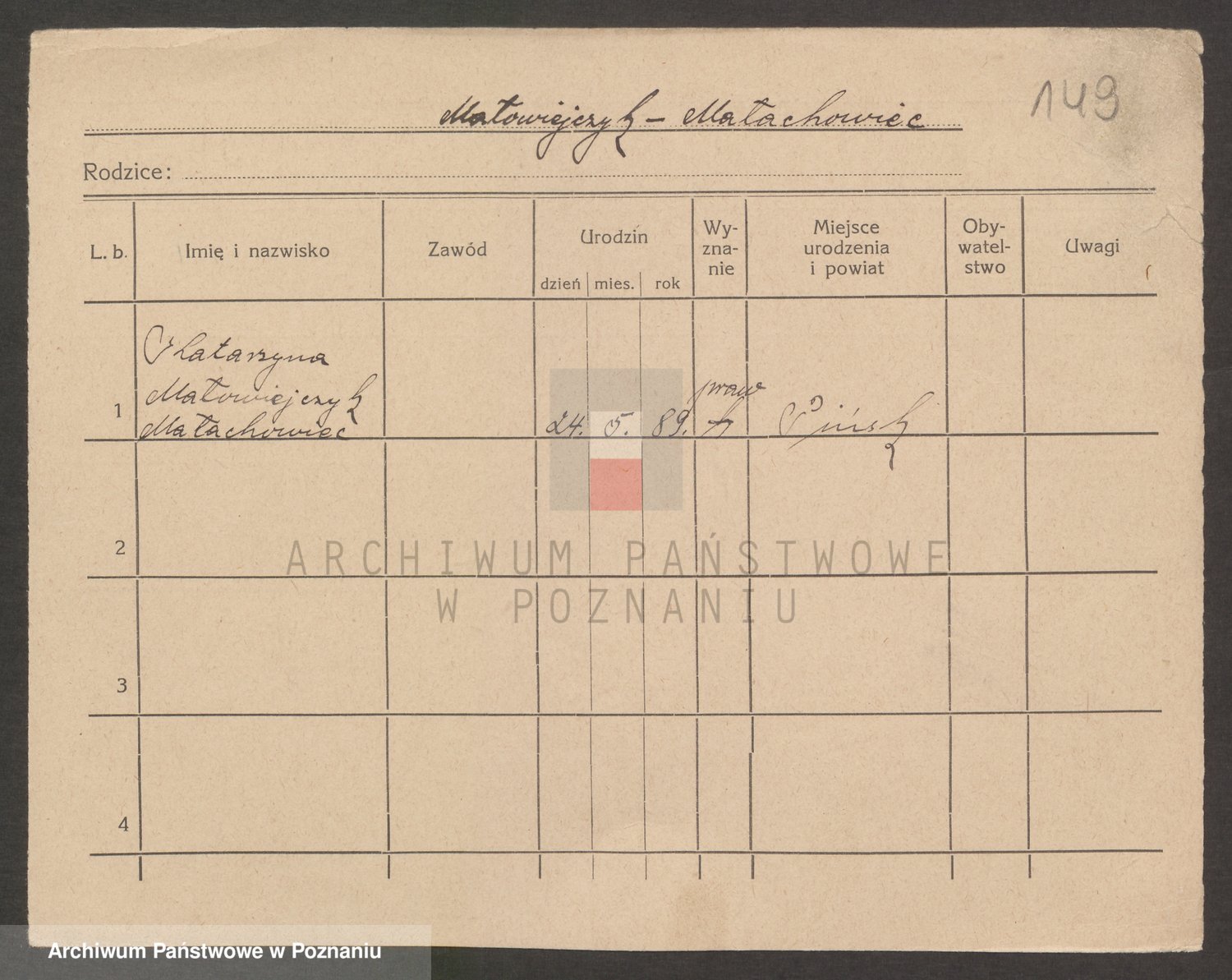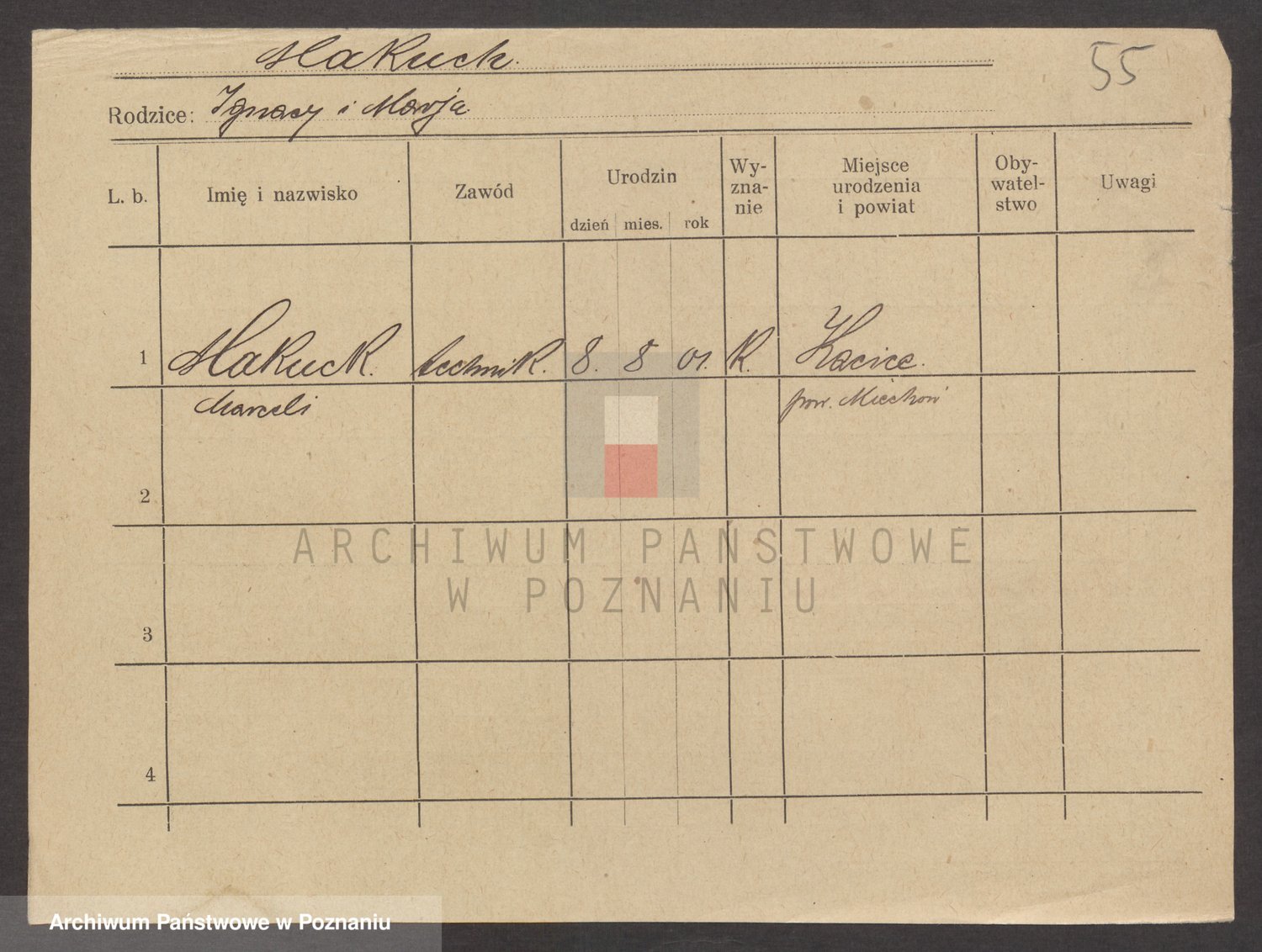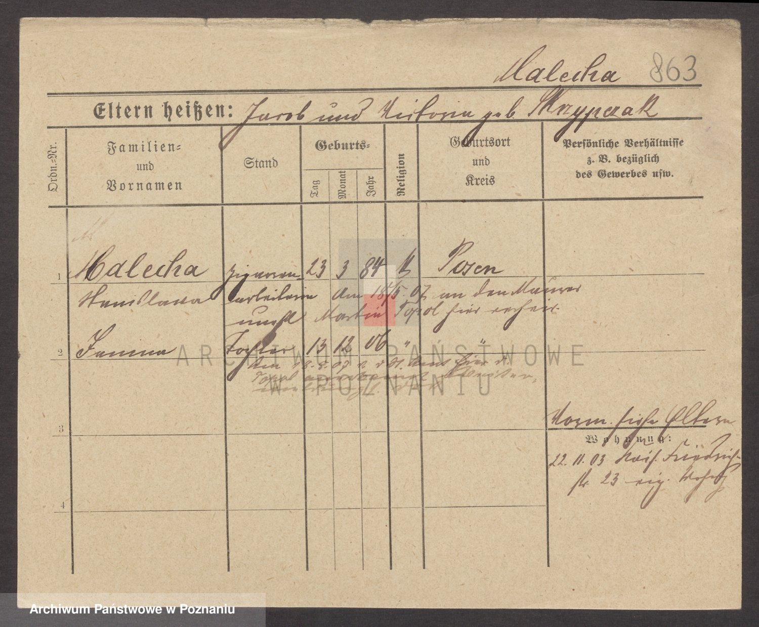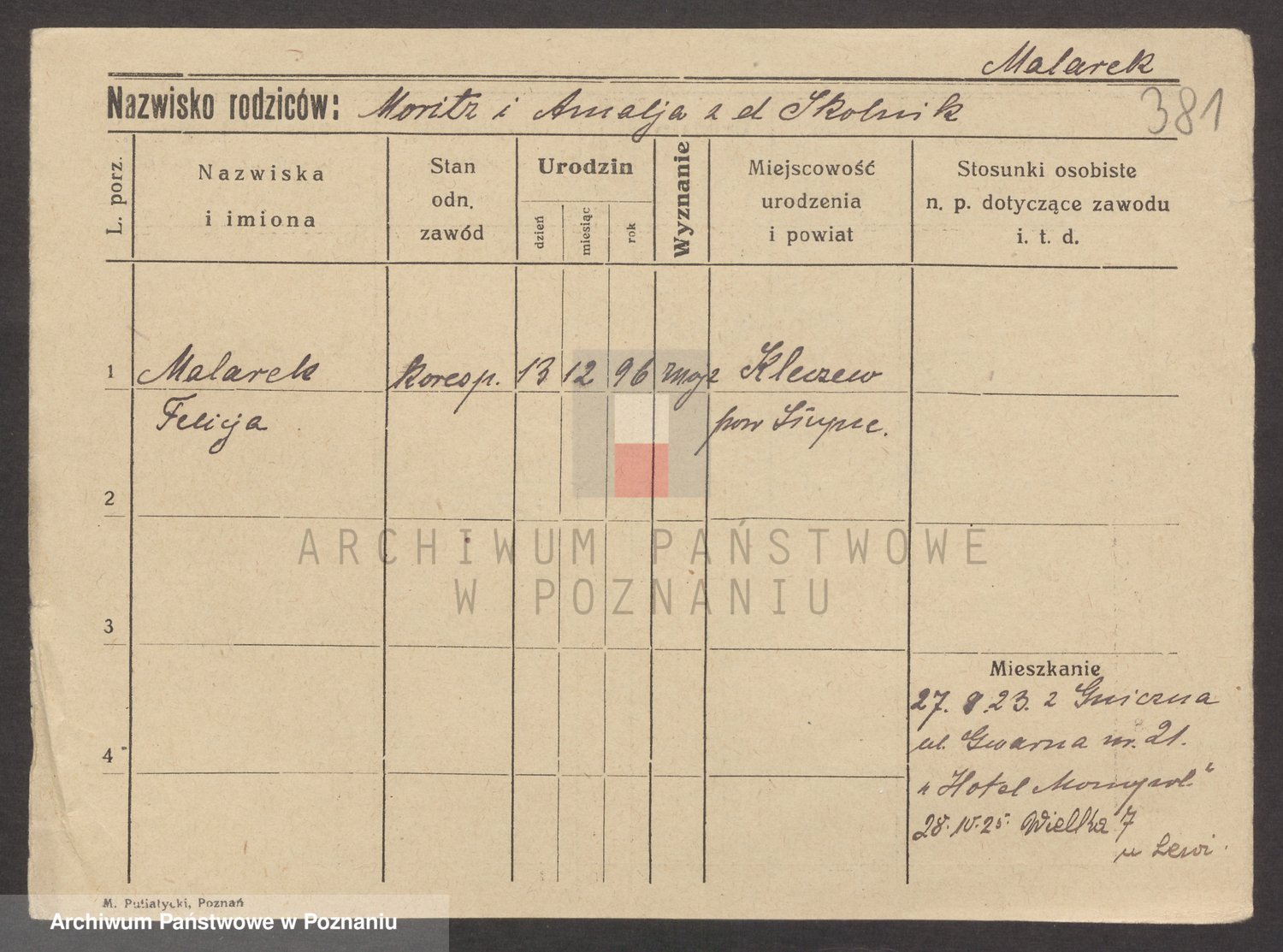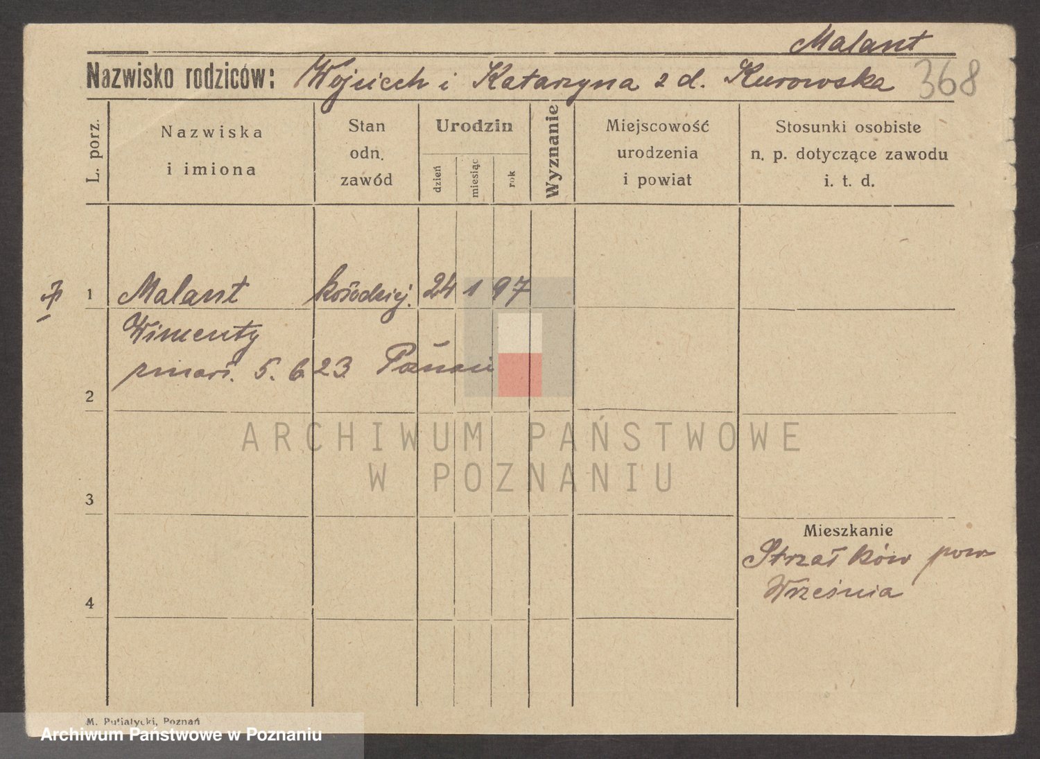 Podgląd karty osobowej dostępny jest po kliknięciu na nazwisko lub ikonkę karty. Można dokonywać powiększenia (ikony na górze) lub przechodzić między kolejnymi skanami (strzałki po bokach).