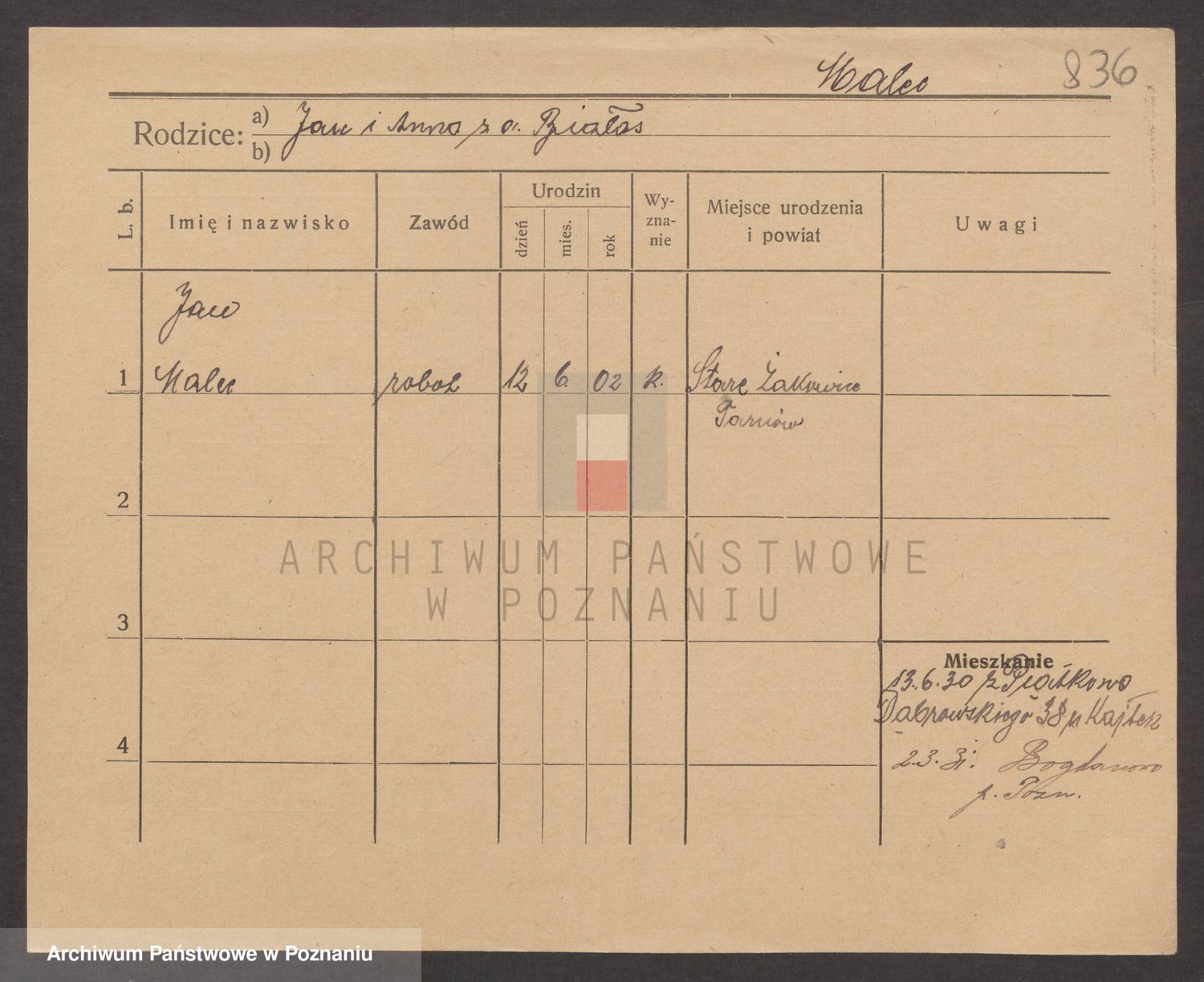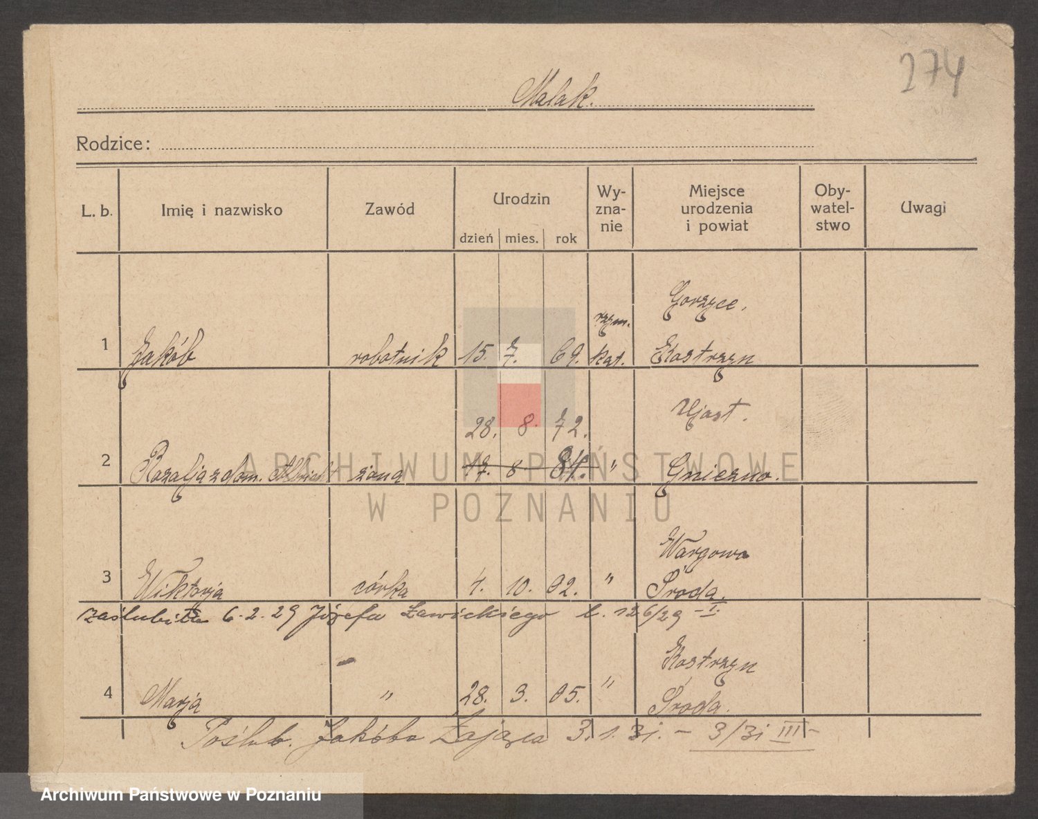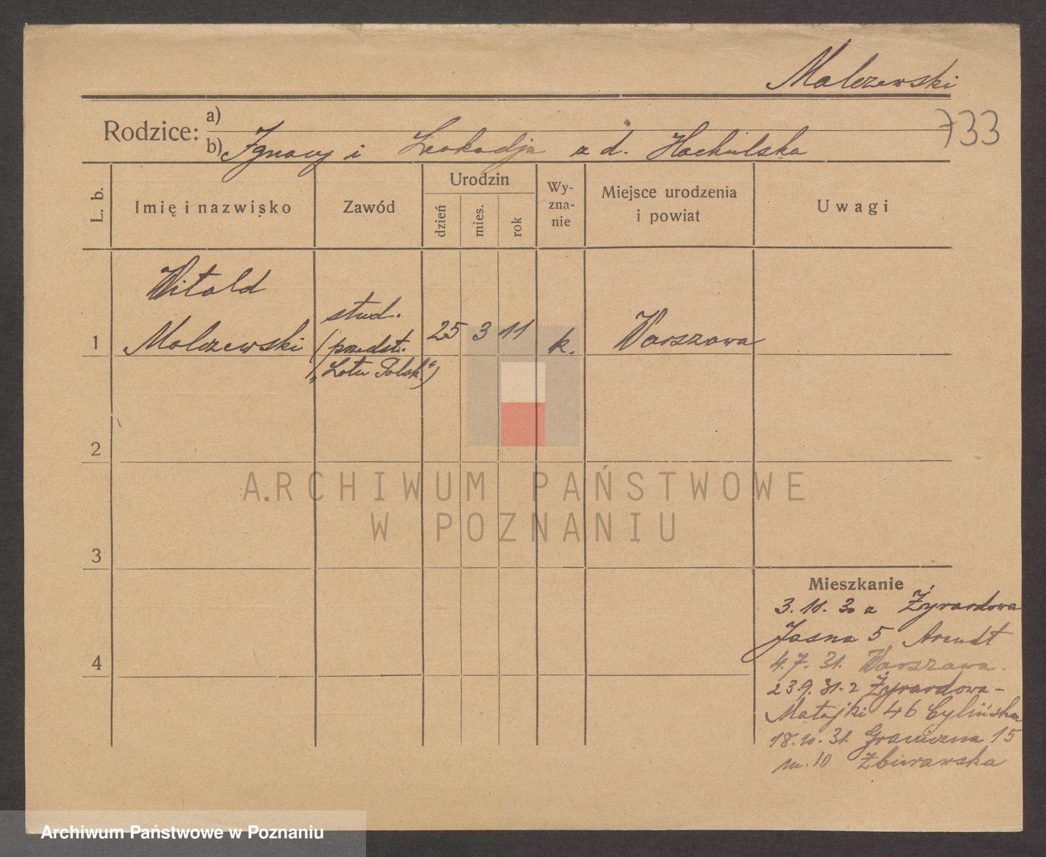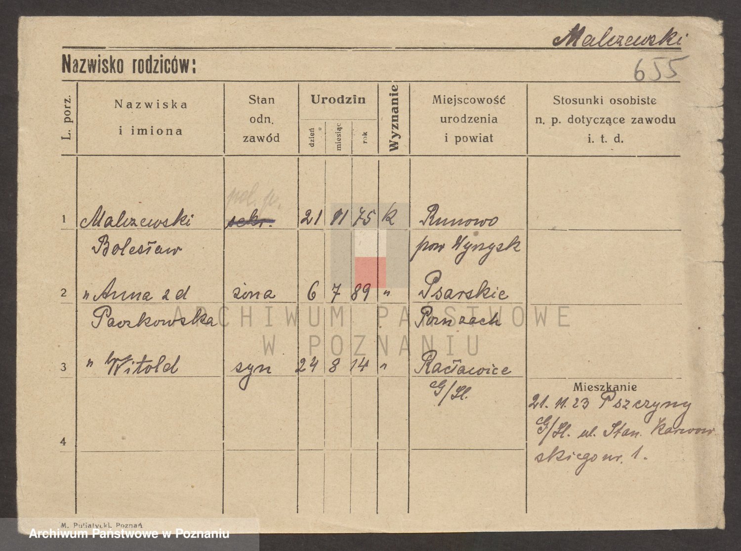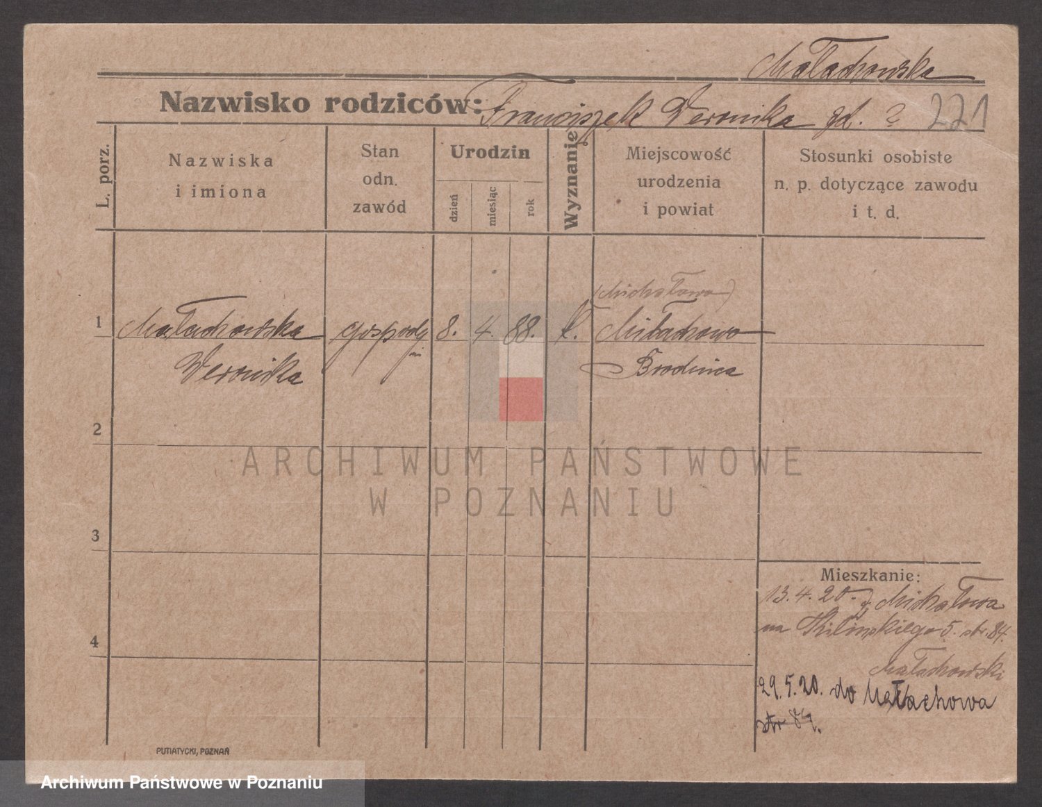 Podgląd karty osobowej dostępny jest po kliknięciu na nazwisko lub ikonkę karty. Można dokonywać powiększenia (ikony na górze) lub przechodzić między kolejnymi skanami (strzałki po bokach).