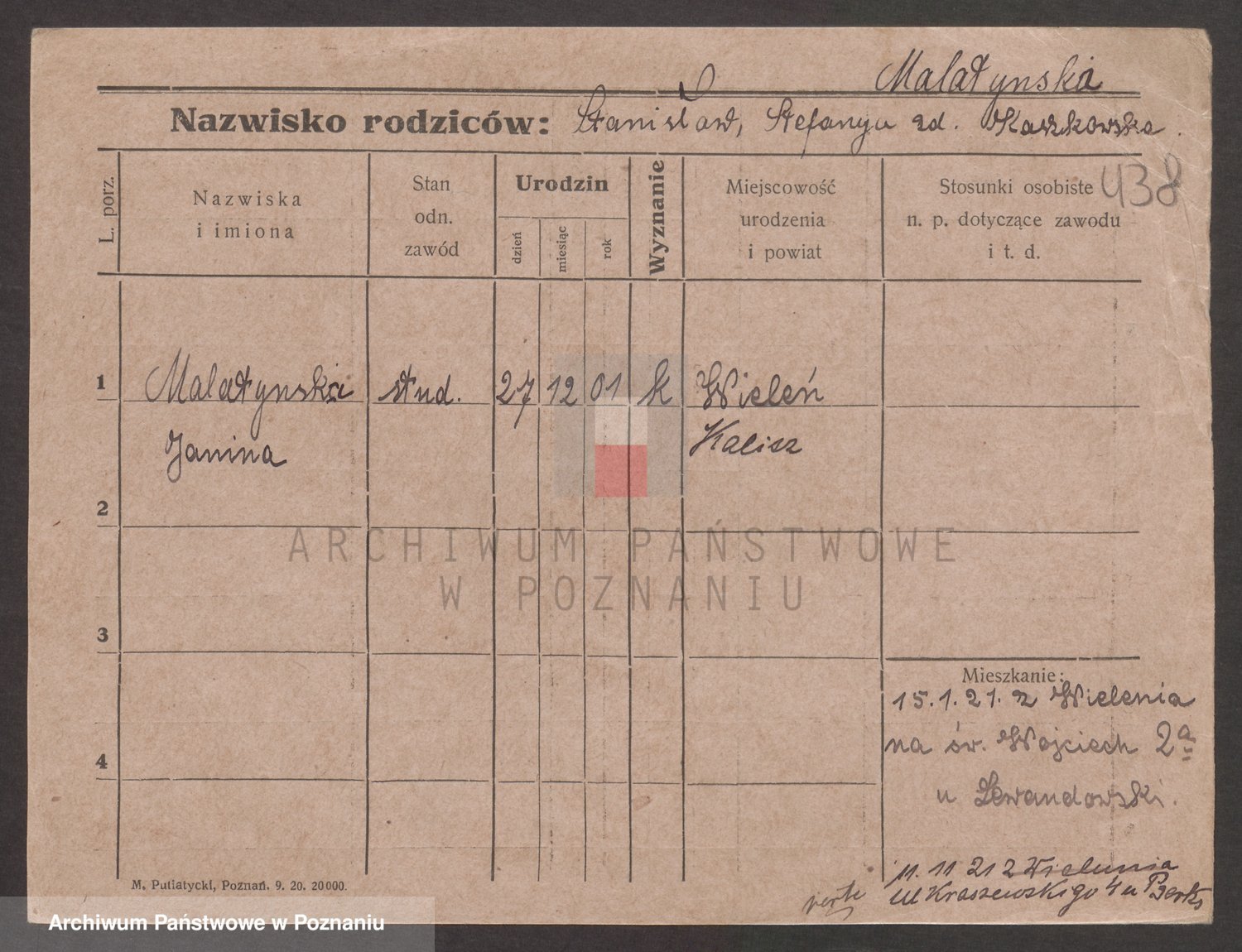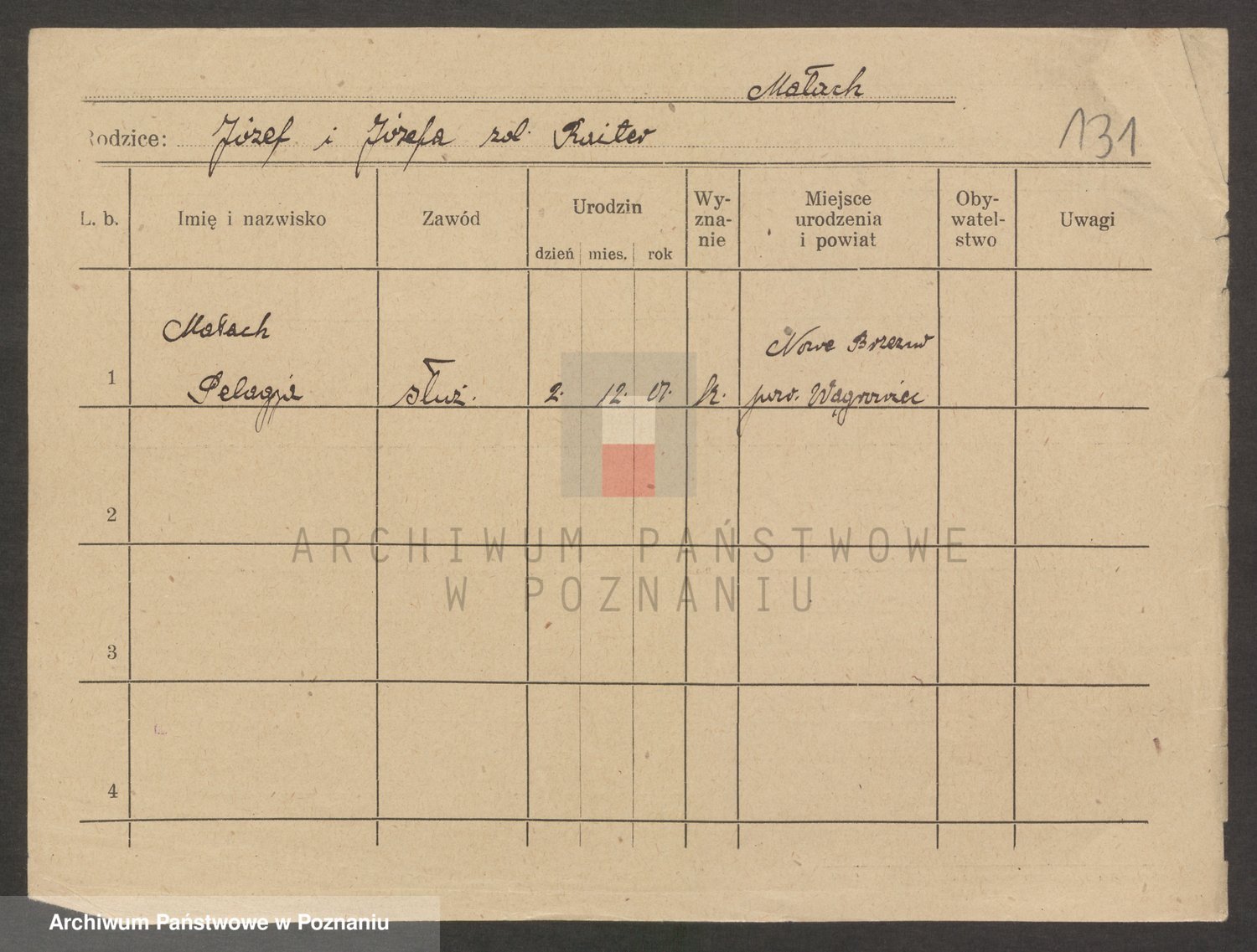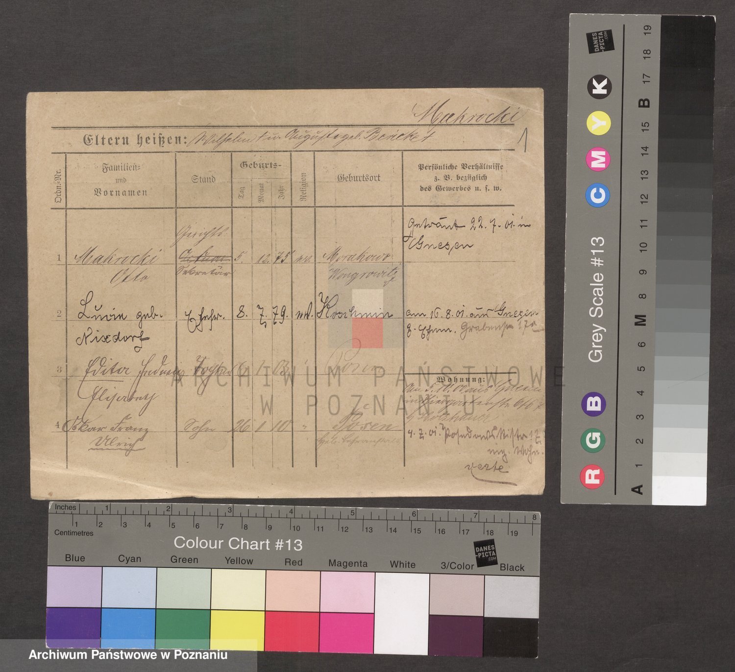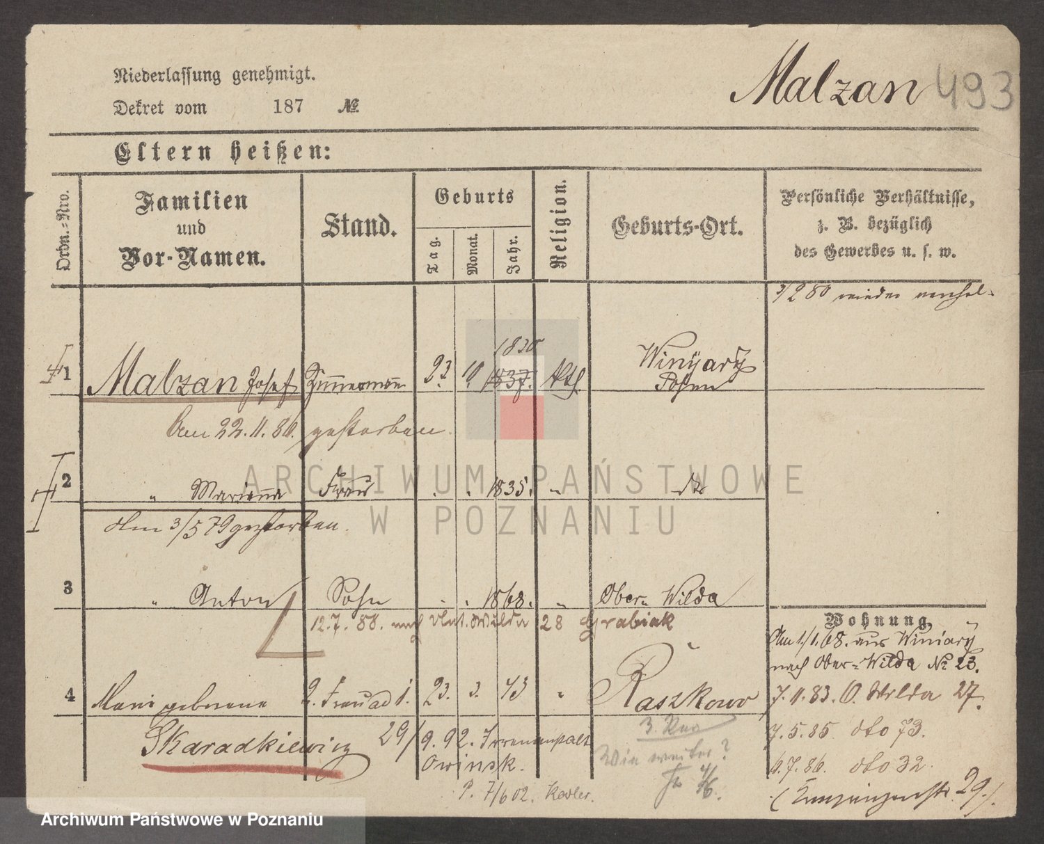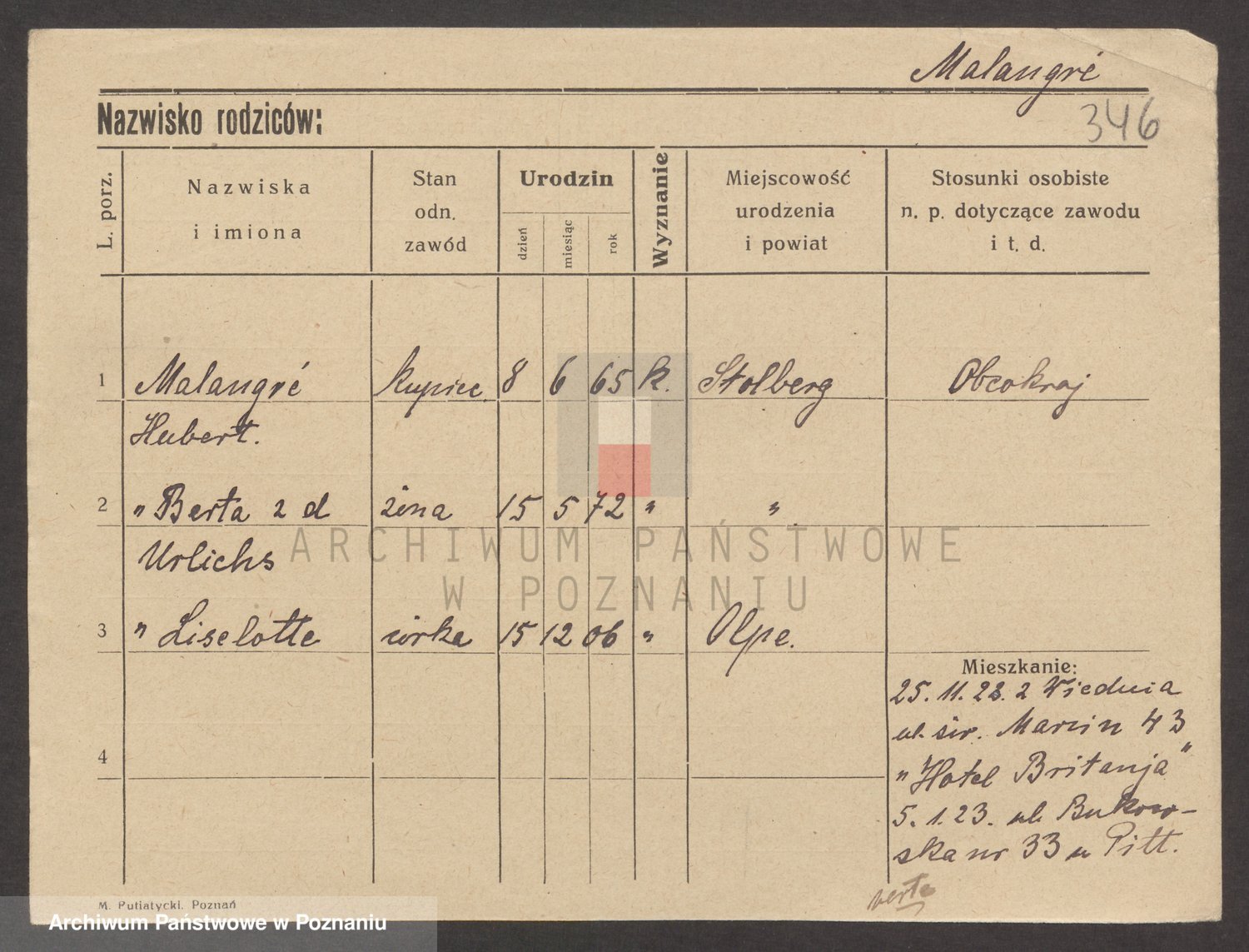Podgląd karty osobowej dostępny jest po kliknięciu na nazwisko lub ikonkę karty. Można dokonywać powiększenia (ikony na górze) lub przechodzić między kolejnymi skanami (strzałki po bokach).
