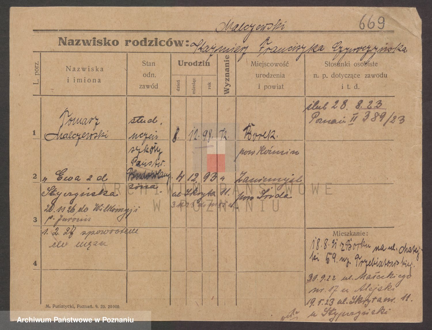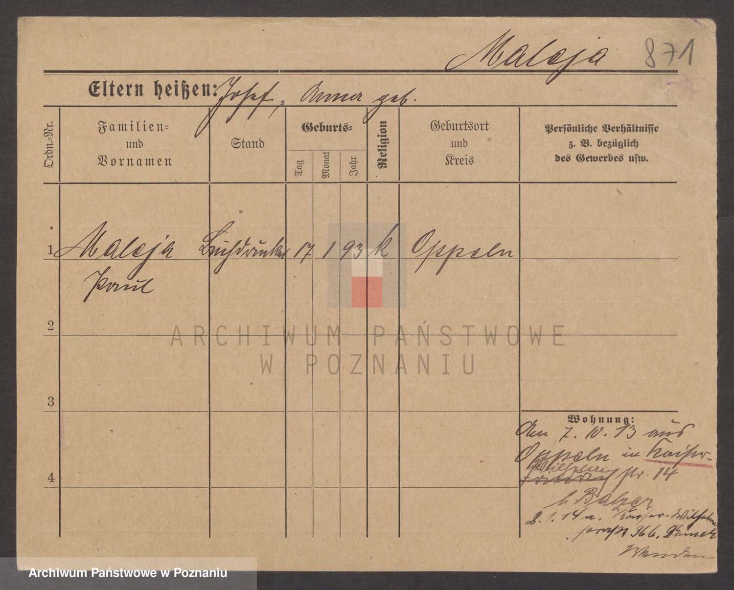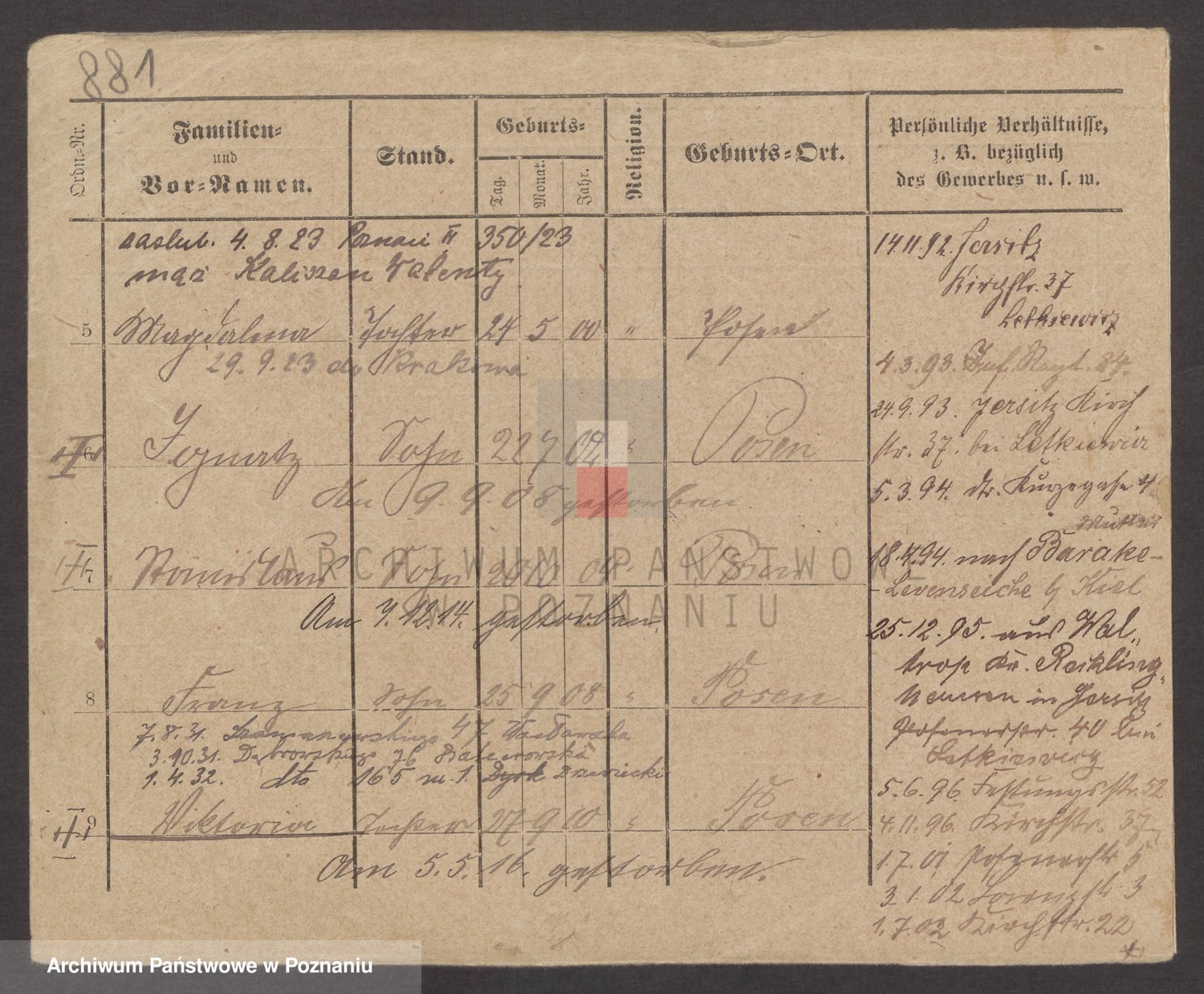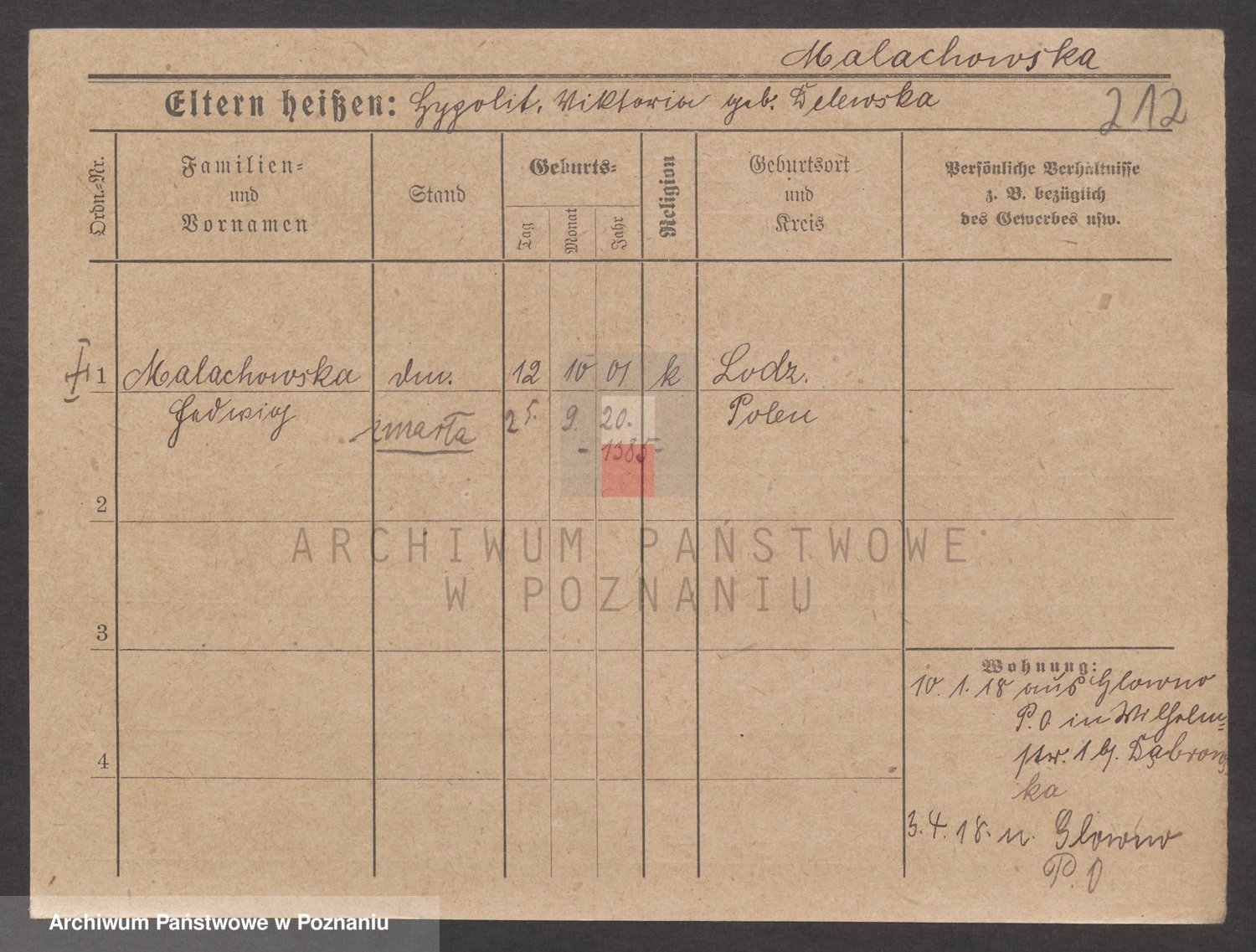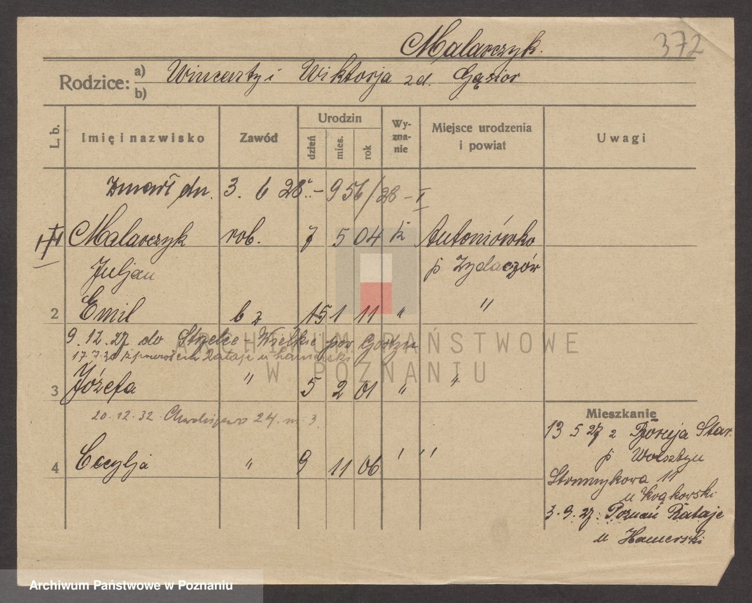 Podgląd karty osobowej dostępny jest po kliknięciu na nazwisko lub ikonkę karty. Można dokonywać powiększenia (ikony na górze) lub przechodzić między kolejnymi skanami (strzałki po bokach).