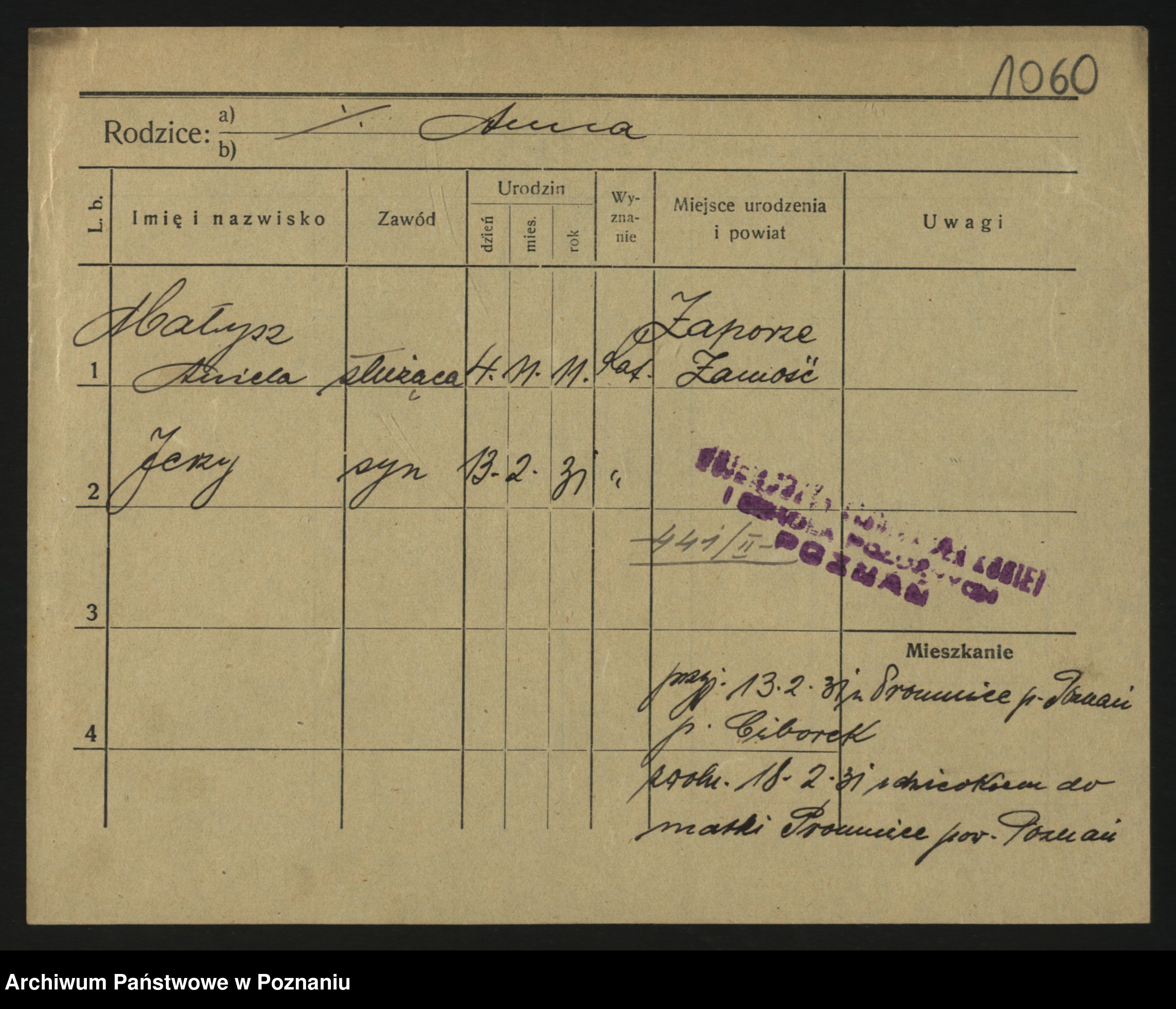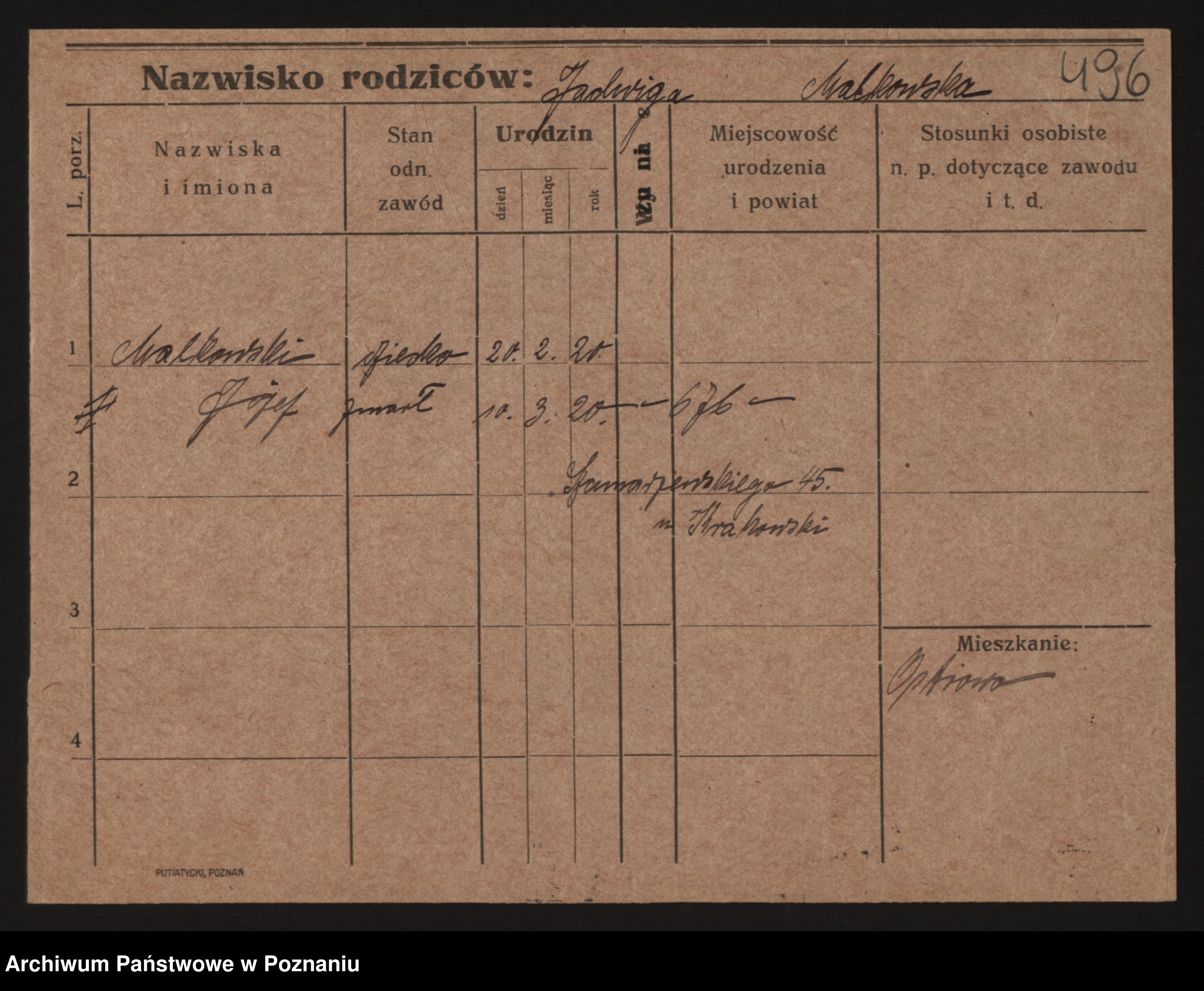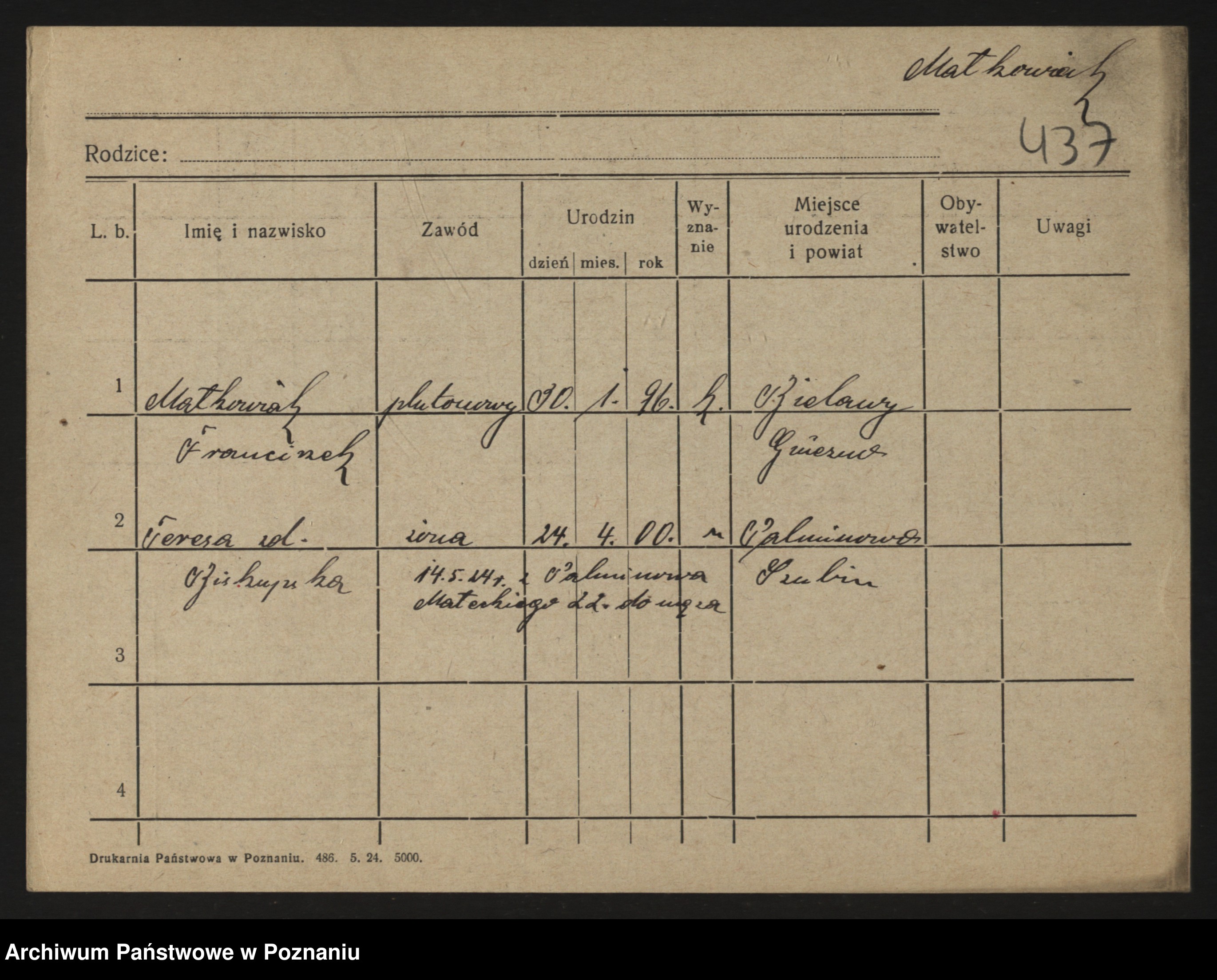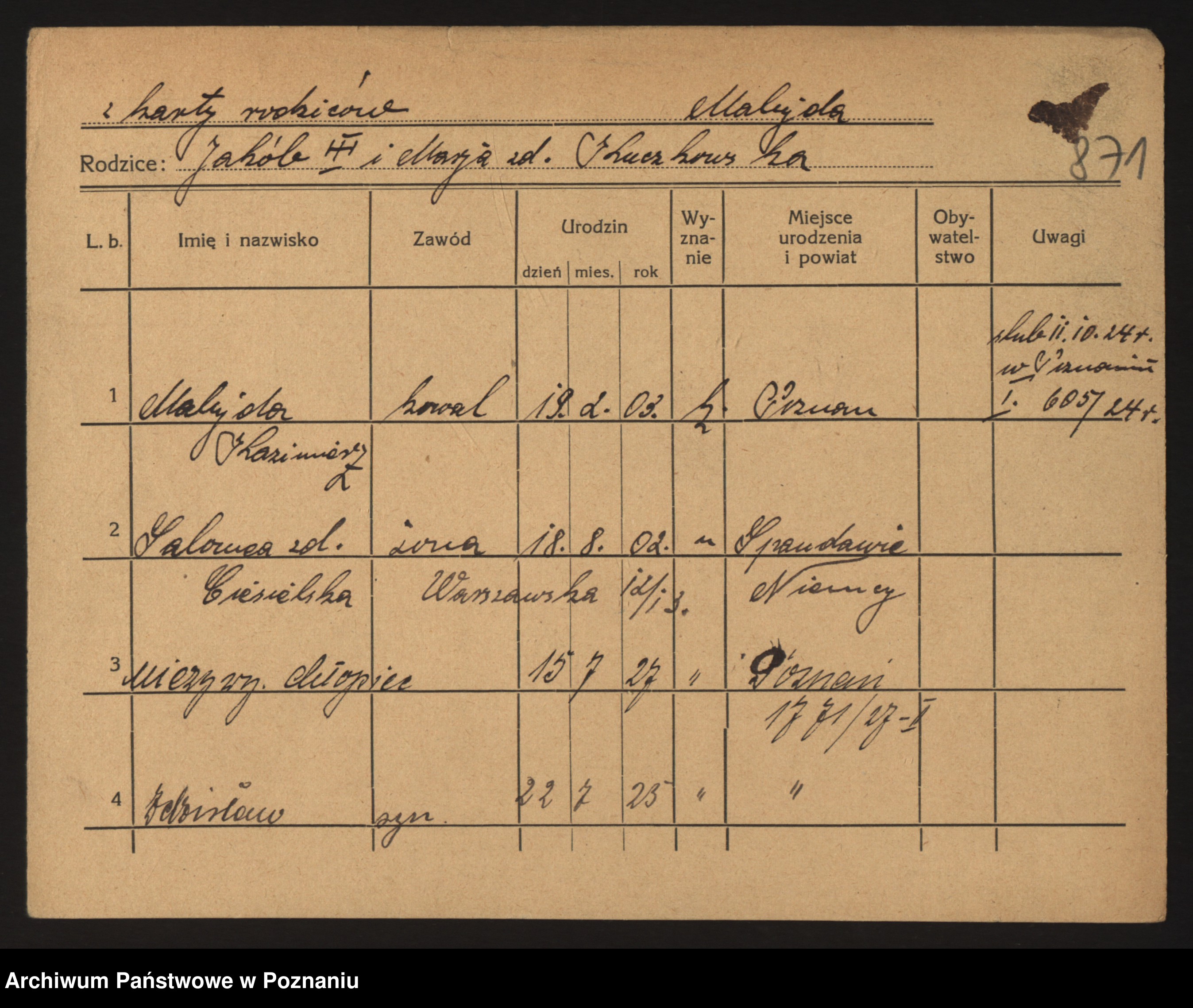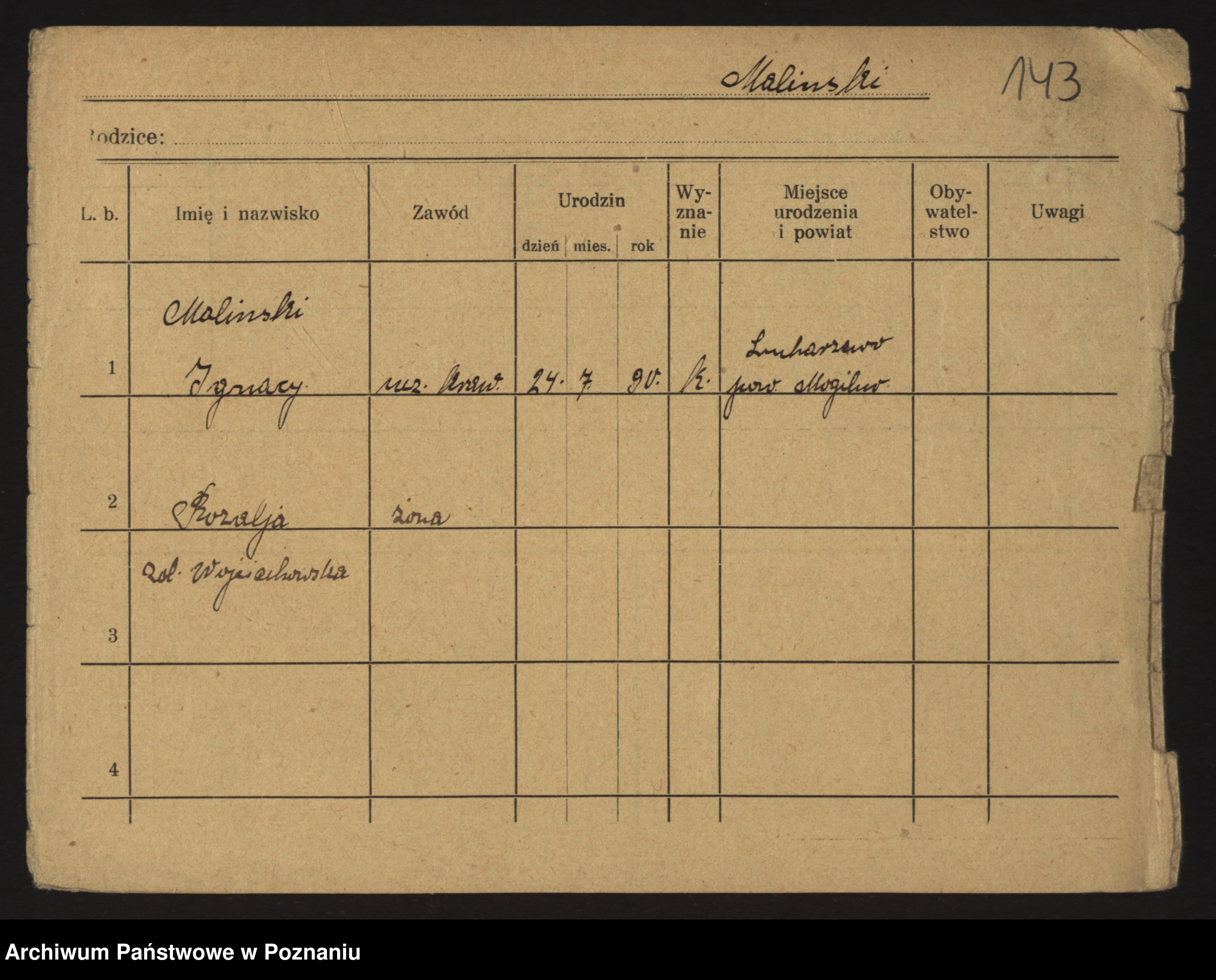 Podgląd karty osobowej dostępny jest po kliknięciu na nazwisko lub ikonkę karty. Można dokonywać powiększenia (ikony na górze) lub przechodzić między kolejnymi skanami (strzałki po bokach).