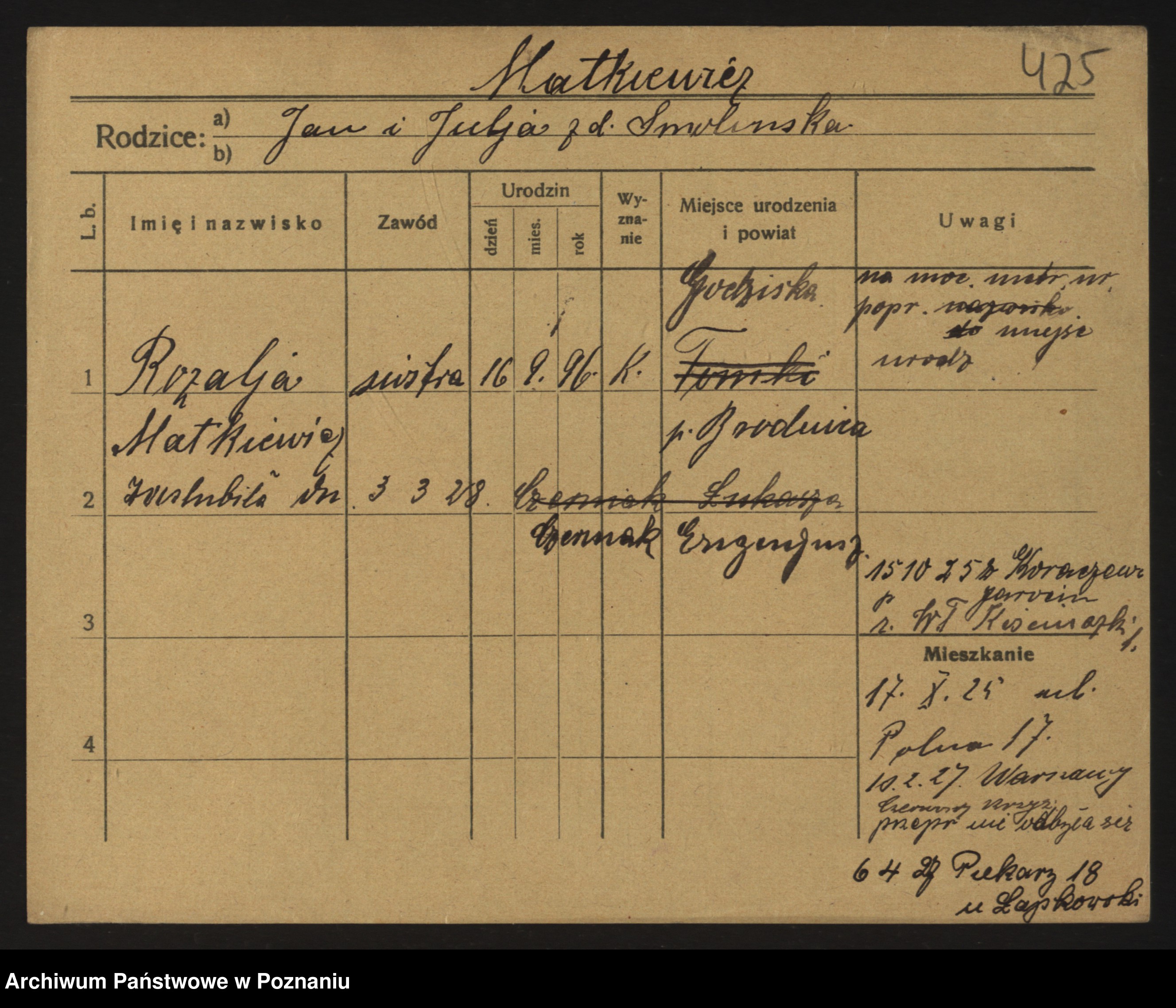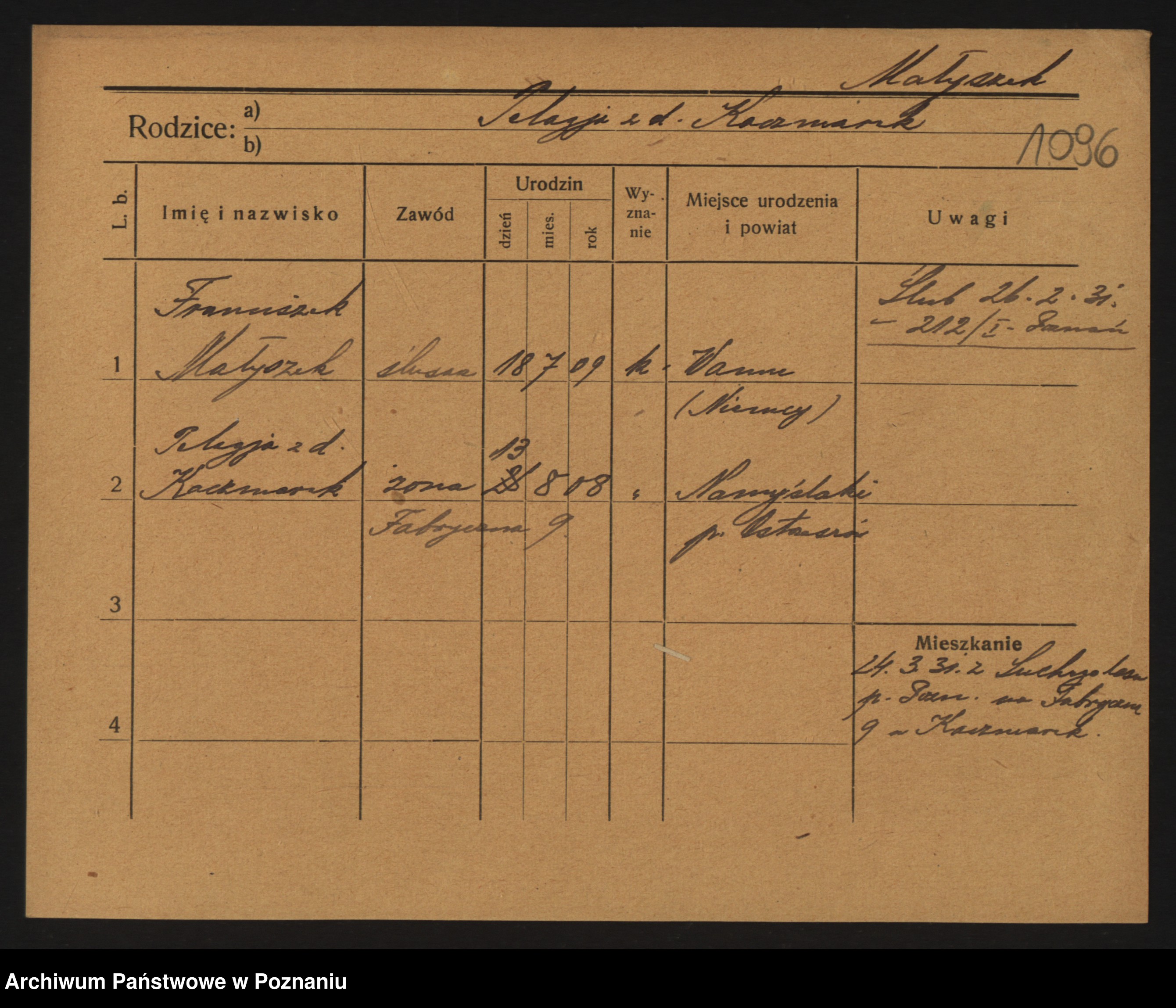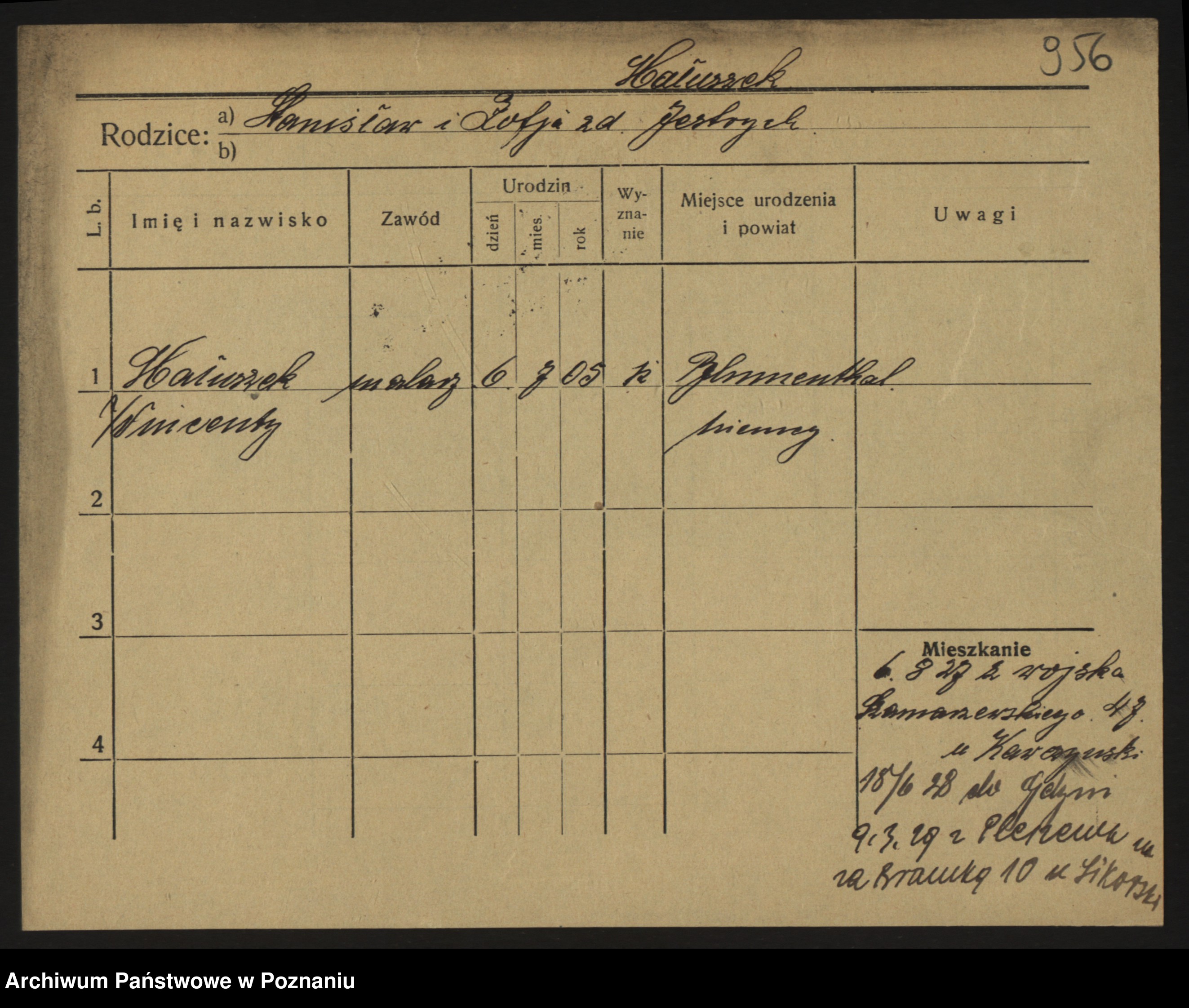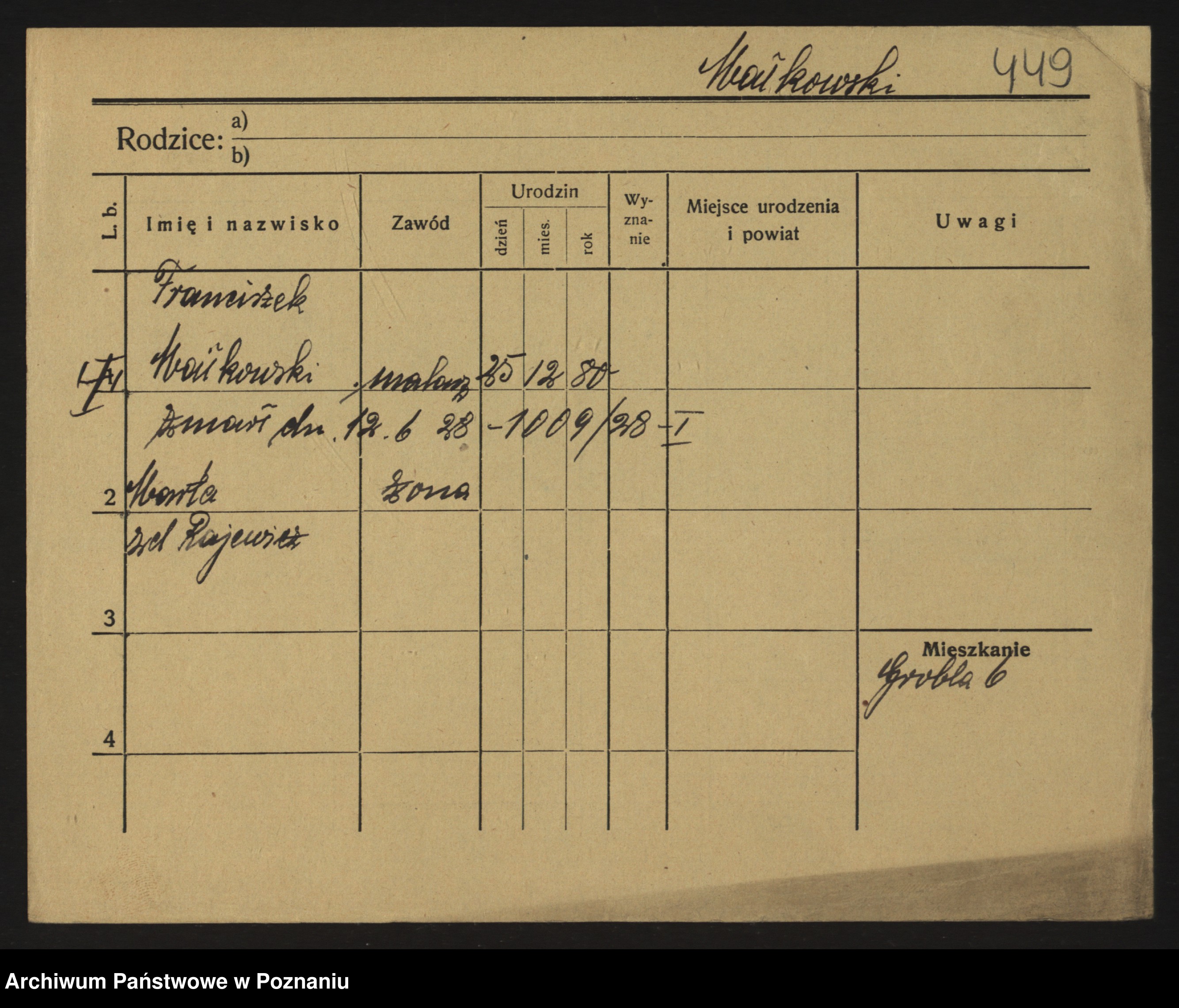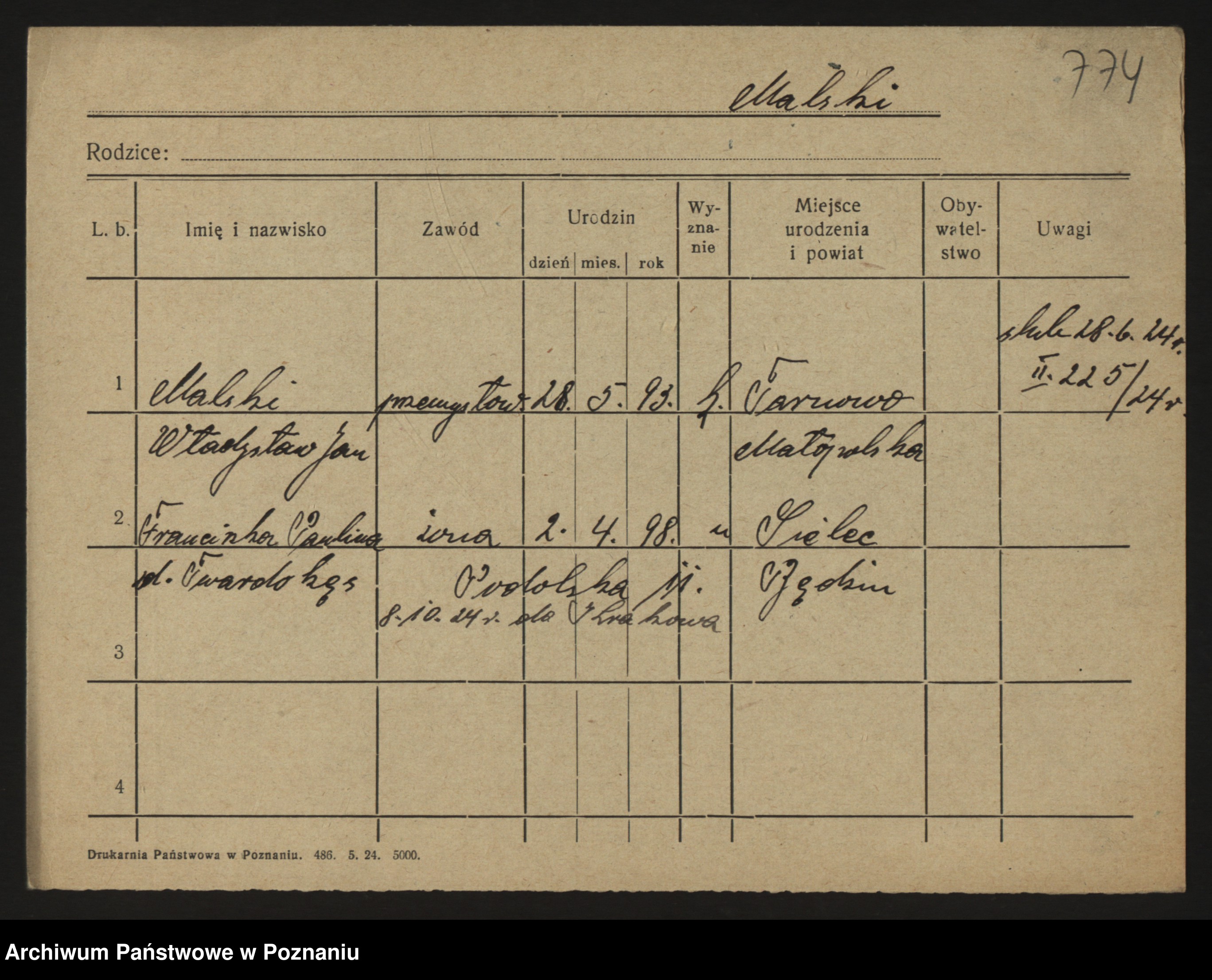 Podgląd karty osobowej dostępny jest po kliknięciu na nazwisko lub ikonkę karty. Można dokonywać powiększenia (ikony na górze) lub przechodzić między kolejnymi skanami (strzałki po bokach).