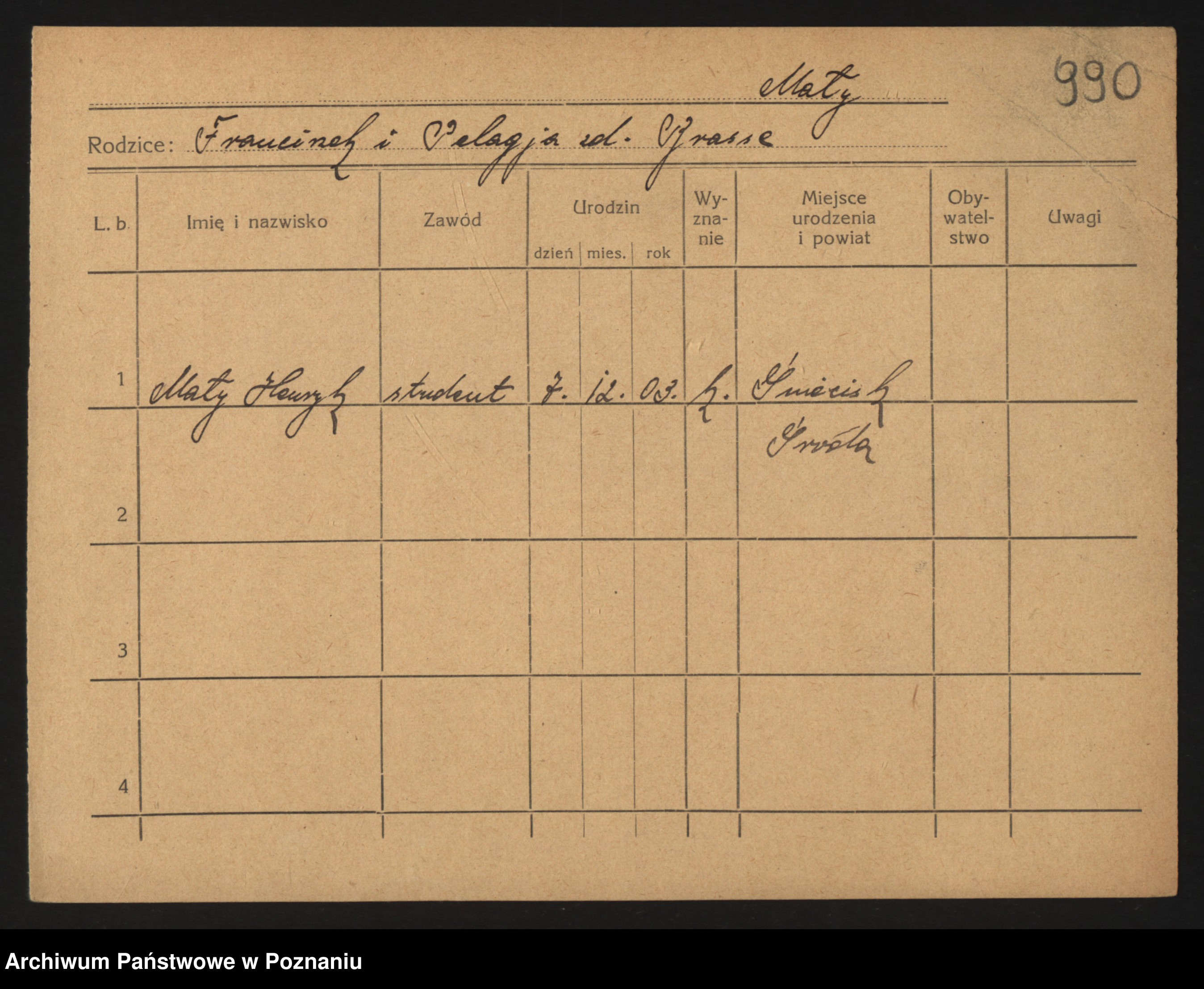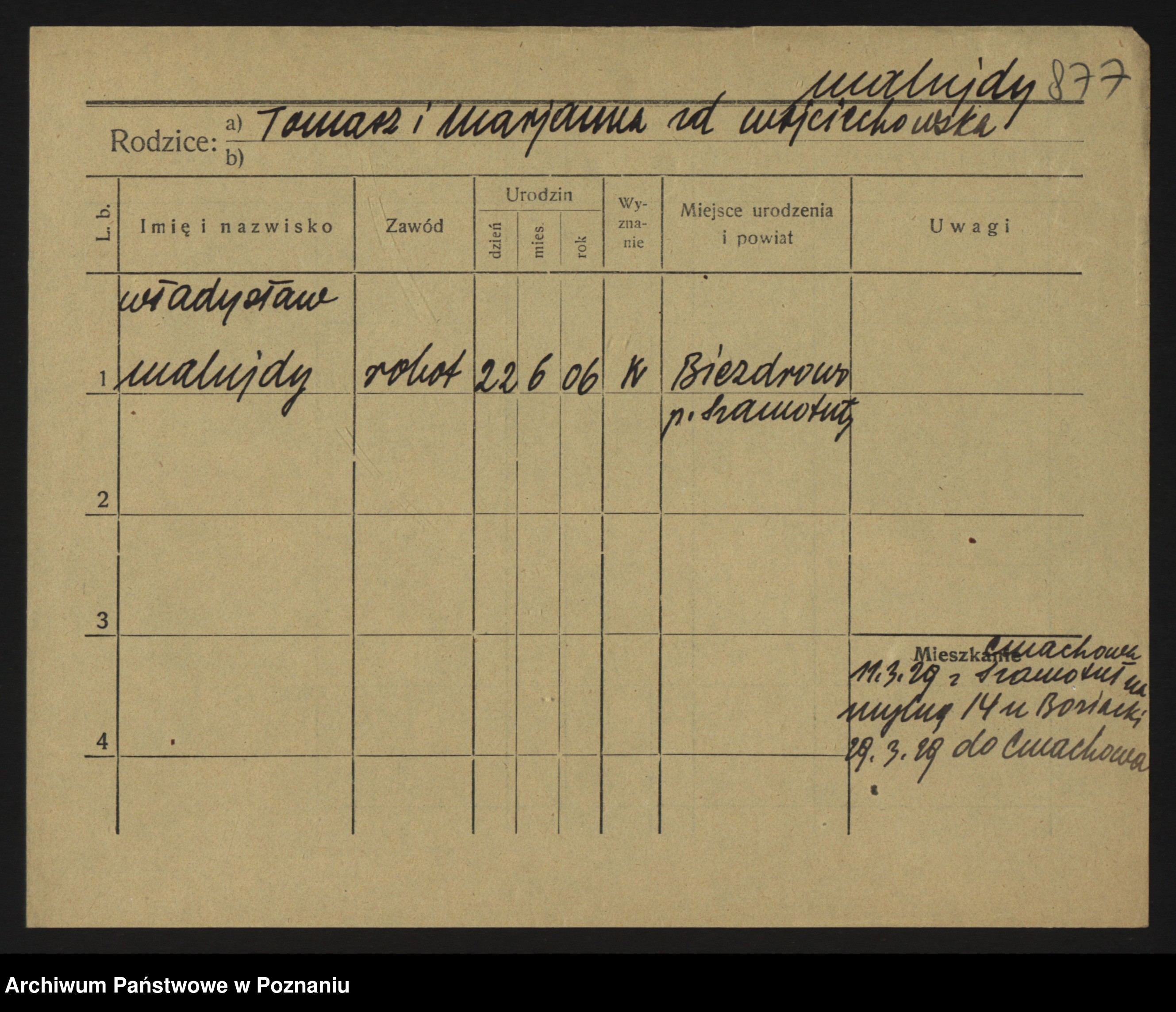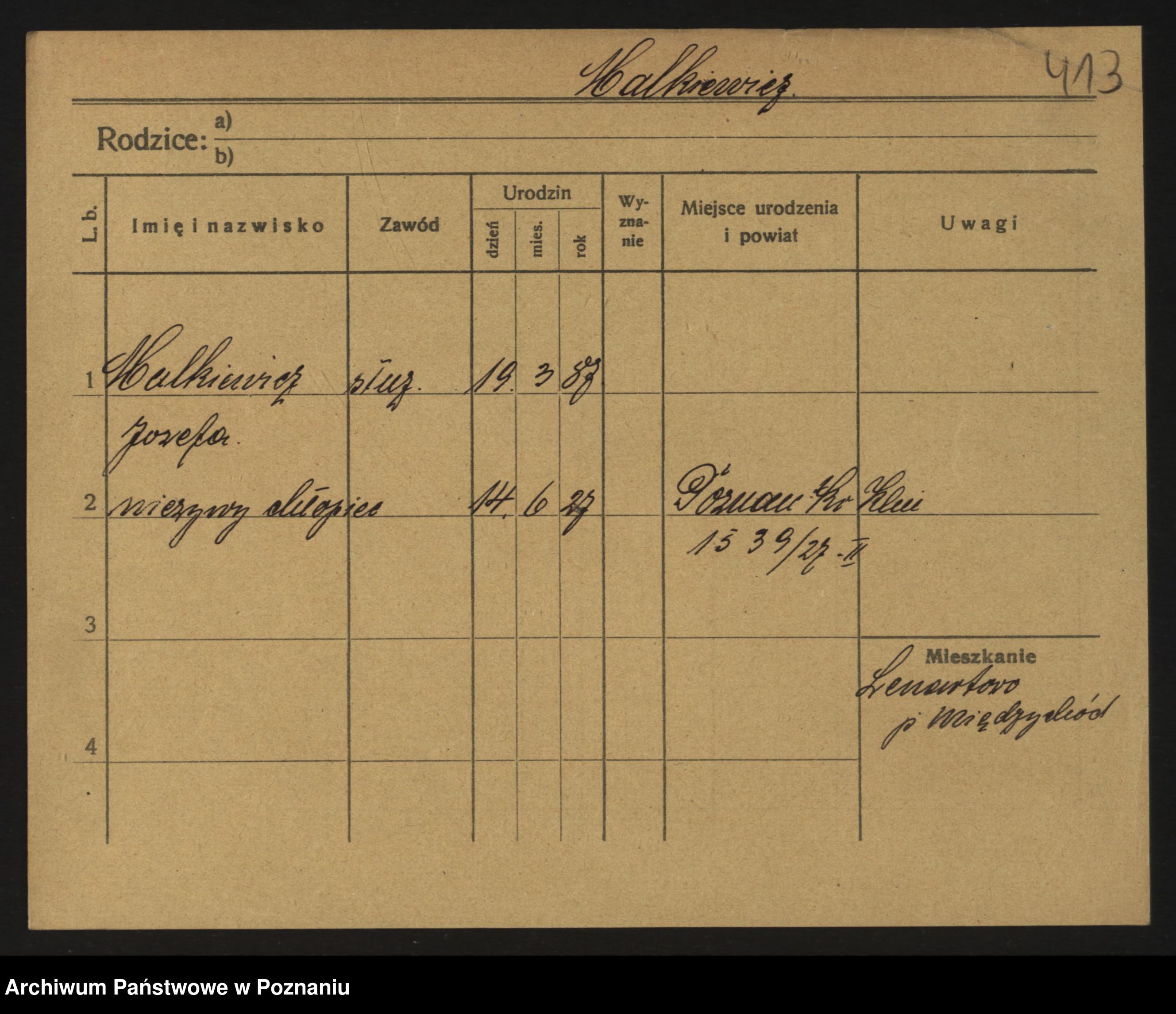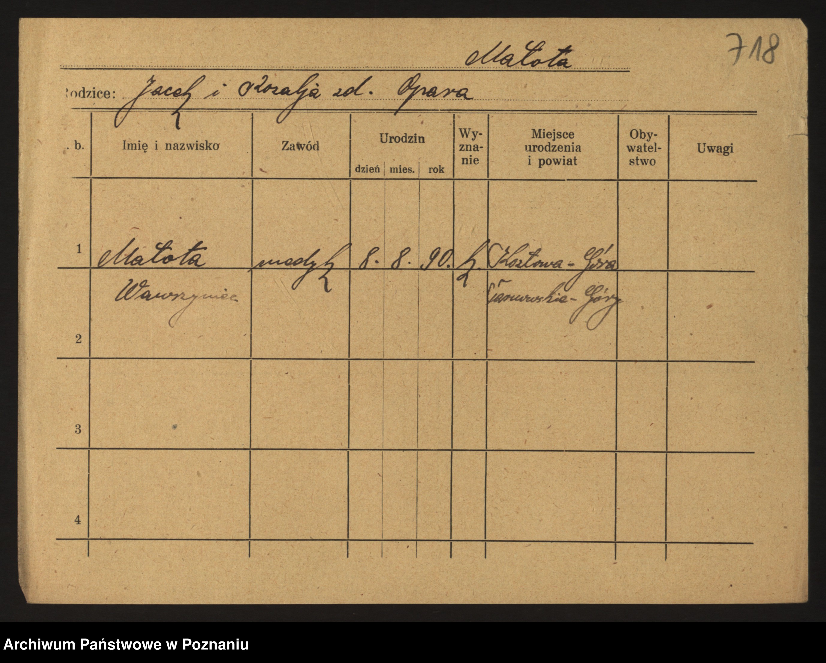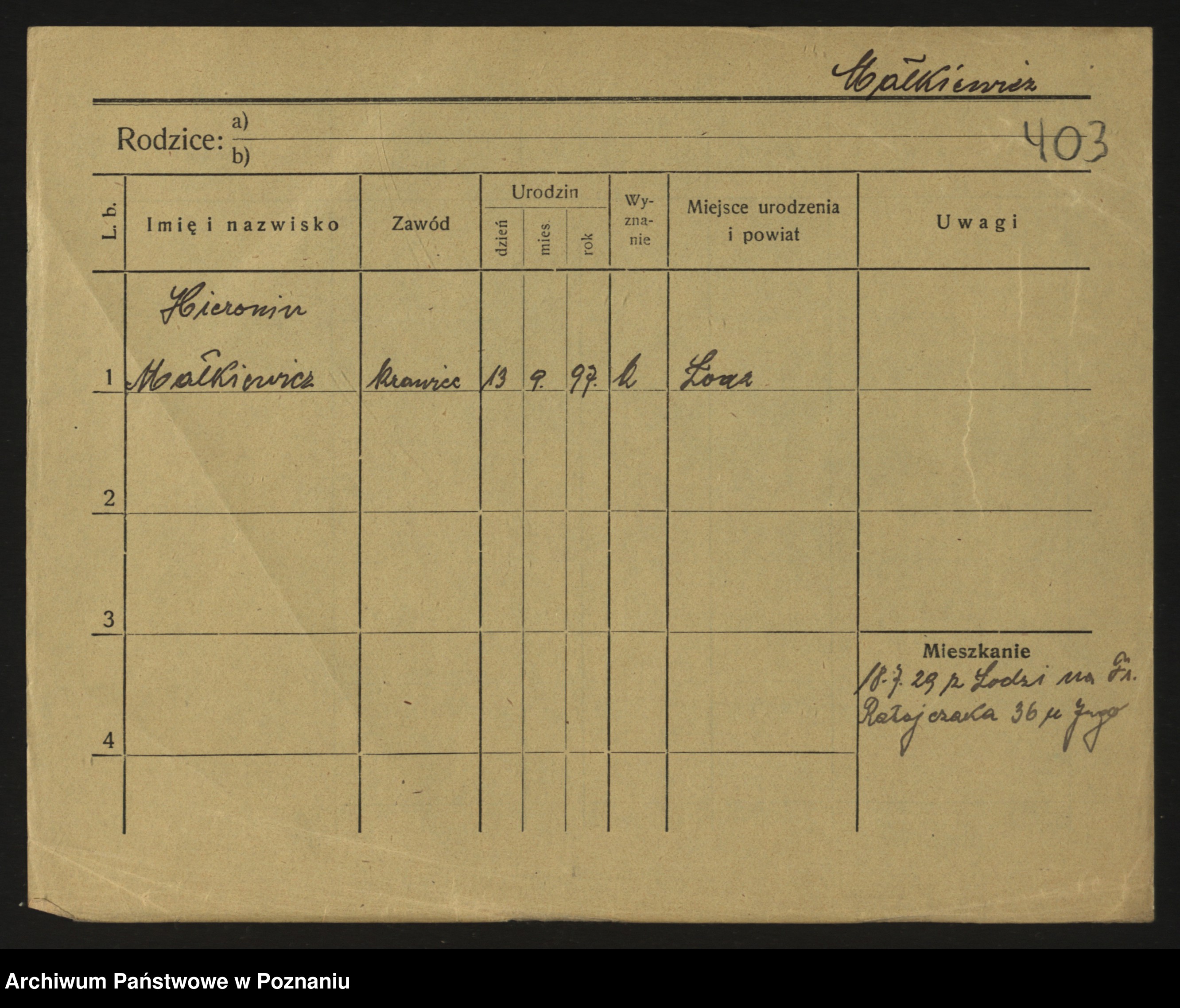 Podgląd karty osobowej dostępny jest po kliknięciu na nazwisko lub ikonkę karty. Można dokonywać powiększenia (ikony na górze) lub przechodzić między kolejnymi skanami (strzałki po bokach).