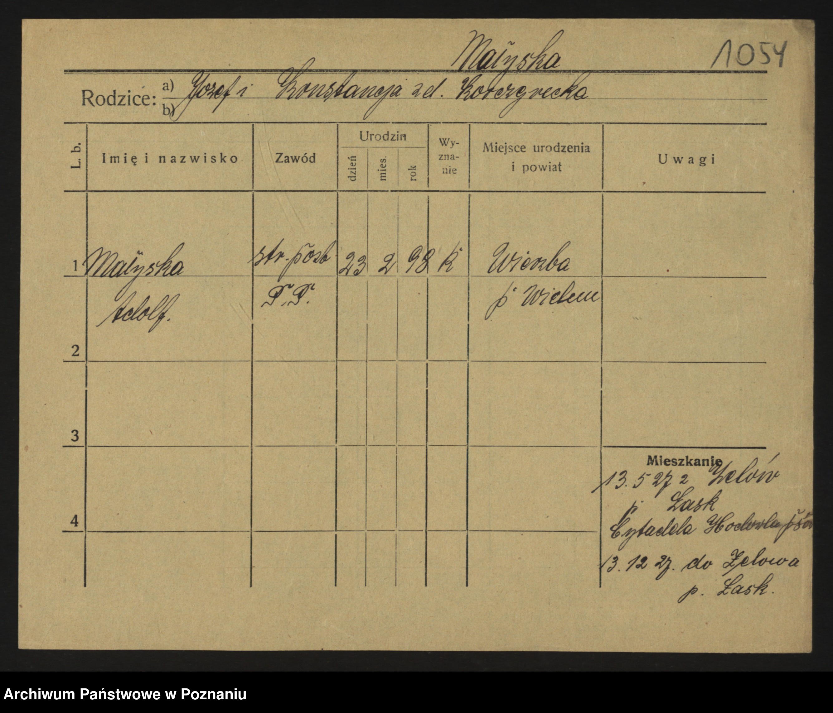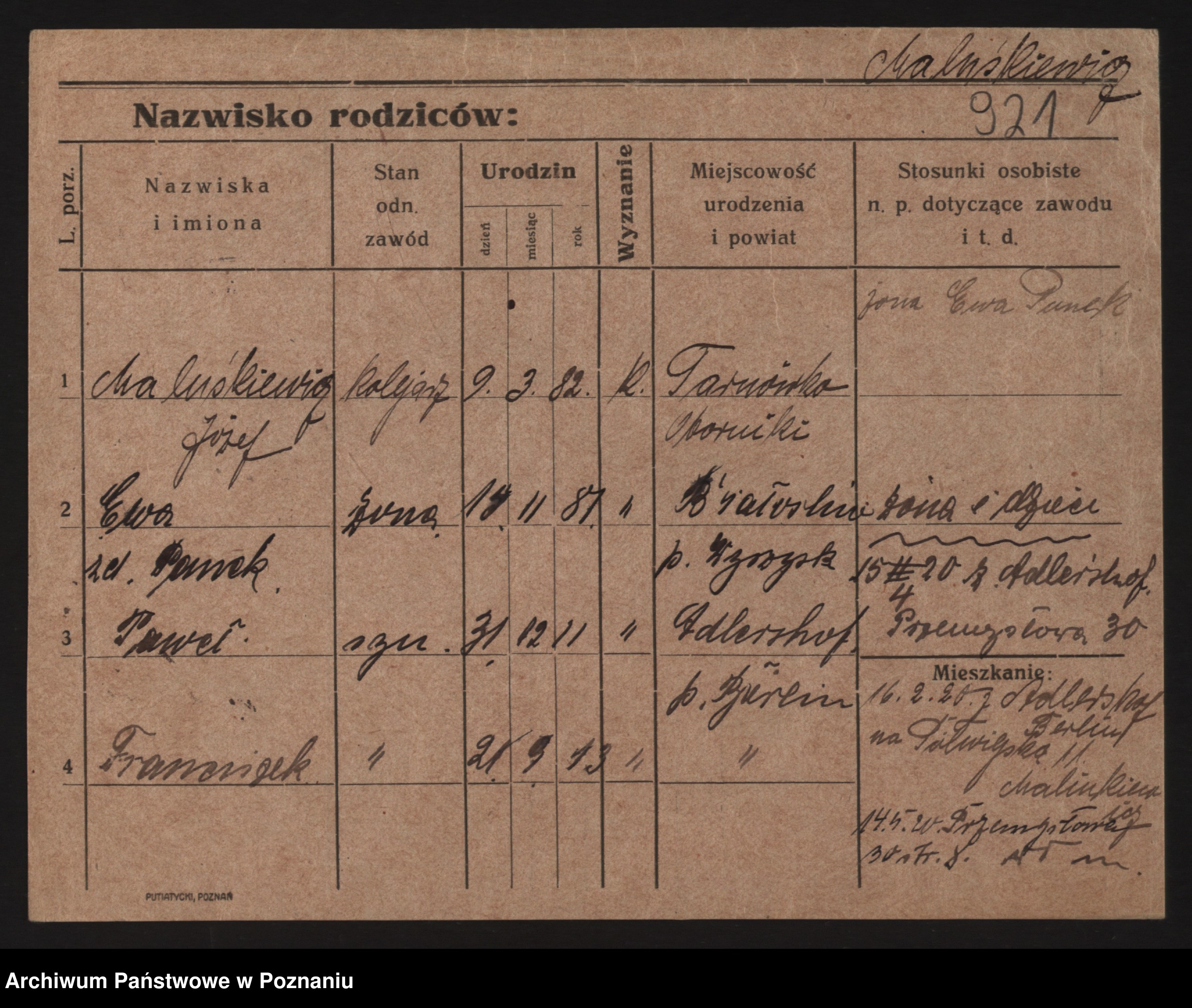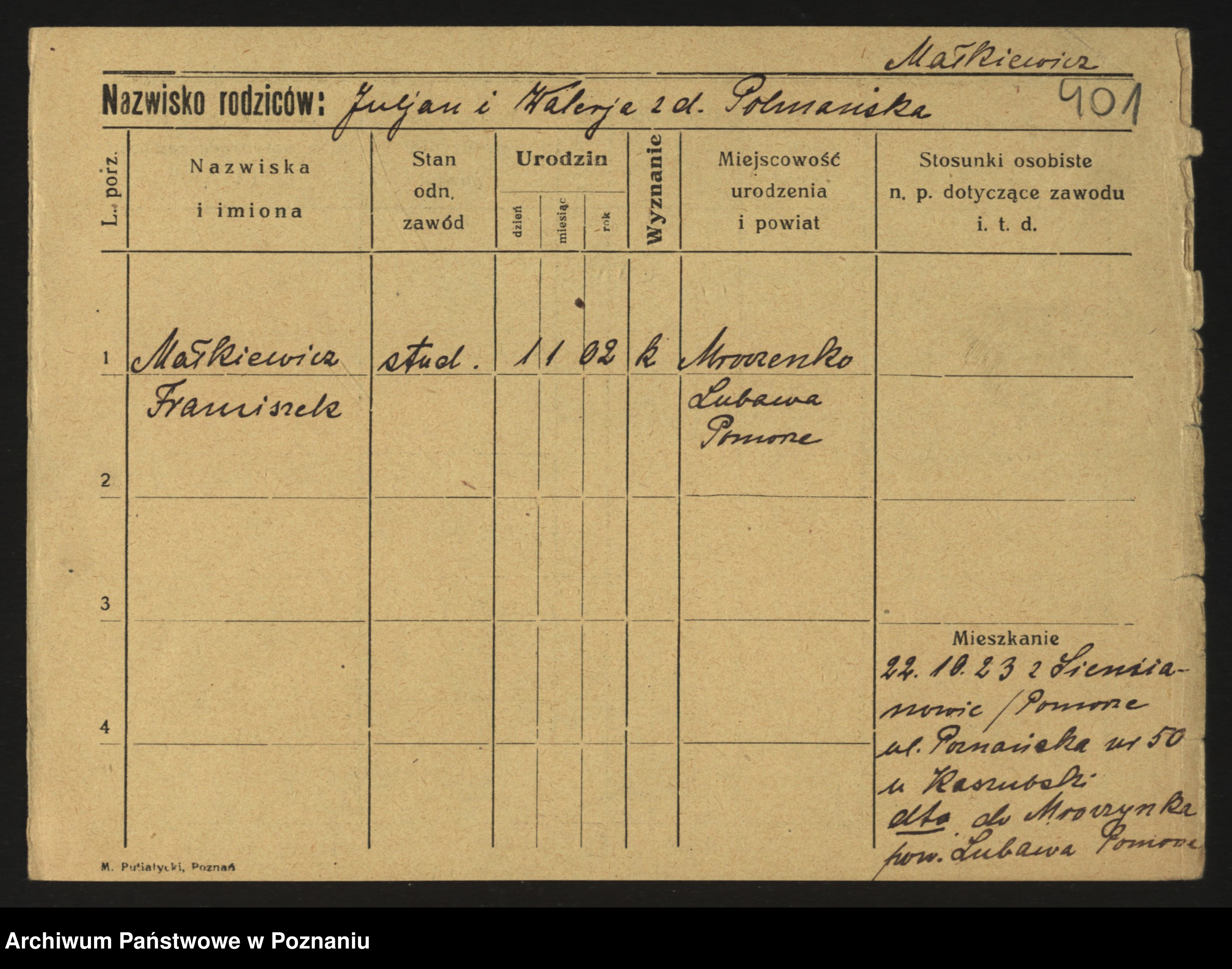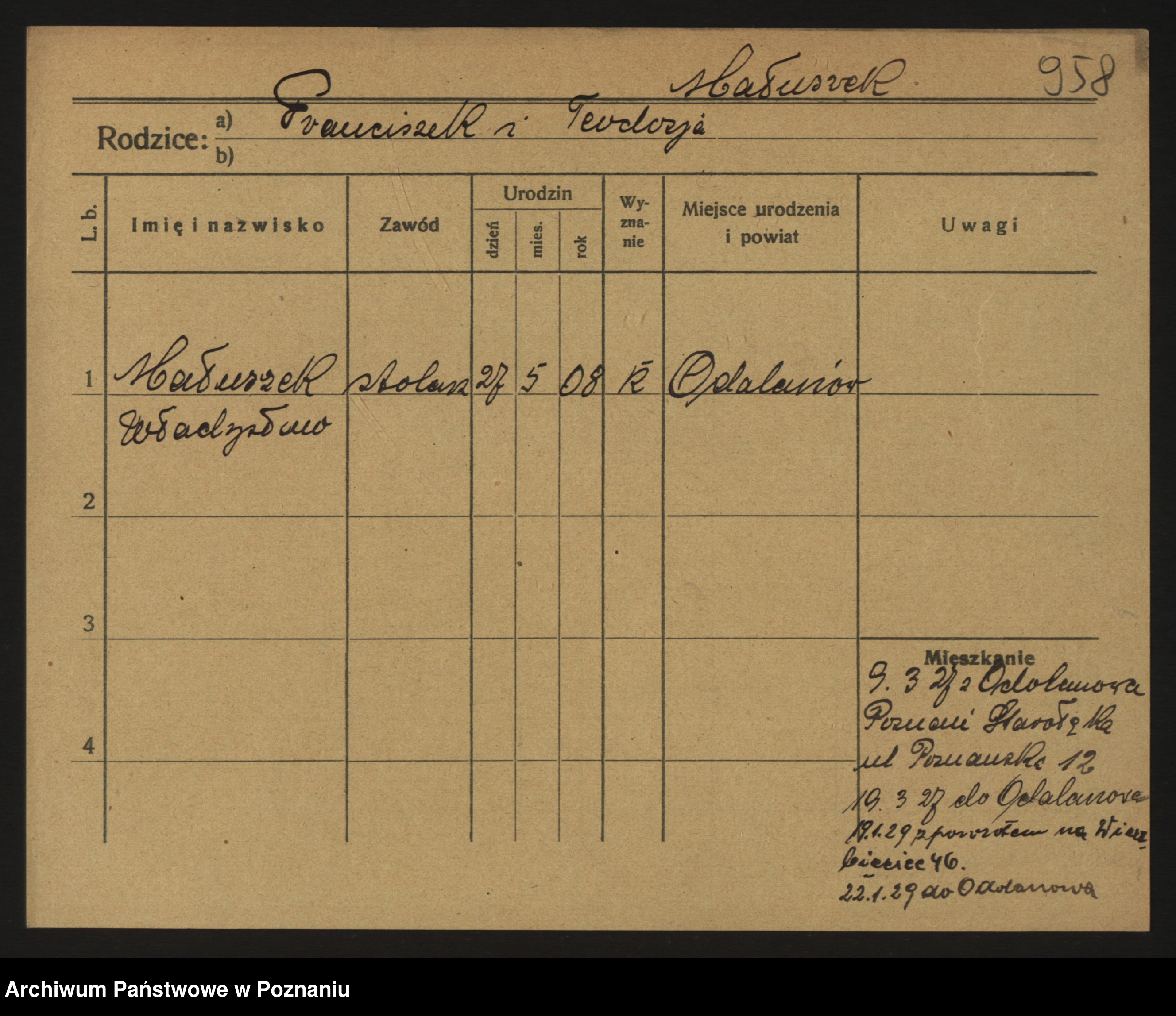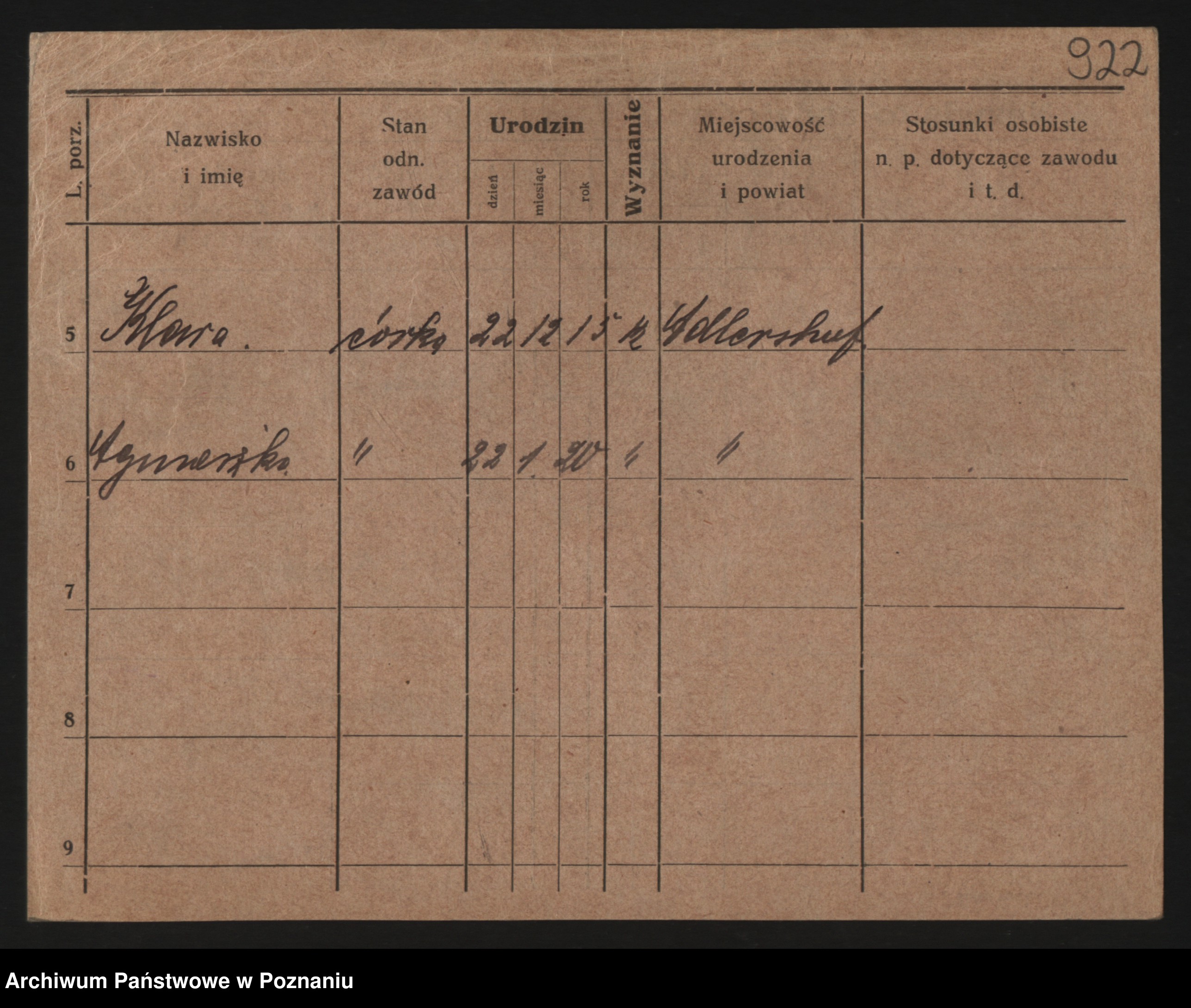 Podgląd karty osobowej dostępny jest po kliknięciu na nazwisko lub ikonkę karty. Można dokonywać powiększenia (ikony na górze) lub przechodzić między kolejnymi skanami (strzałki po bokach).