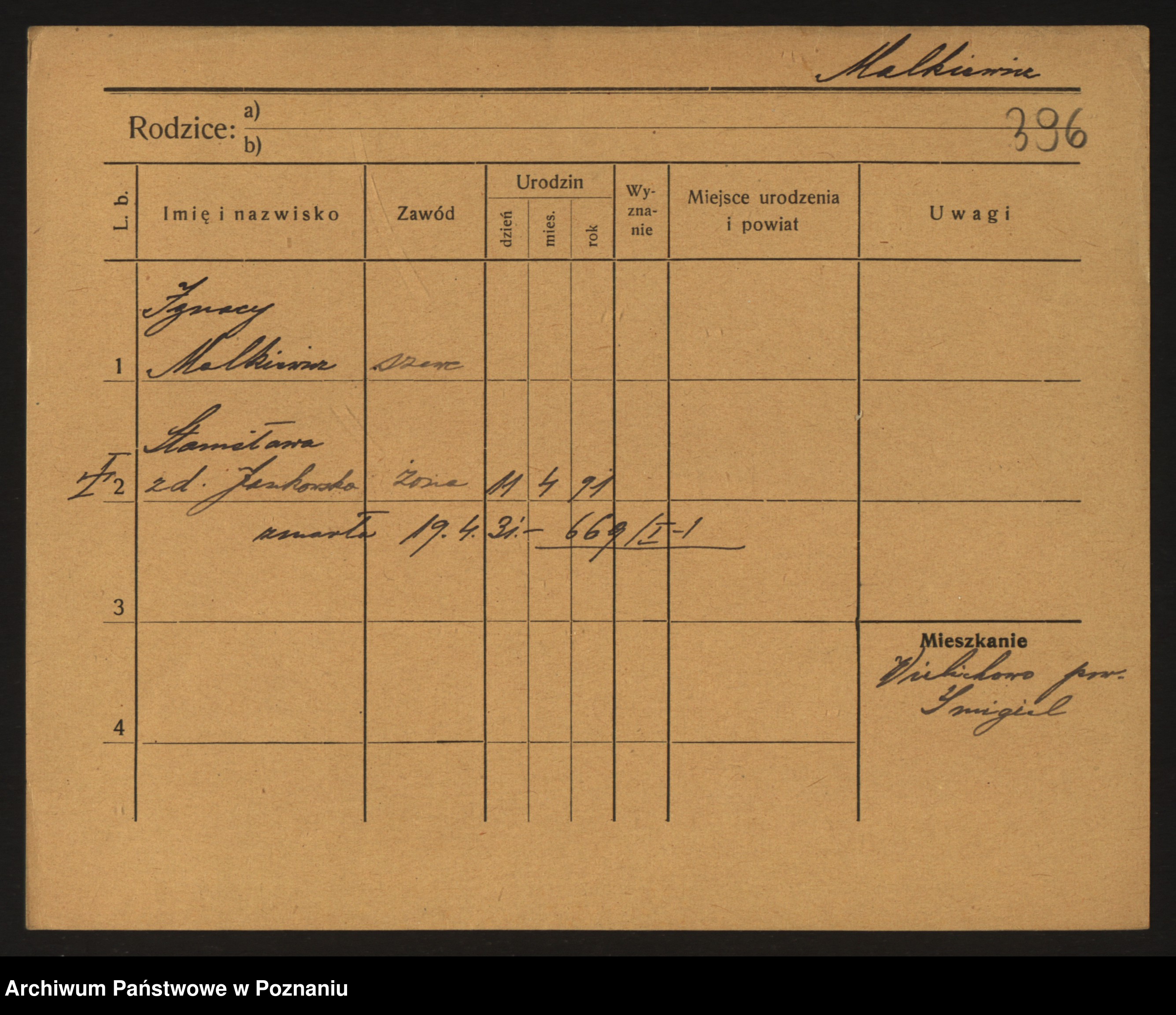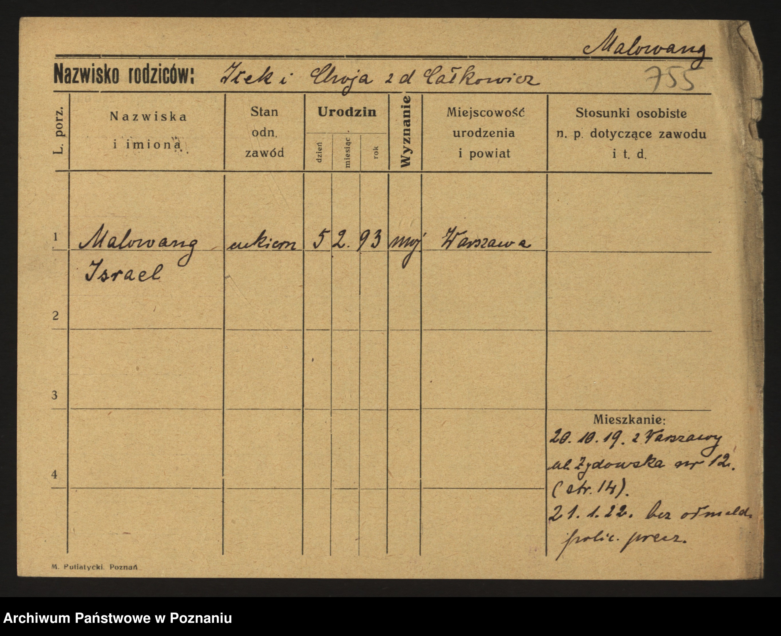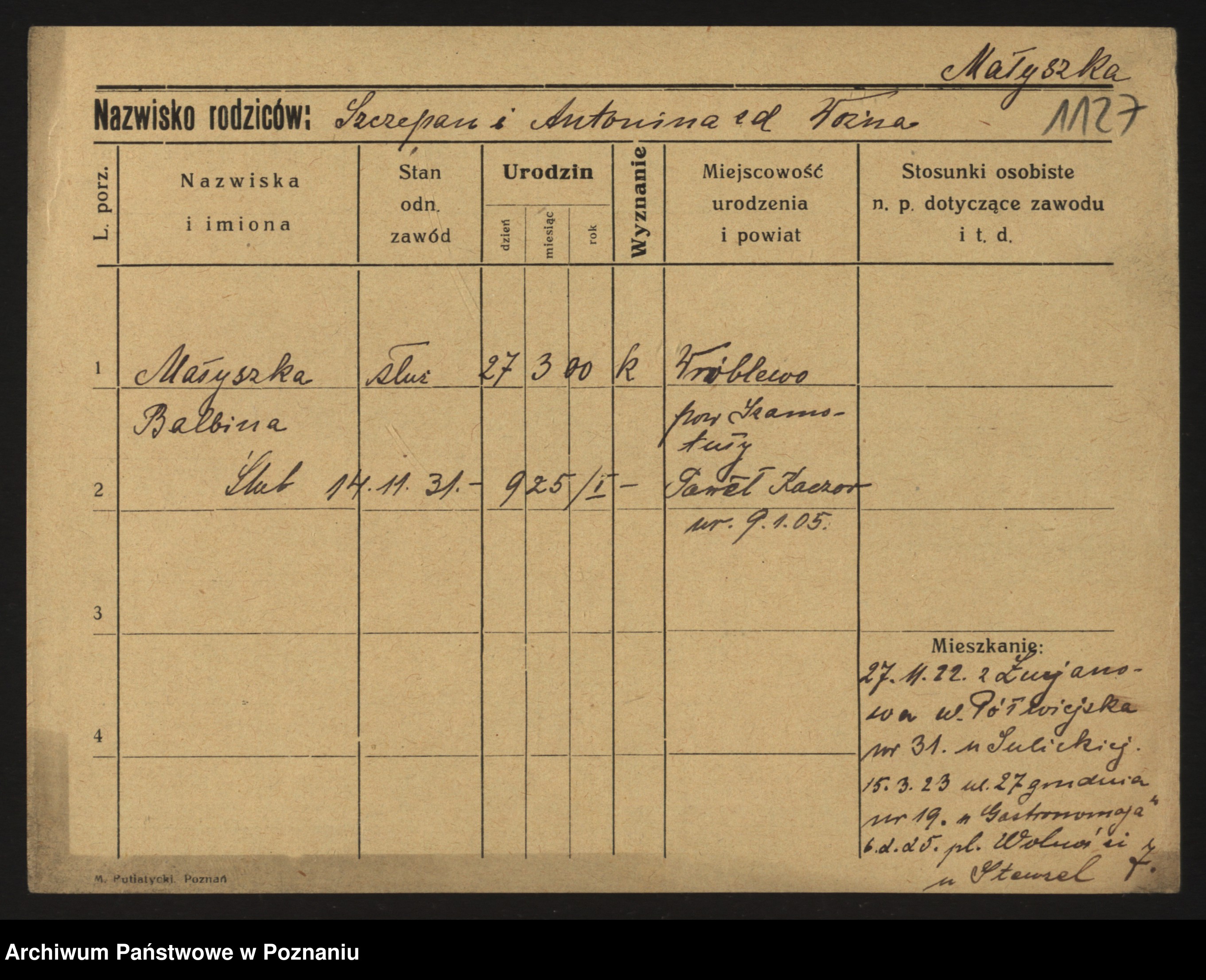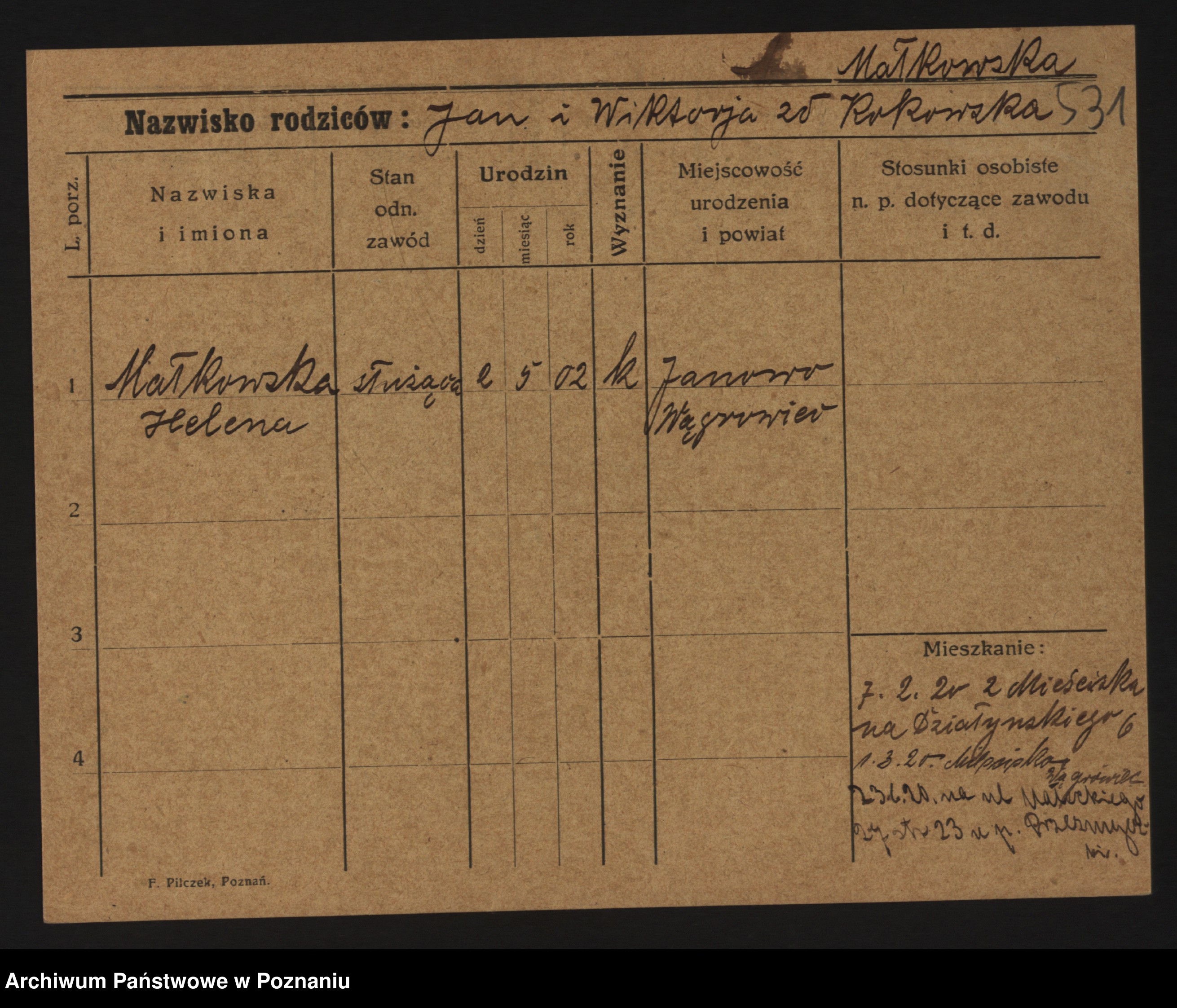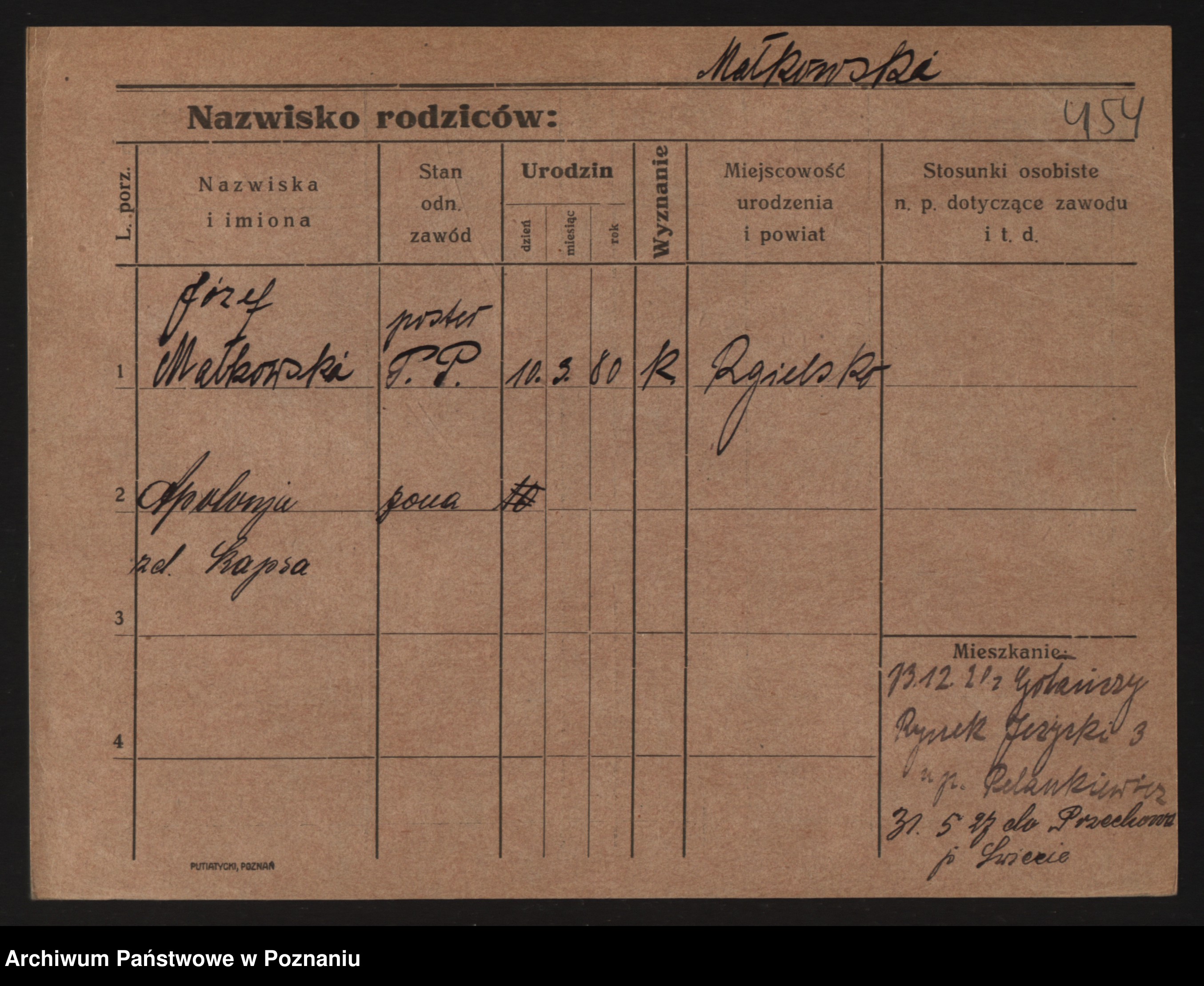 Podgląd karty osobowej dostępny jest po kliknięciu na nazwisko lub ikonkę karty. Można dokonywać powiększenia (ikony na górze) lub przechodzić między kolejnymi skanami (strzałki po bokach).