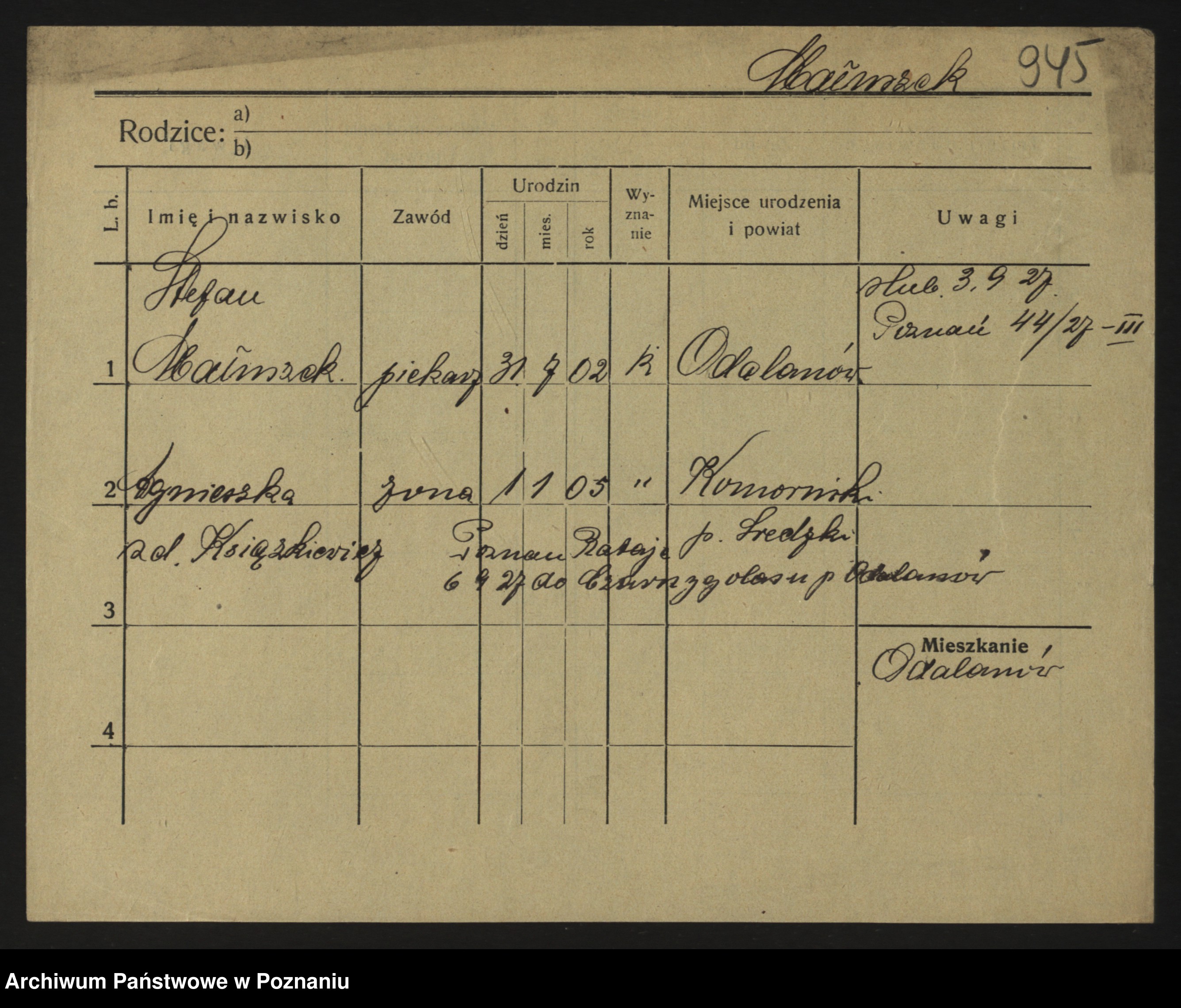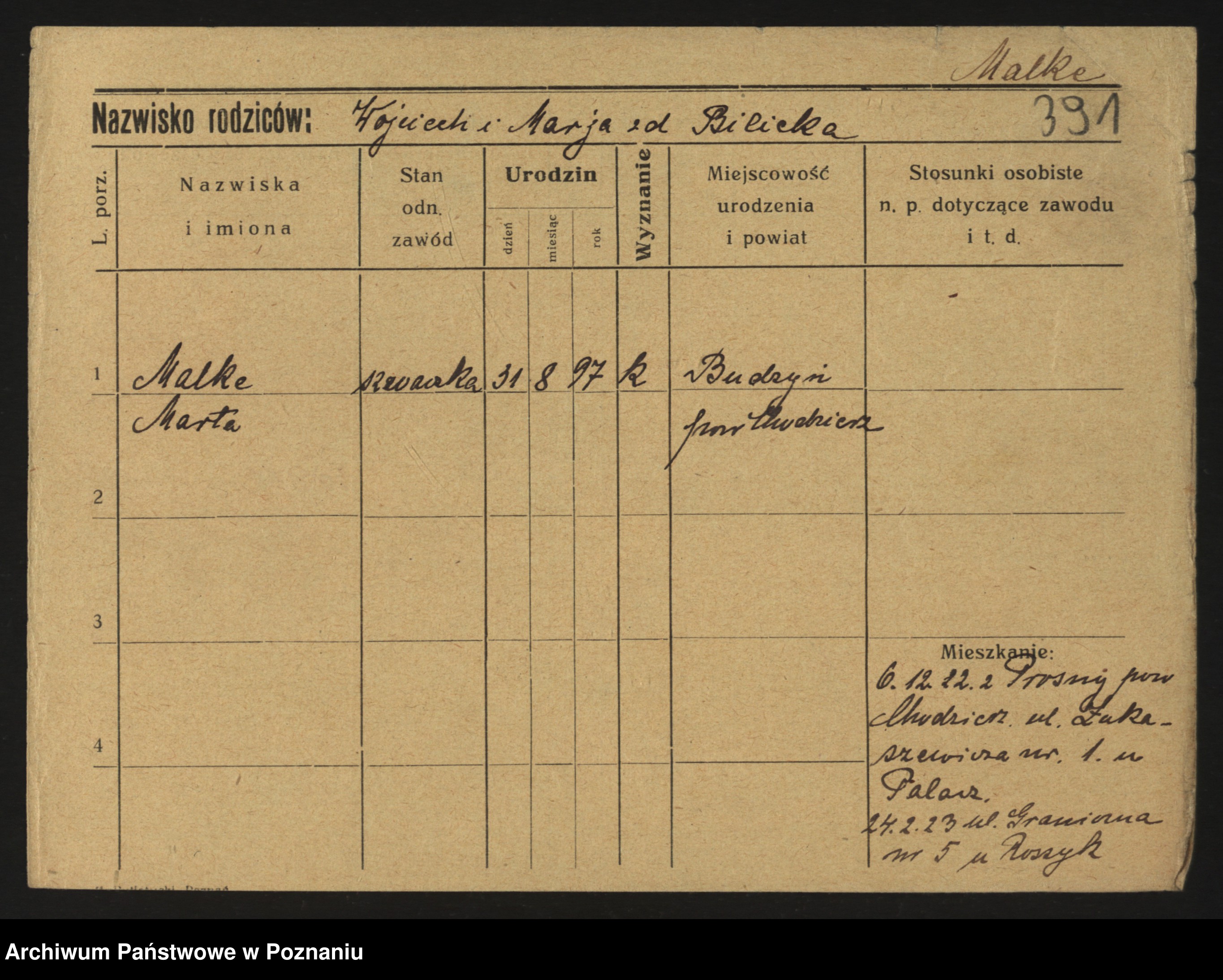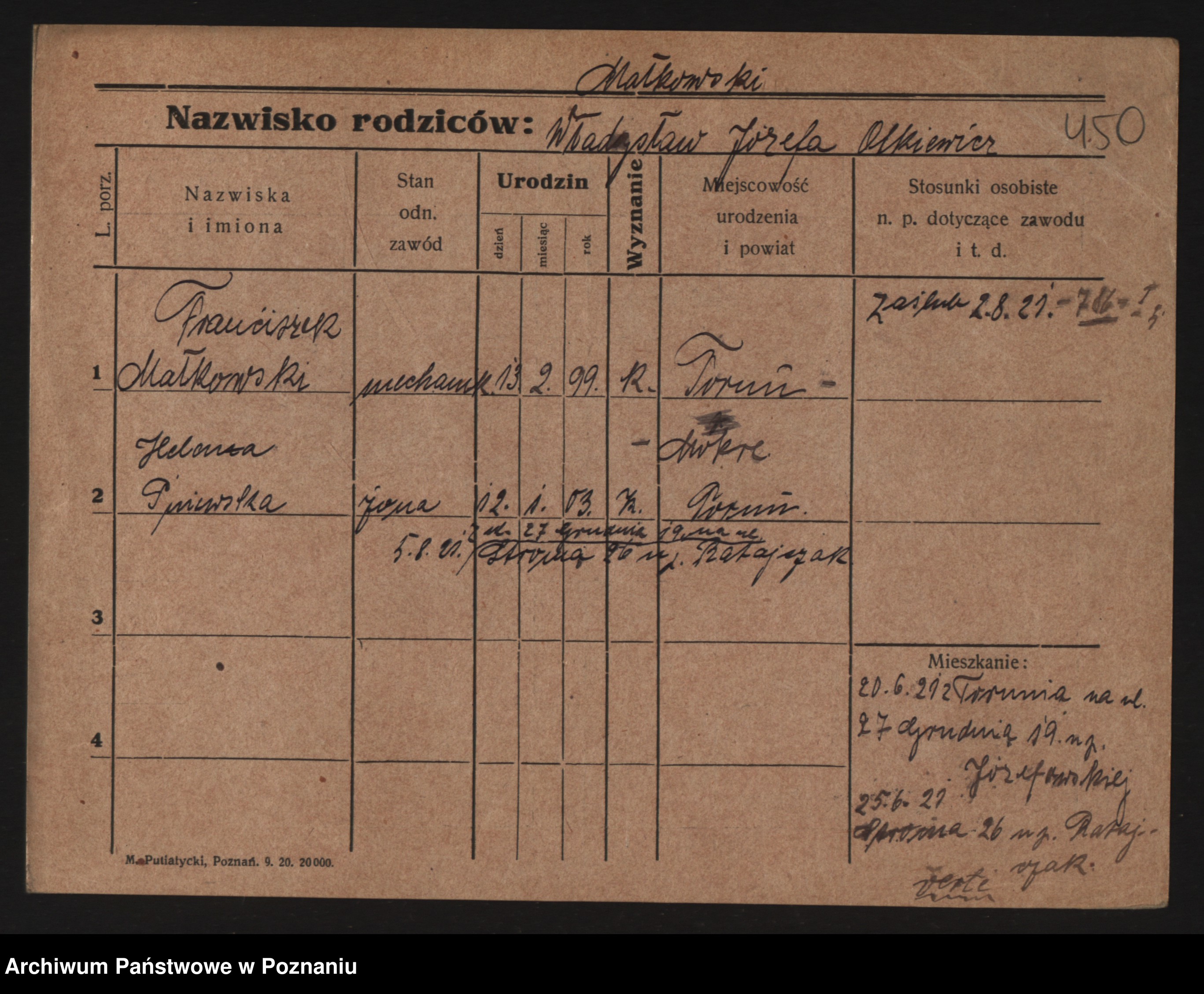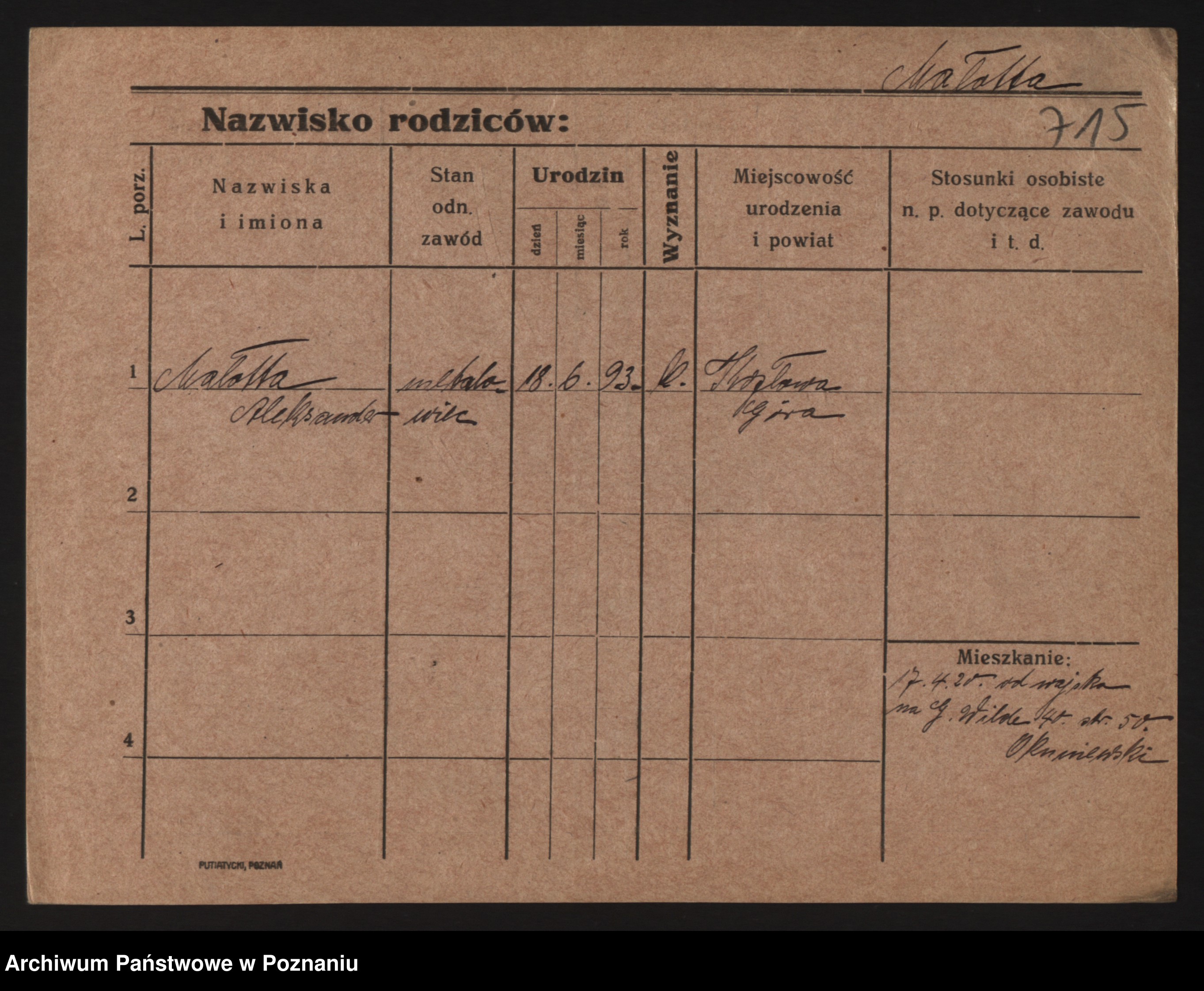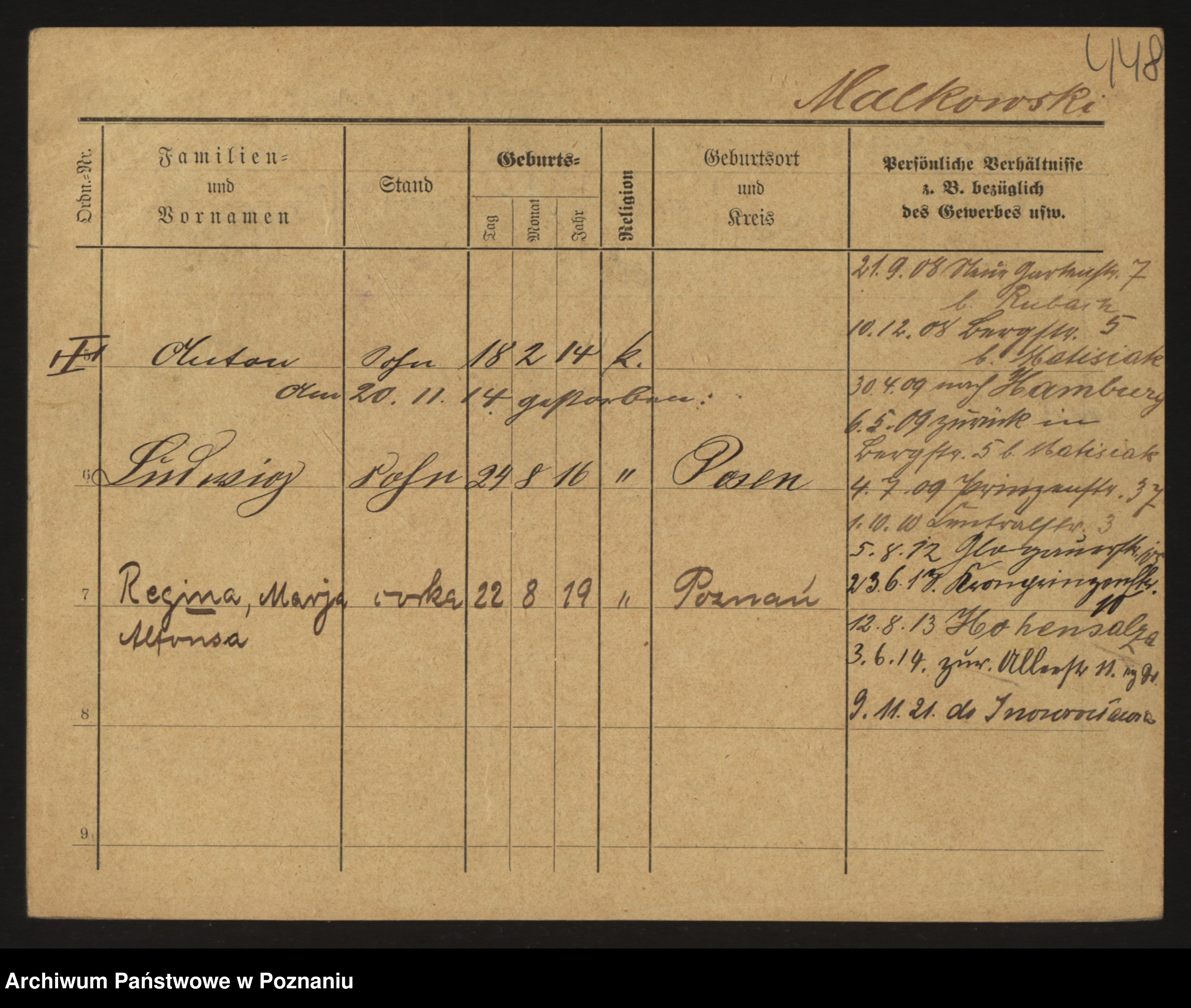 Podgląd karty osobowej dostępny jest po kliknięciu na nazwisko lub ikonkę karty. Można dokonywać powiększenia (ikony na górze) lub przechodzić między kolejnymi skanami (strzałki po bokach).