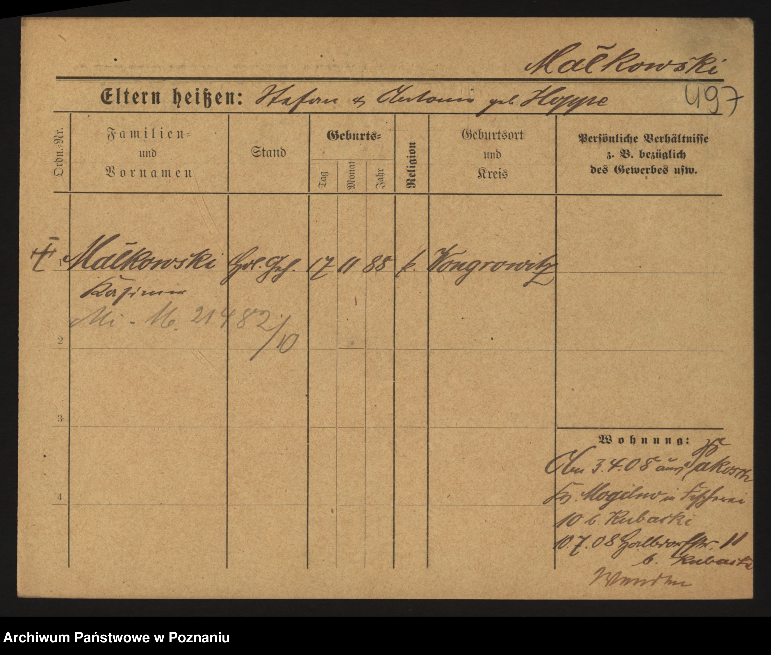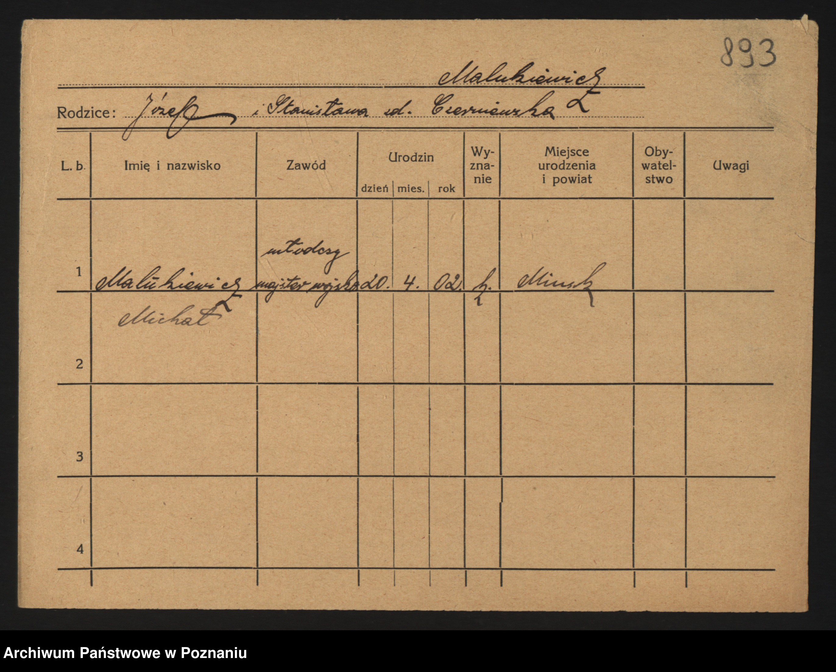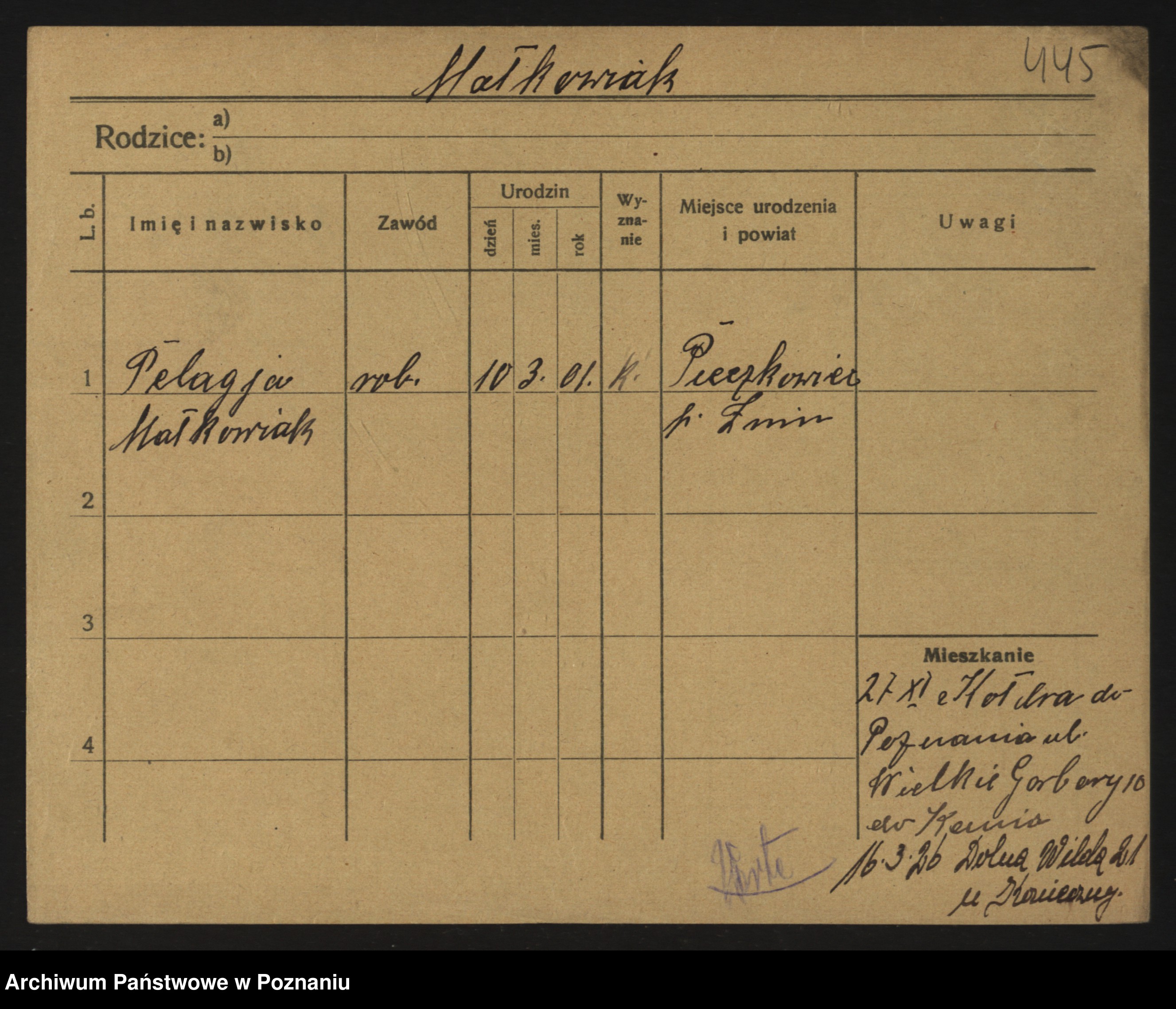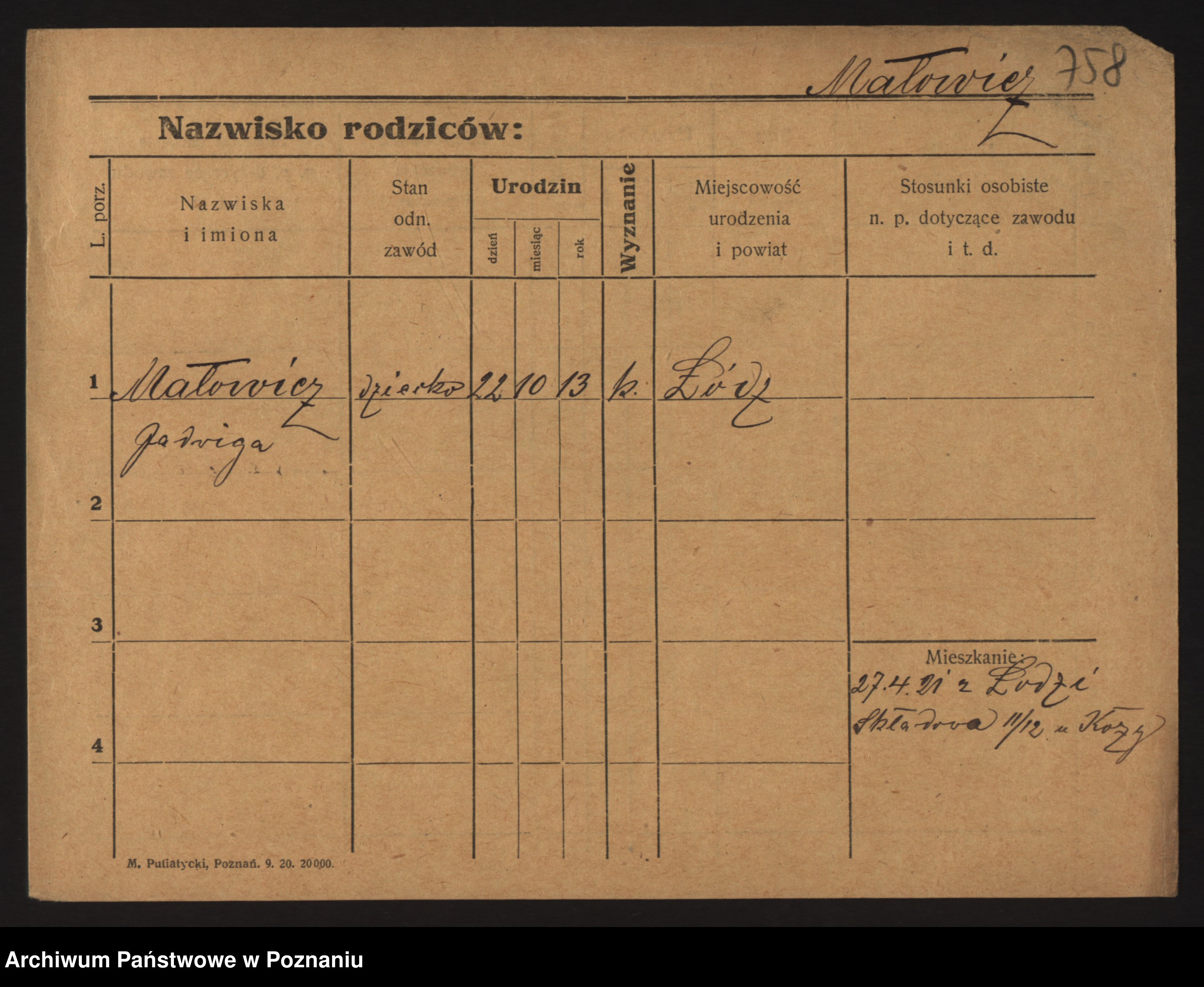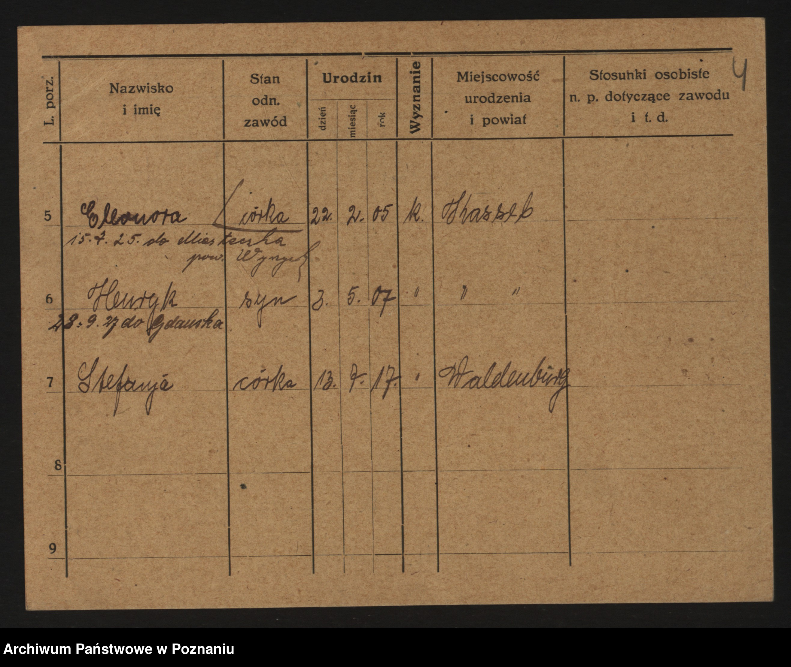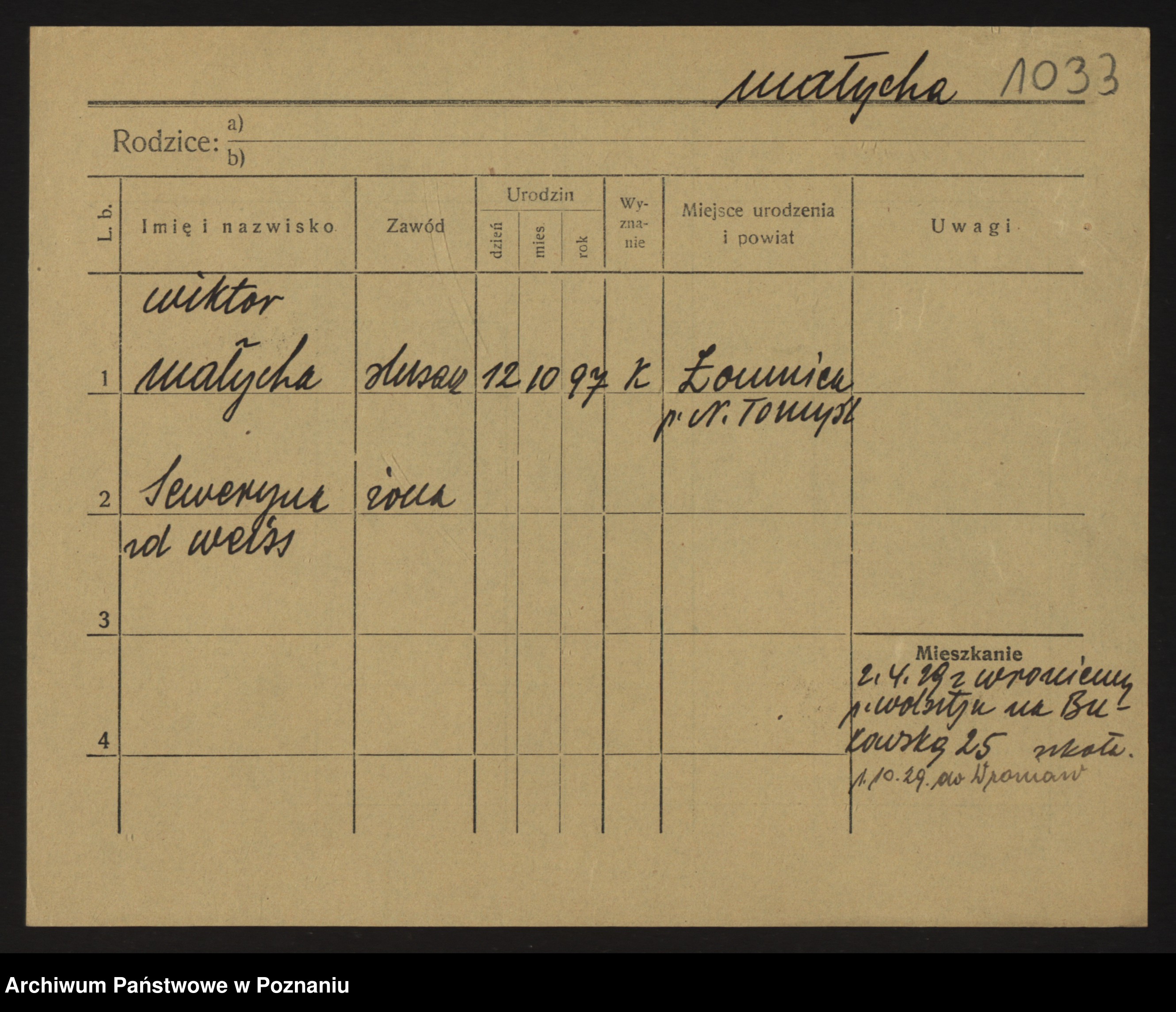 Podgląd karty osobowej dostępny jest po kliknięciu na nazwisko lub ikonkę karty. Można dokonywać powiększenia (ikony na górze) lub przechodzić między kolejnymi skanami (strzałki po bokach).