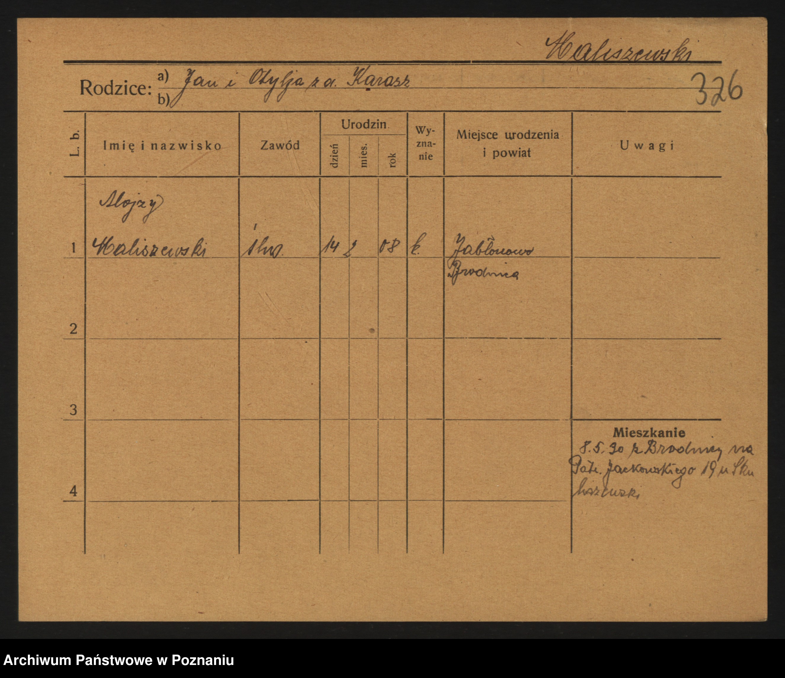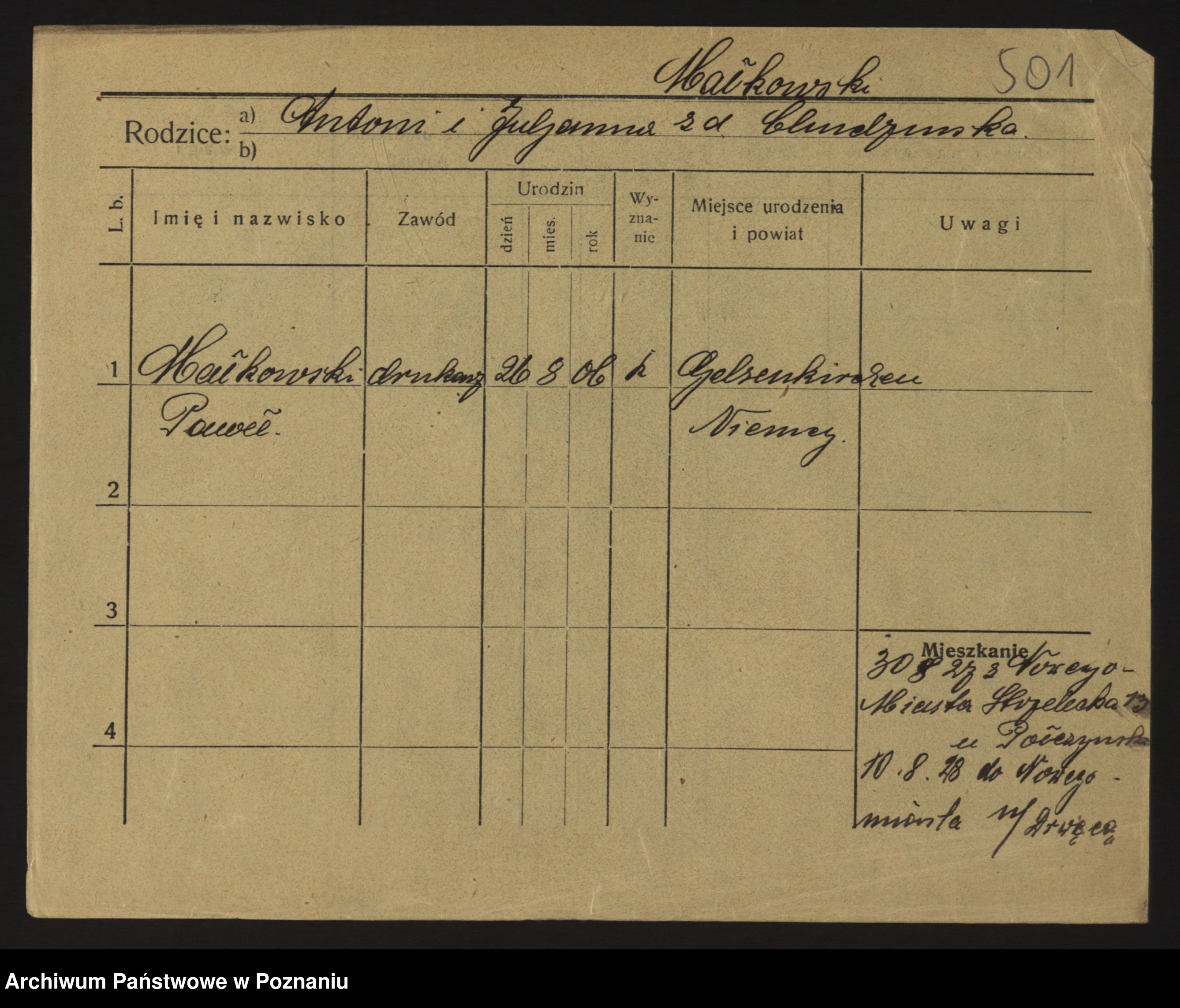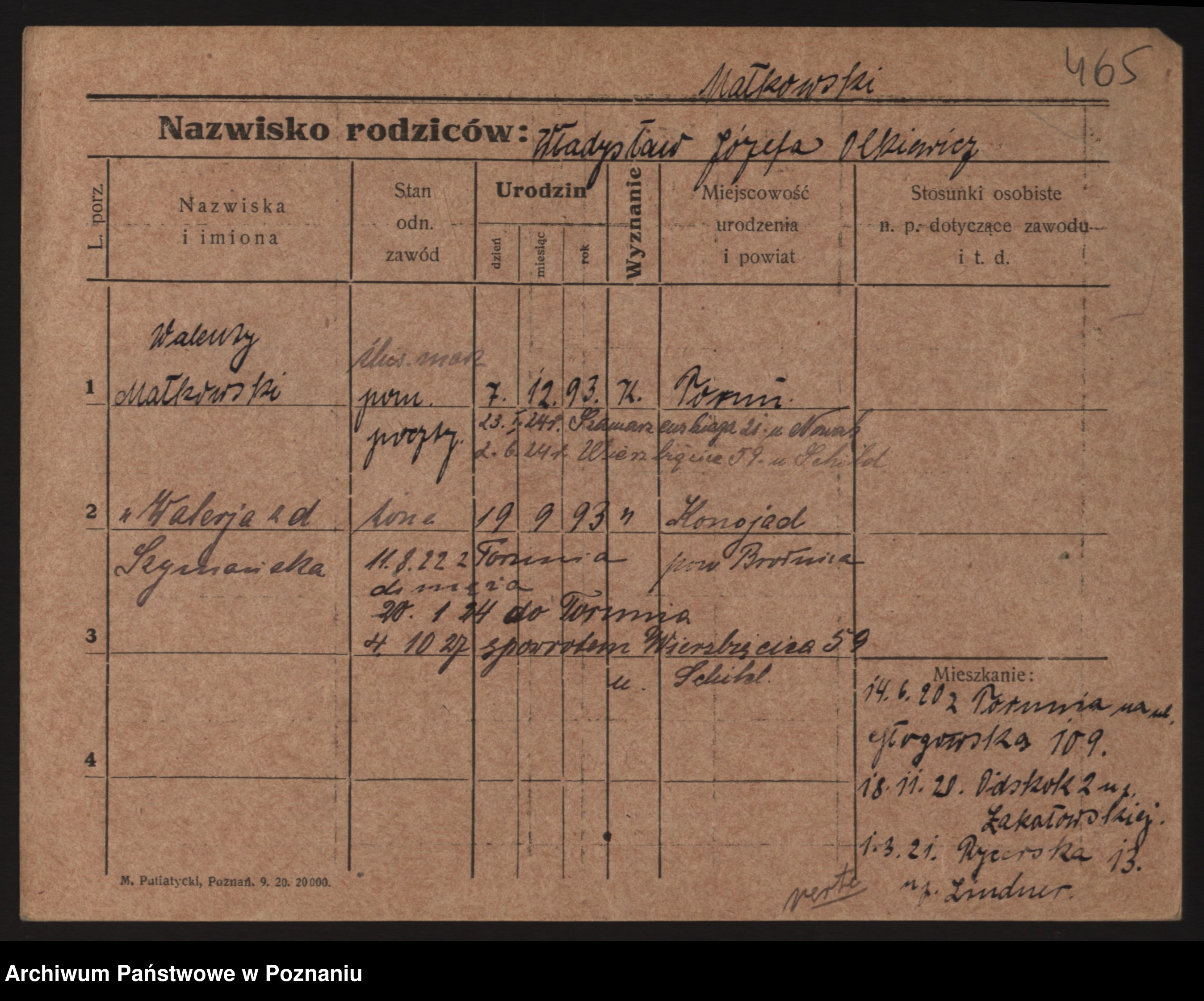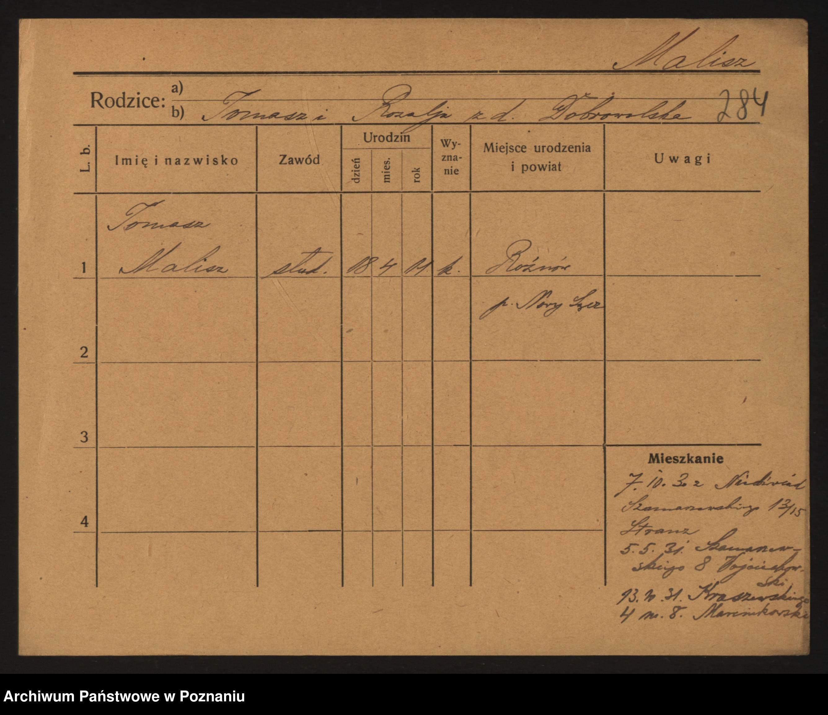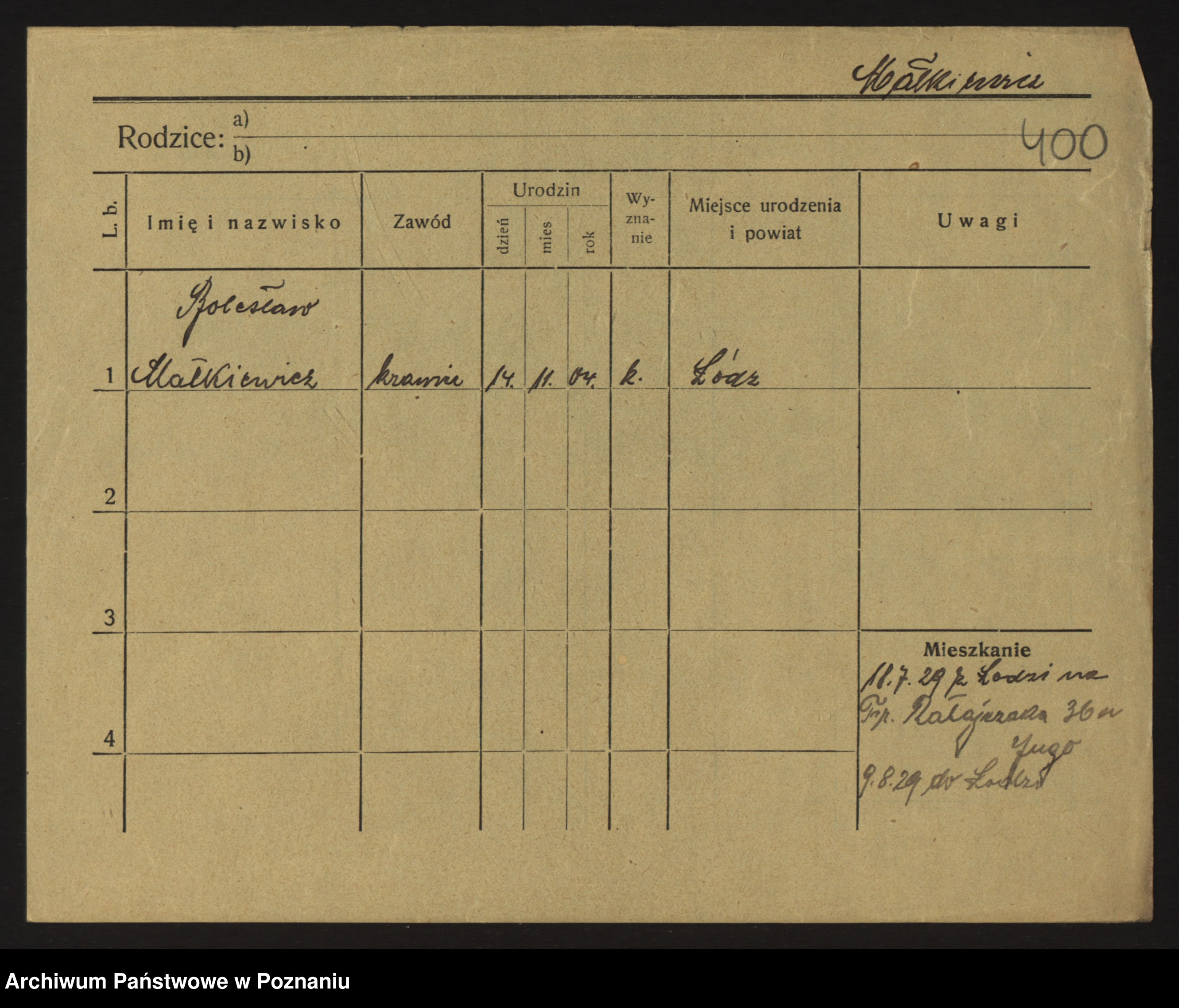 Podgląd karty osobowej dostępny jest po kliknięciu na nazwisko lub ikonkę karty. Można dokonywać powiększenia (ikony na górze) lub przechodzić między kolejnymi skanami (strzałki po bokach).