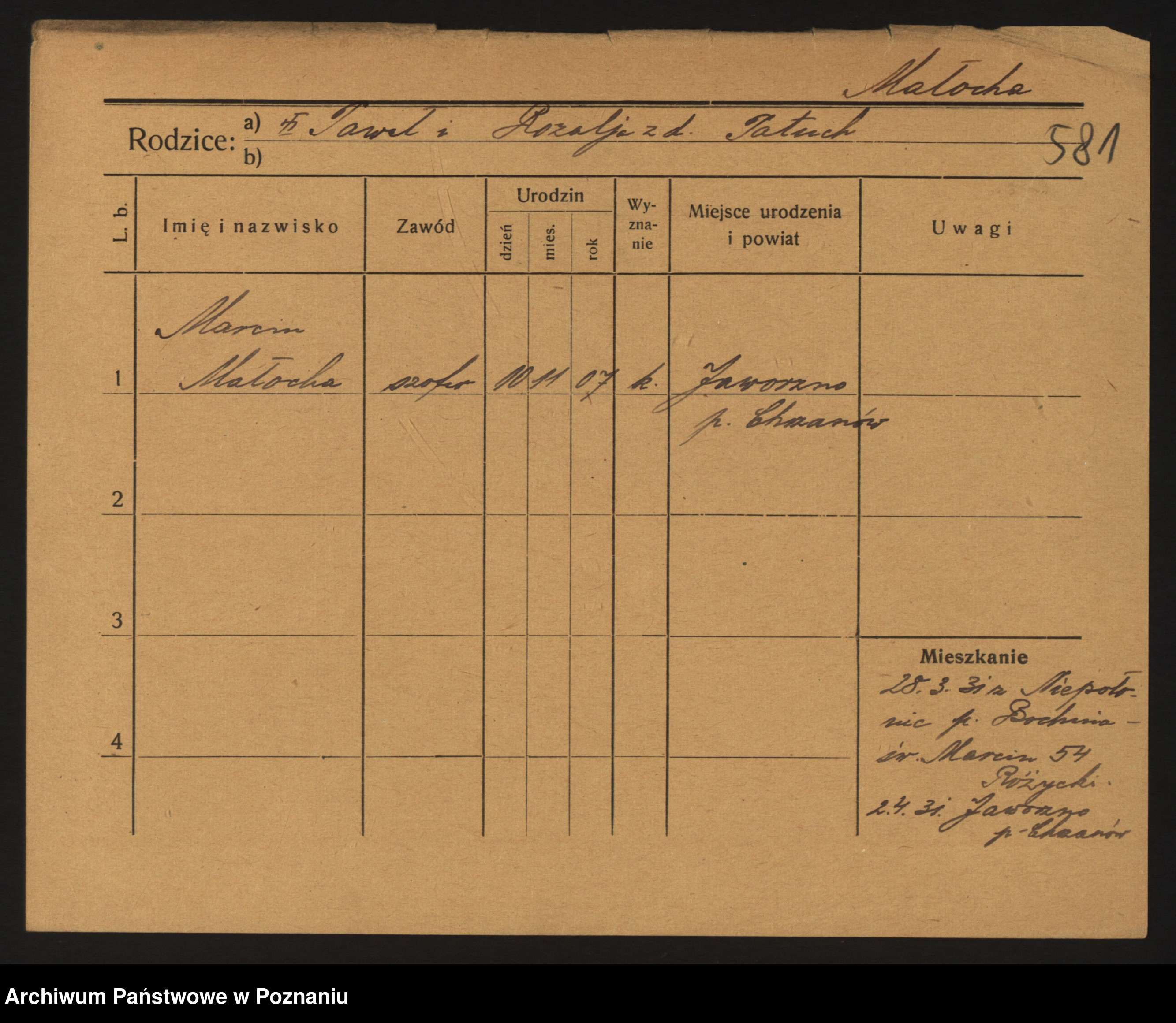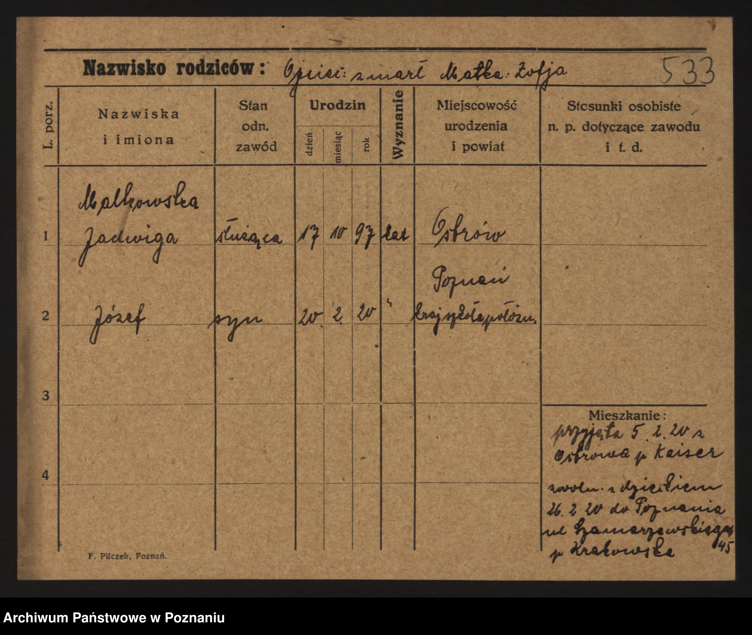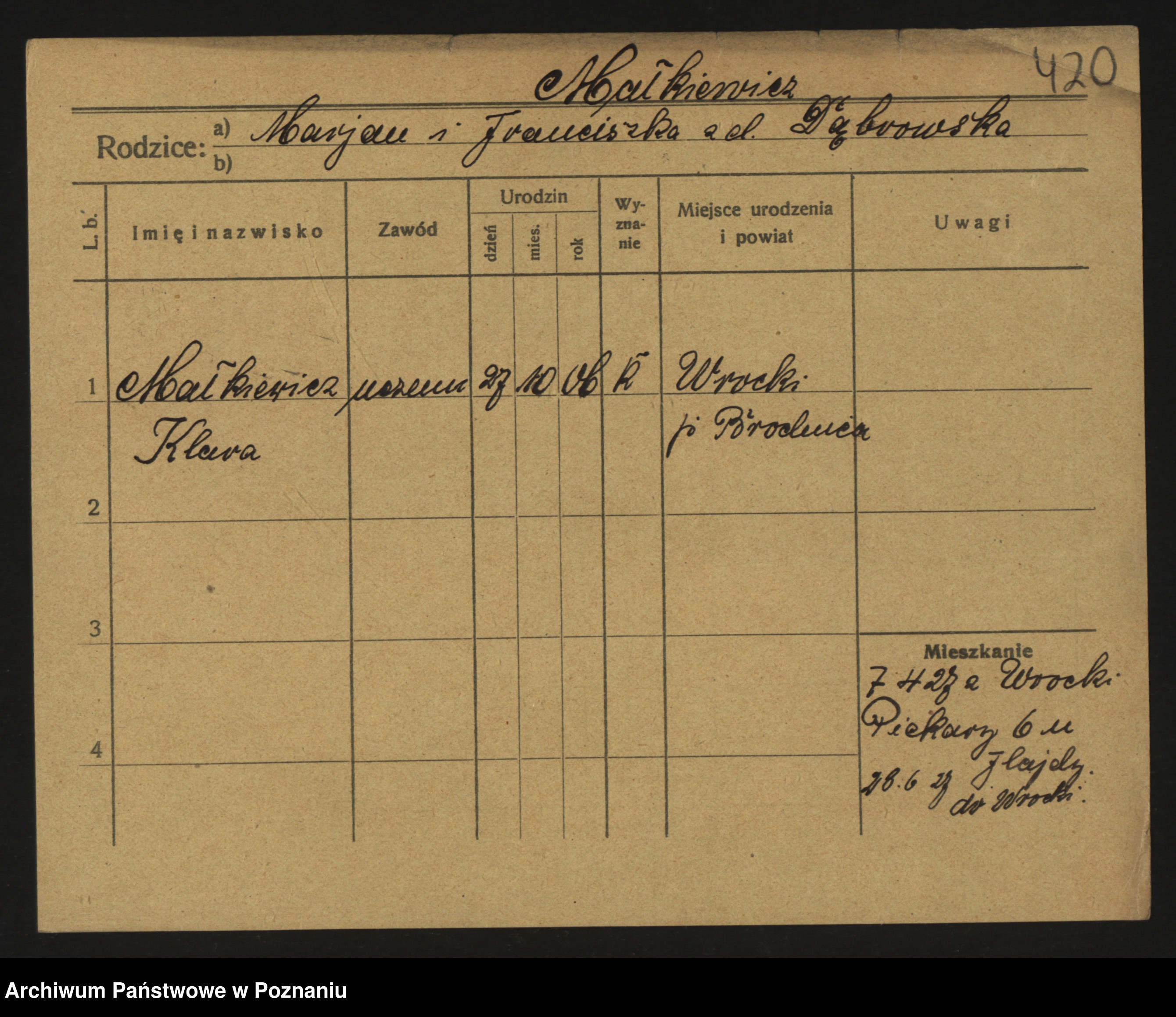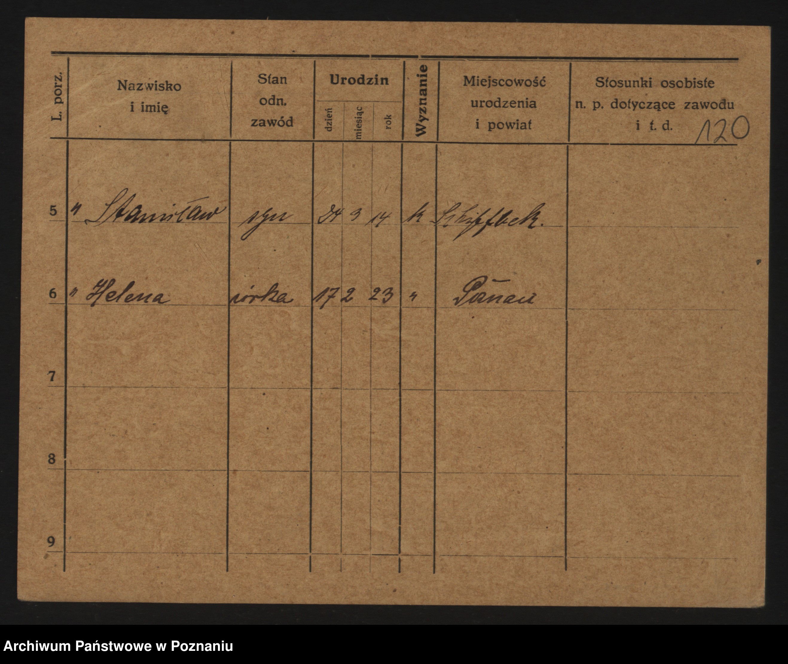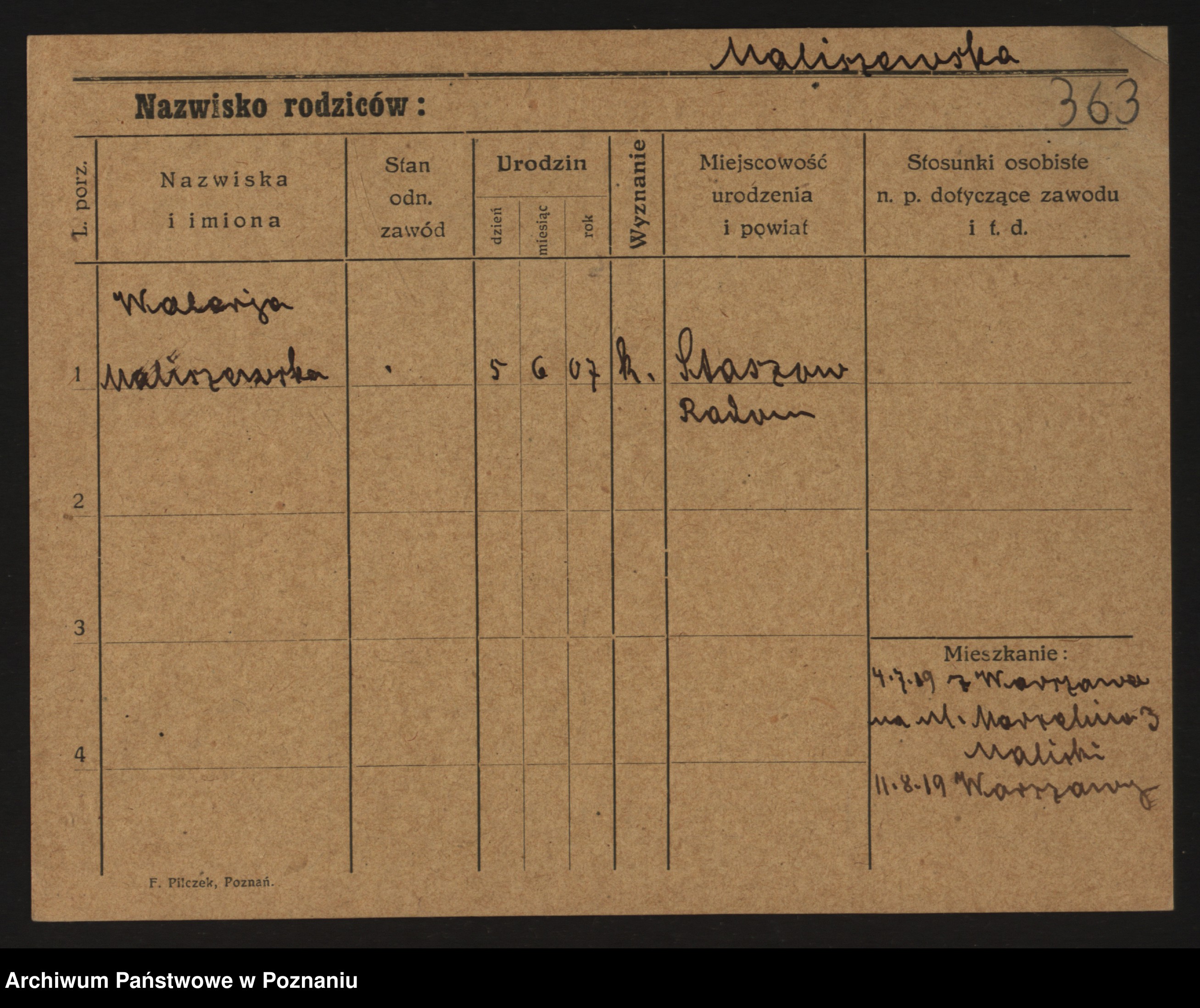 Podgląd karty osobowej dostępny jest po kliknięciu na nazwisko lub ikonkę karty. Można dokonywać powiększenia (ikony na górze) lub przechodzić między kolejnymi skanami (strzałki po bokach).