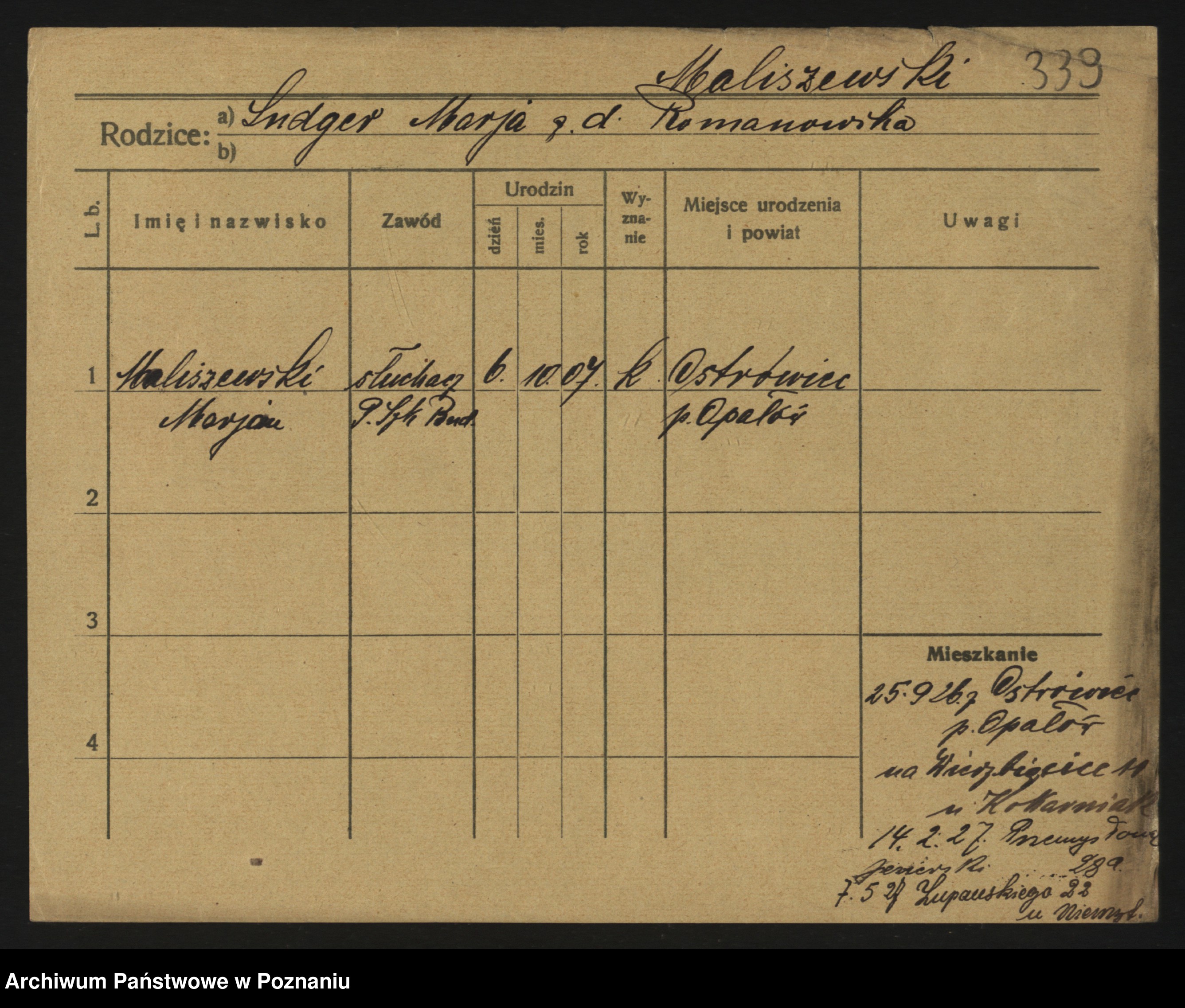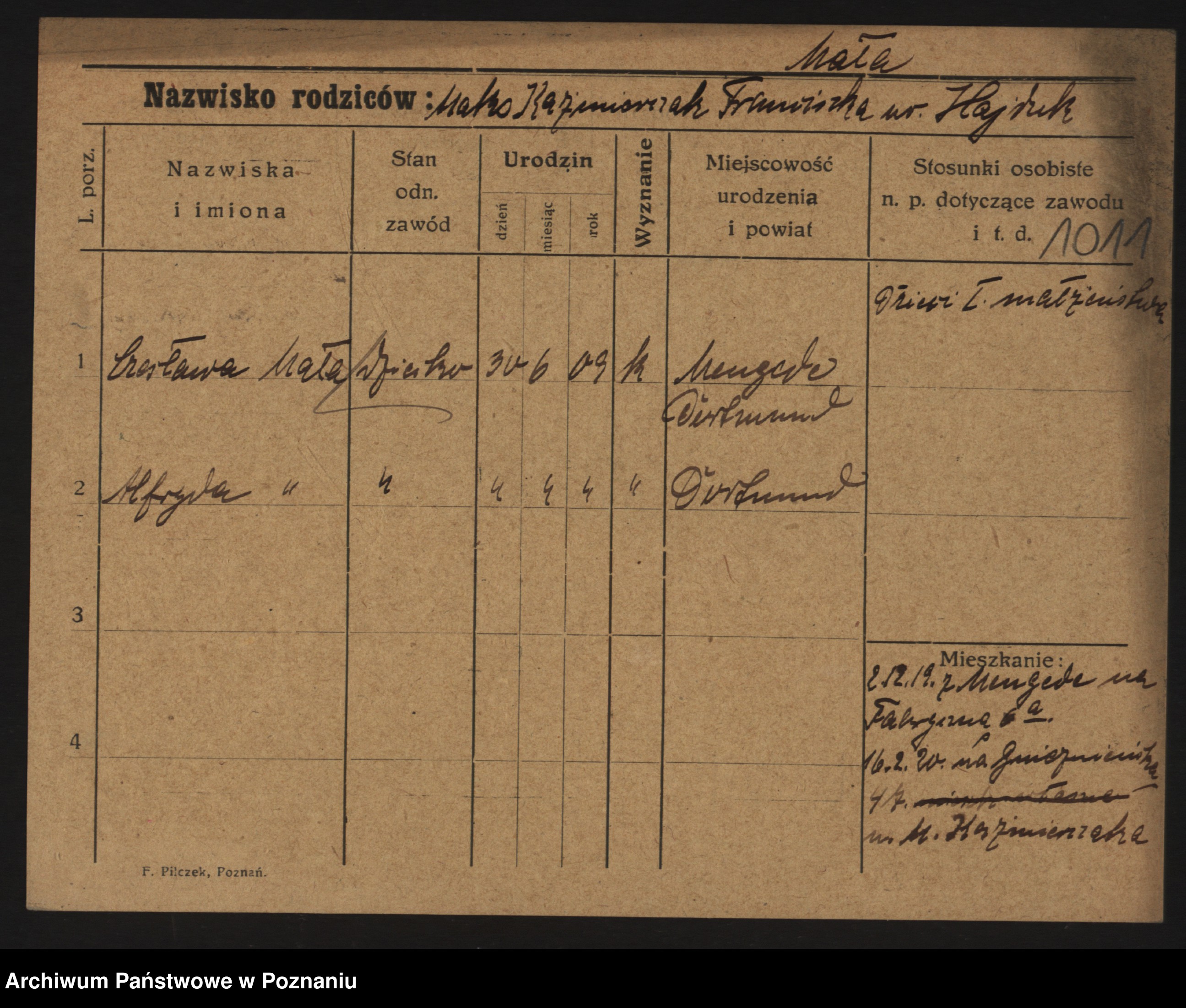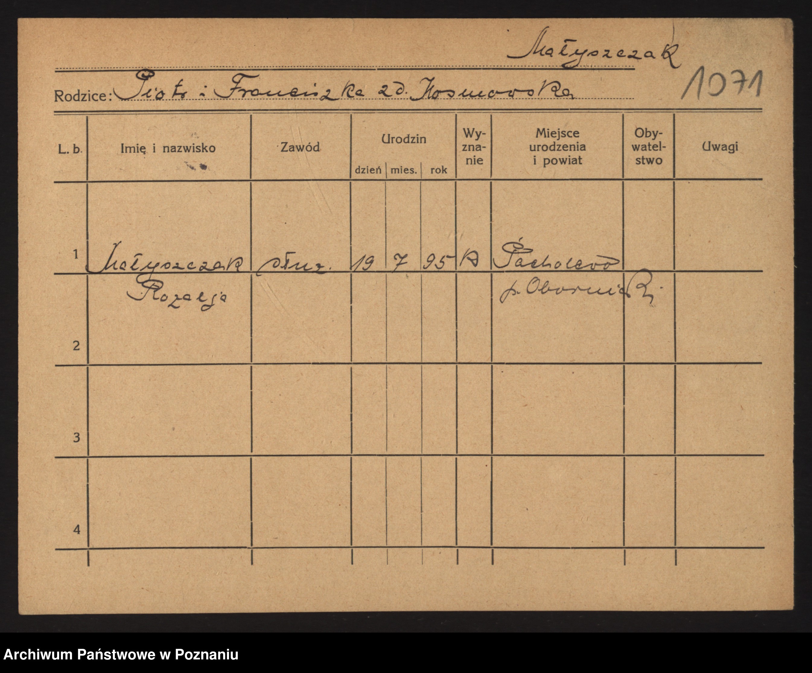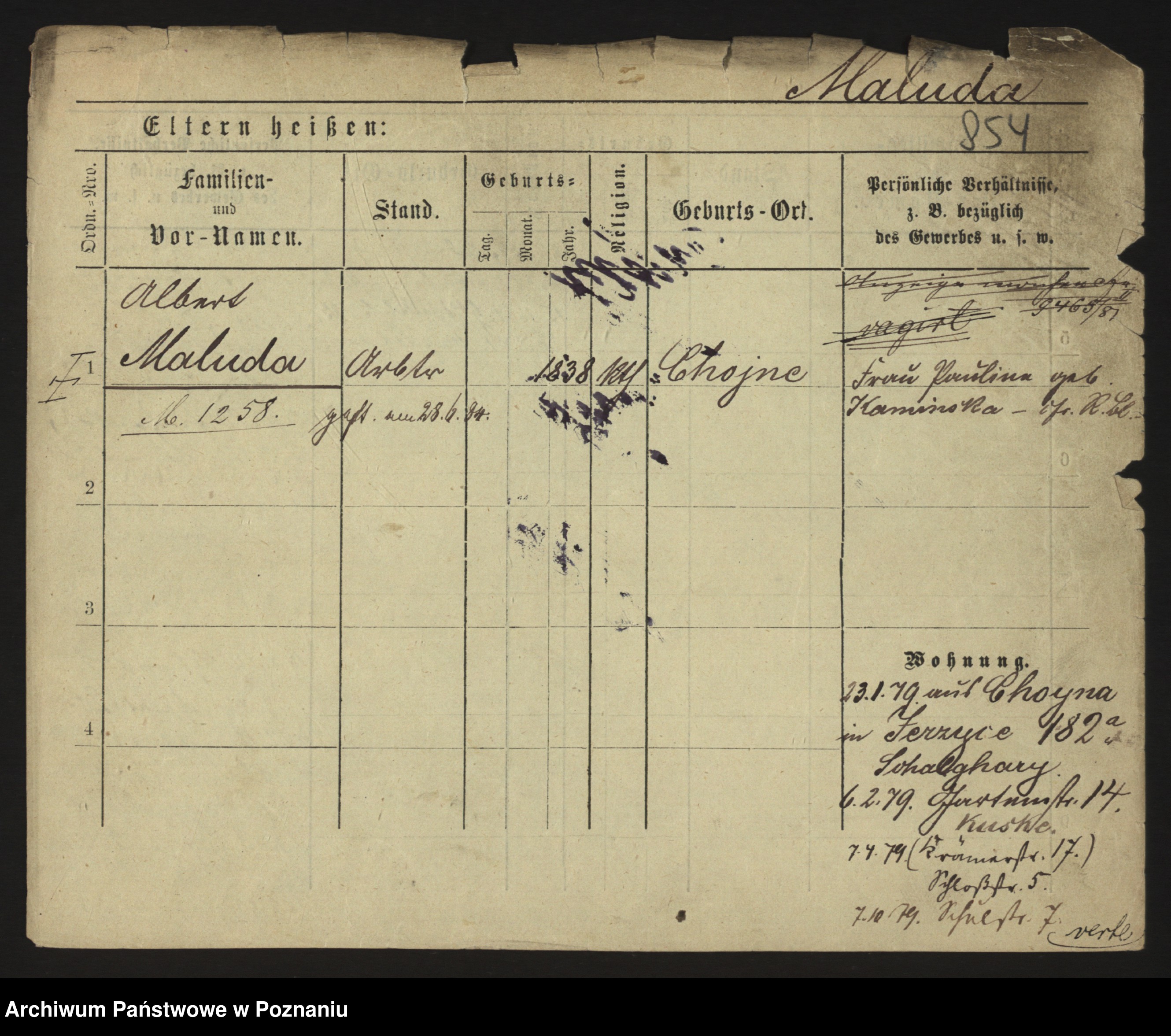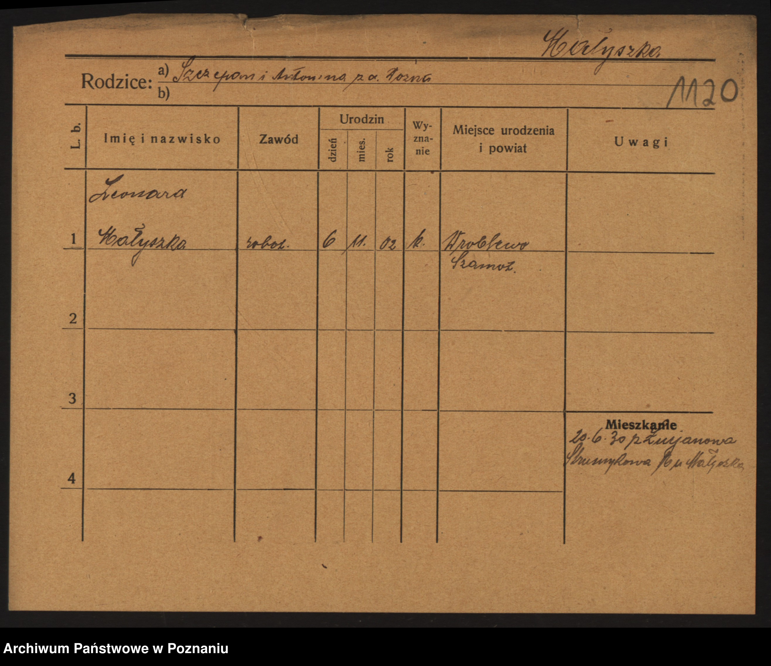 Podgląd karty osobowej dostępny jest po kliknięciu na nazwisko lub ikonkę karty. Można dokonywać powiększenia (ikony na górze) lub przechodzić między kolejnymi skanami (strzałki po bokach).