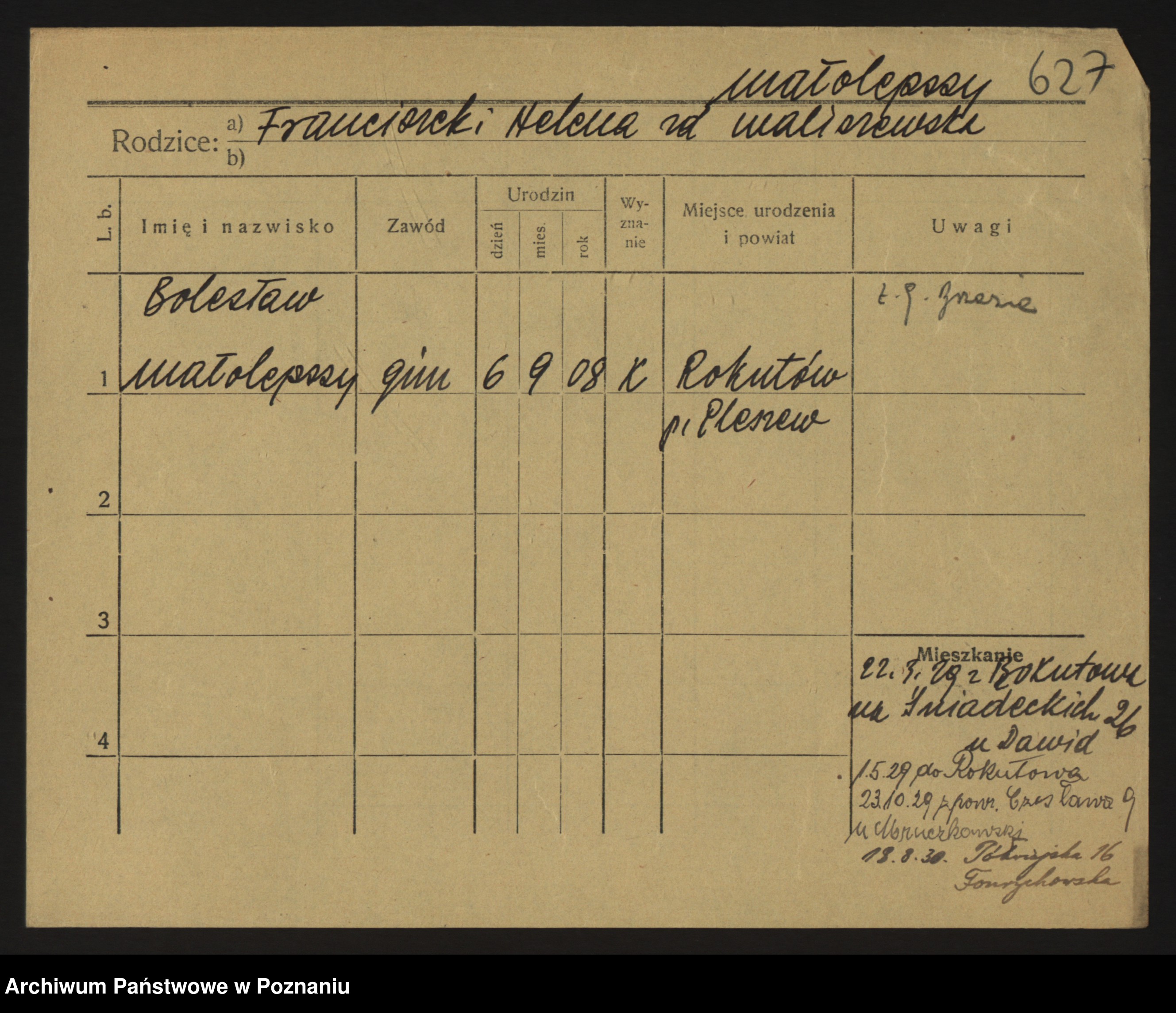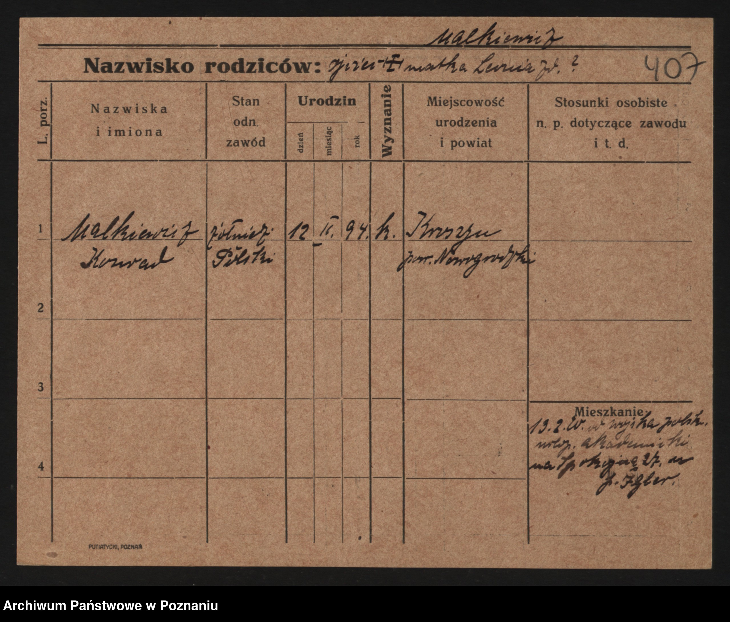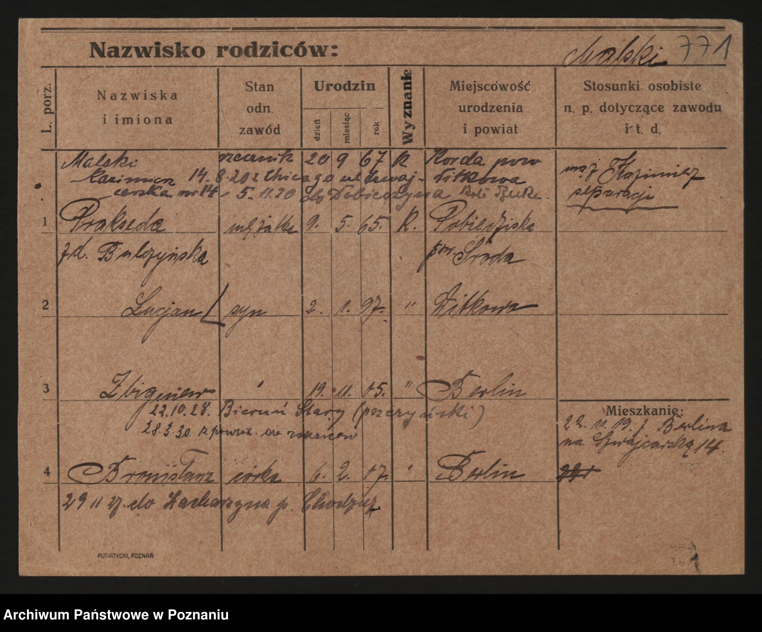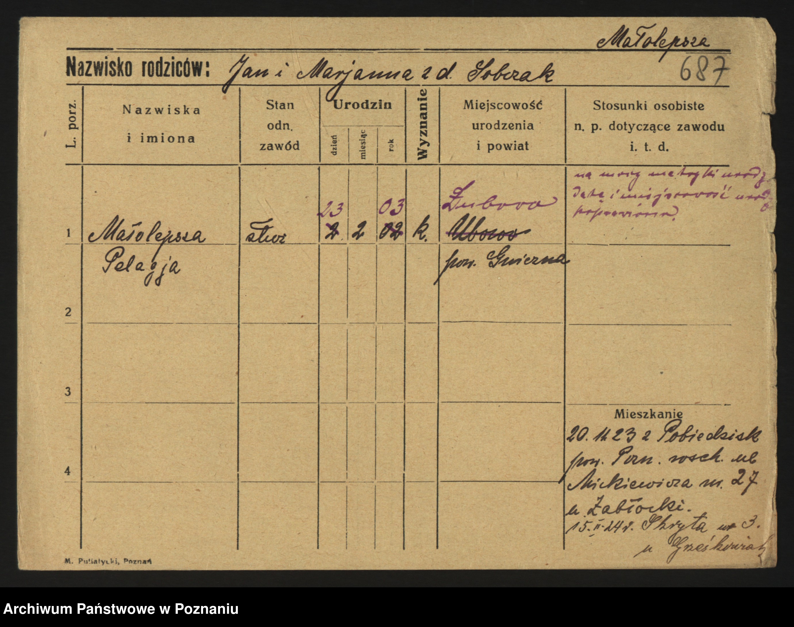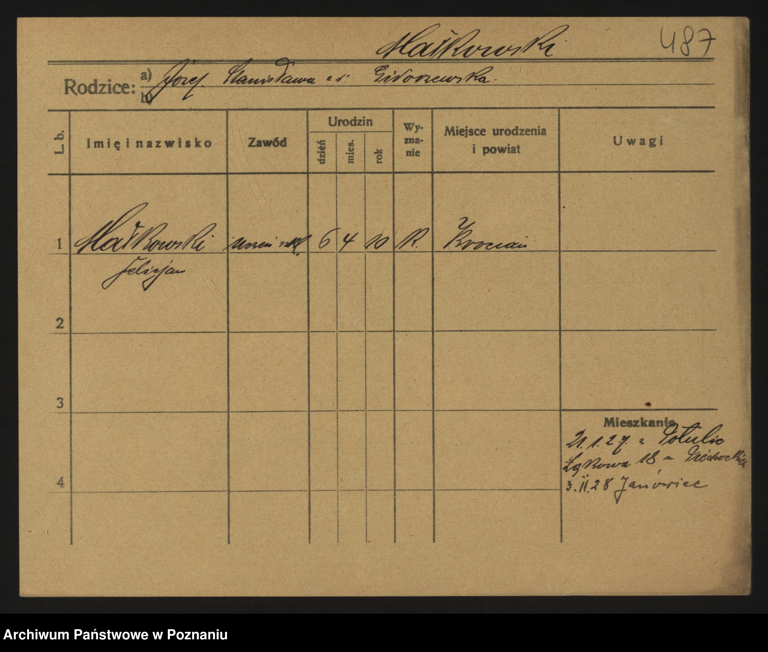 Podgląd karty osobowej dostępny jest po kliknięciu na nazwisko lub ikonkę karty. Można dokonywać powiększenia (ikony na górze) lub przechodzić między kolejnymi skanami (strzałki po bokach).