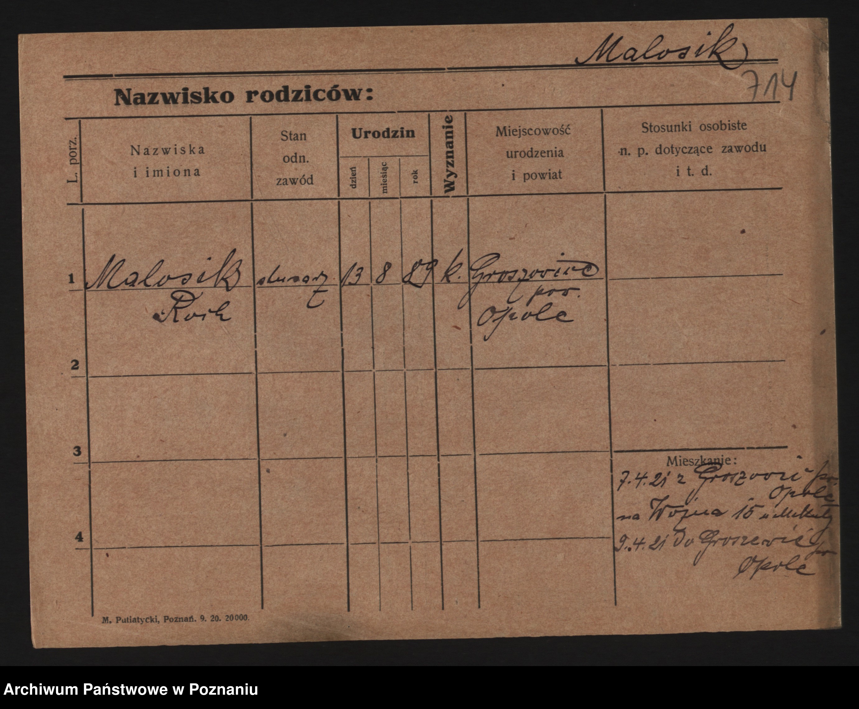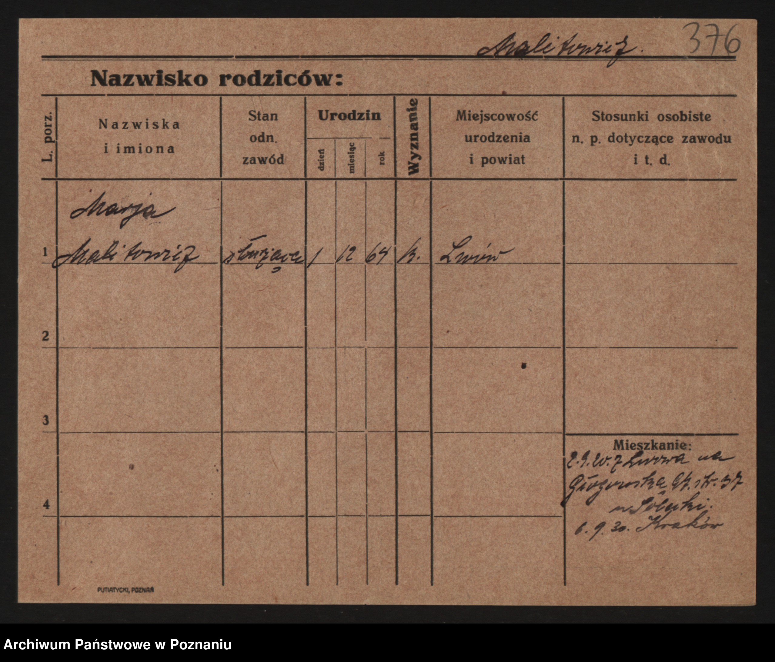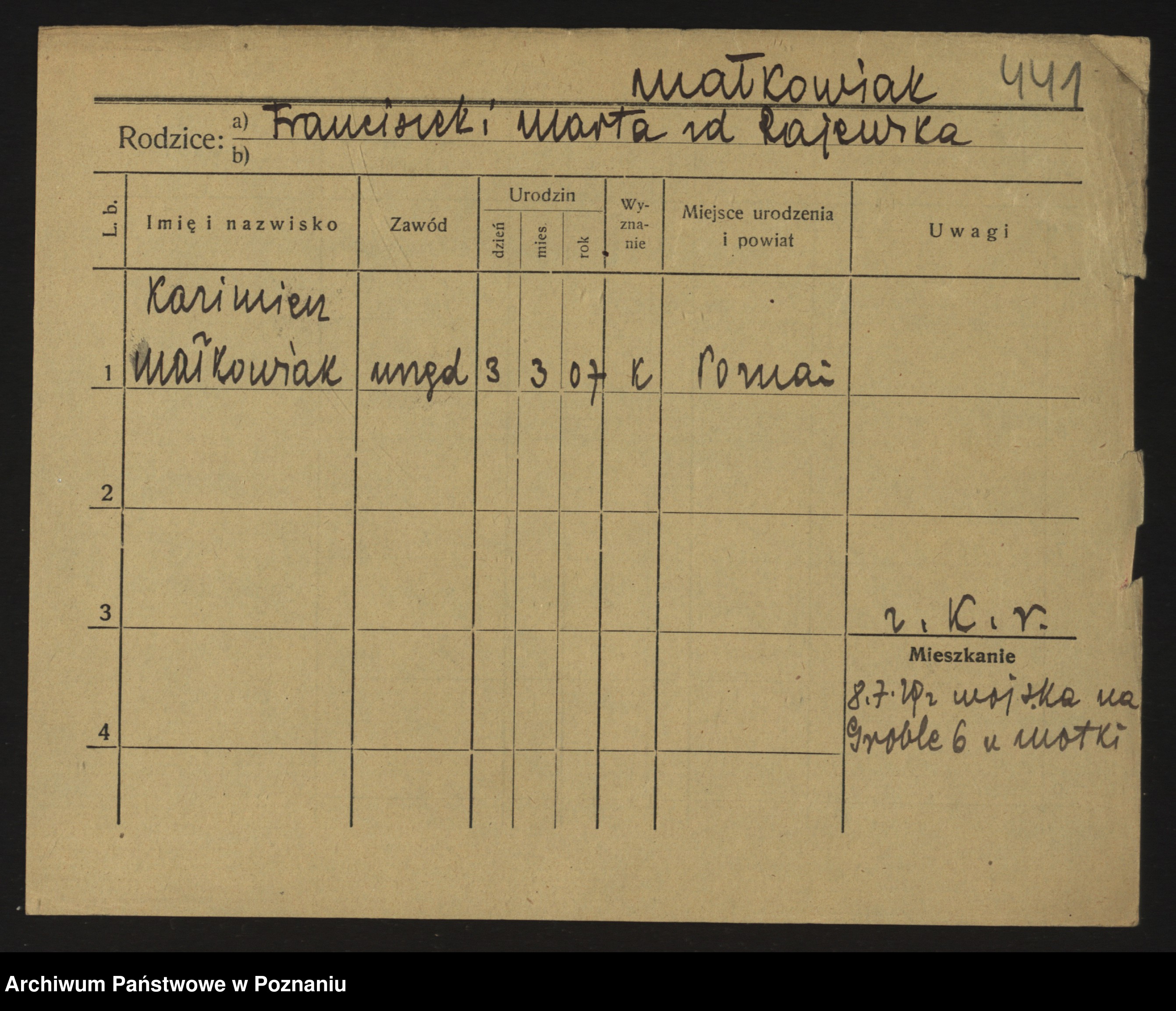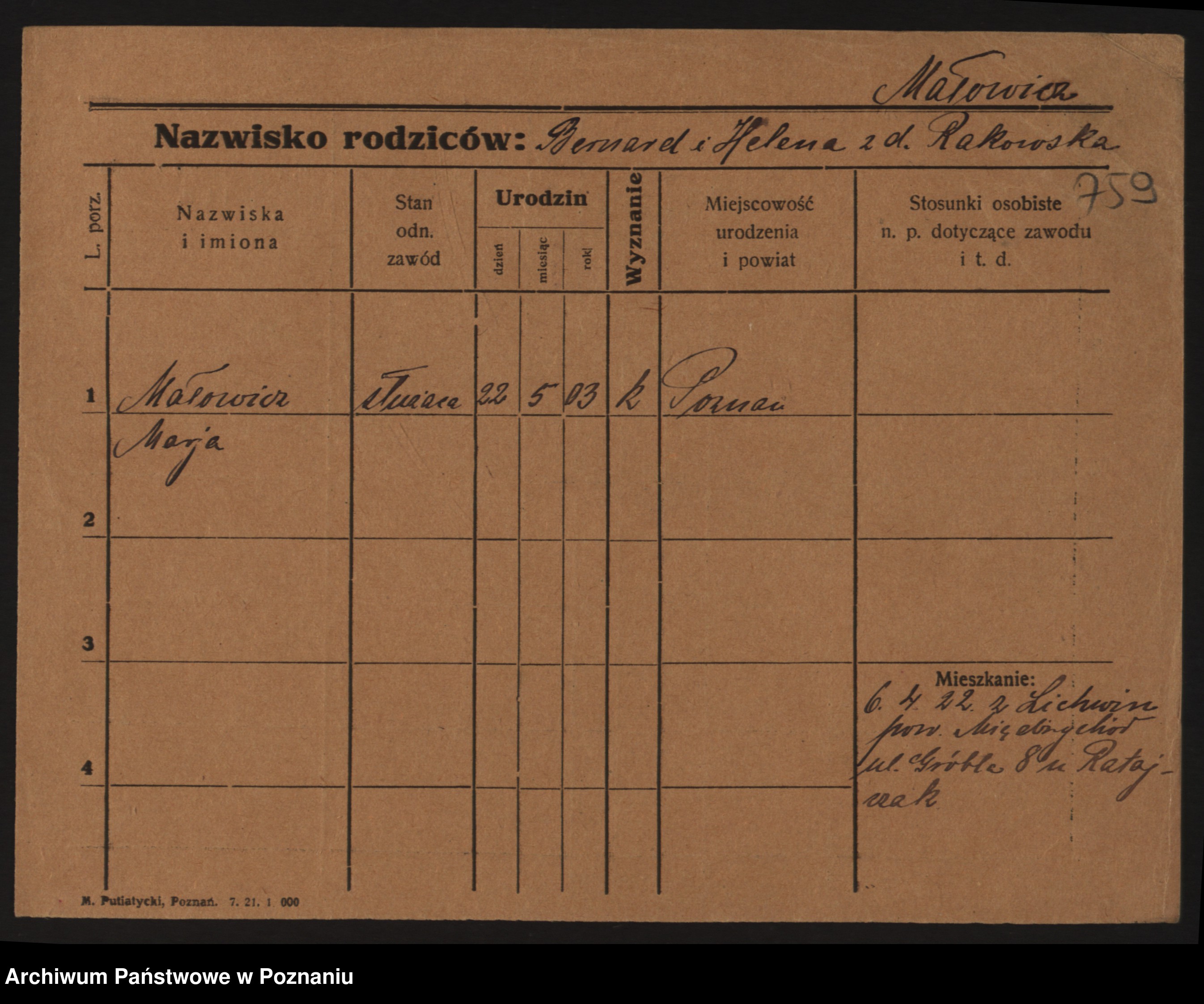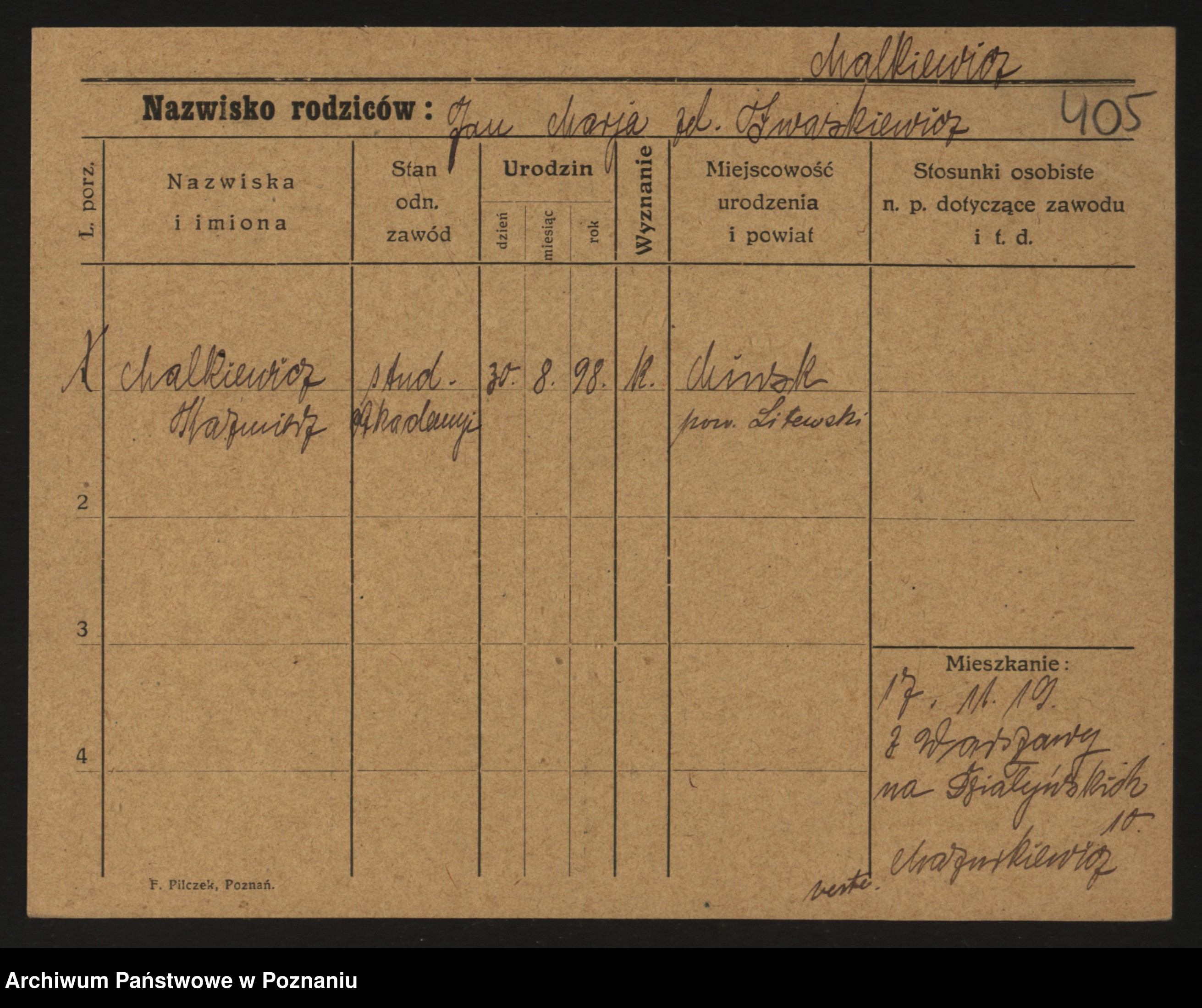 Podgląd karty osobowej dostępny jest po kliknięciu na nazwisko lub ikonkę karty. Można dokonywać powiększenia (ikony na górze) lub przechodzić między kolejnymi skanami (strzałki po bokach).