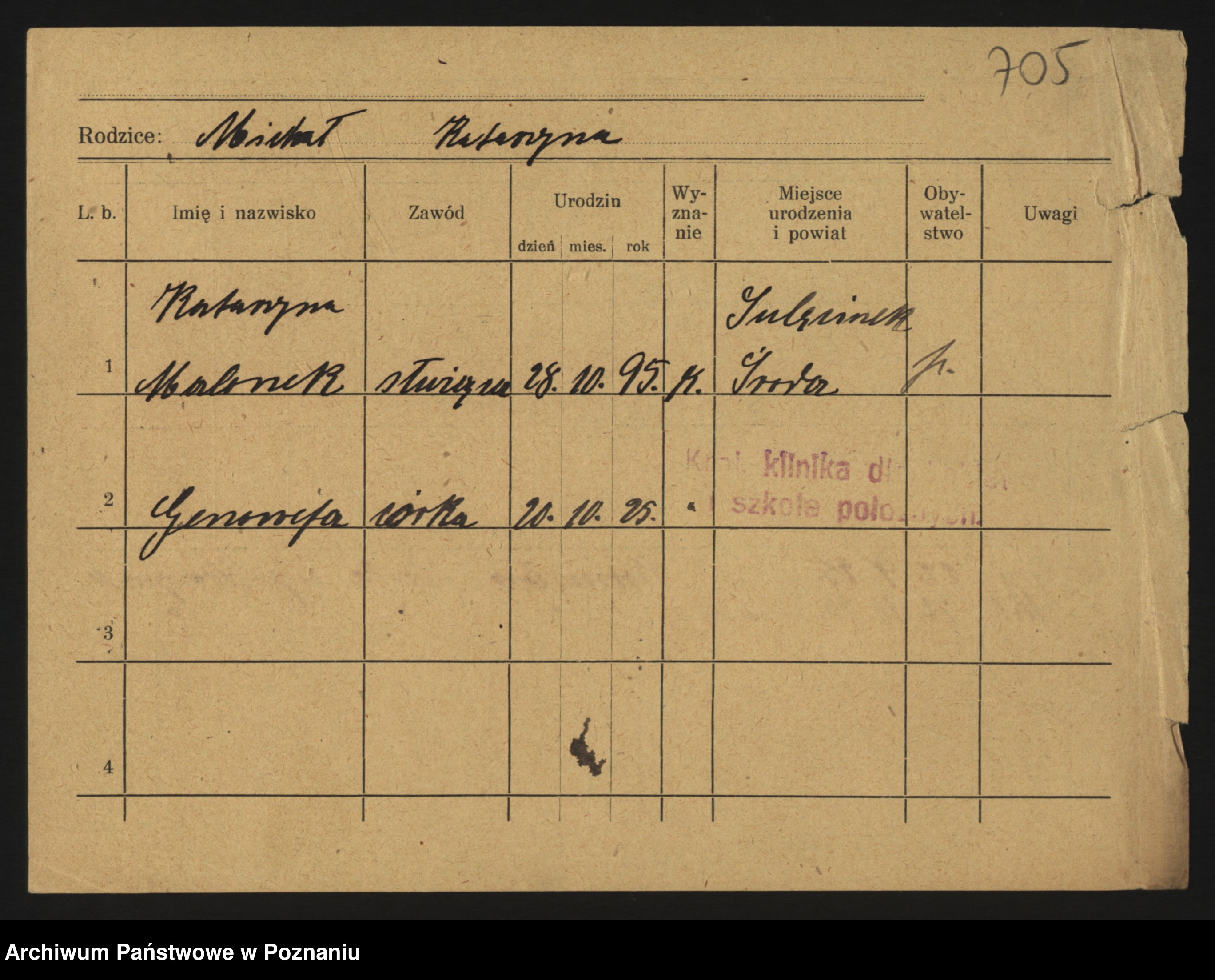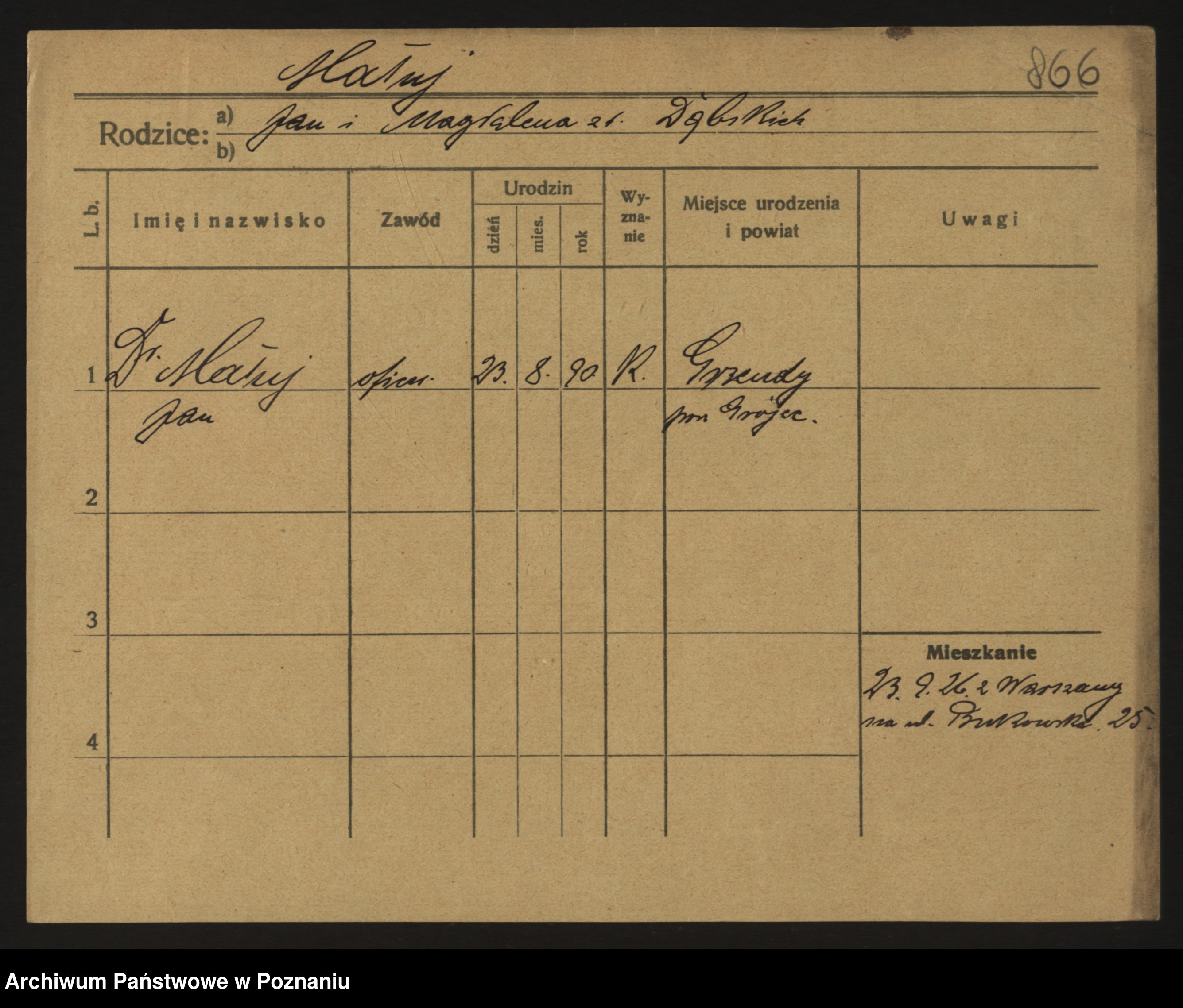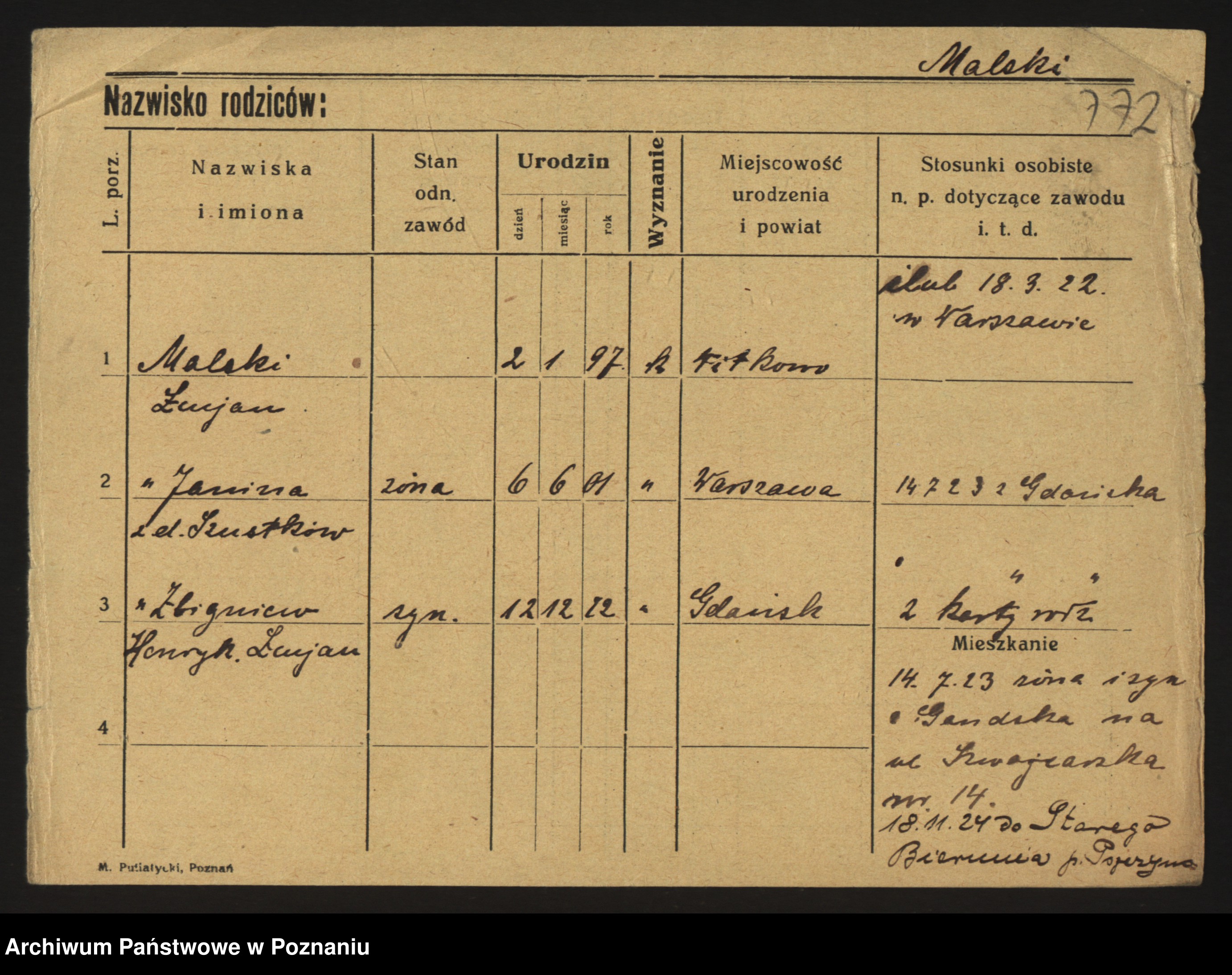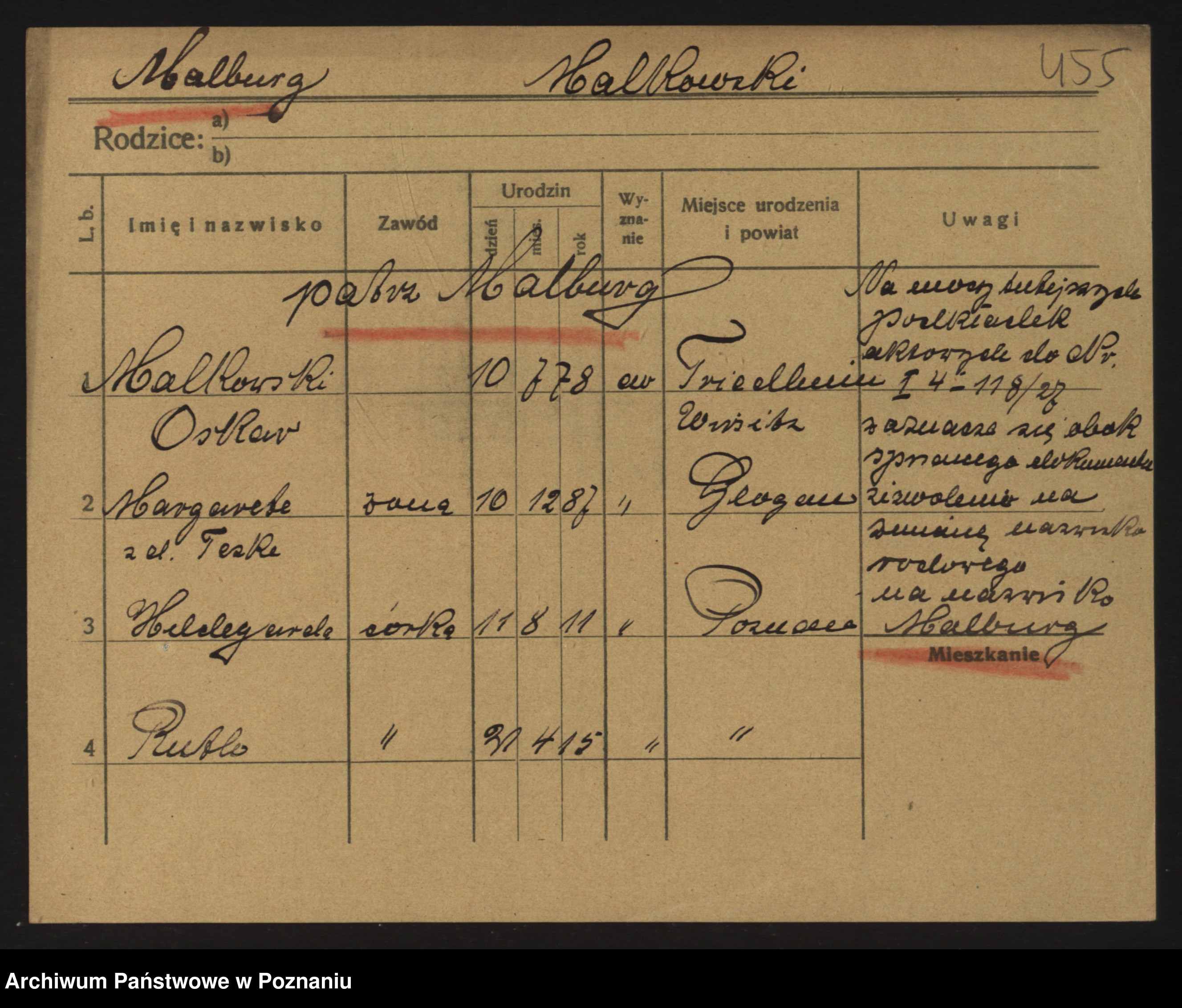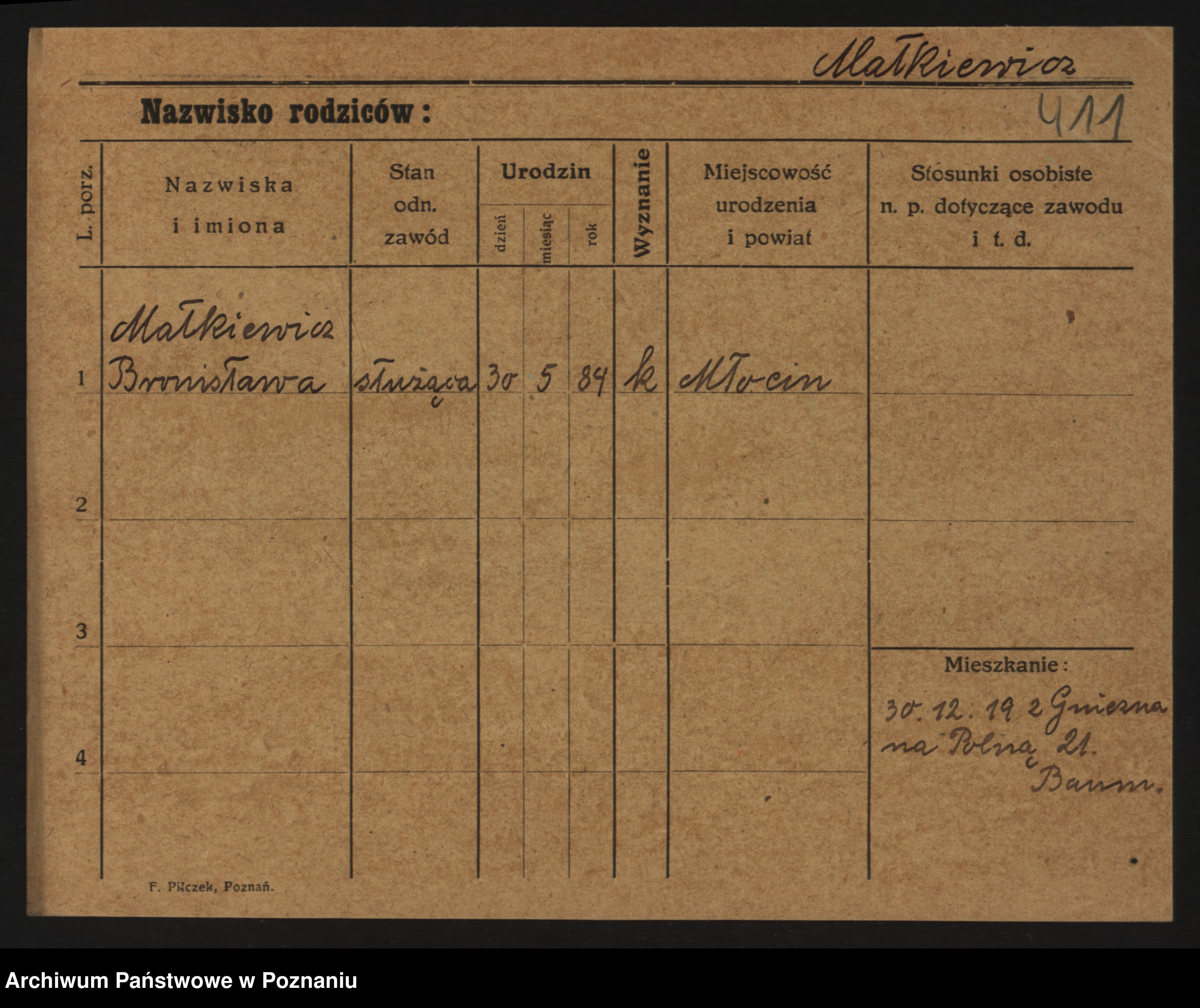 Podgląd karty osobowej dostępny jest po kliknięciu na nazwisko lub ikonkę karty. Można dokonywać powiększenia (ikony na górze) lub przechodzić między kolejnymi skanami (strzałki po bokach).