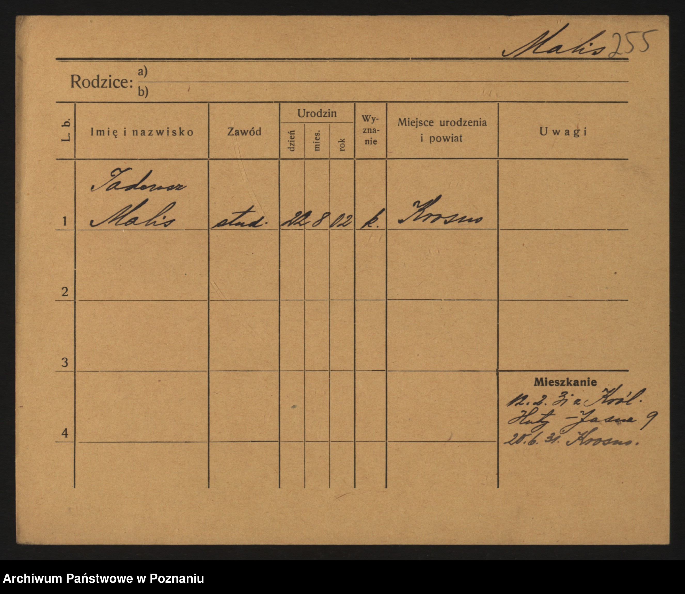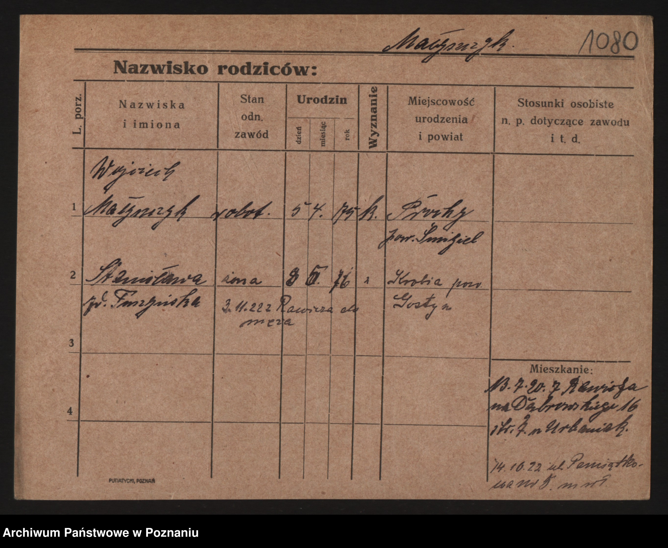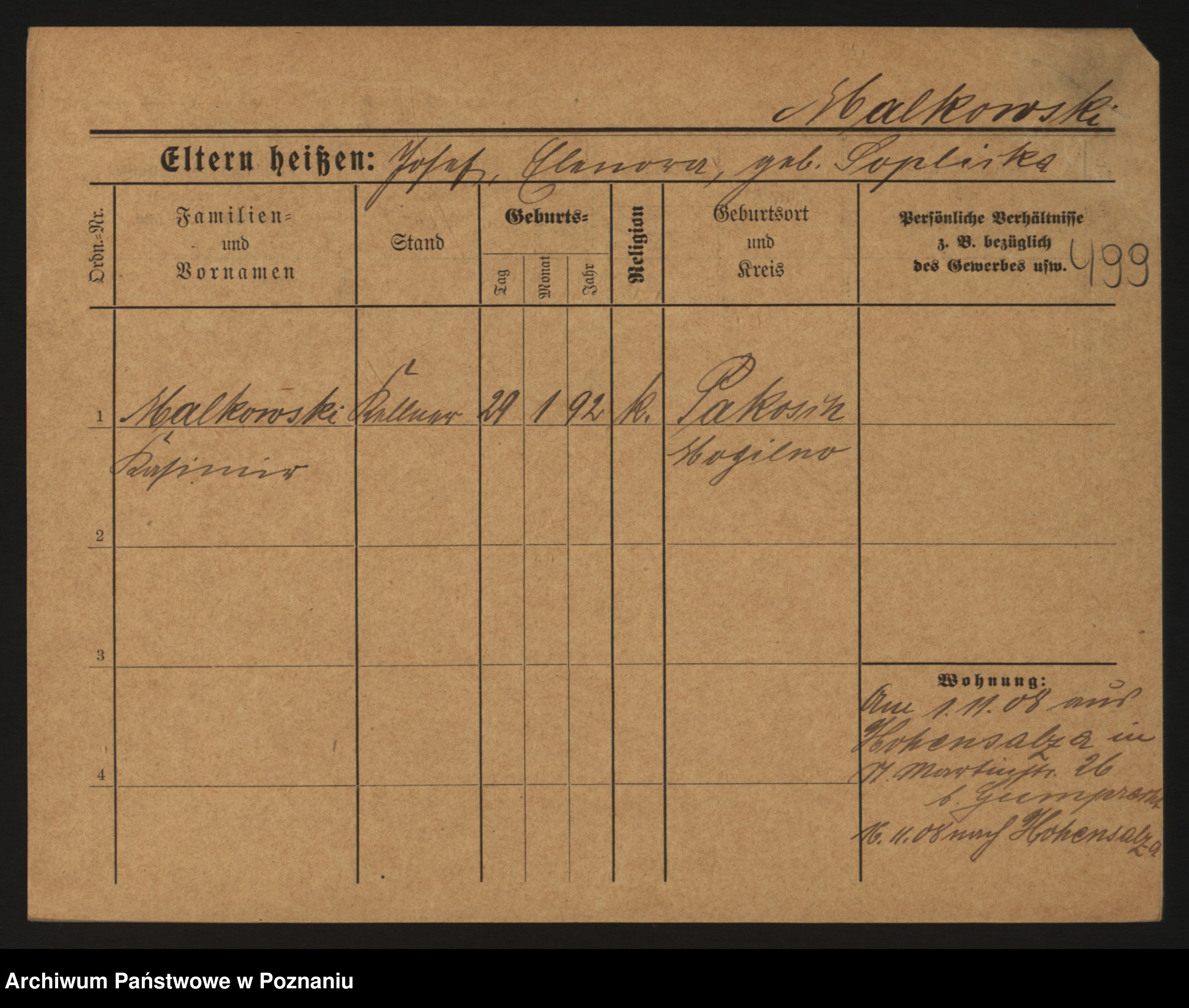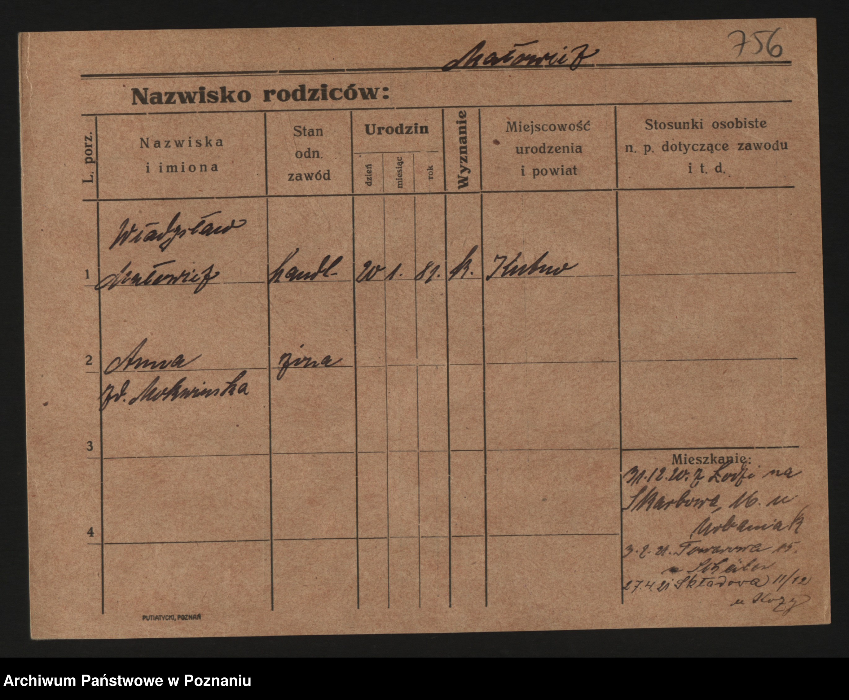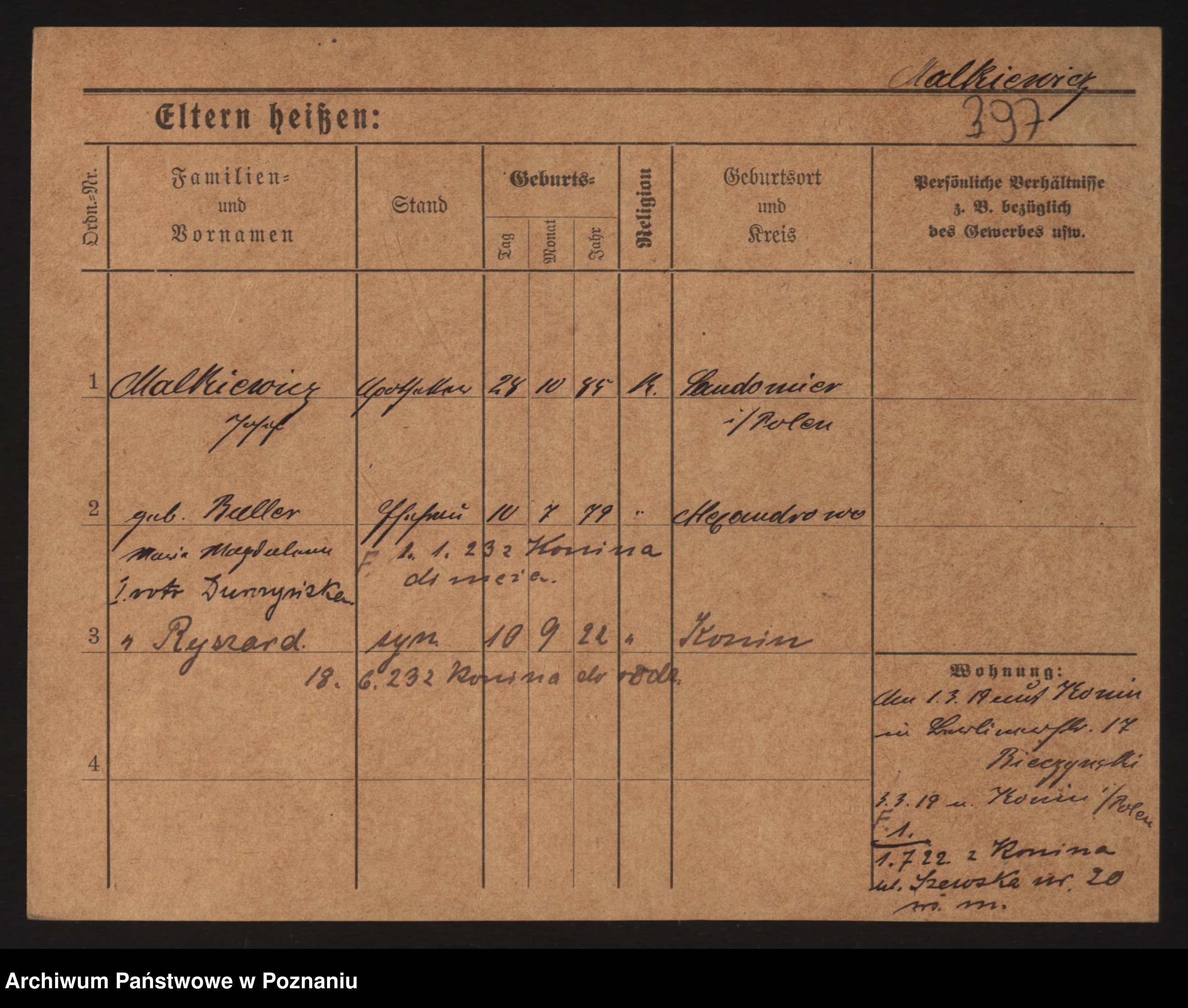 Podgląd karty osobowej dostępny jest po kliknięciu na nazwisko lub ikonkę karty. Można dokonywać powiększenia (ikony na górze) lub przechodzić między kolejnymi skanami (strzałki po bokach).