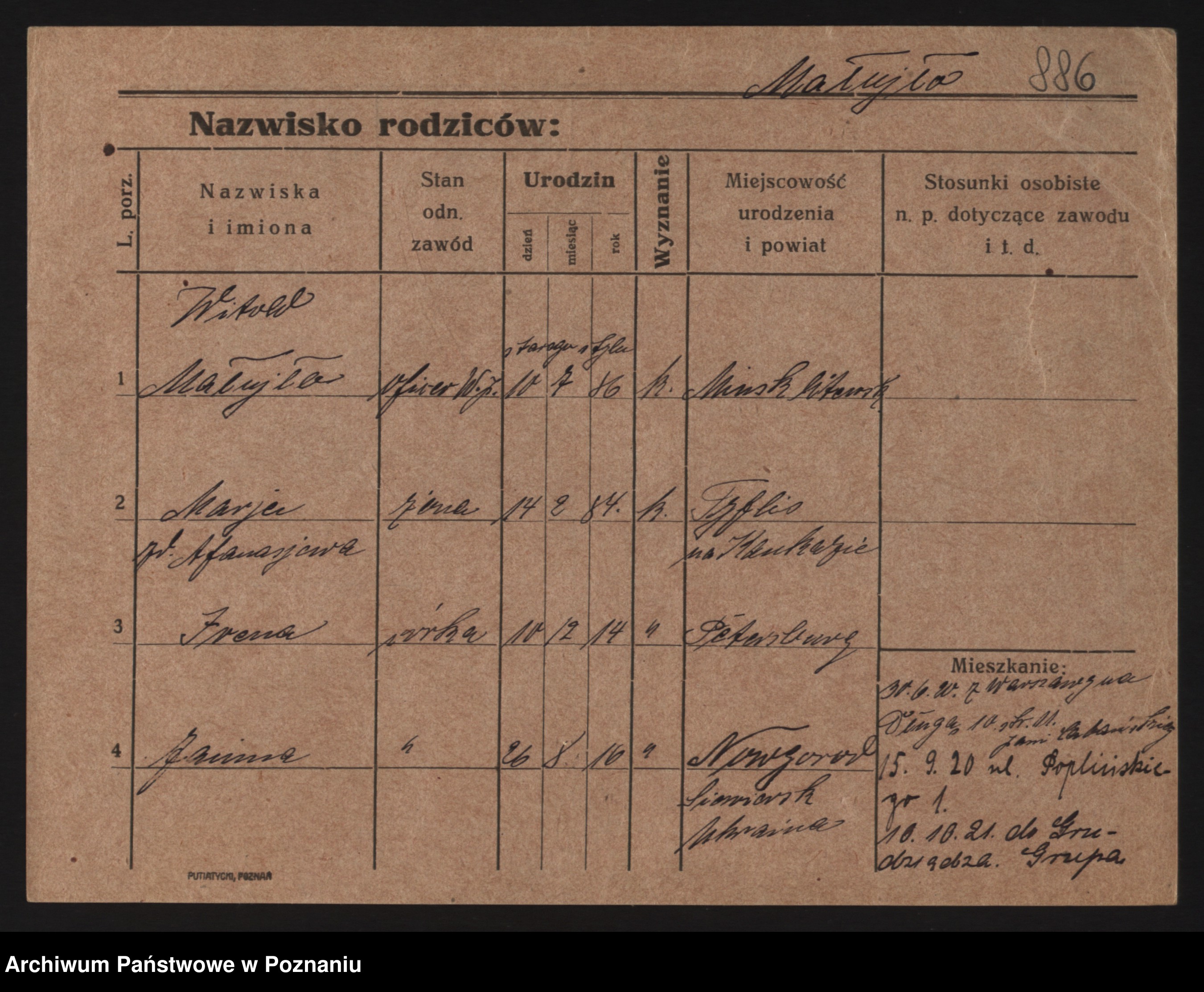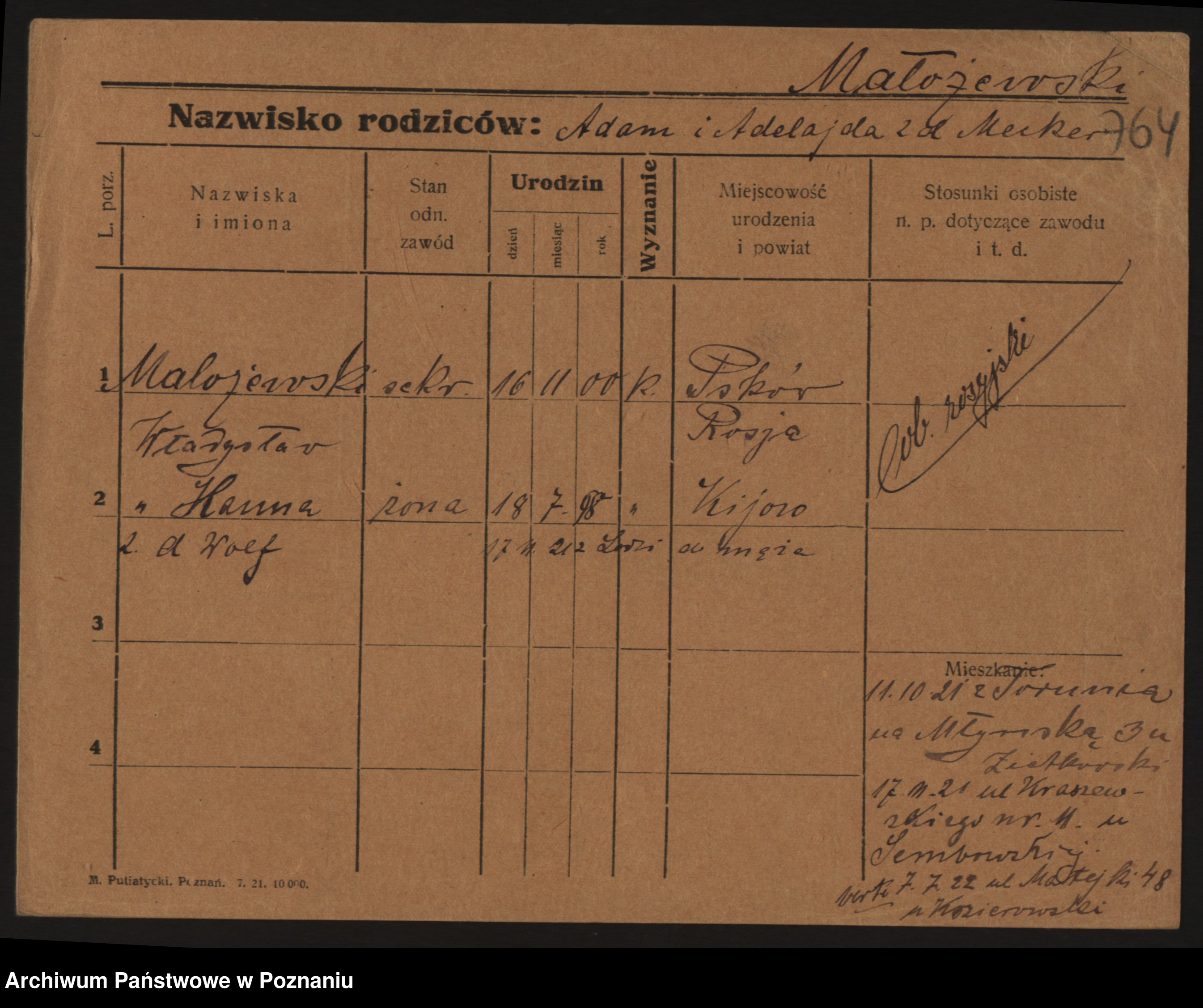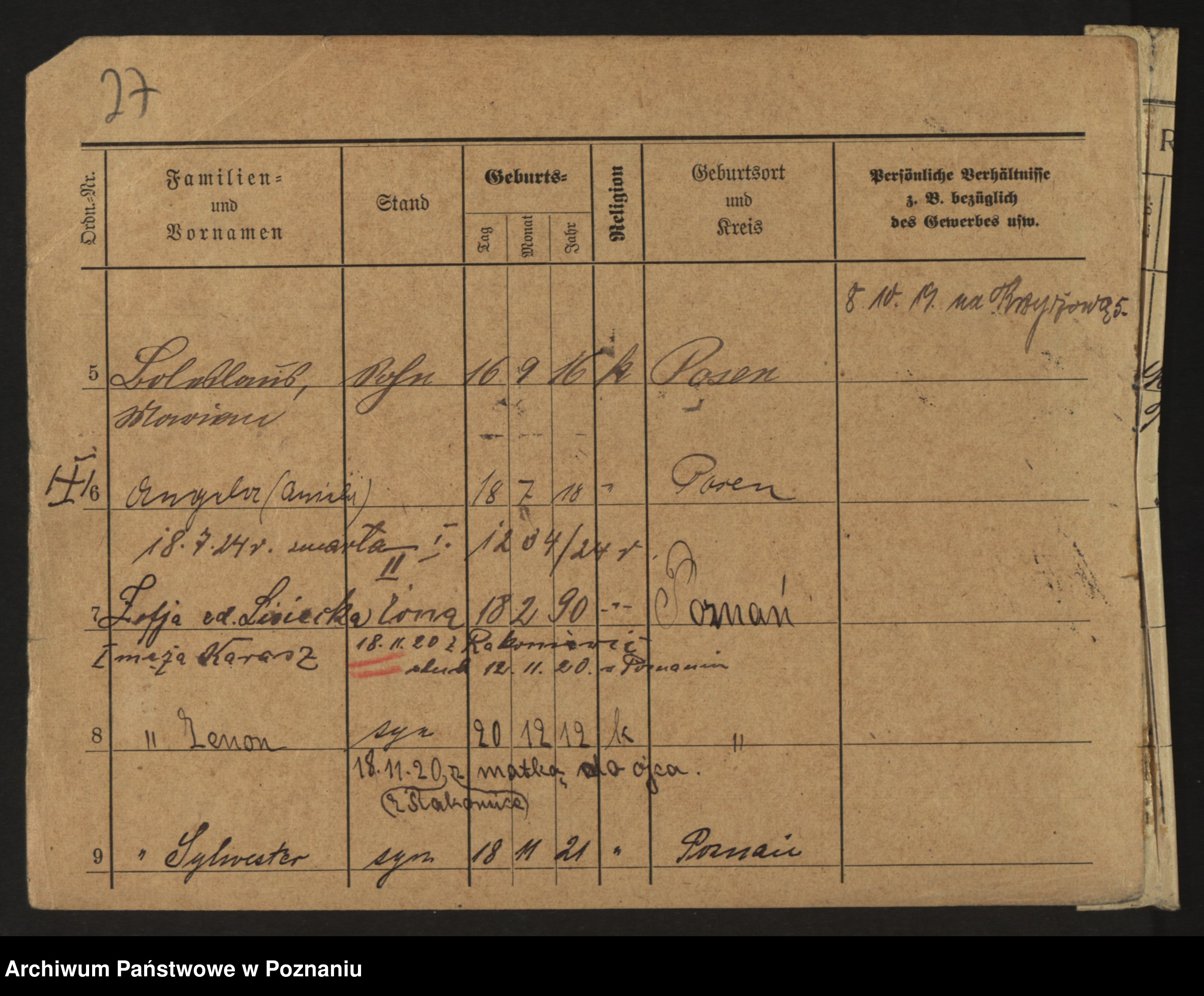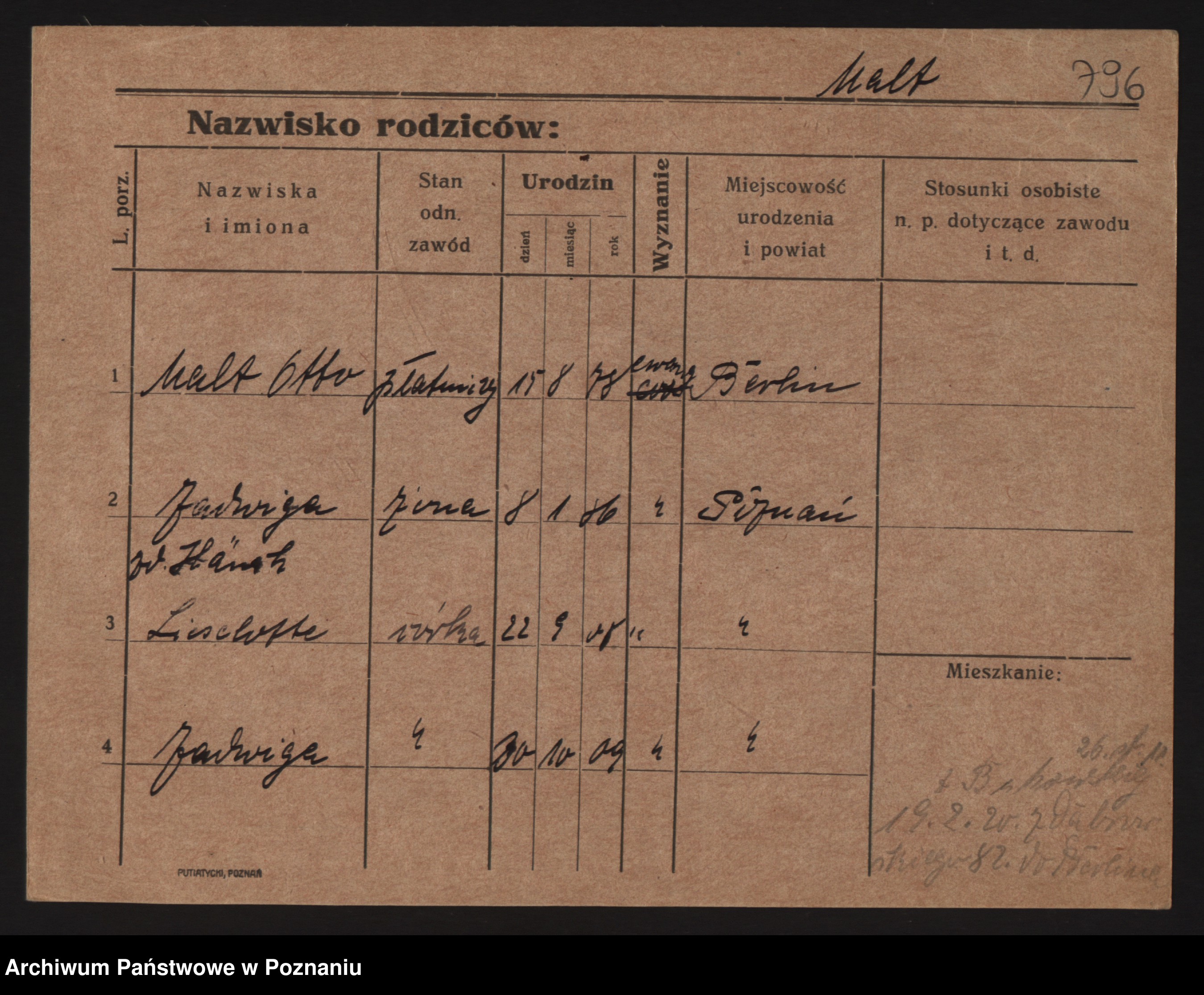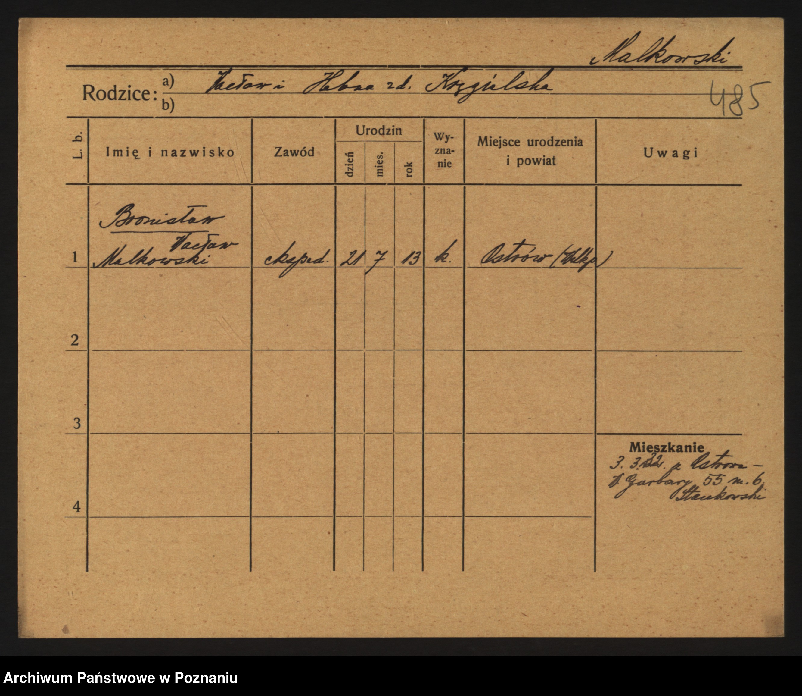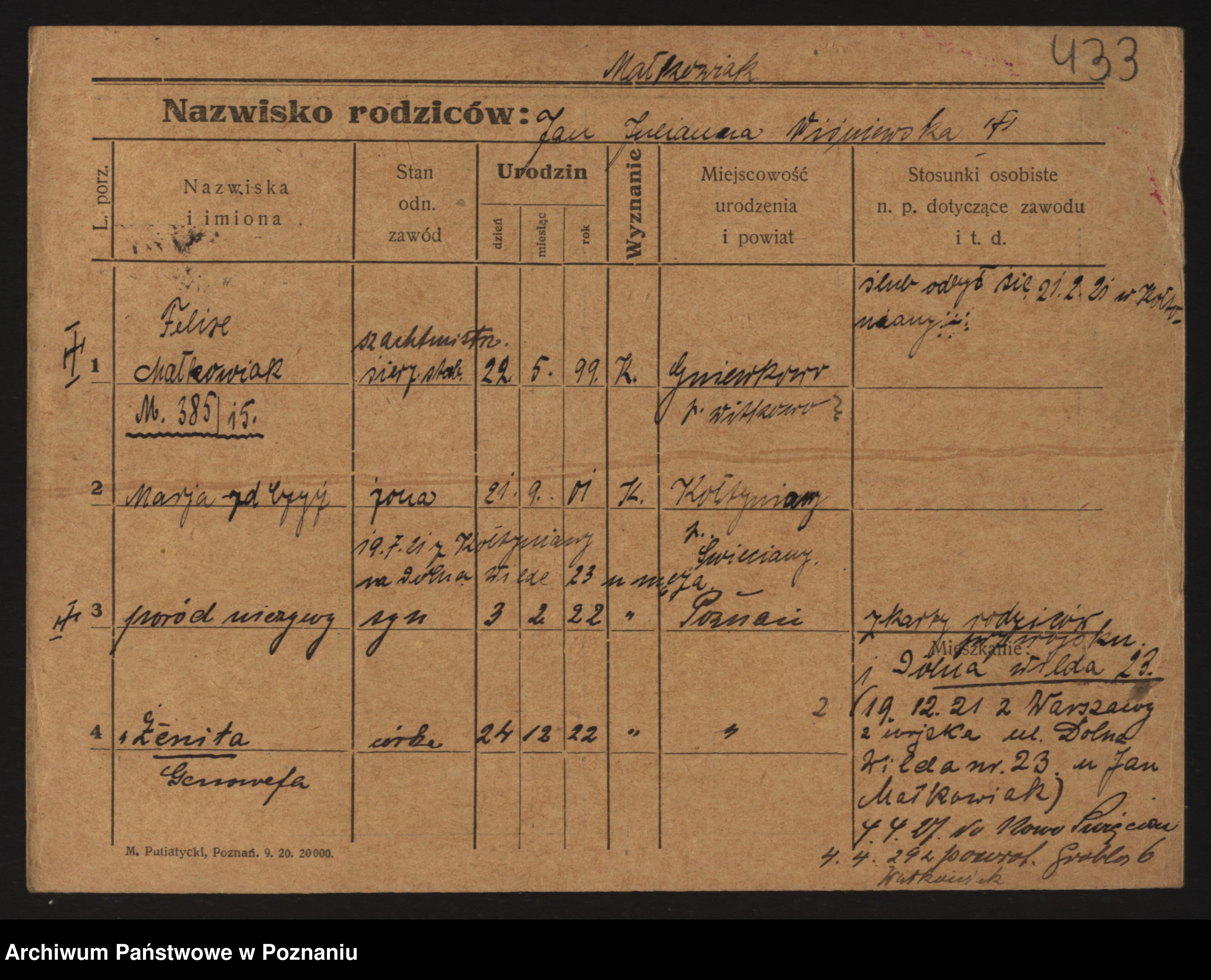 Podgląd karty osobowej dostępny jest po kliknięciu na nazwisko lub ikonkę karty. Można dokonywać powiększenia (ikony na górze) lub przechodzić między kolejnymi skanami (strzałki po bokach).