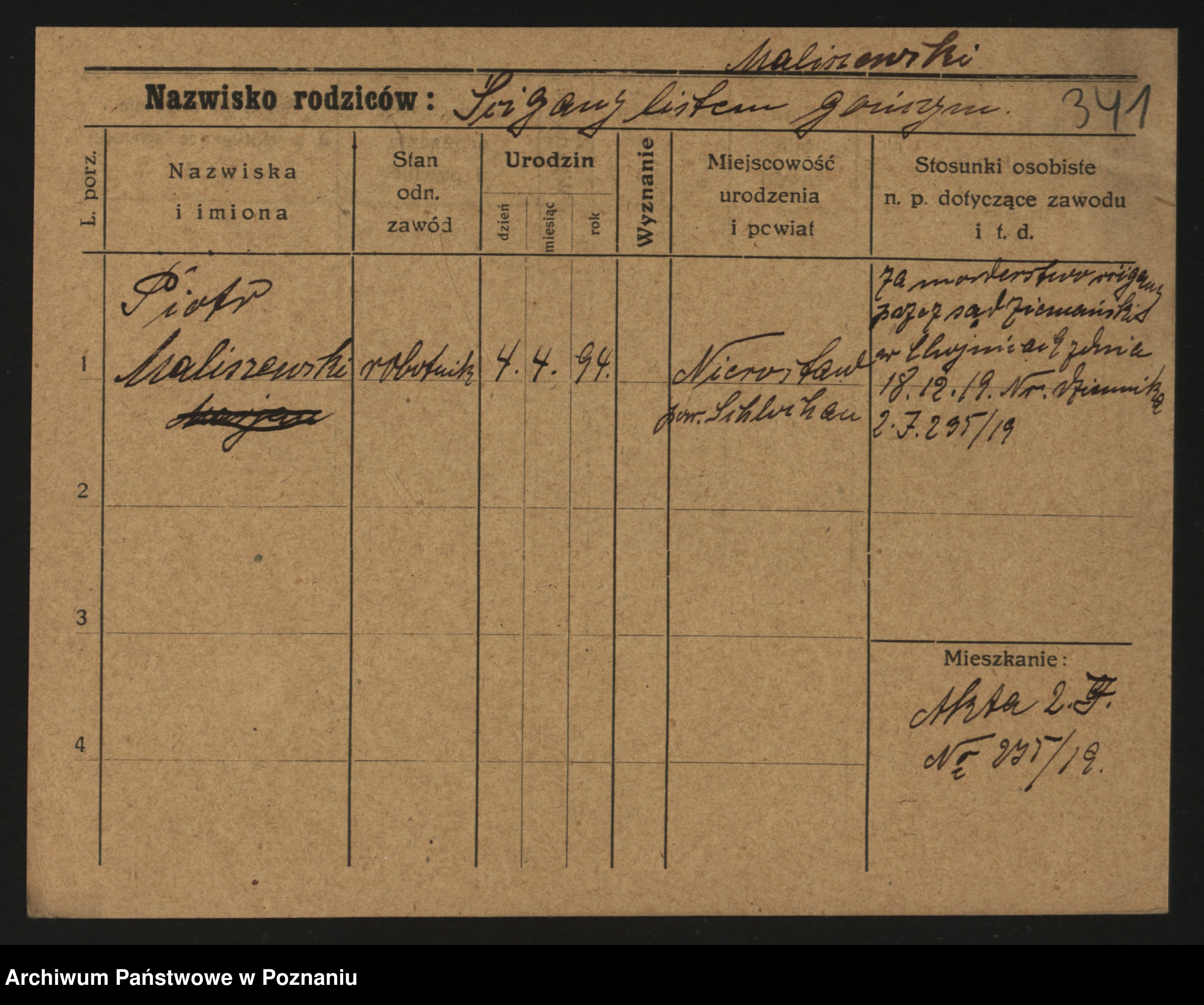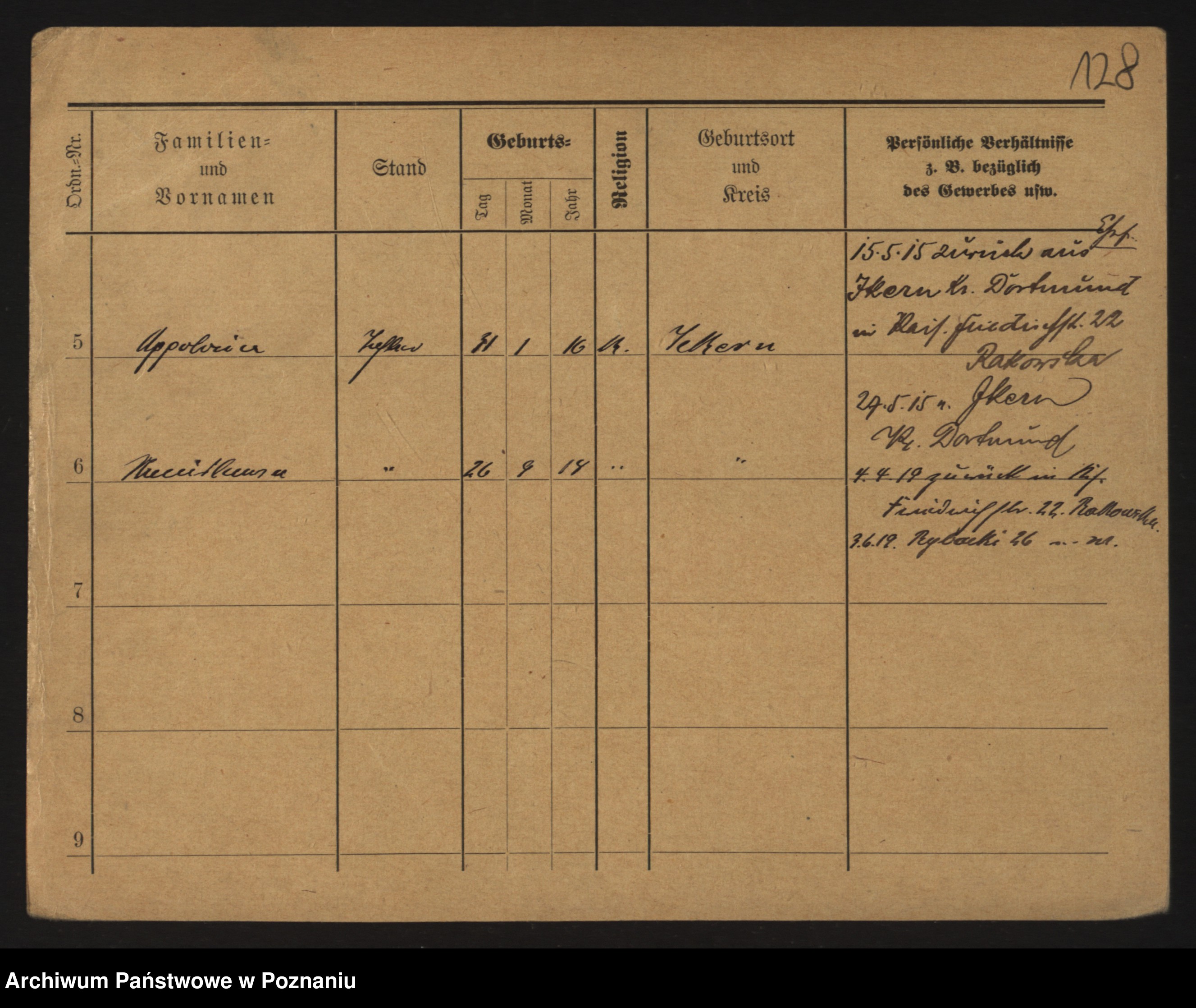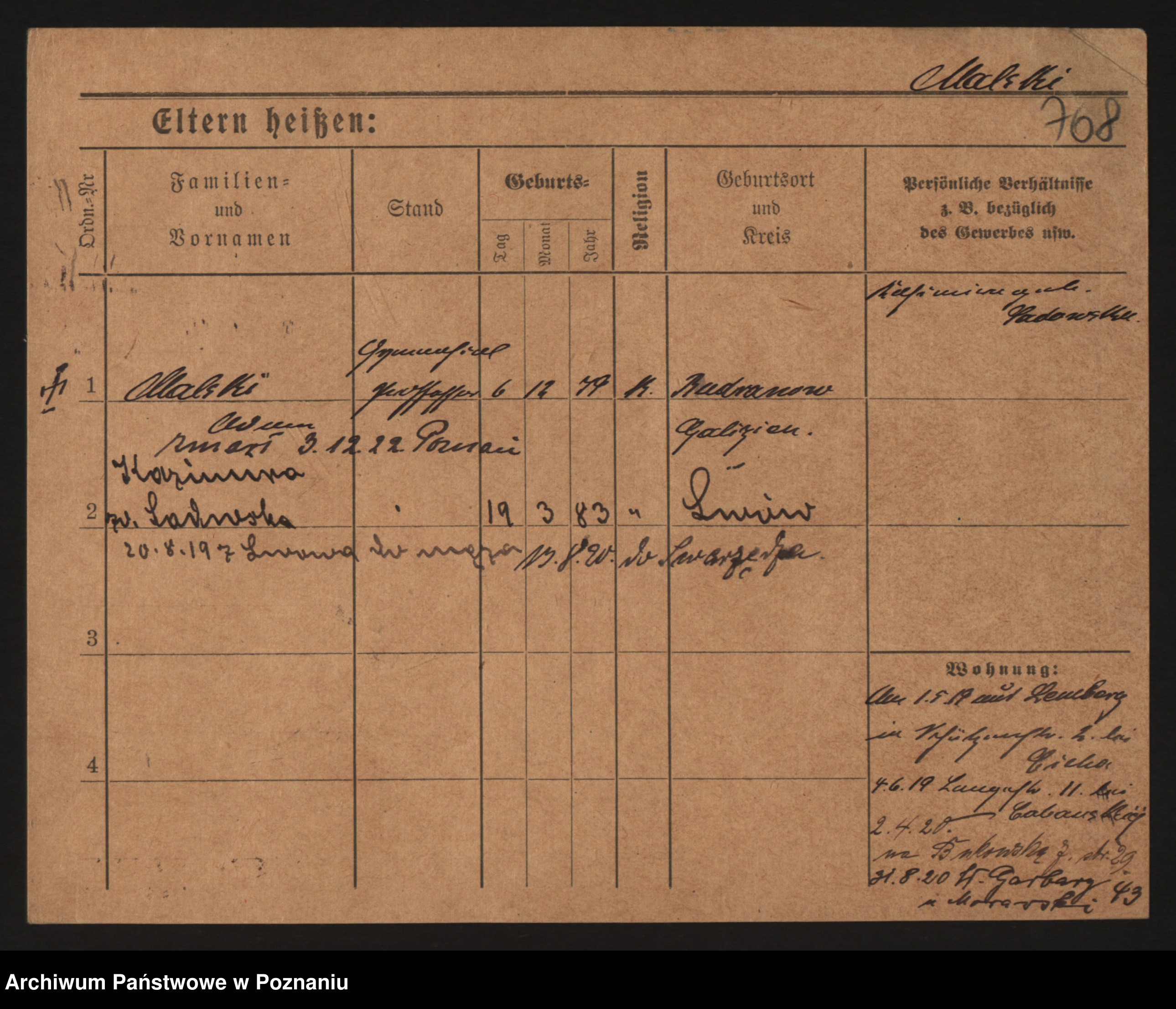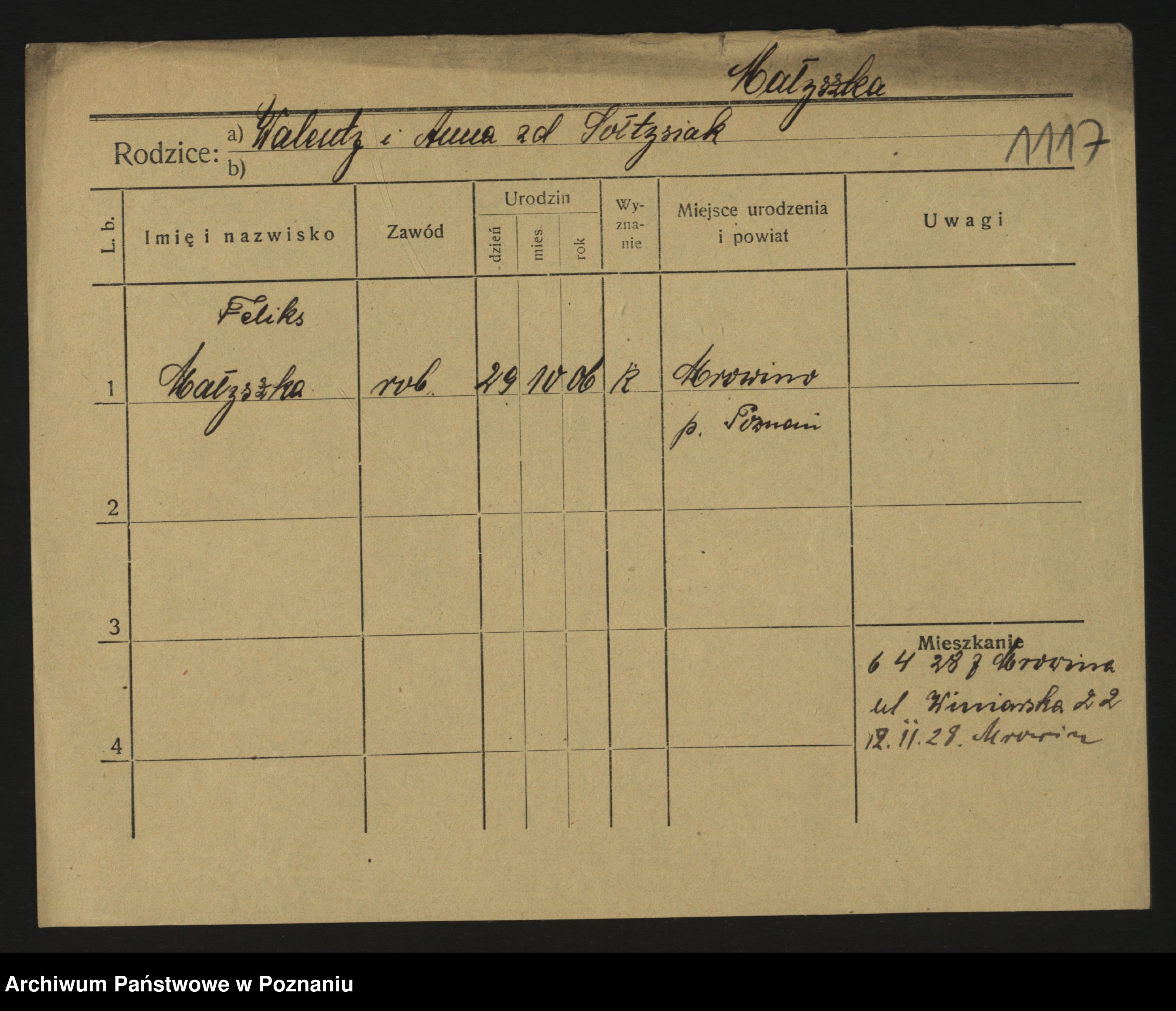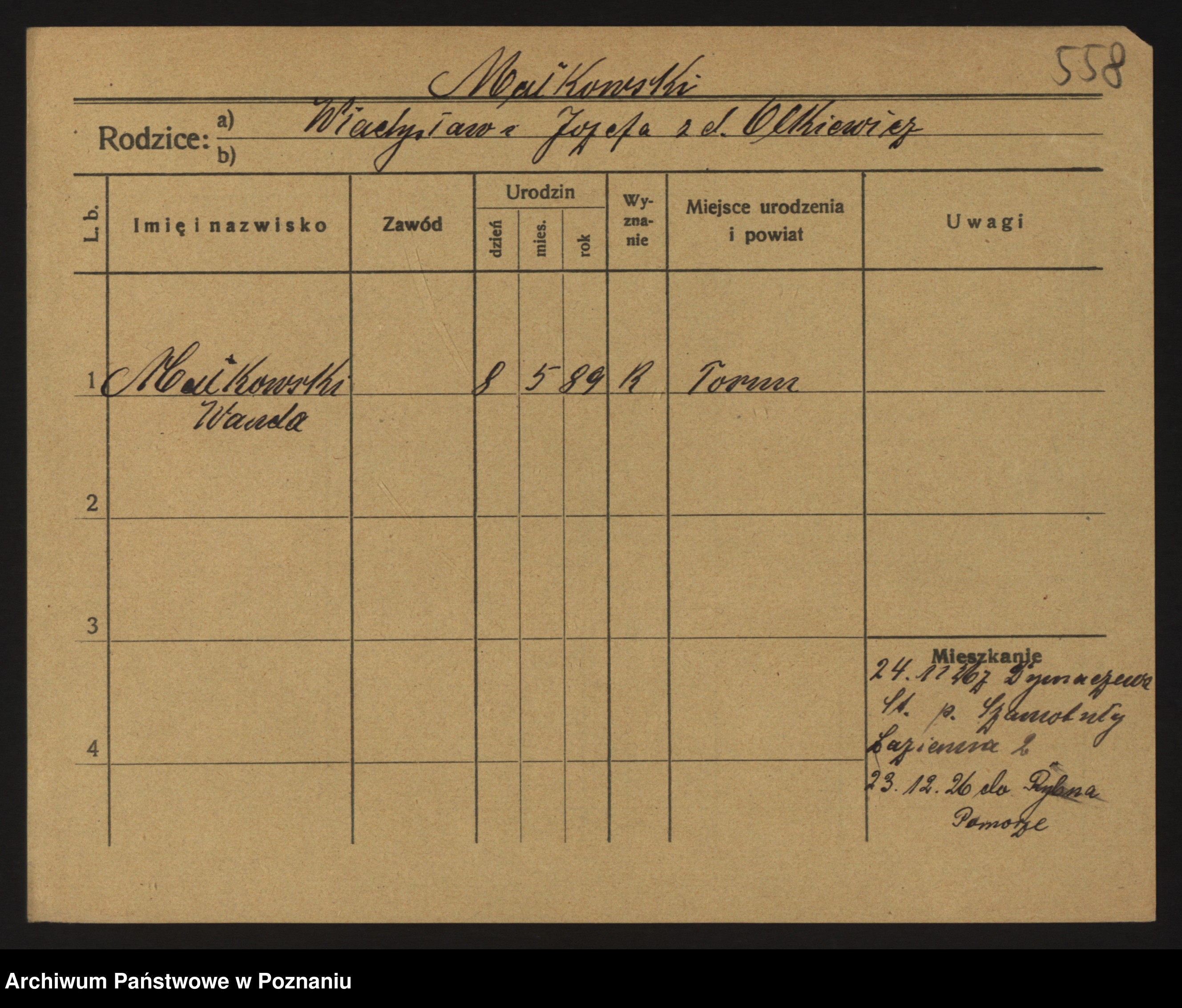 Podgląd karty osobowej dostępny jest po kliknięciu na nazwisko lub ikonkę karty. Można dokonywać powiększenia (ikony na górze) lub przechodzić między kolejnymi skanami (strzałki po bokach).