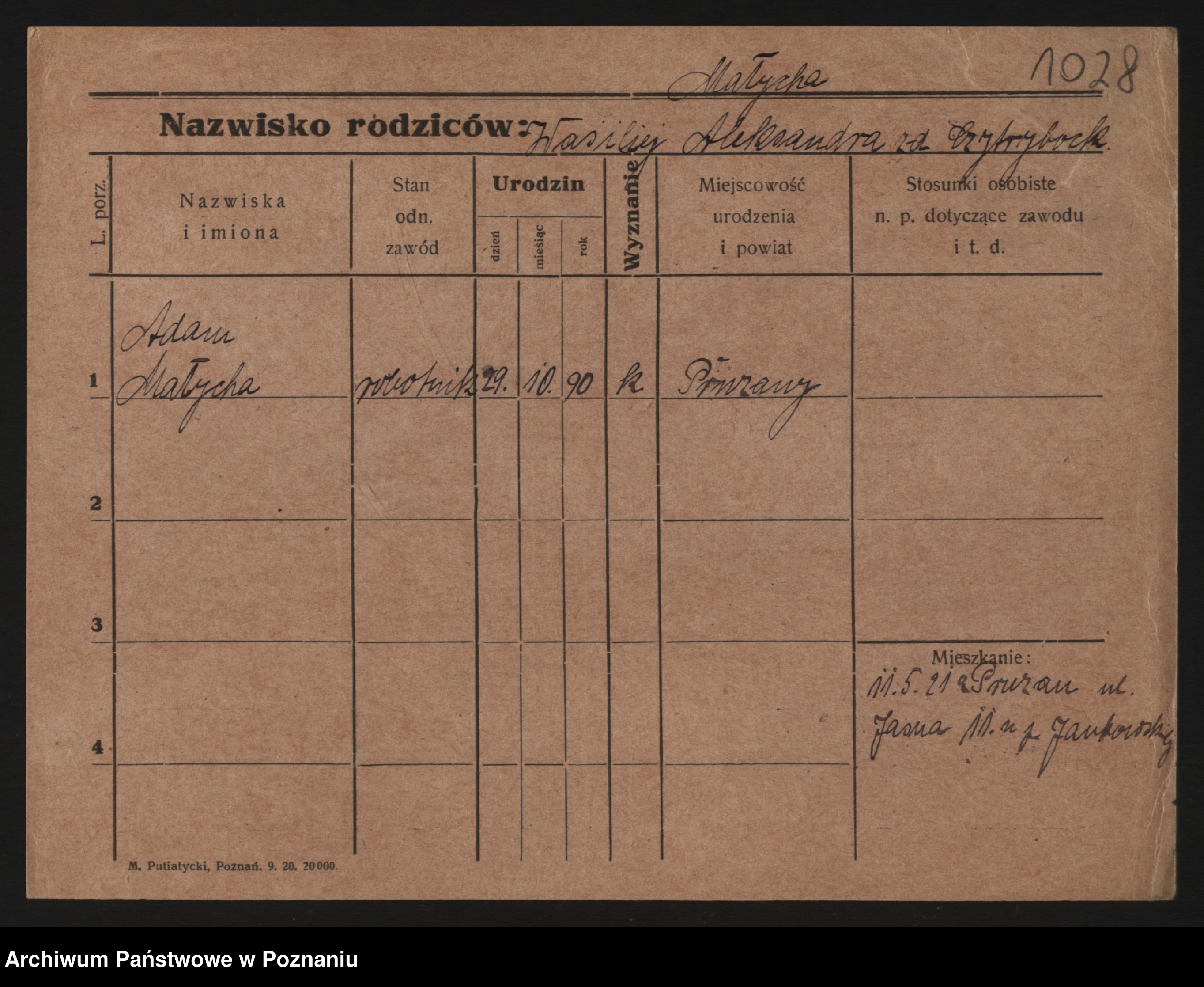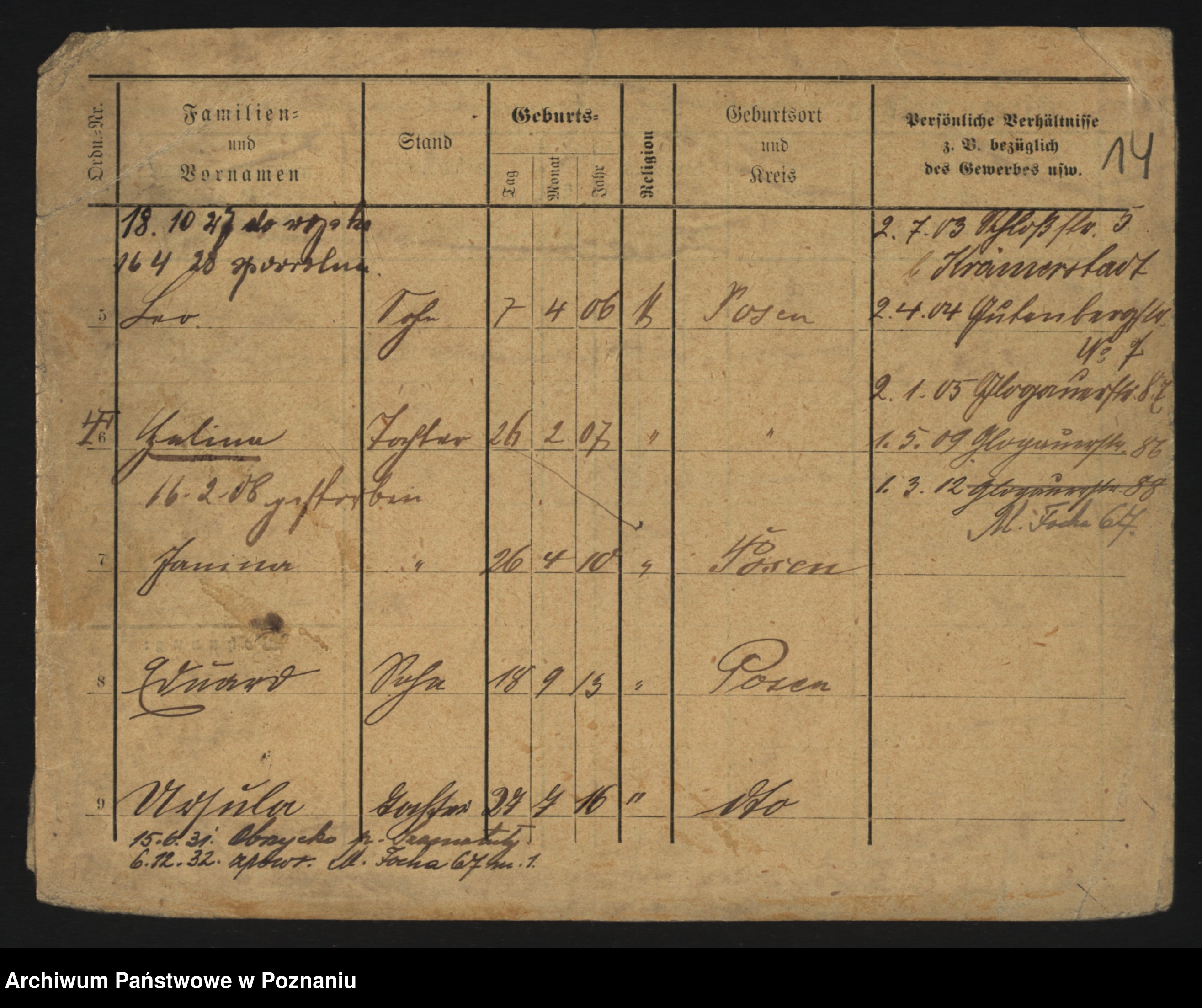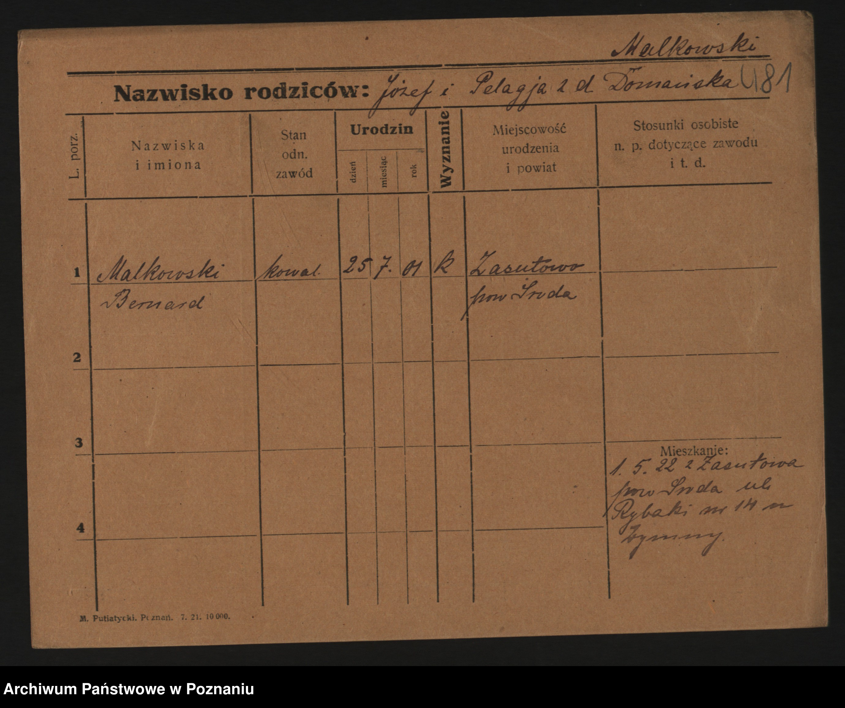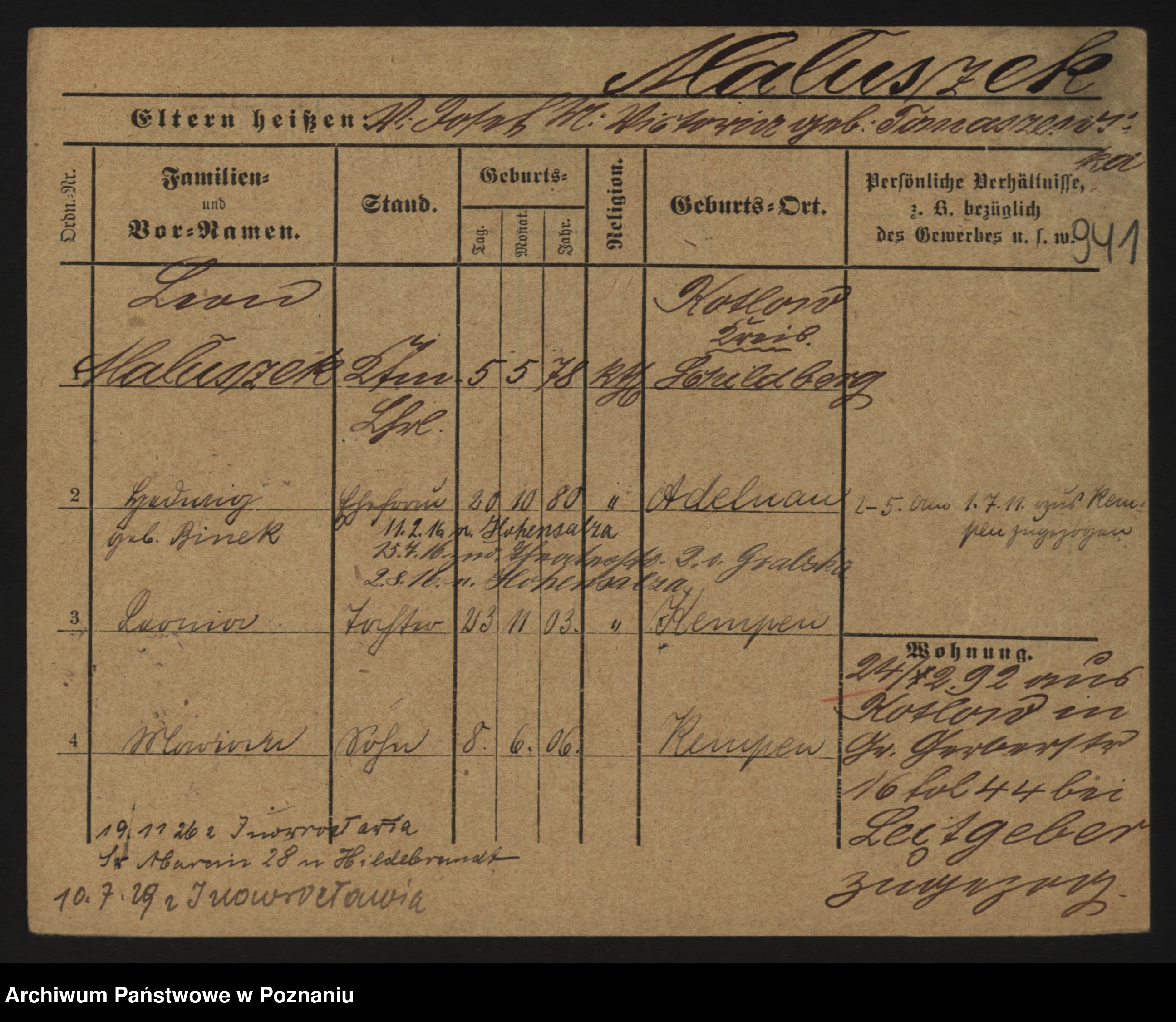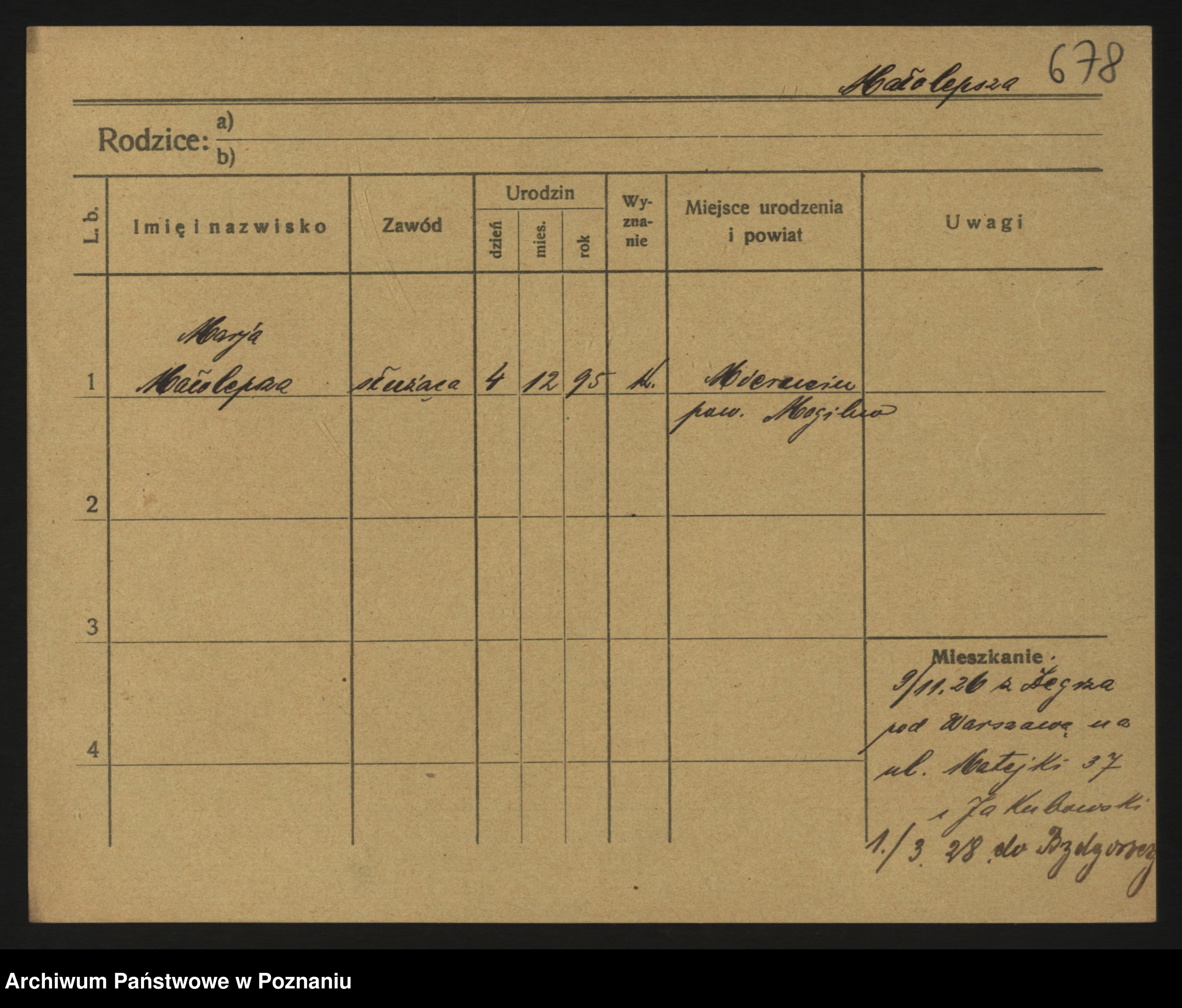 Podgląd karty osobowej dostępny jest po kliknięciu na nazwisko lub ikonkę karty. Można dokonywać powiększenia (ikony na górze) lub przechodzić między kolejnymi skanami (strzałki po bokach).