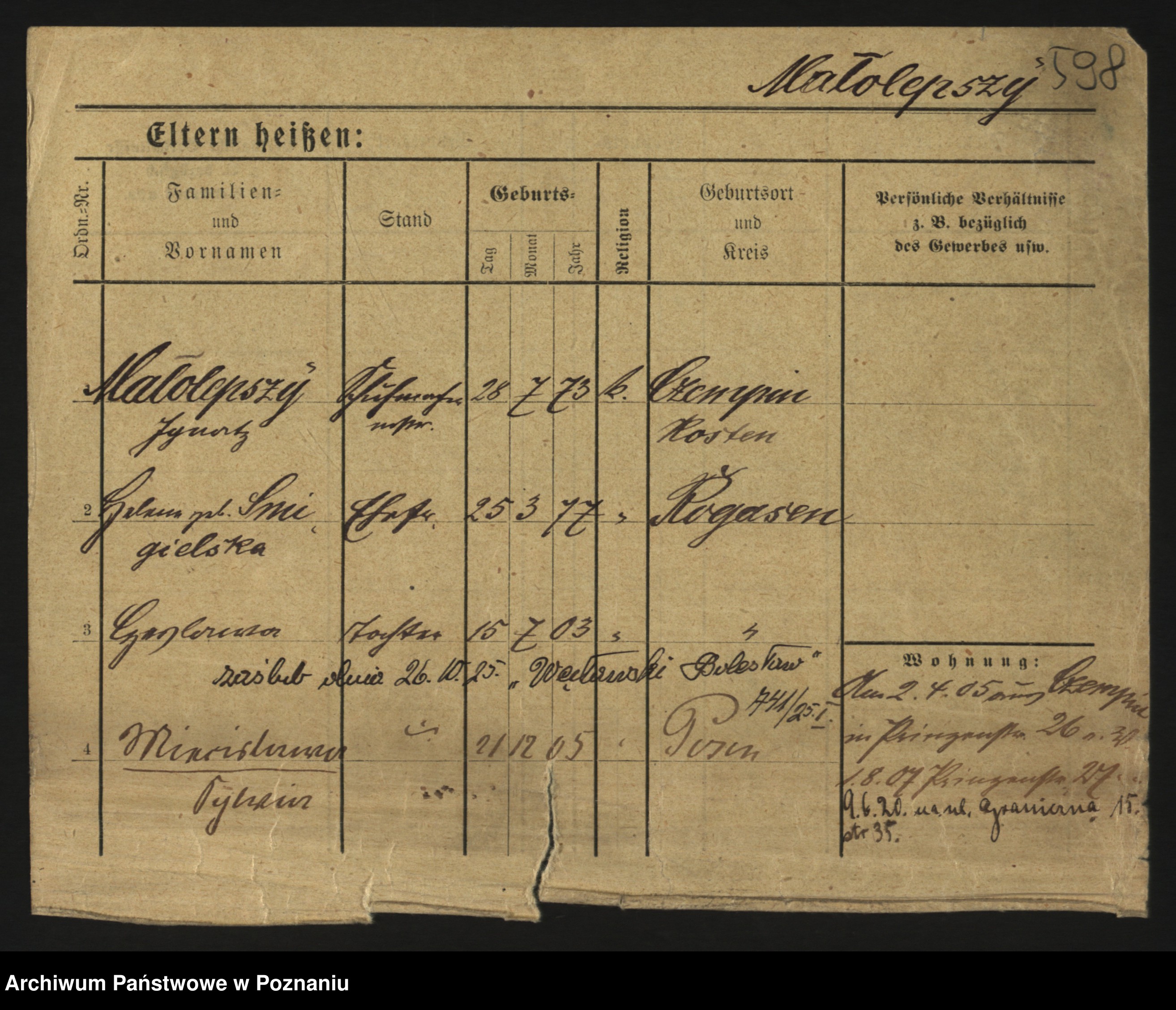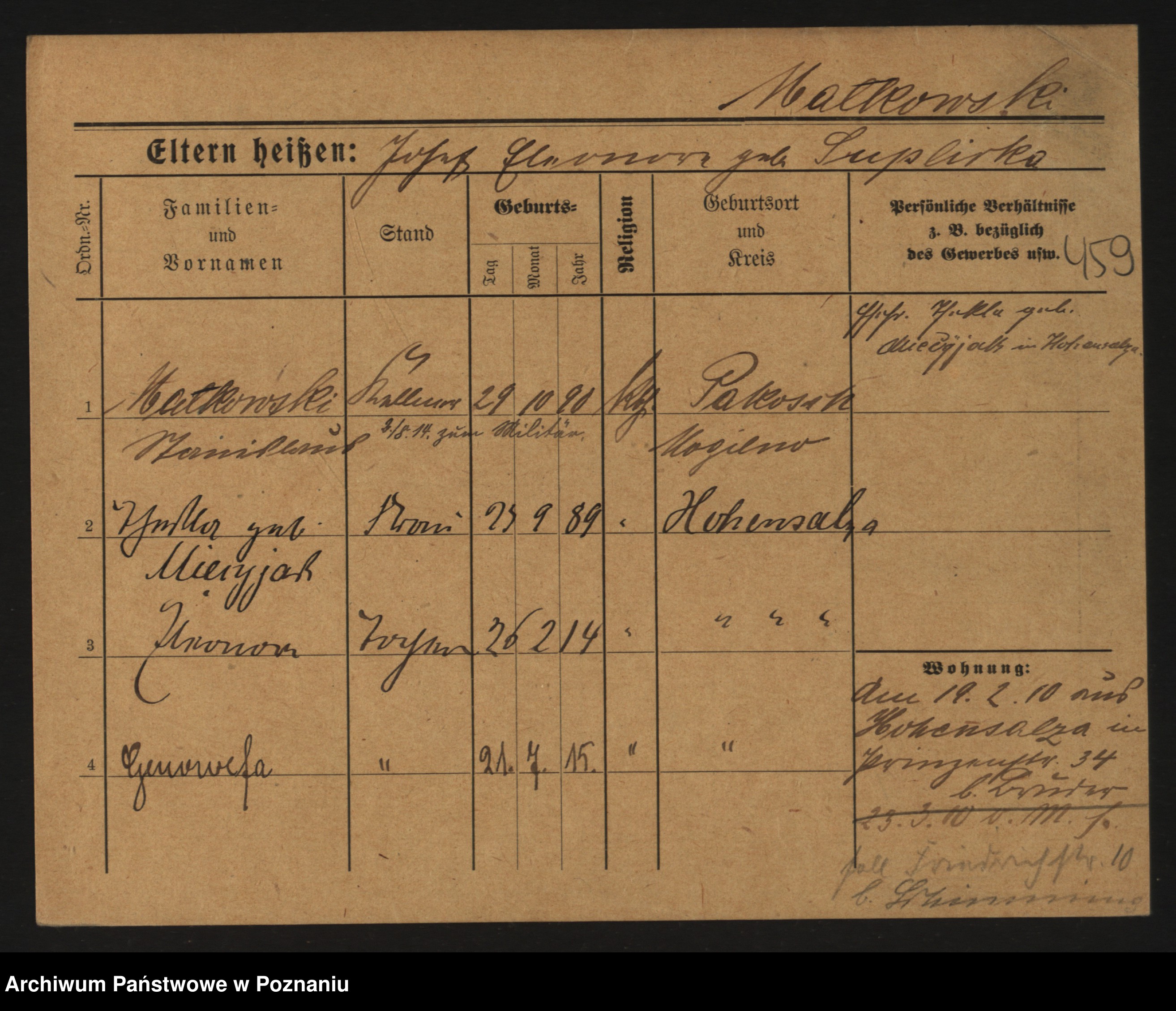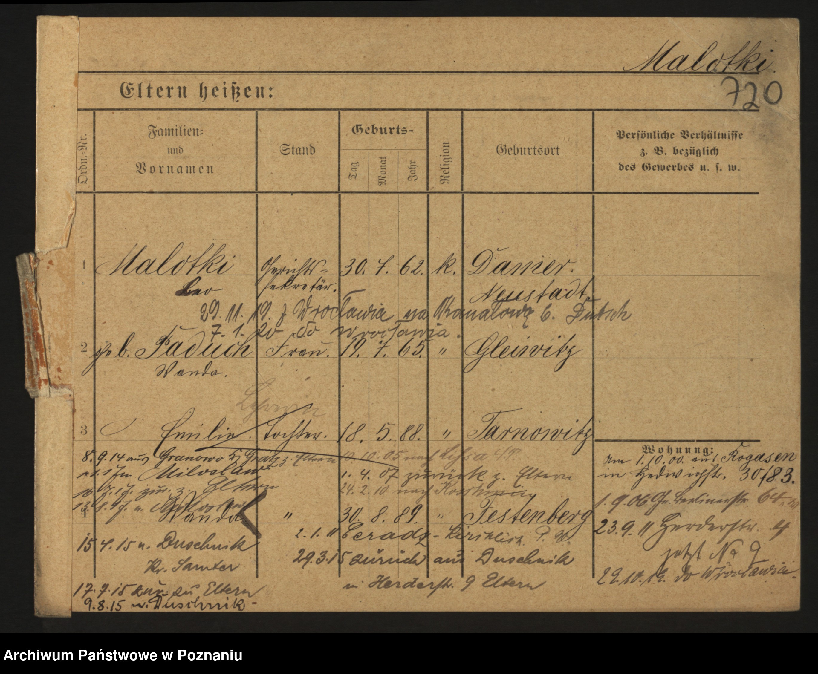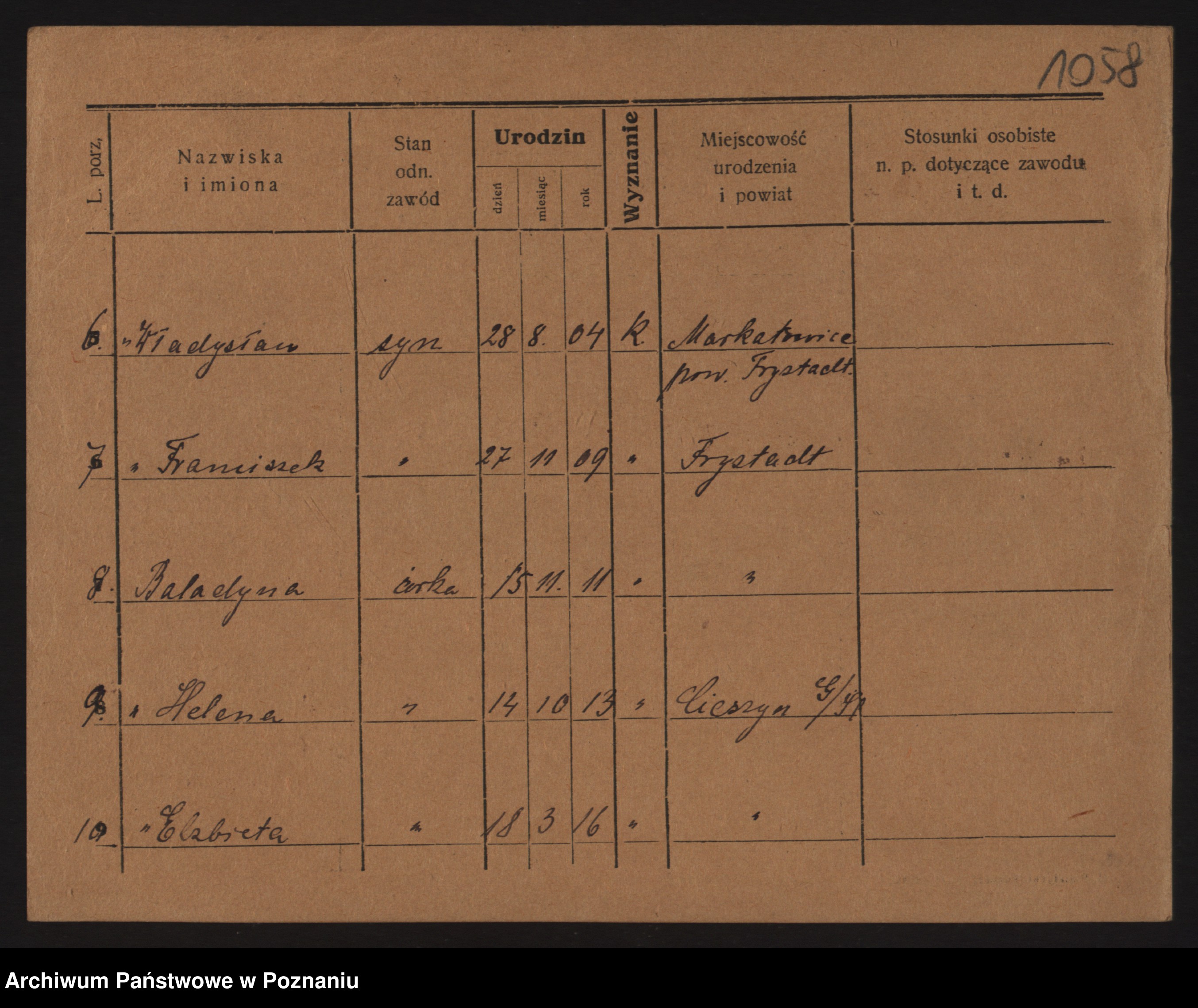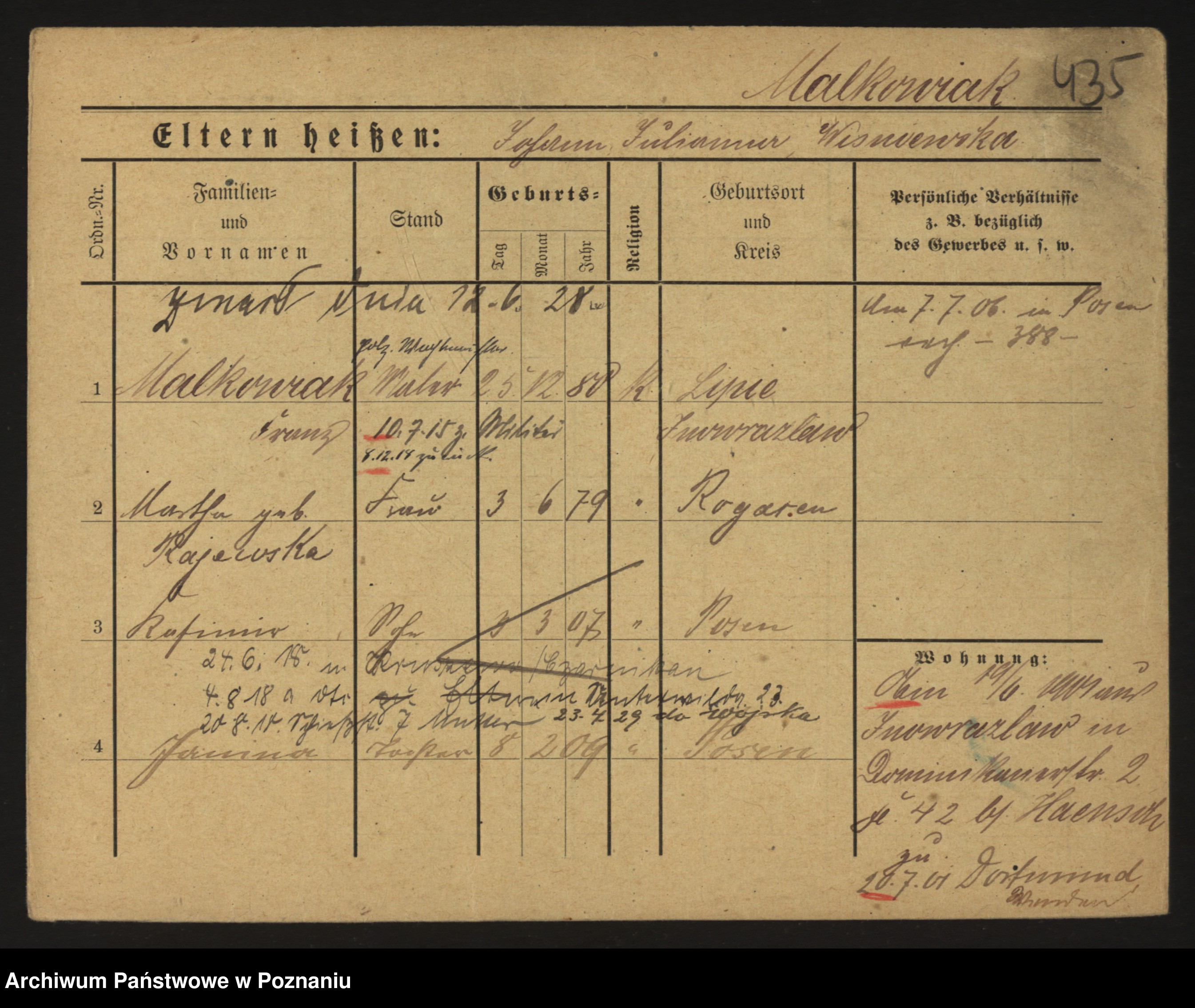 Podgląd karty osobowej dostępny jest po kliknięciu na nazwisko lub ikonkę karty. Można dokonywać powiększenia (ikony na górze) lub przechodzić między kolejnymi skanami (strzałki po bokach).