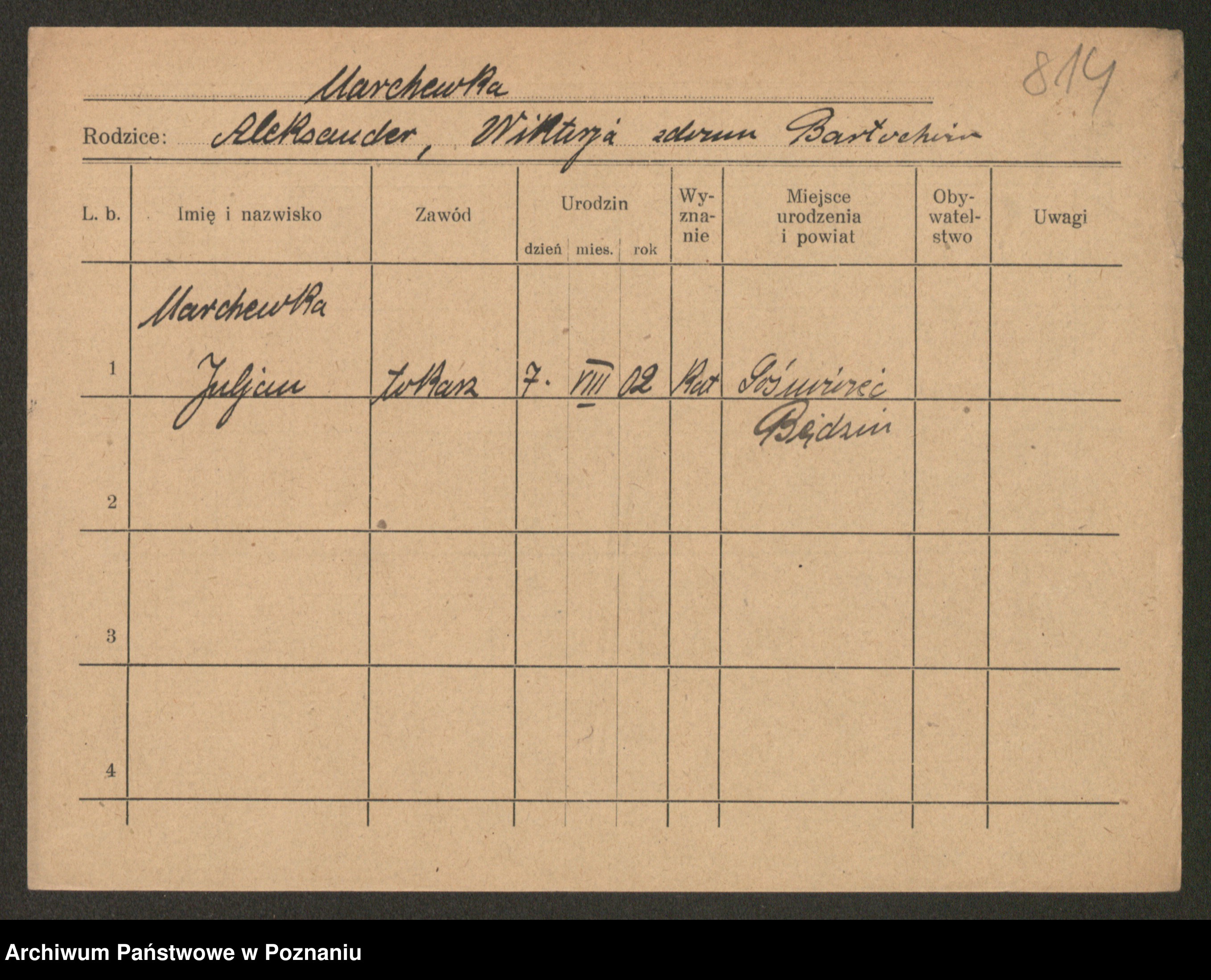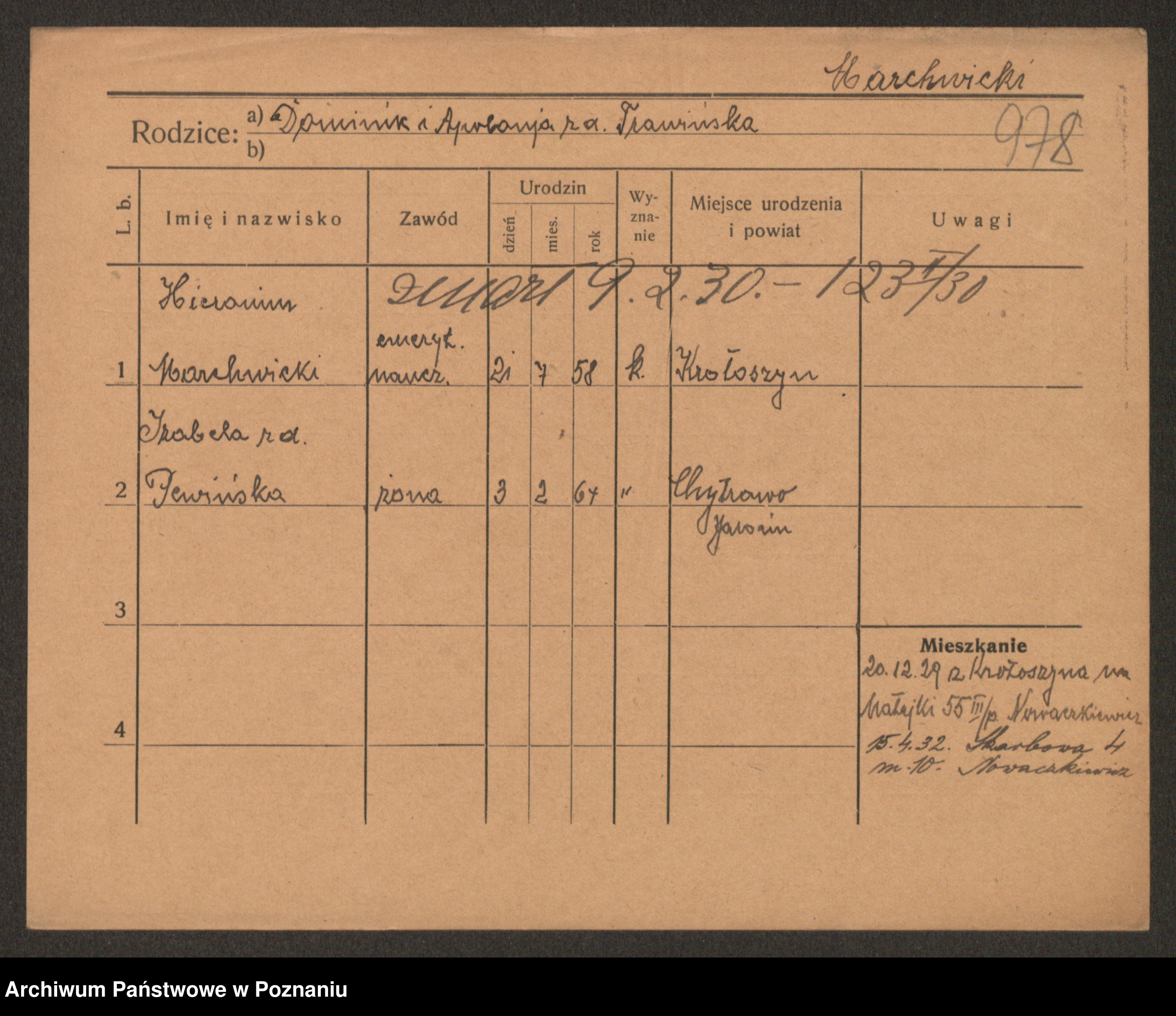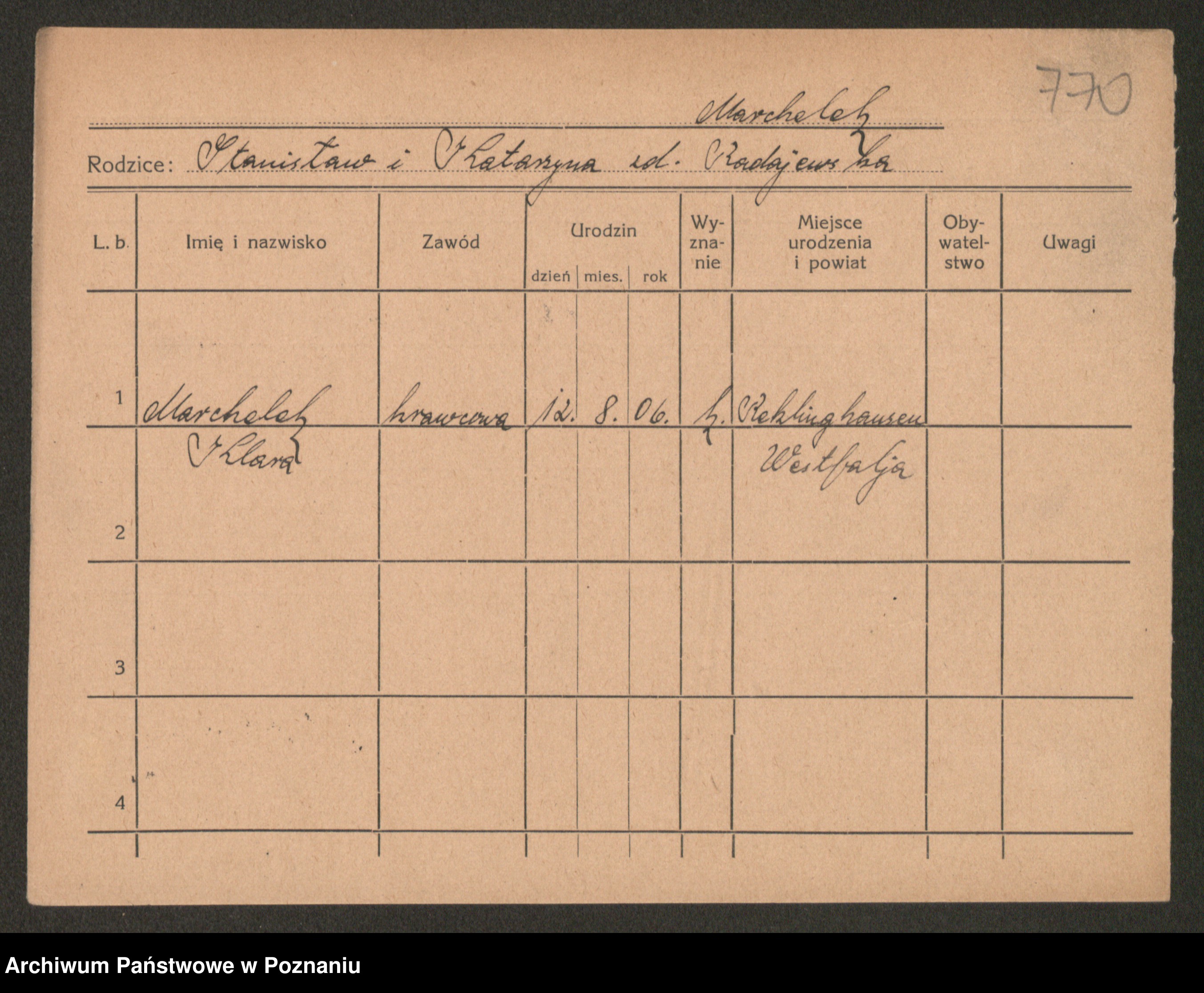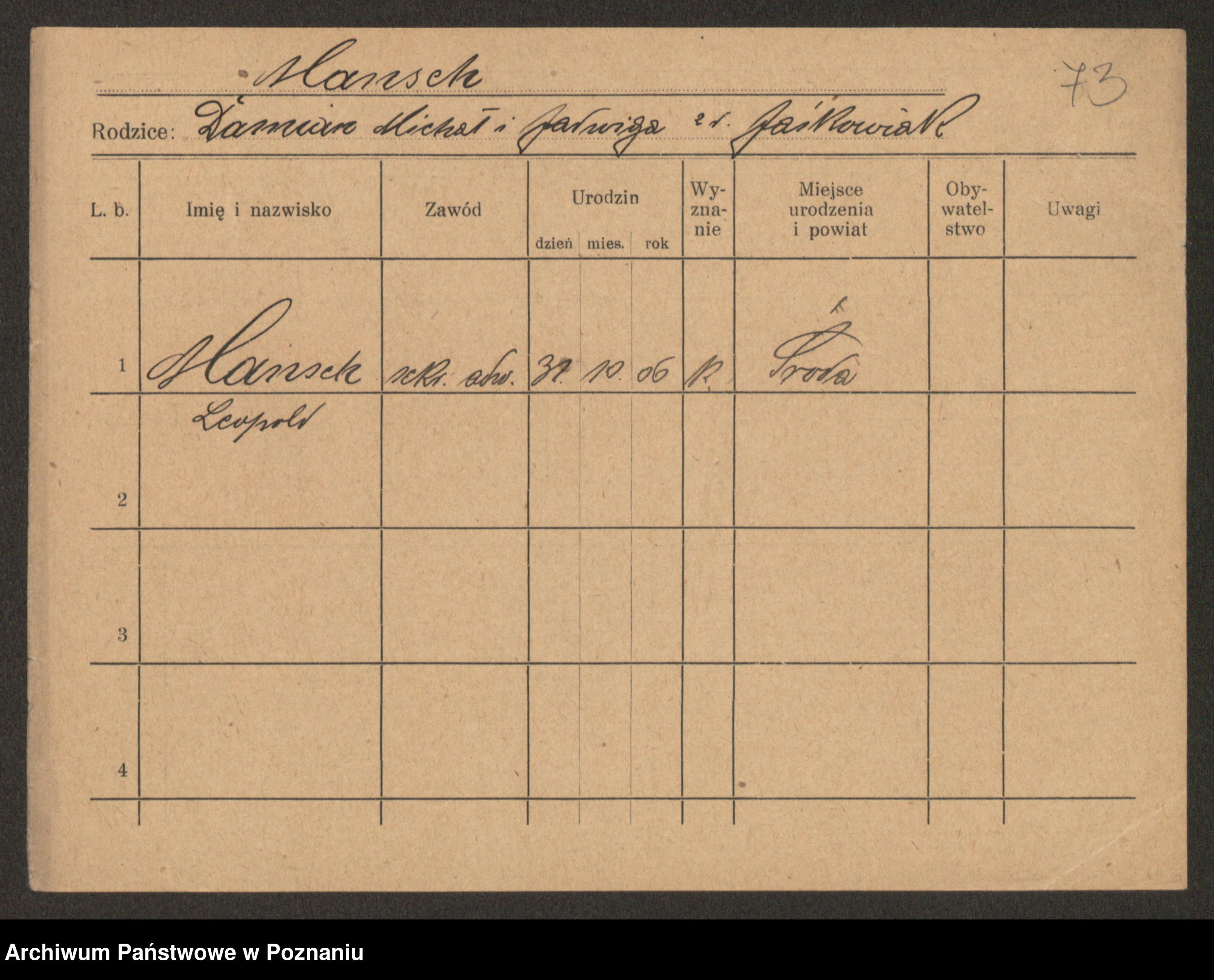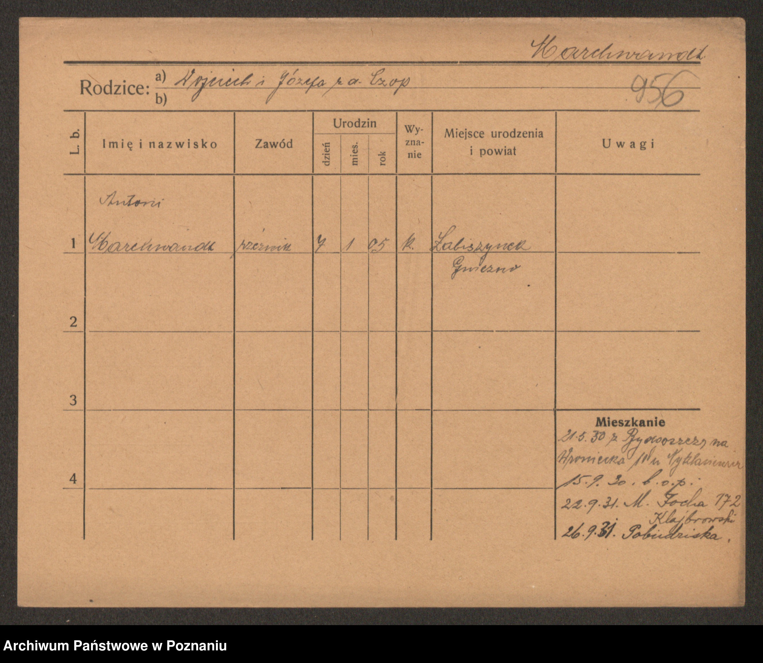 Podgląd karty osobowej dostępny jest po kliknięciu na nazwisko lub ikonkę karty. Można dokonywać powiększenia (ikony na górze) lub przechodzić między kolejnymi skanami (strzałki po bokach).