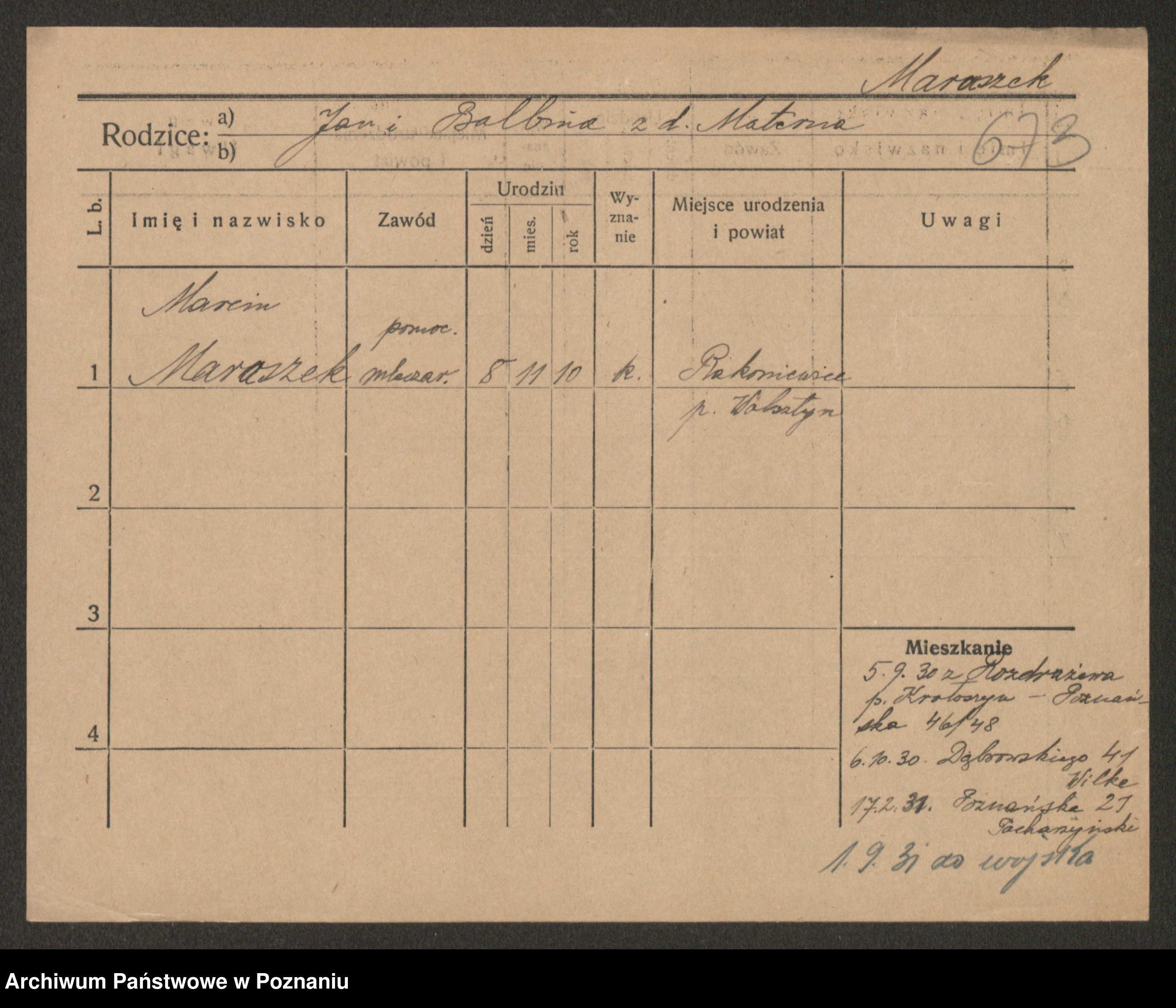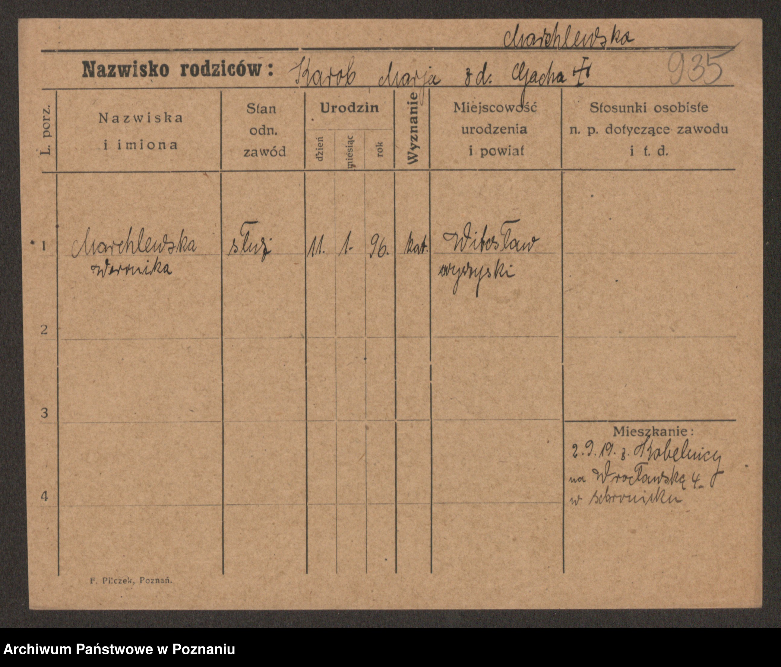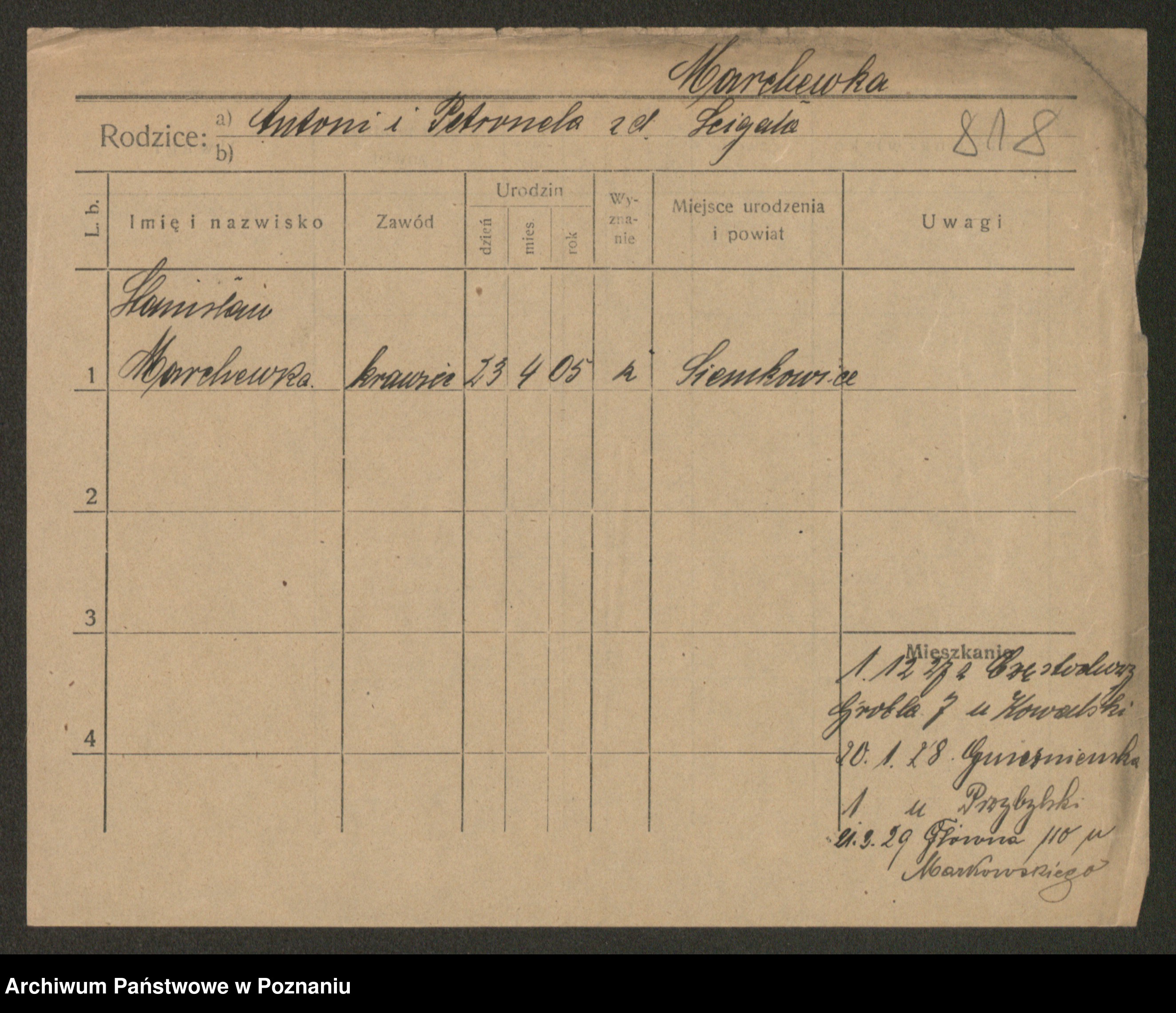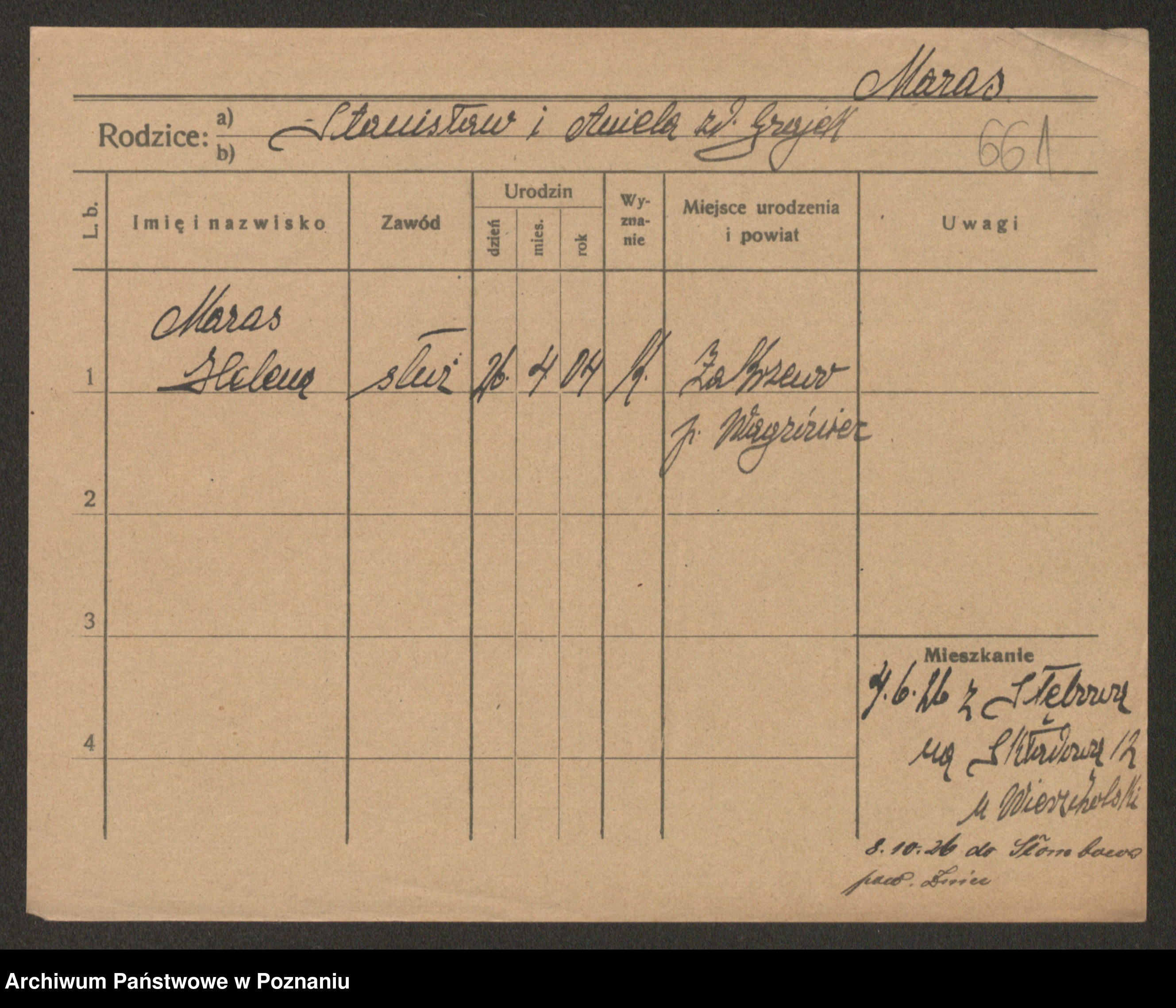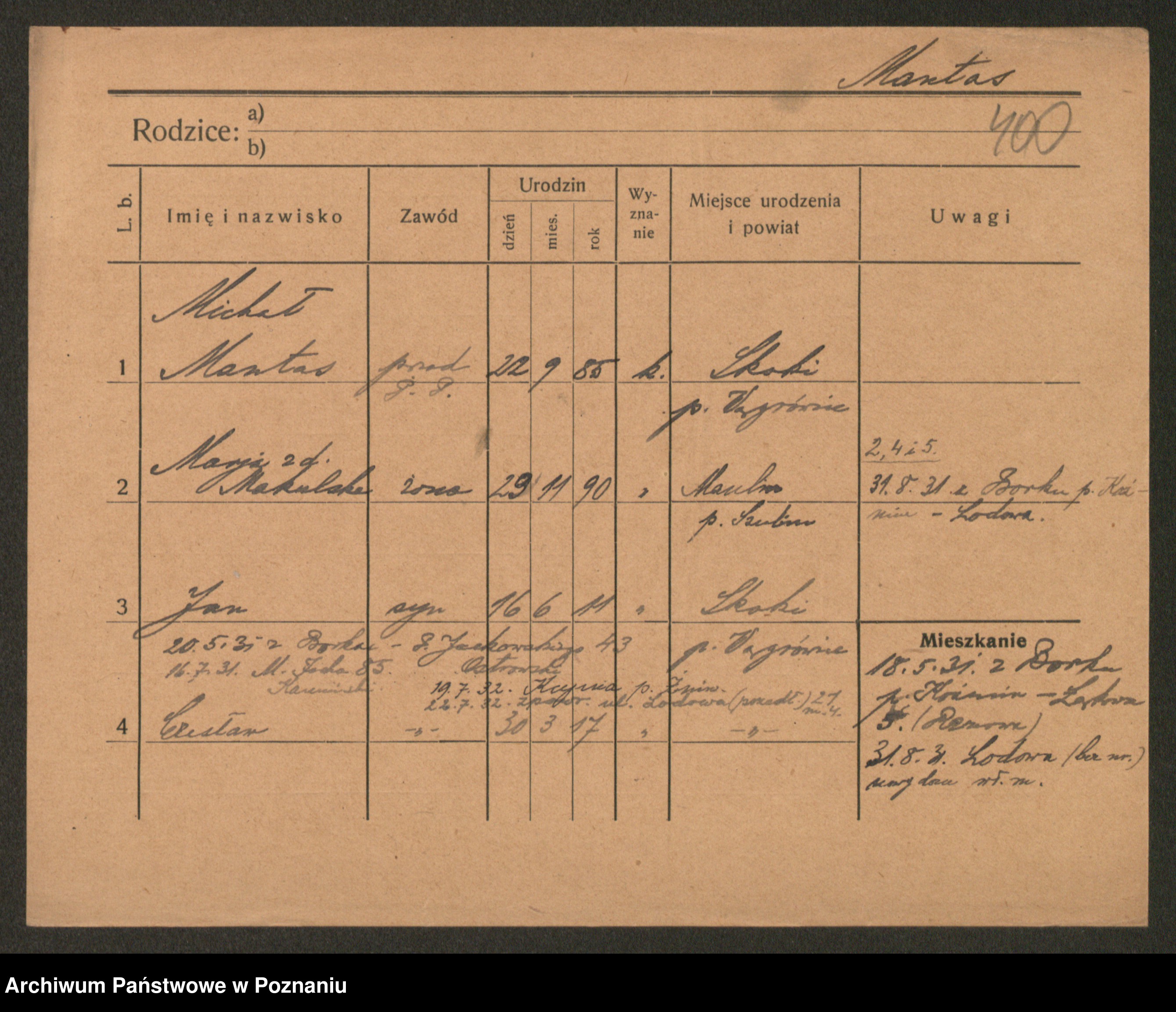 Podgląd karty osobowej dostępny jest po kliknięciu na nazwisko lub ikonkę karty. Można dokonywać powiększenia (ikony na górze) lub przechodzić między kolejnymi skanami (strzałki po bokach).