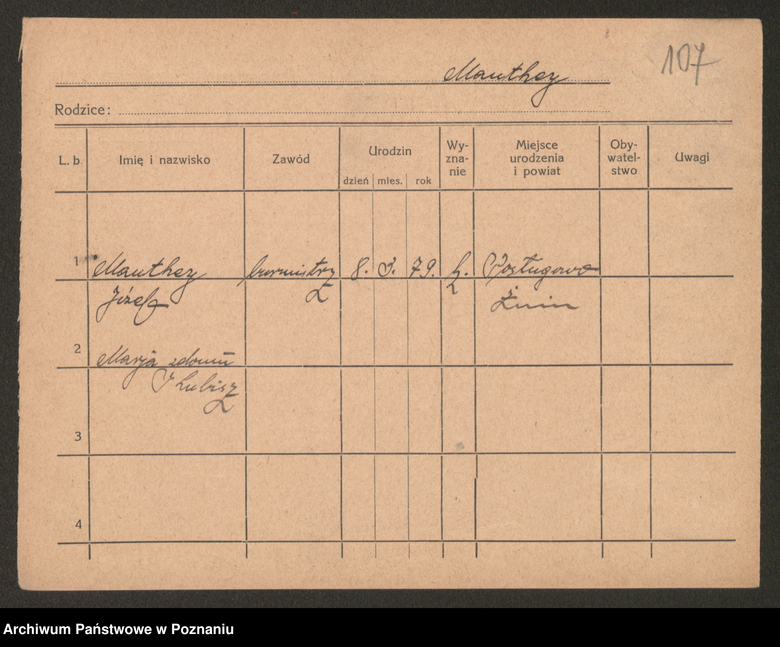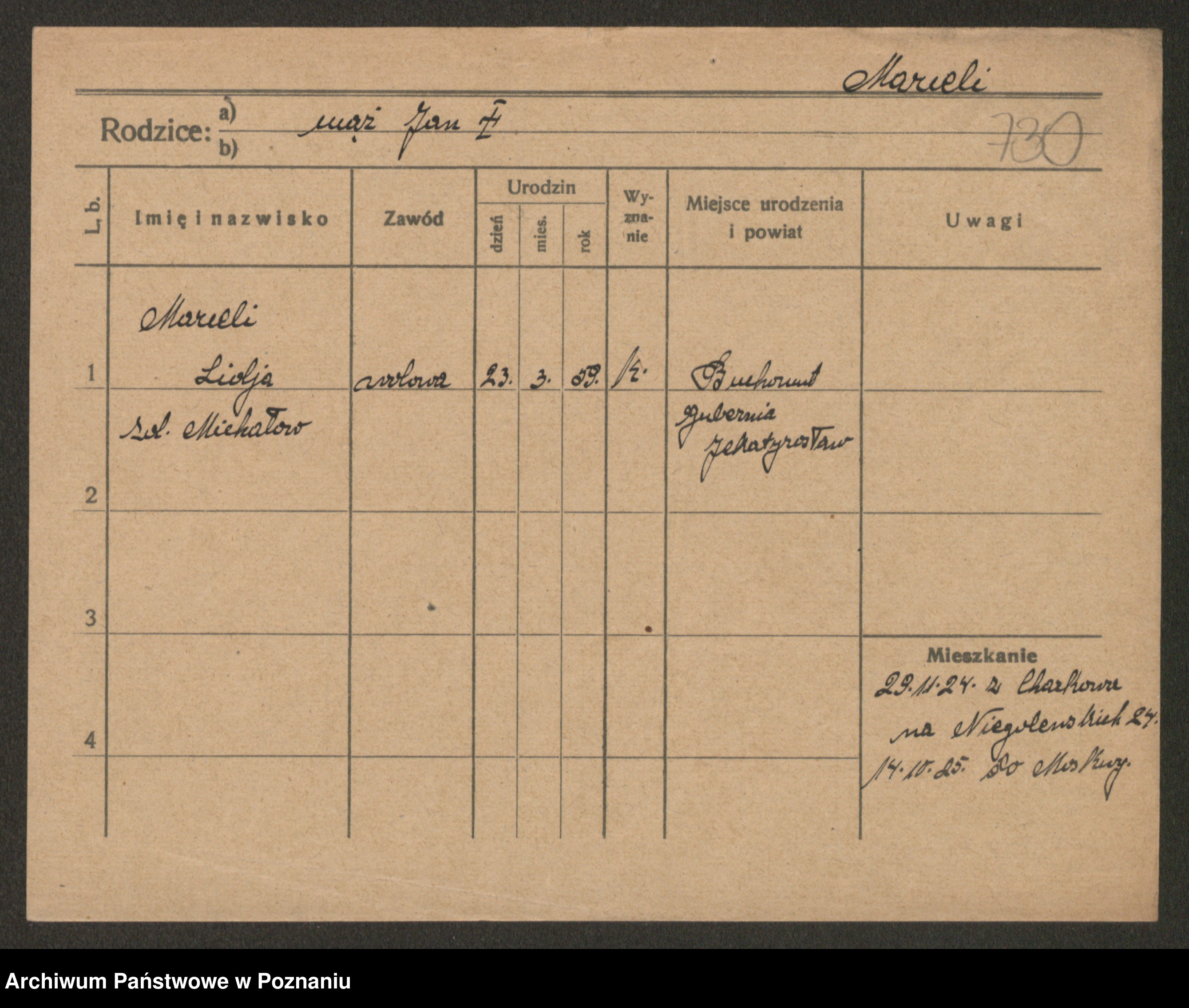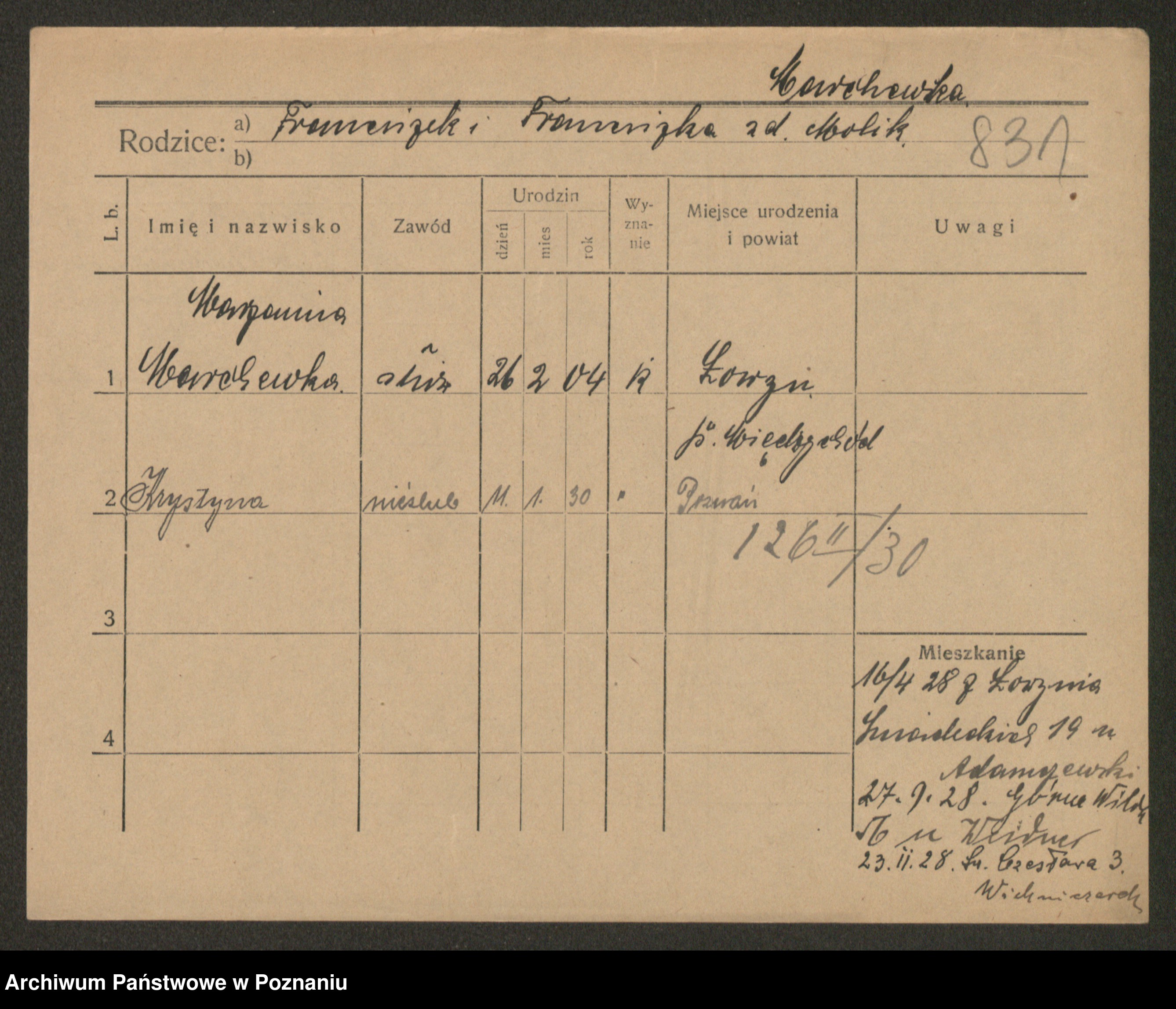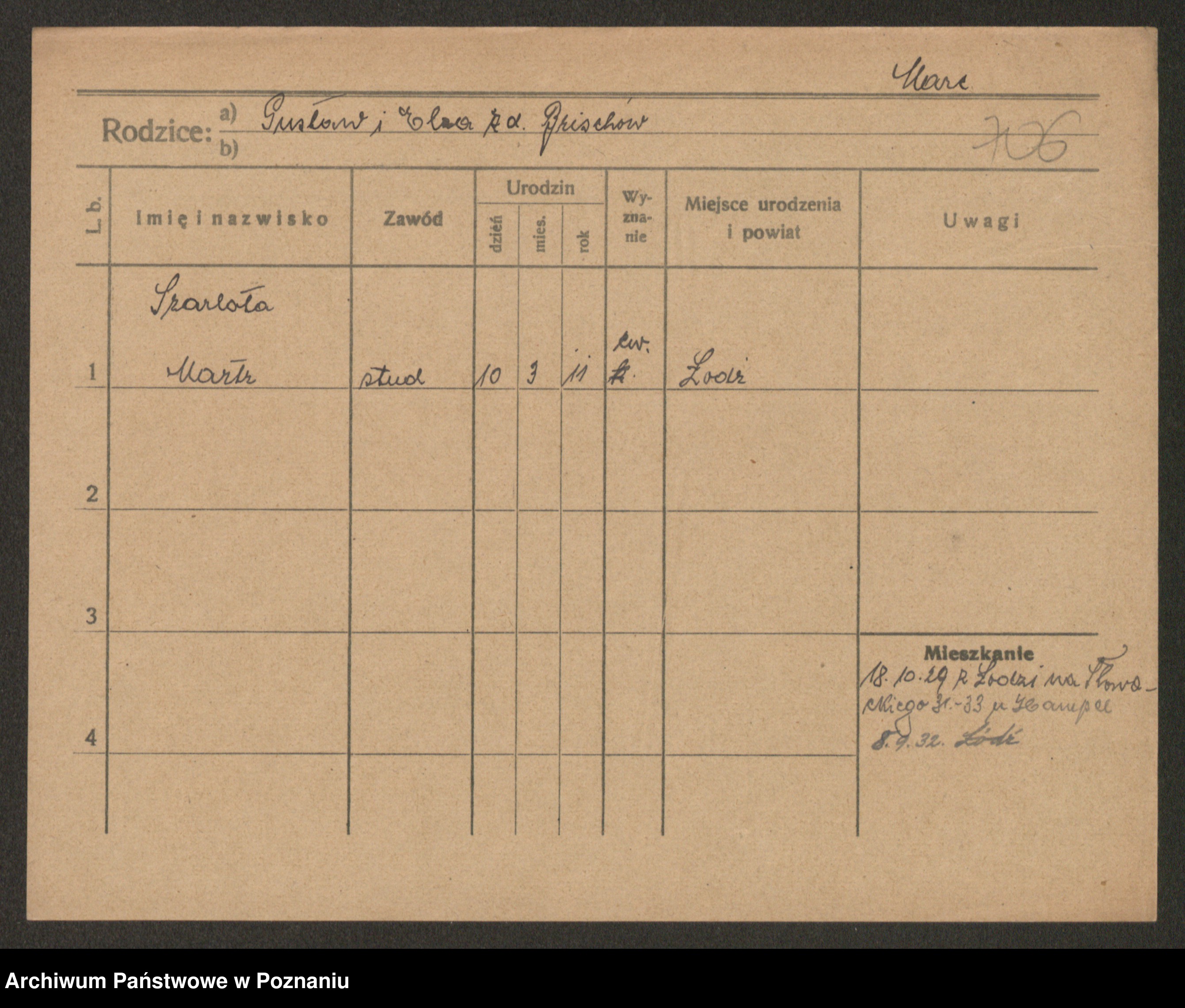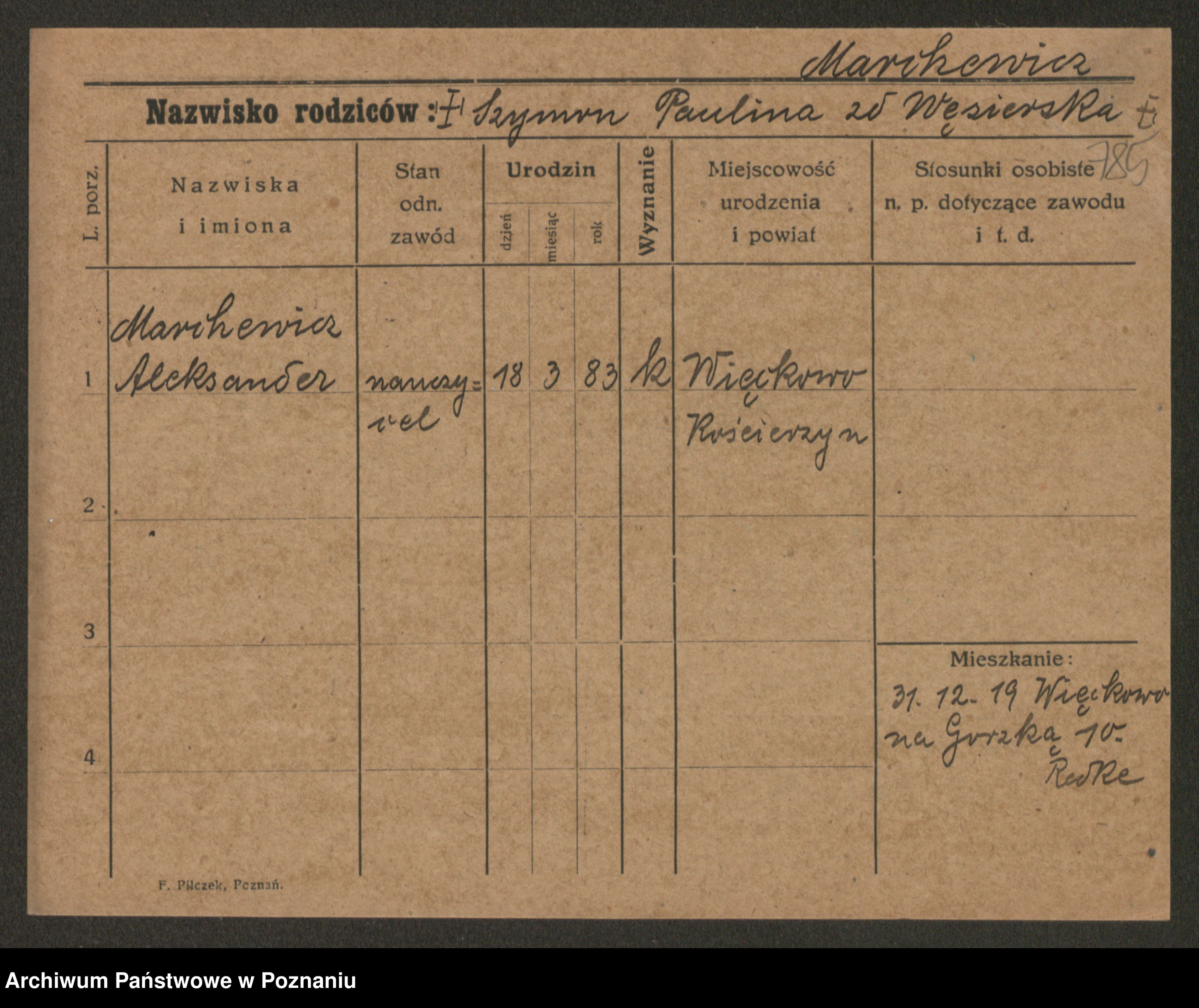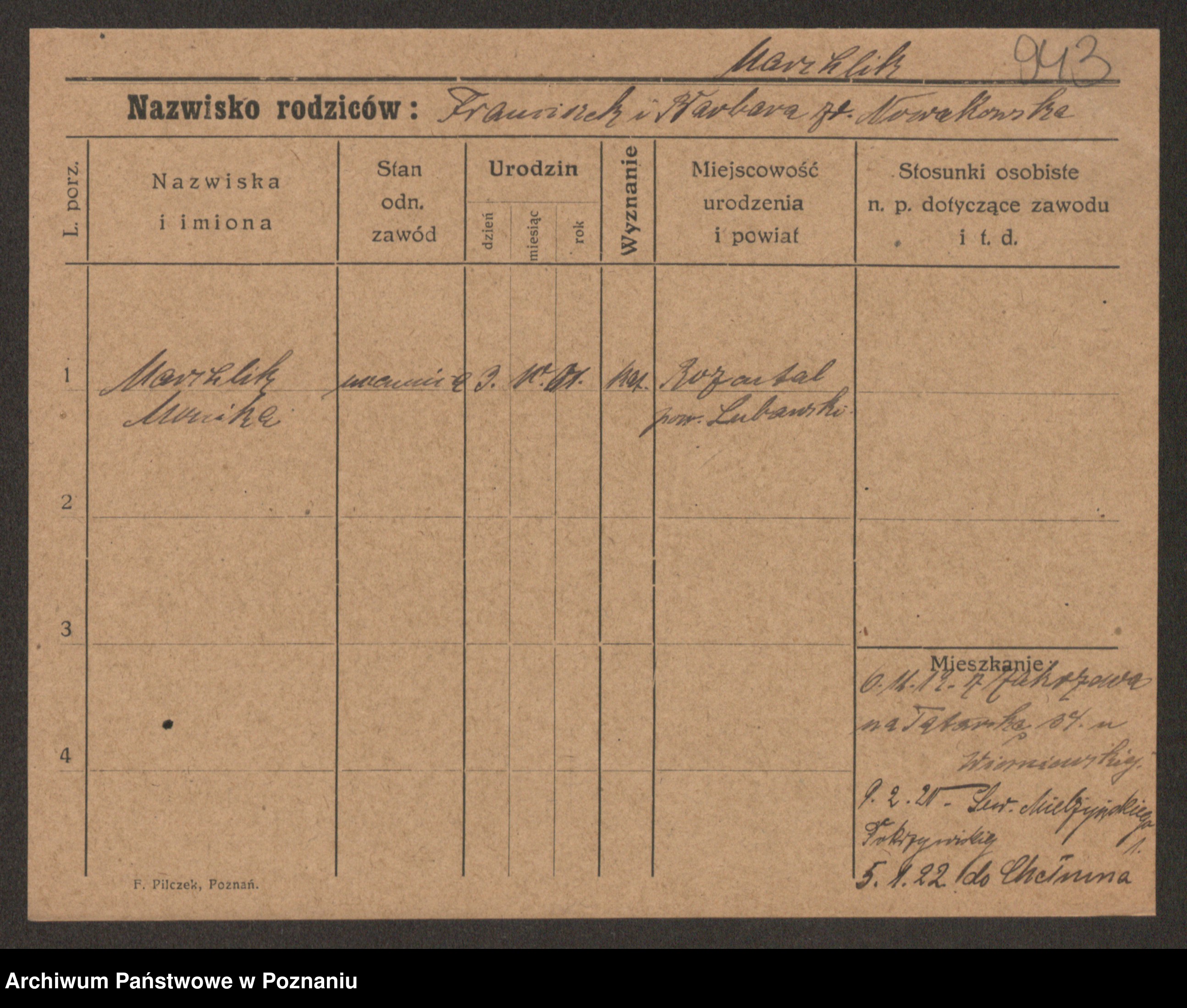 Podgląd karty osobowej dostępny jest po kliknięciu na nazwisko lub ikonkę karty. Można dokonywać powiększenia (ikony na górze) lub przechodzić między kolejnymi skanami (strzałki po bokach).