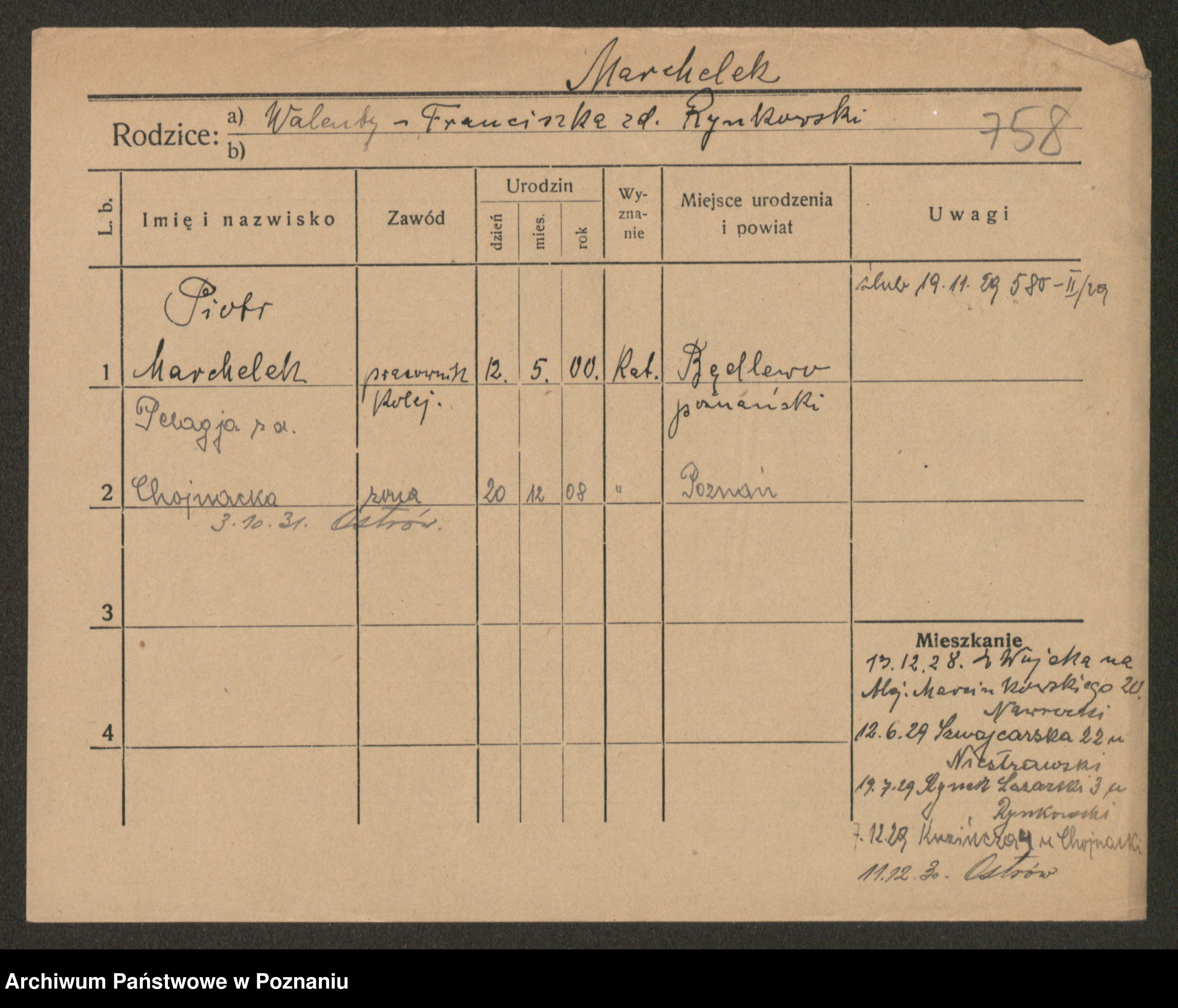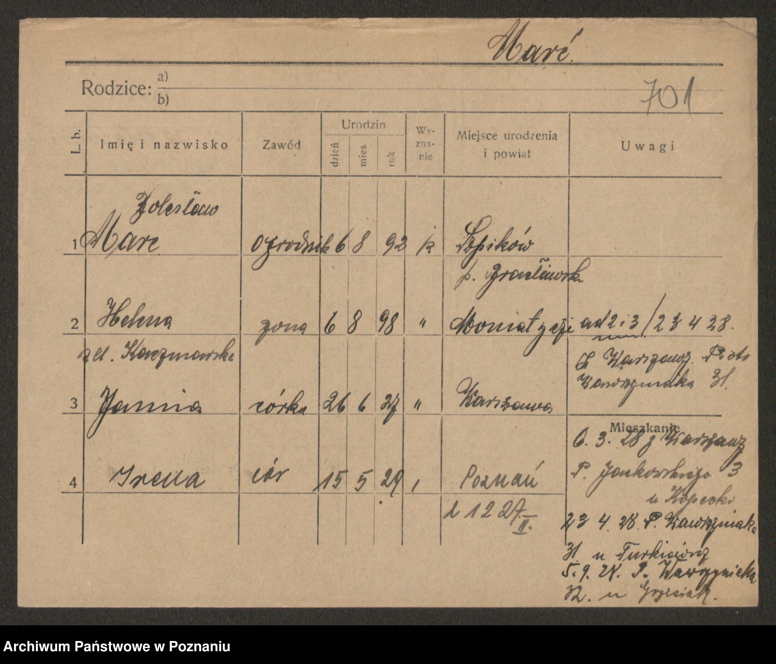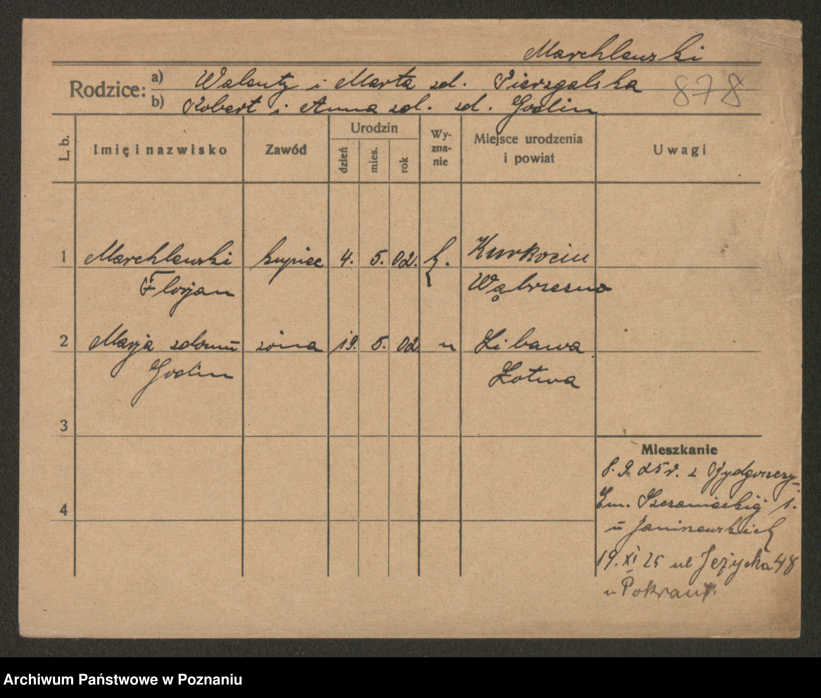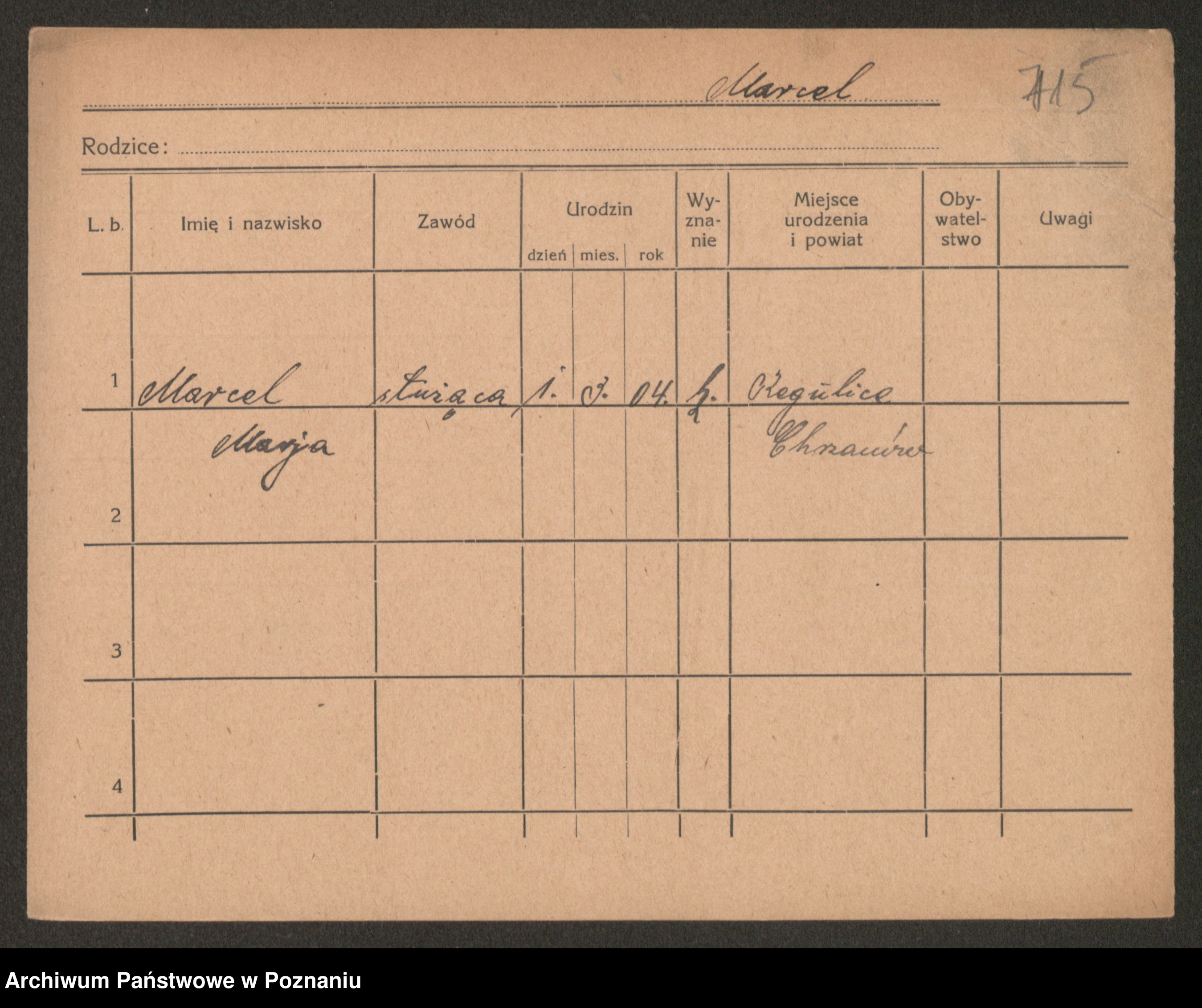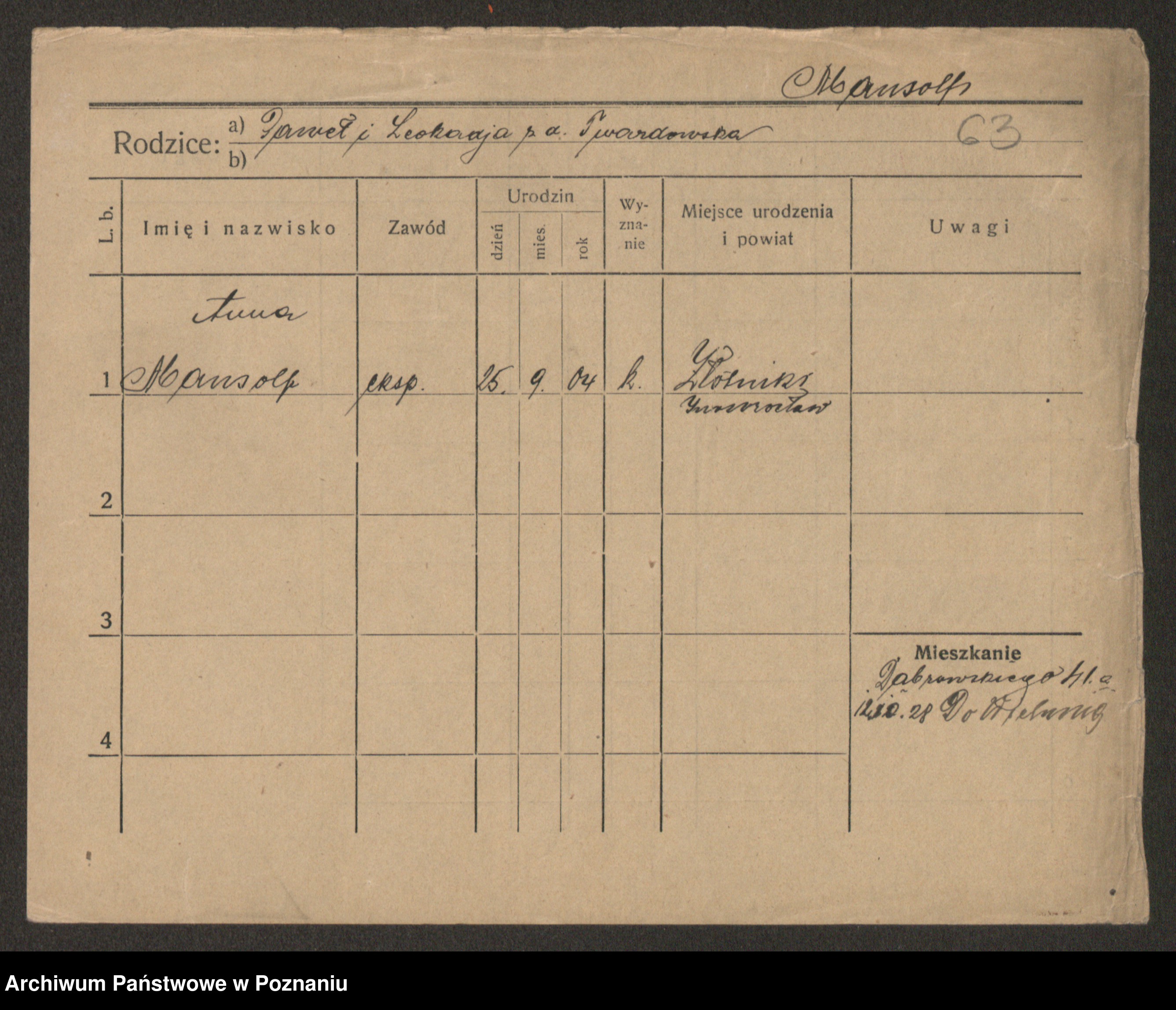 Podgląd karty osobowej dostępny jest po kliknięciu na nazwisko lub ikonkę karty. Można dokonywać powiększenia (ikony na górze) lub przechodzić między kolejnymi skanami (strzałki po bokach).