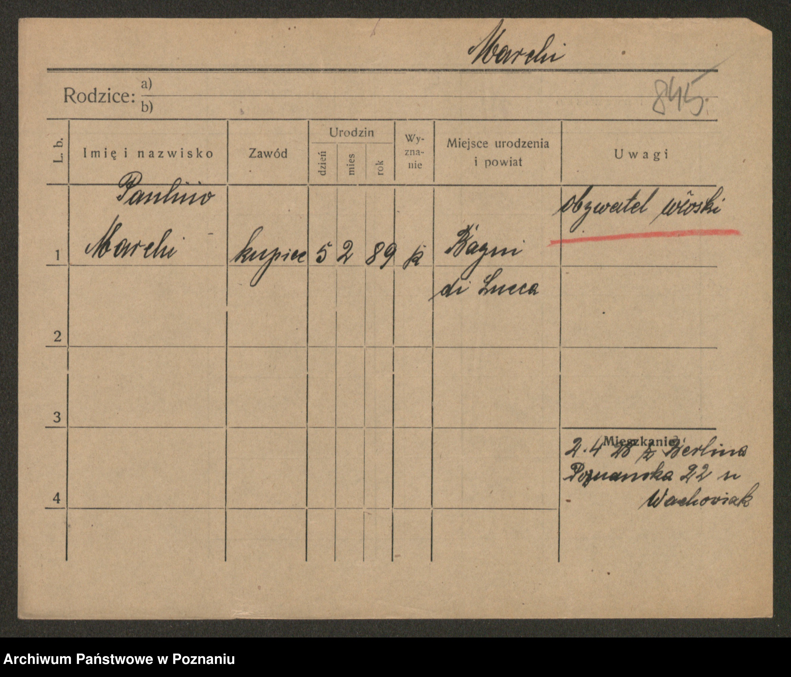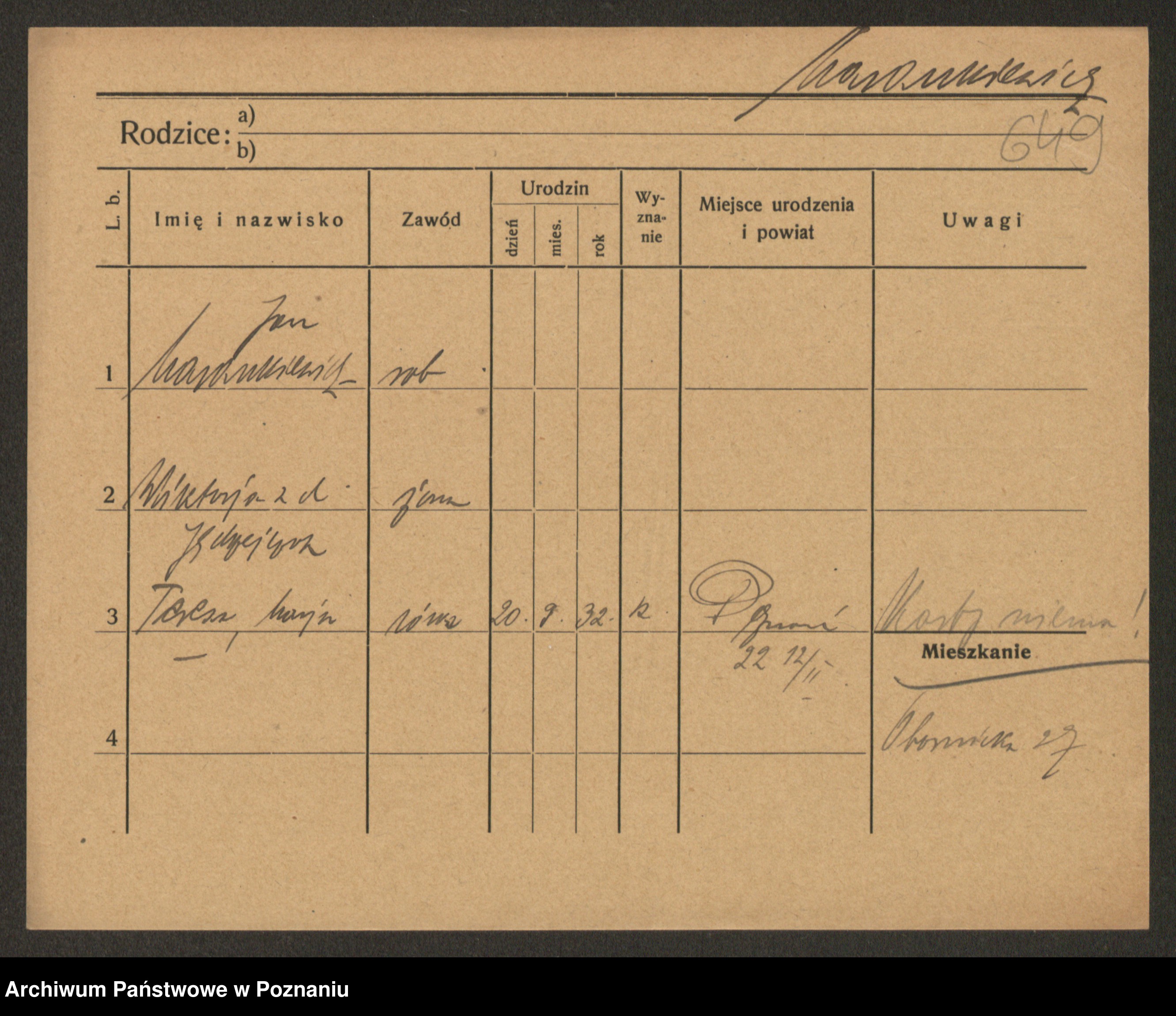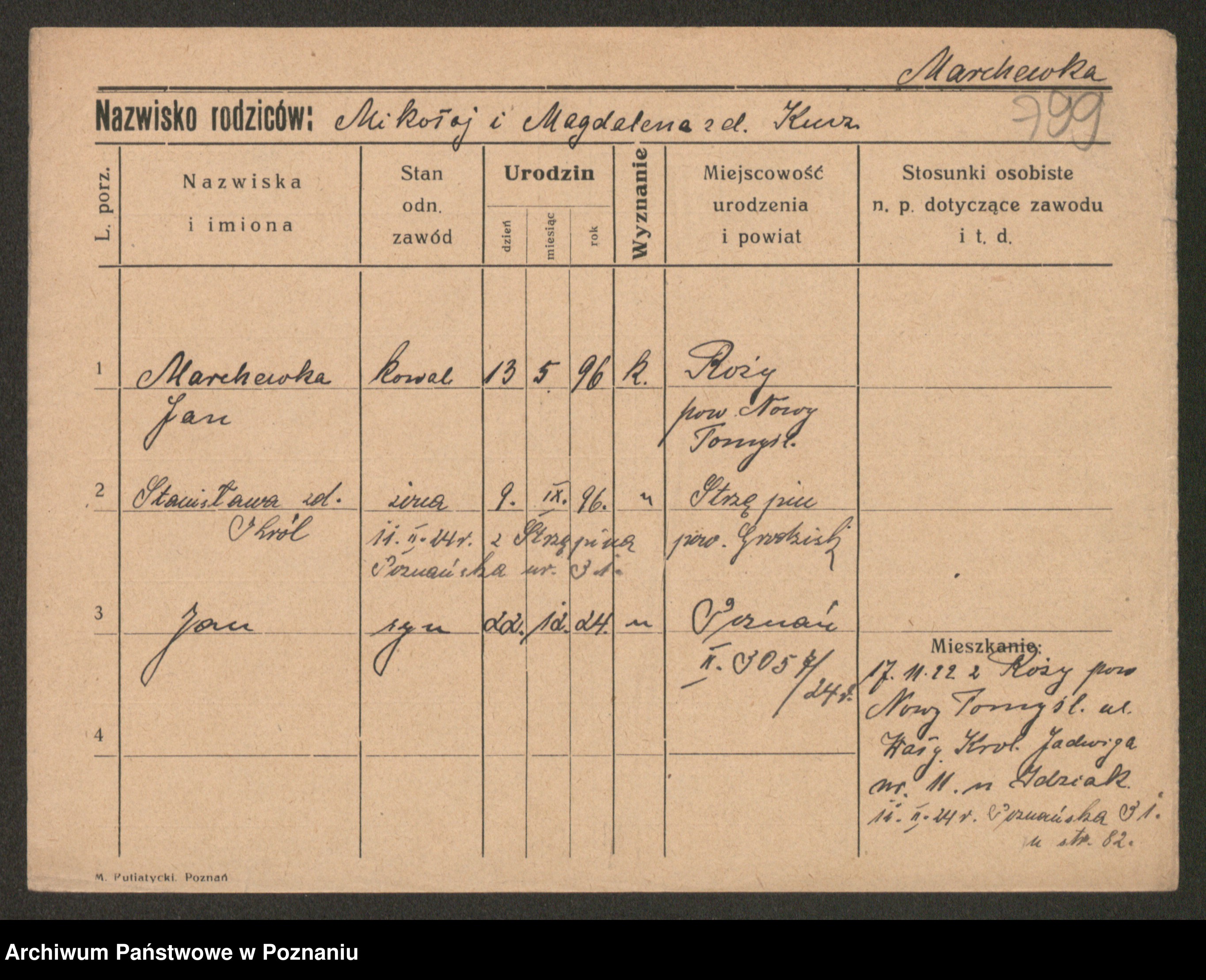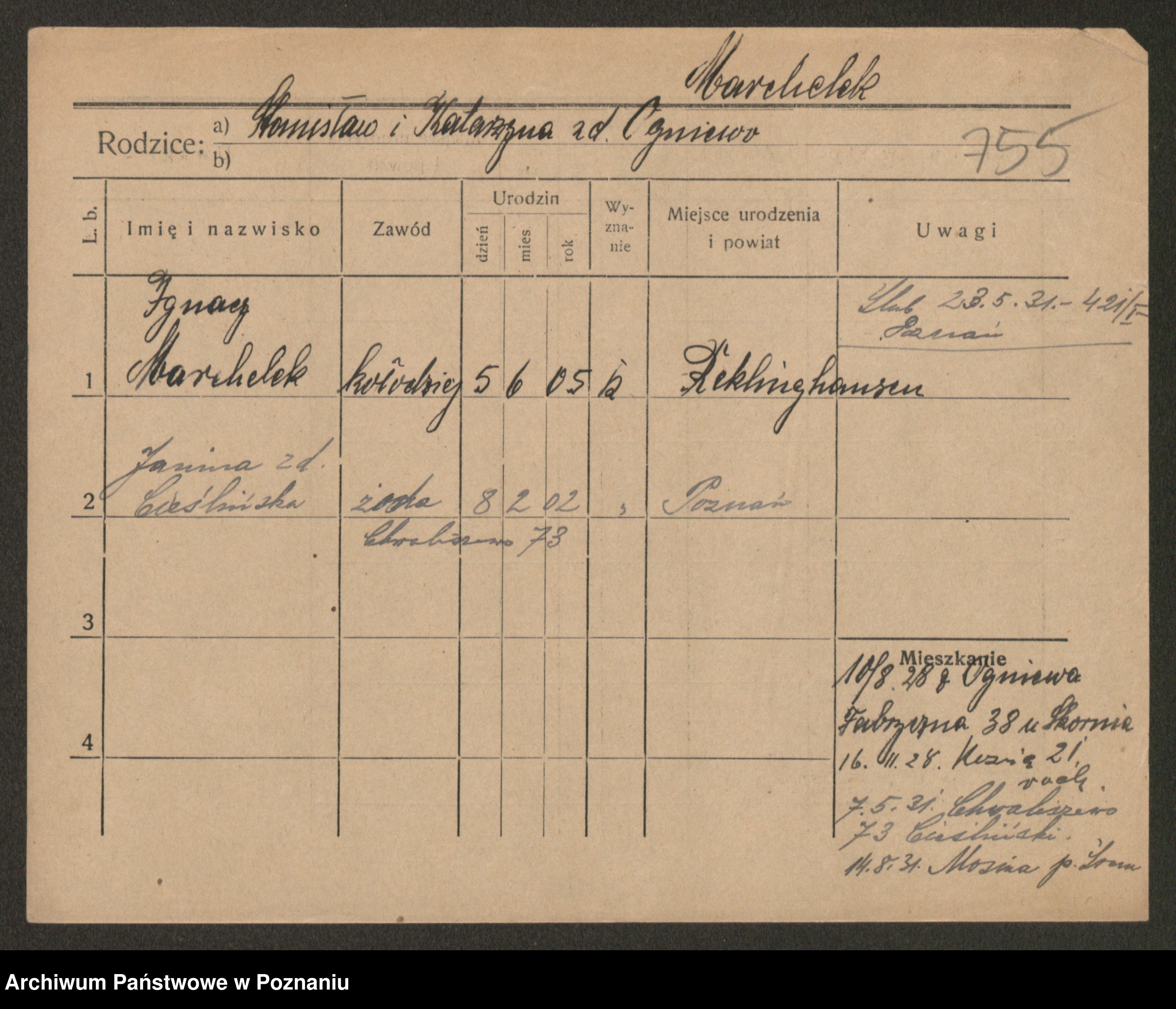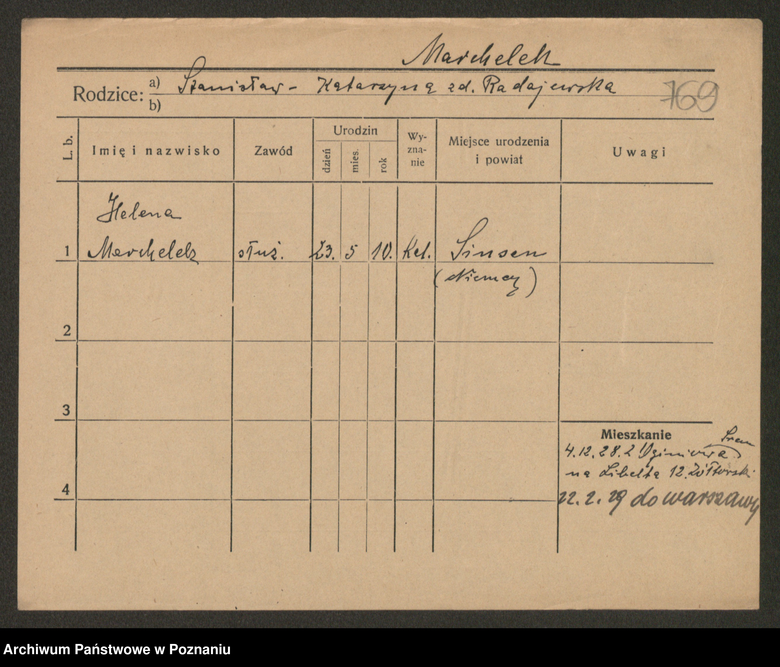 Podgląd karty osobowej dostępny jest po kliknięciu na nazwisko lub ikonkę karty. Można dokonywać powiększenia (ikony na górze) lub przechodzić między kolejnymi skanami (strzałki po bokach).