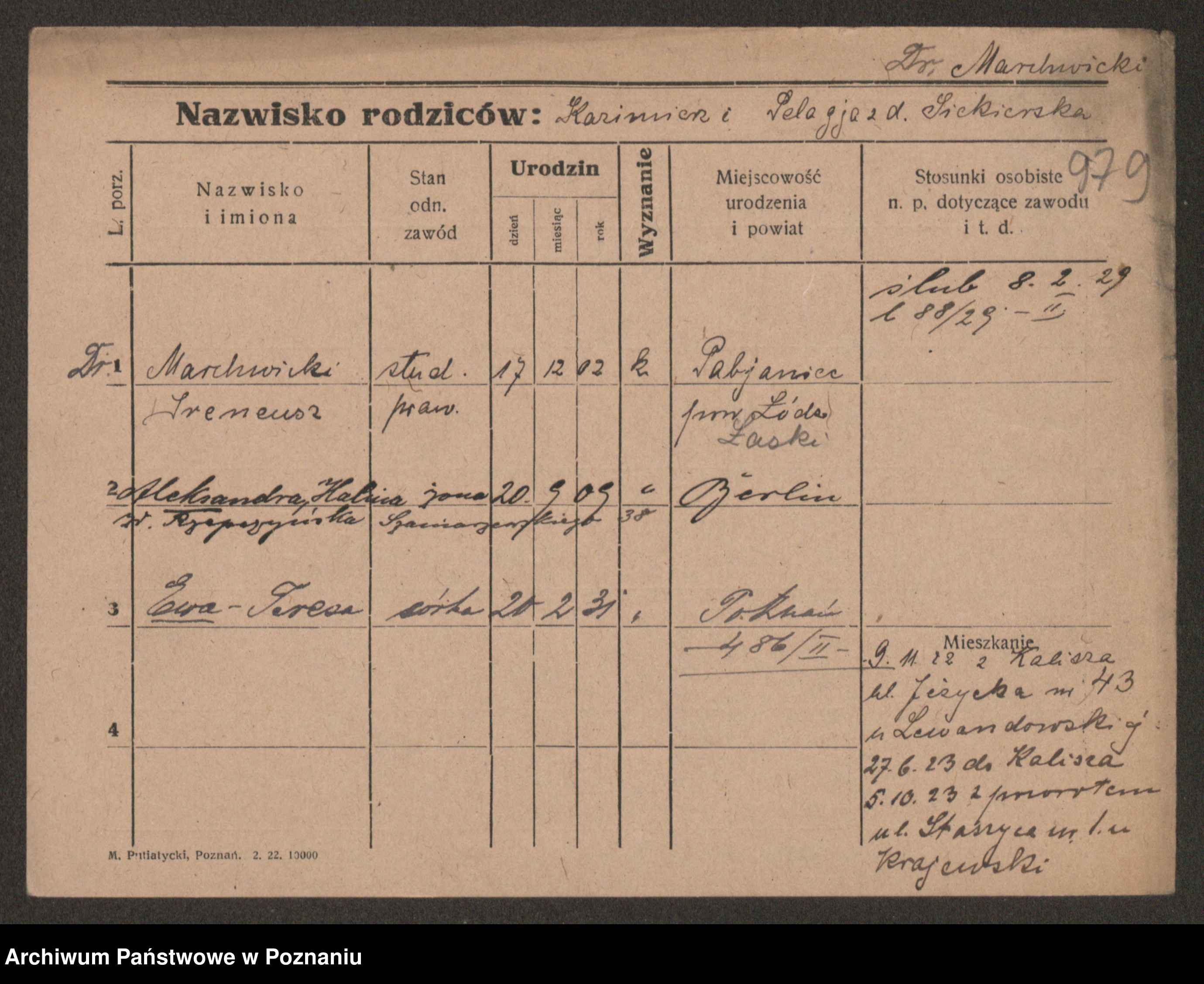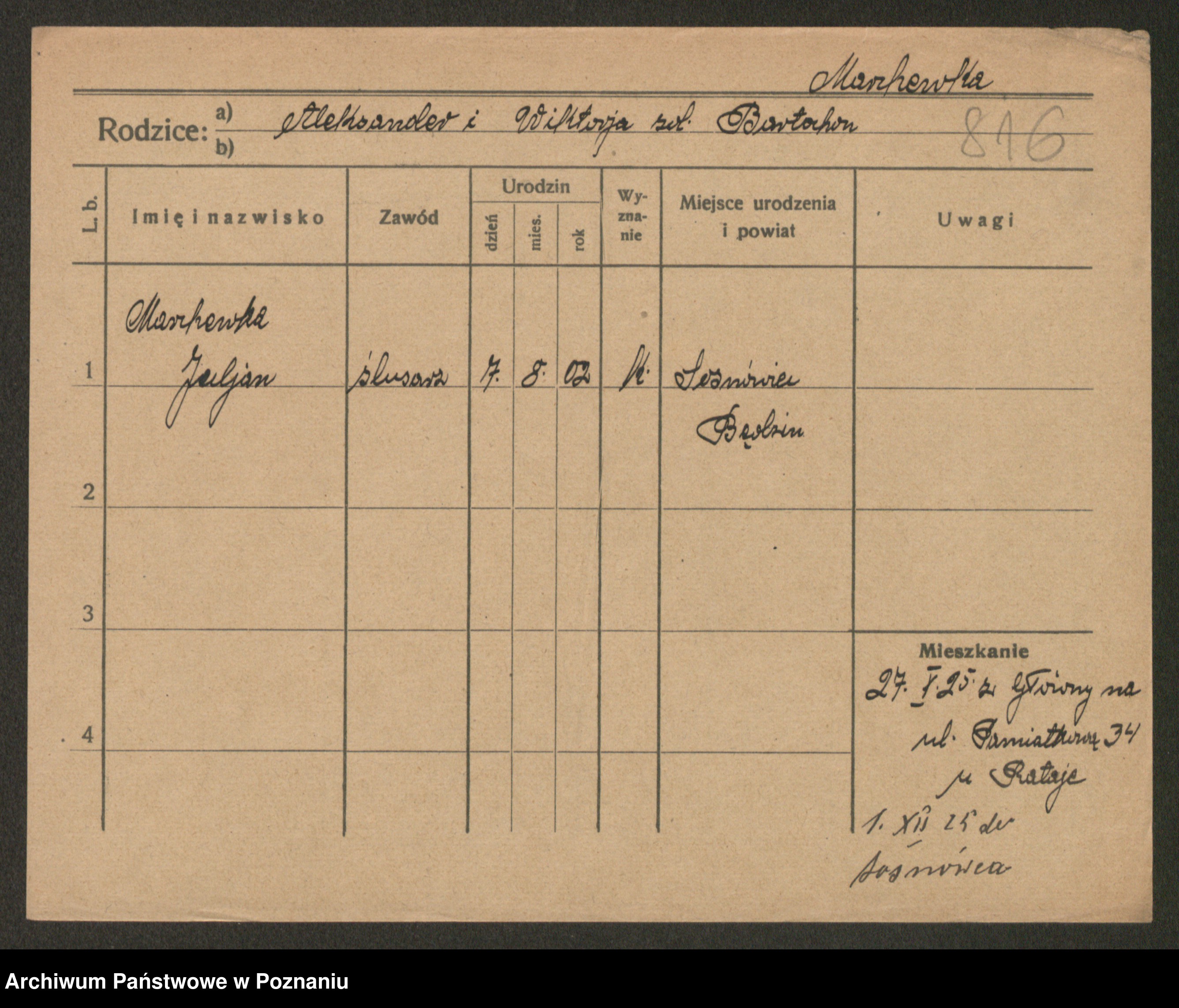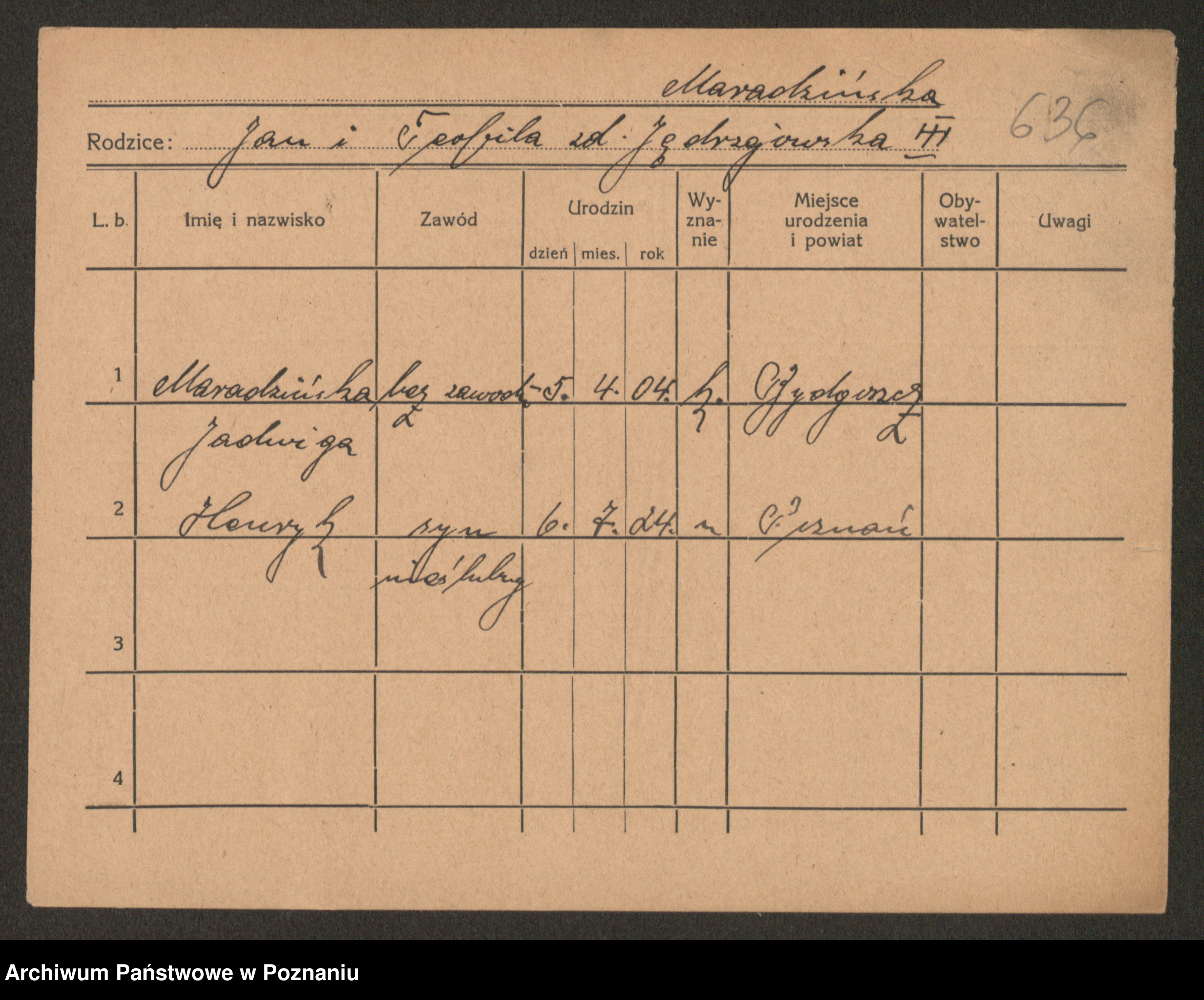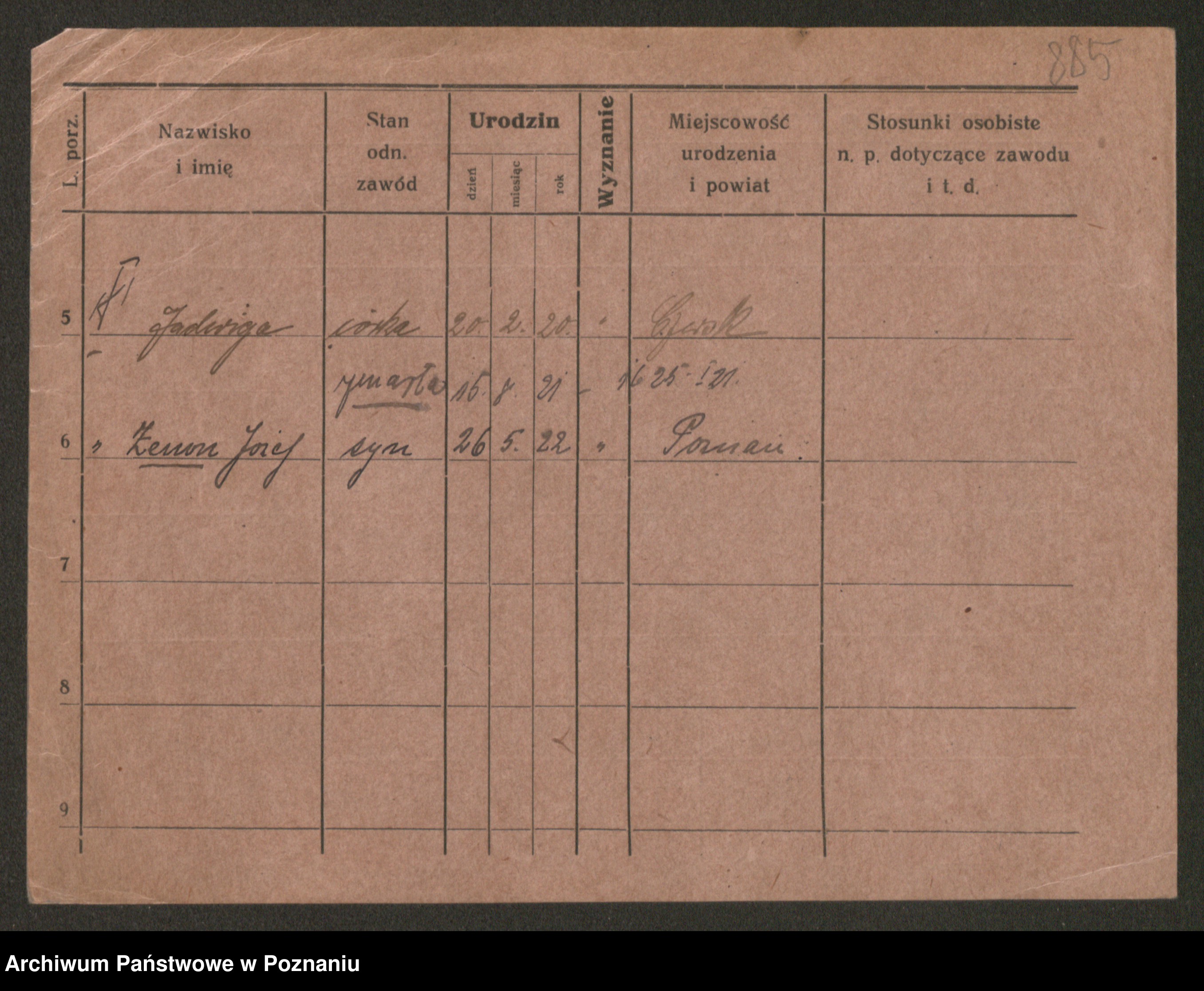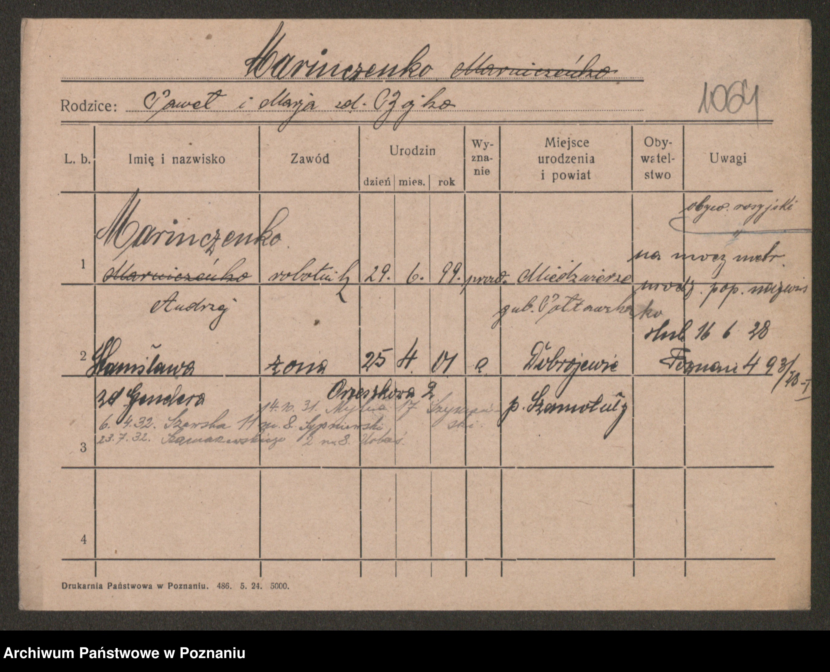Podgląd karty osobowej dostępny jest po kliknięciu na nazwisko lub ikonkę karty. Można dokonywać powiększenia (ikony na górze) lub przechodzić między kolejnymi skanami (strzałki po bokach).