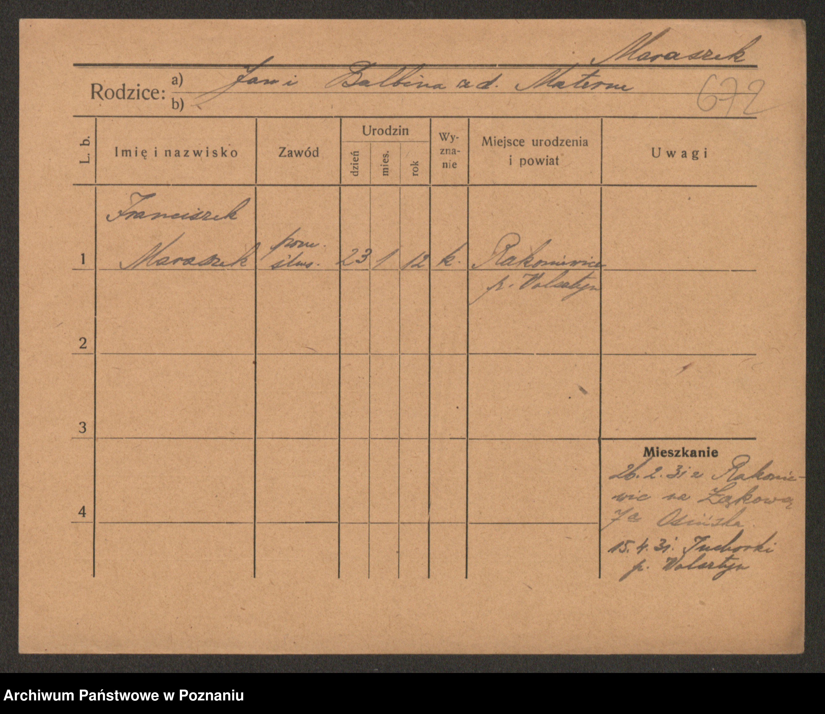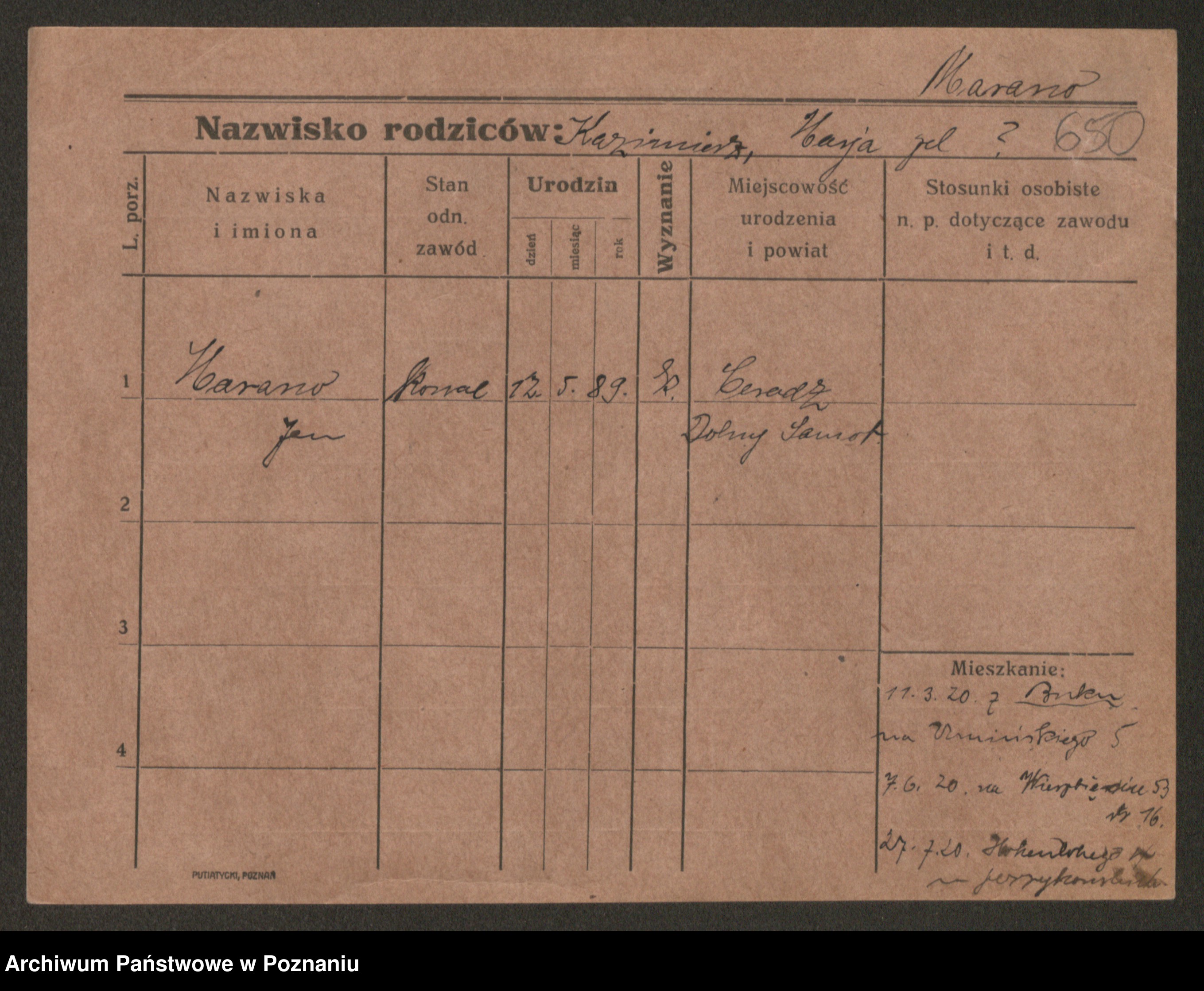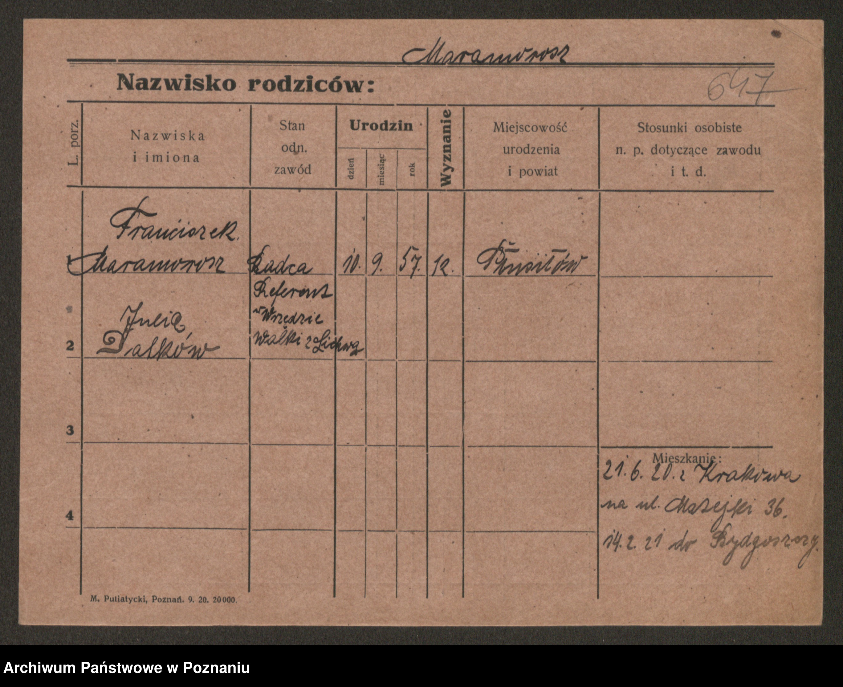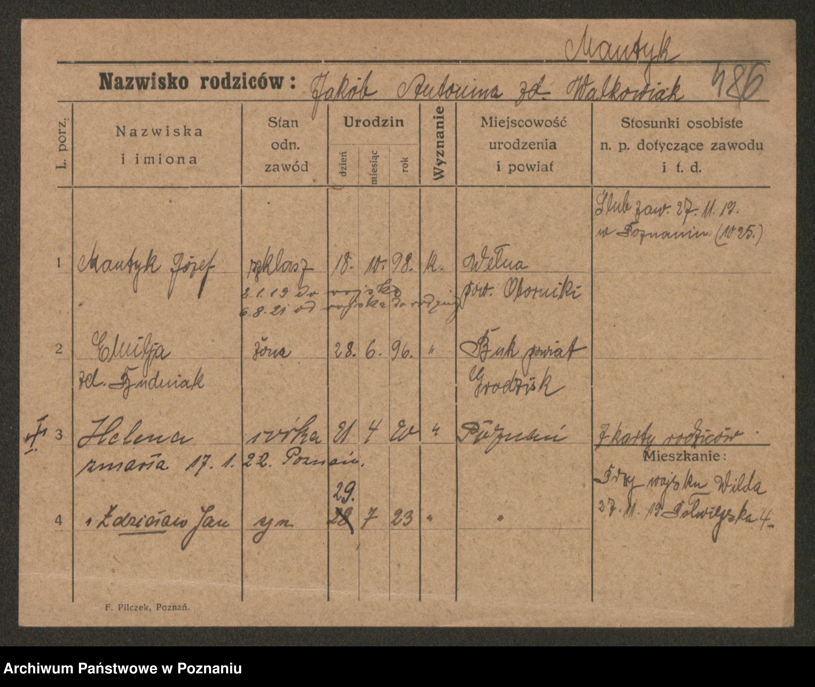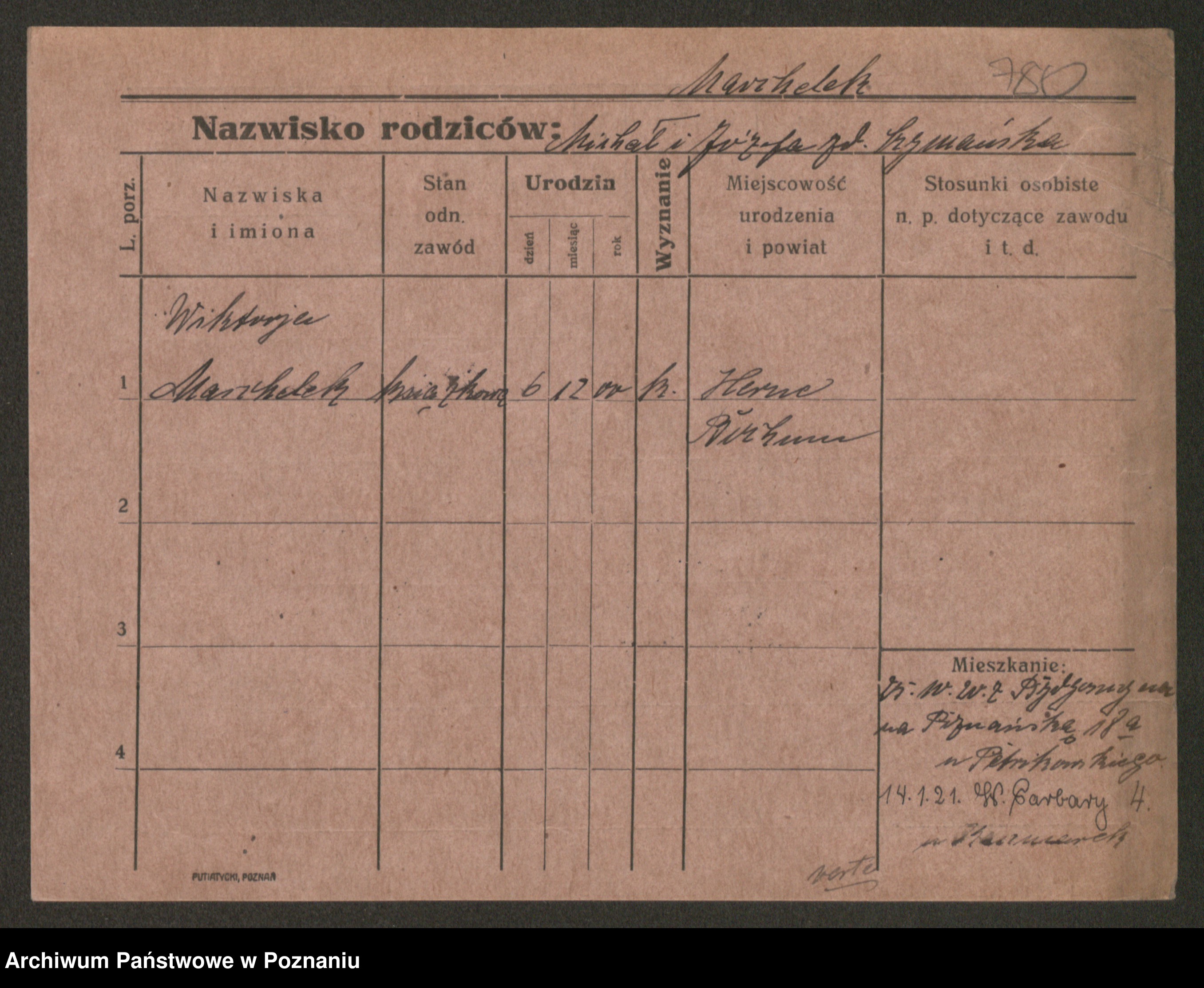 Podgląd karty osobowej dostępny jest po kliknięciu na nazwisko lub ikonkę karty. Można dokonywać powiększenia (ikony na górze) lub przechodzić między kolejnymi skanami (strzałki po bokach).