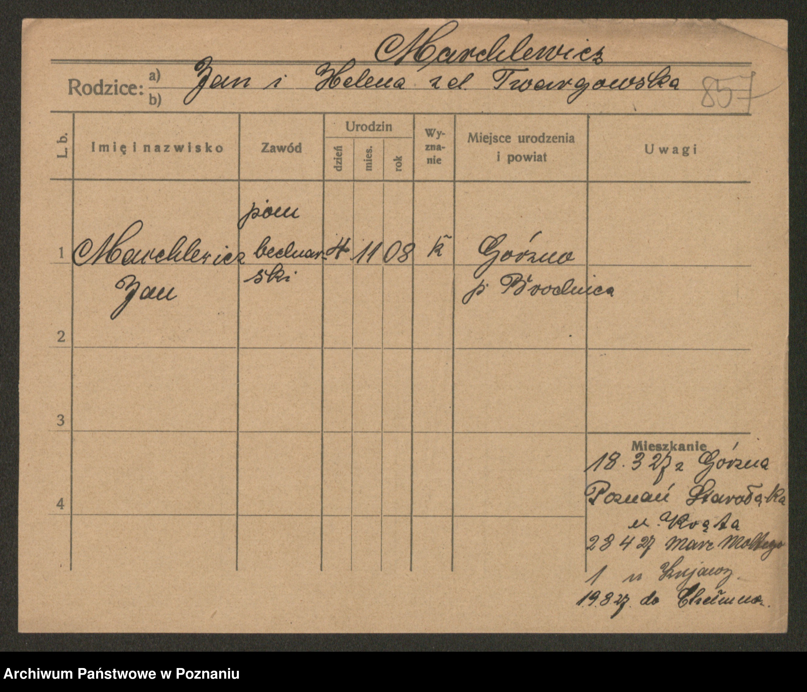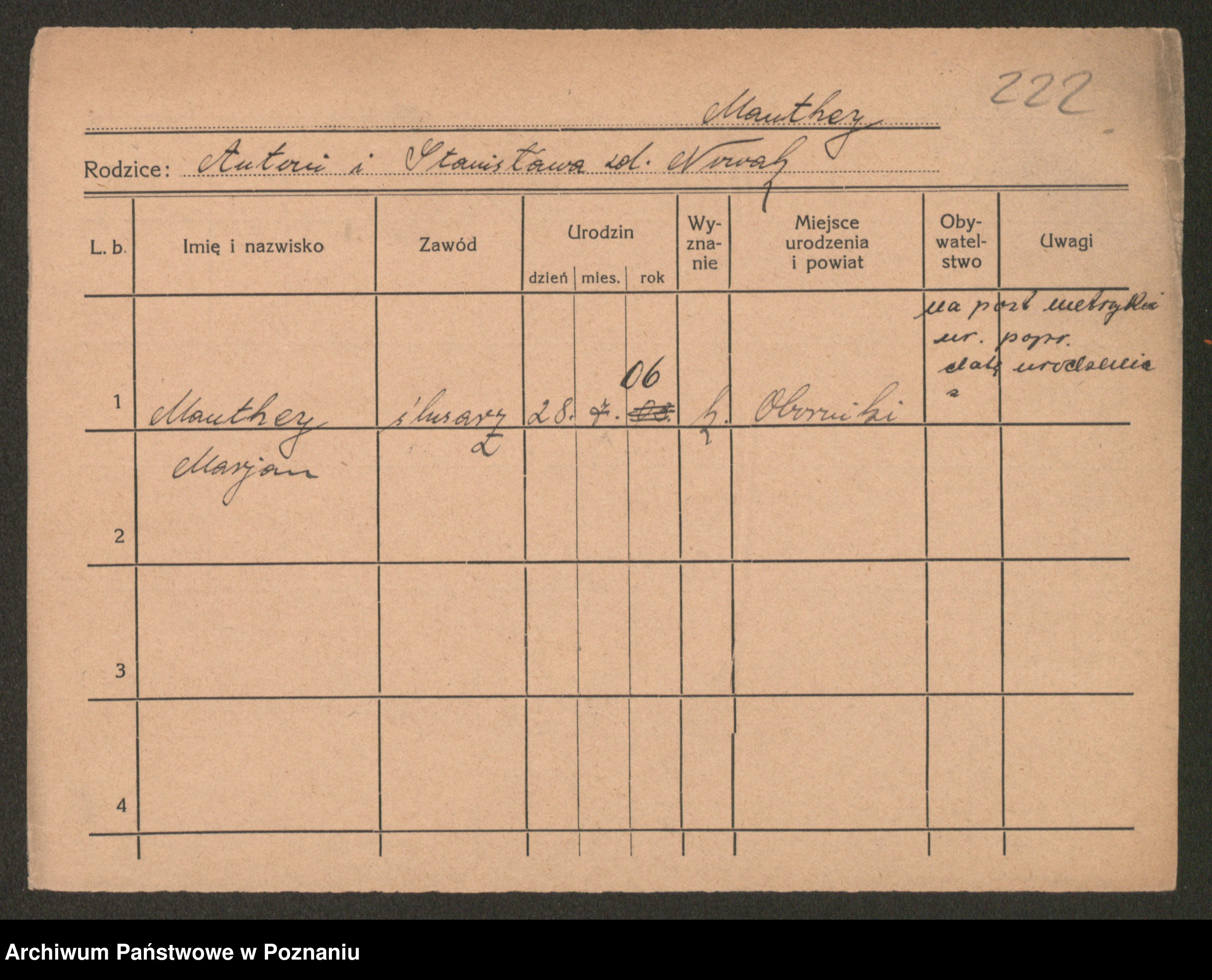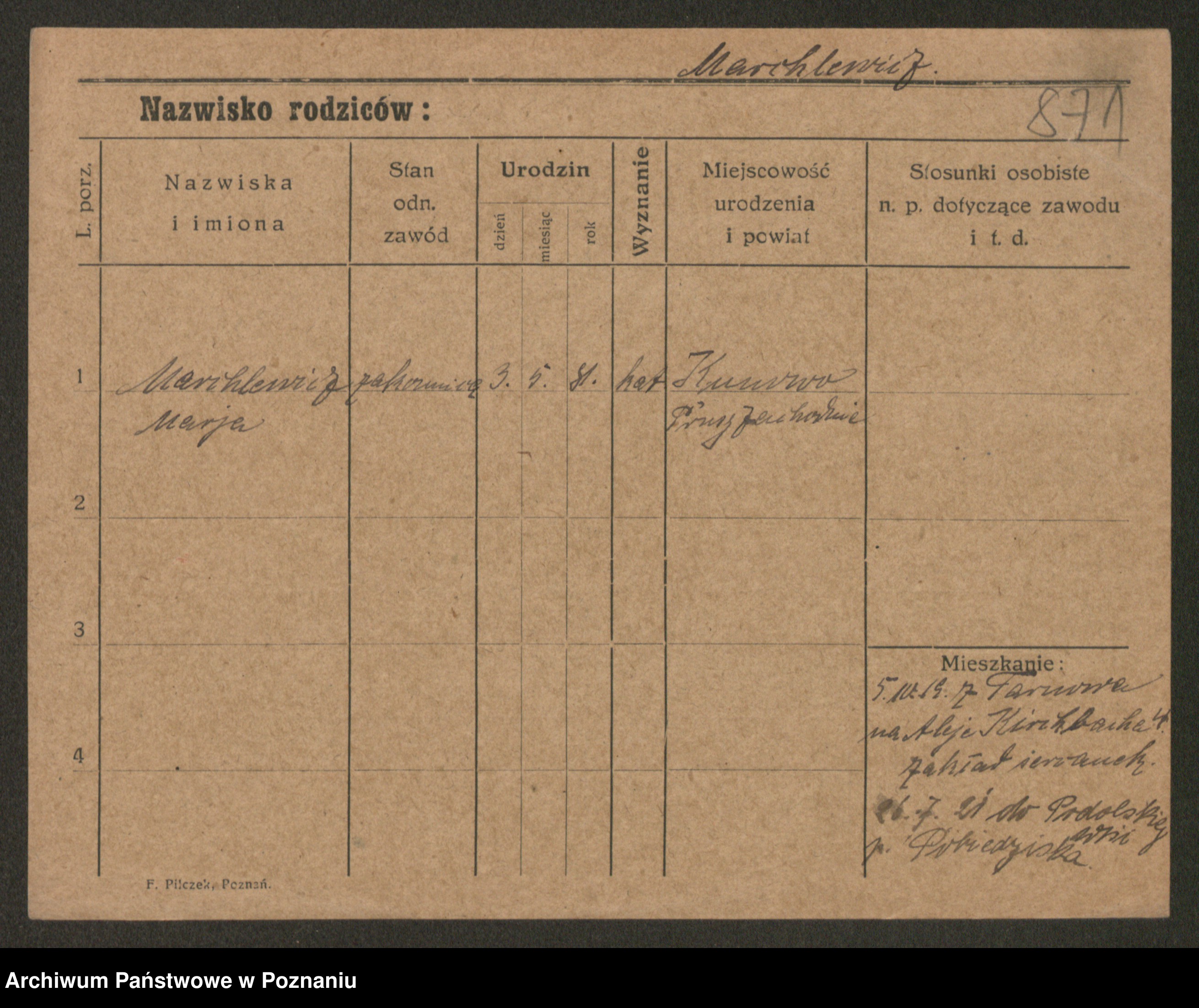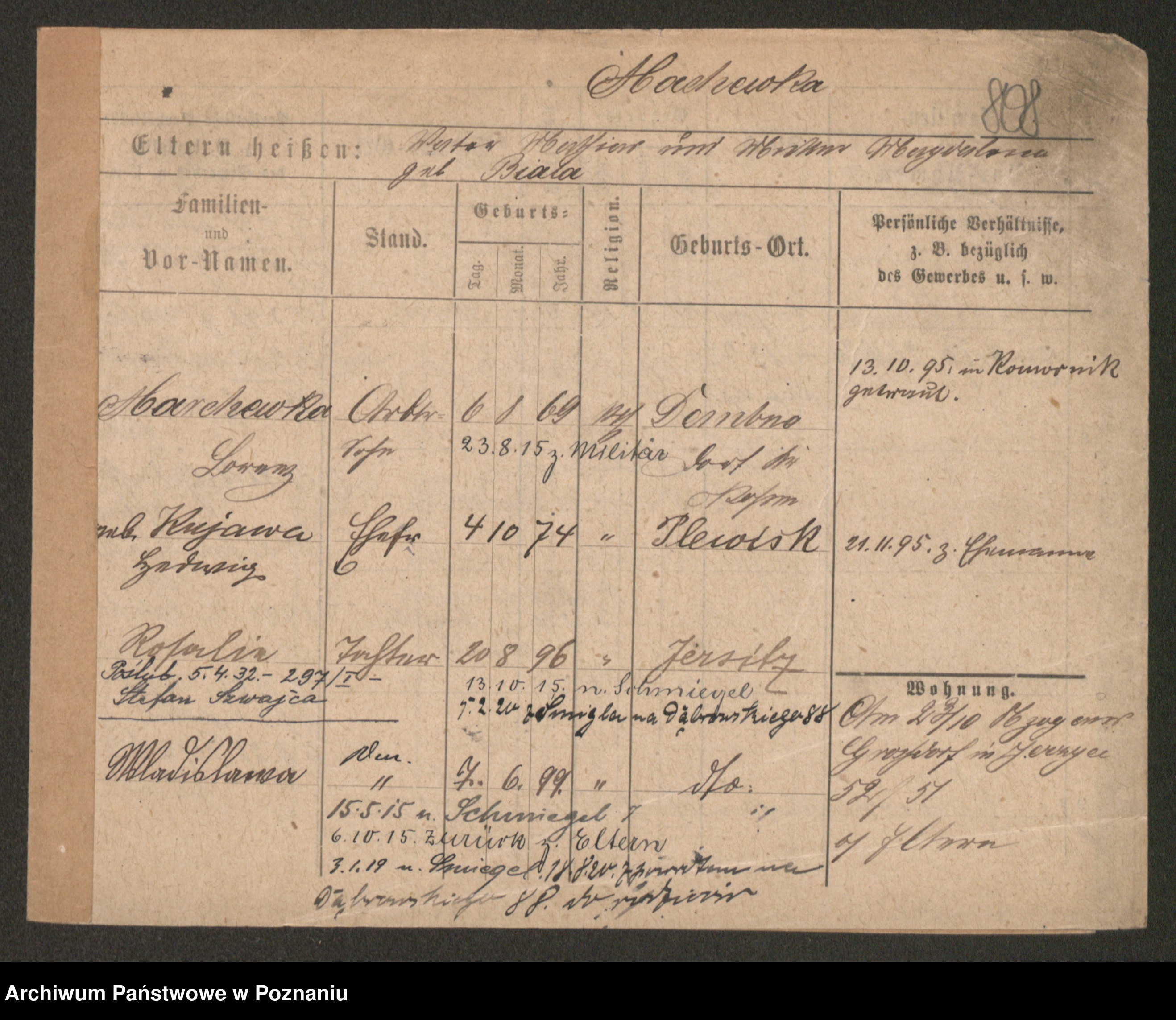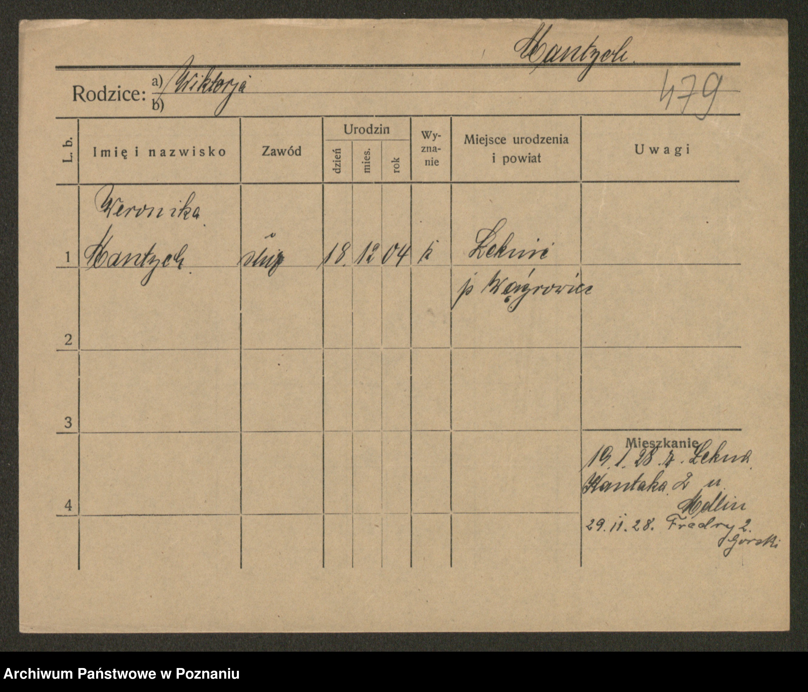 Podgląd karty osobowej dostępny jest po kliknięciu na nazwisko lub ikonkę karty. Można dokonywać powiększenia (ikony na górze) lub przechodzić między kolejnymi skanami (strzałki po bokach).