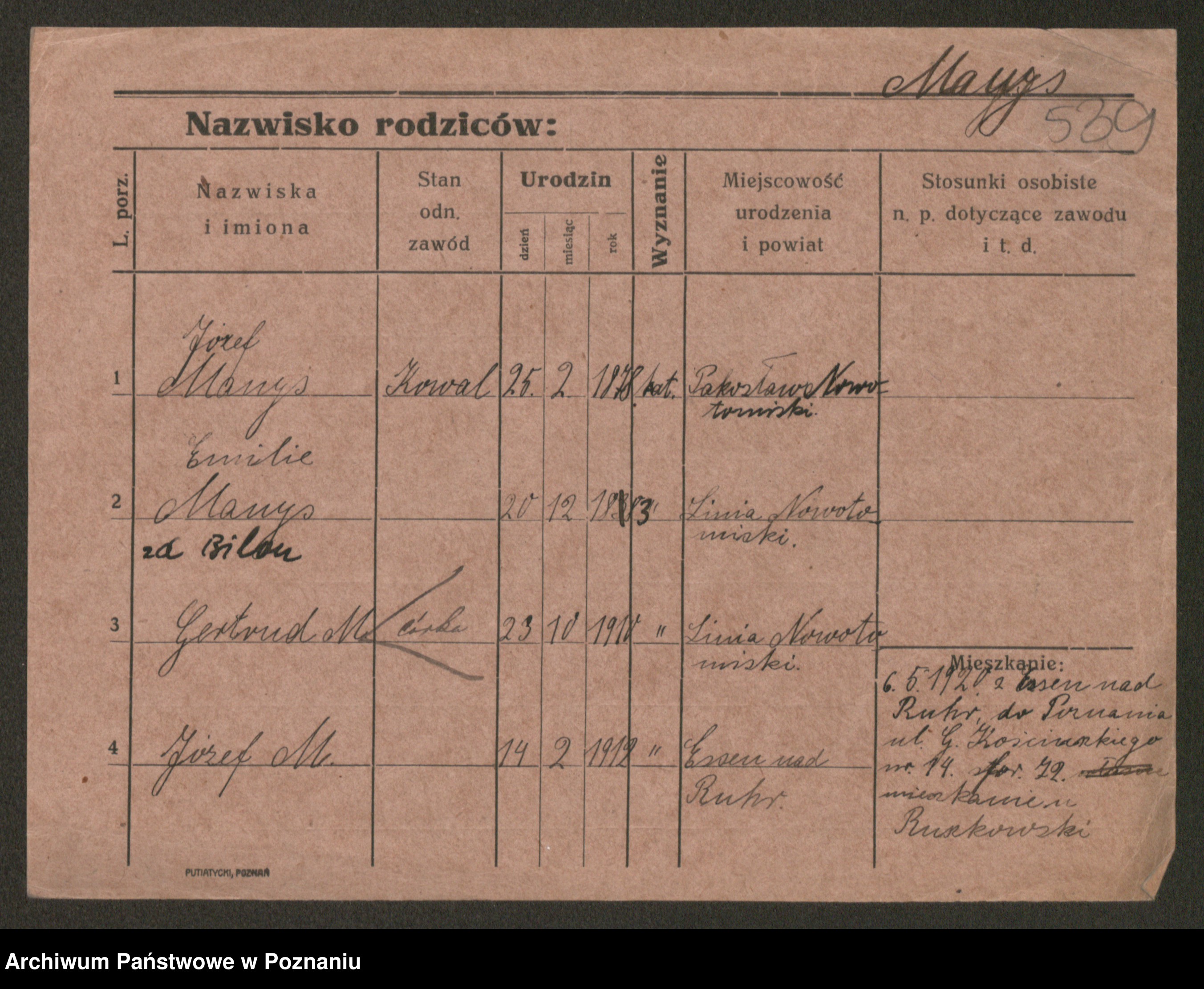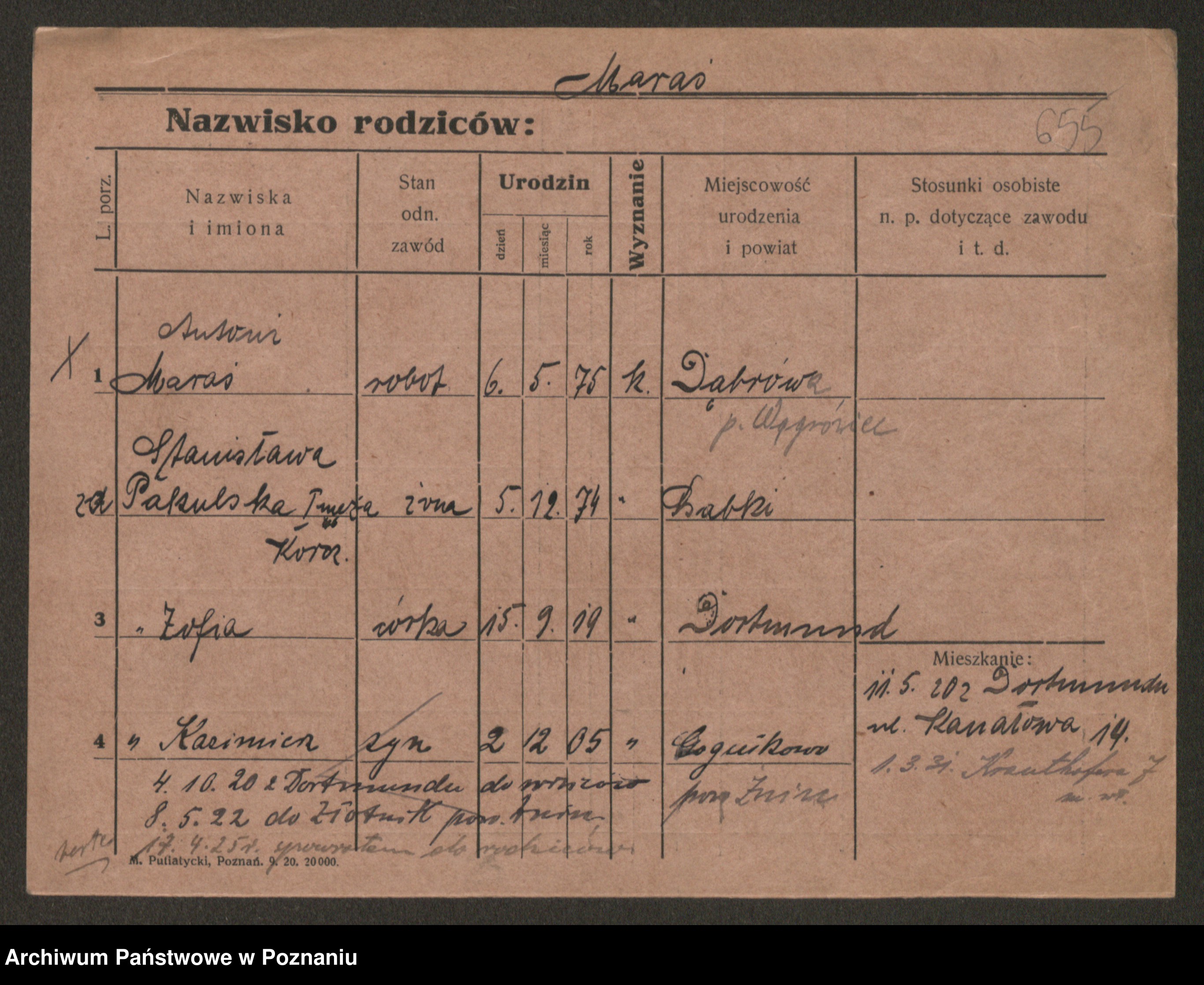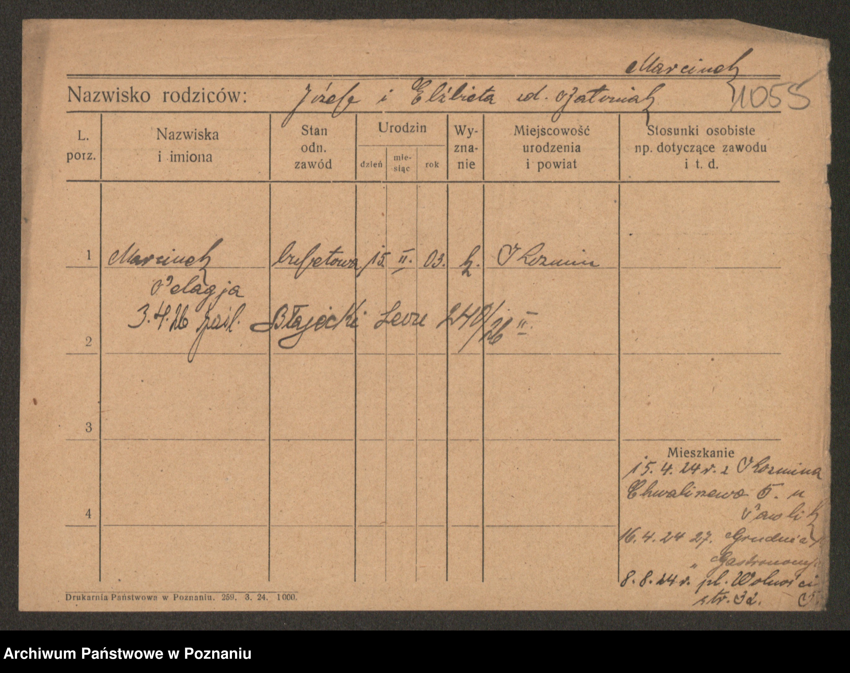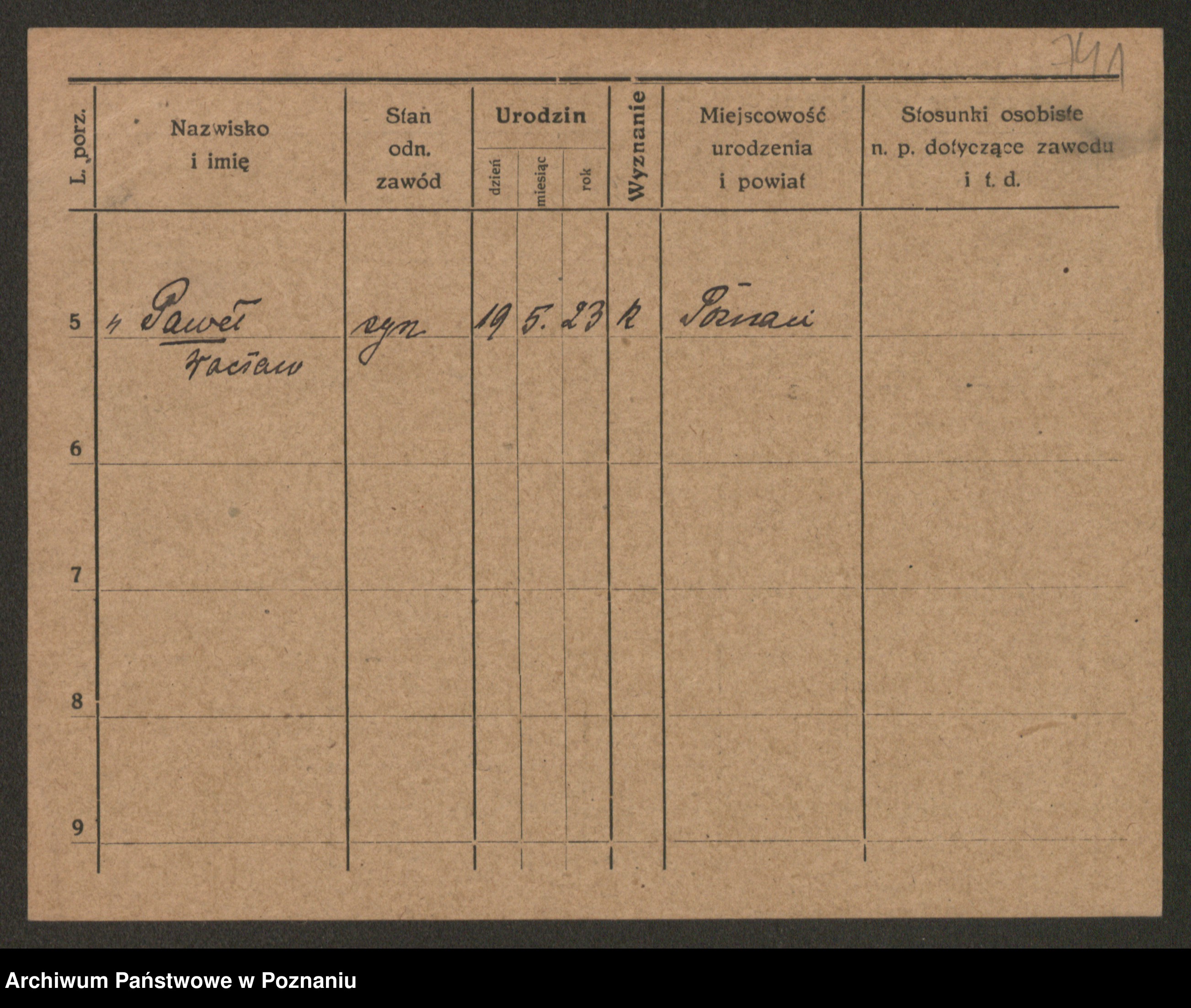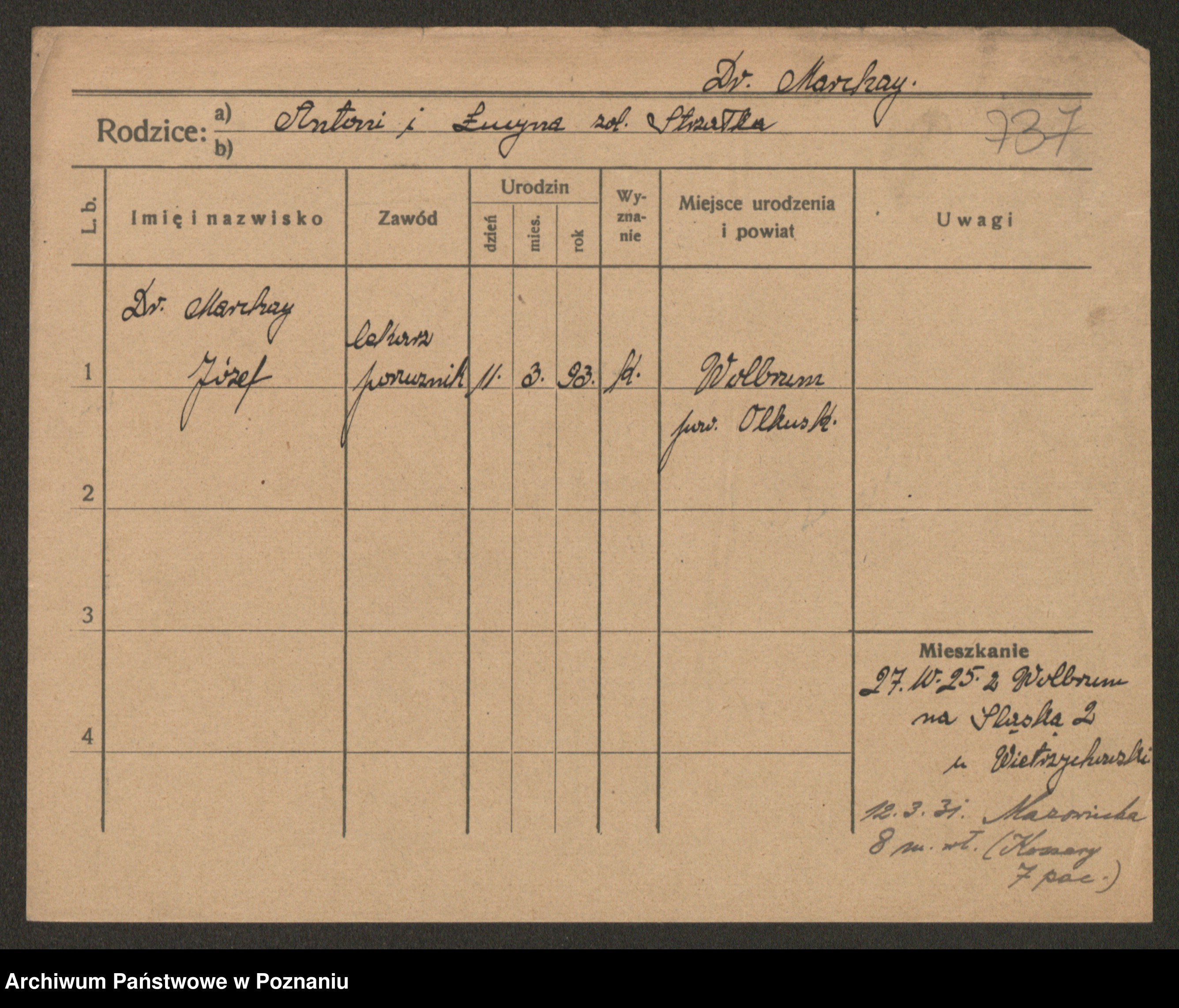 Podgląd karty osobowej dostępny jest po kliknięciu na nazwisko lub ikonkę karty. Można dokonywać powiększenia (ikony na górze) lub przechodzić między kolejnymi skanami (strzałki po bokach).