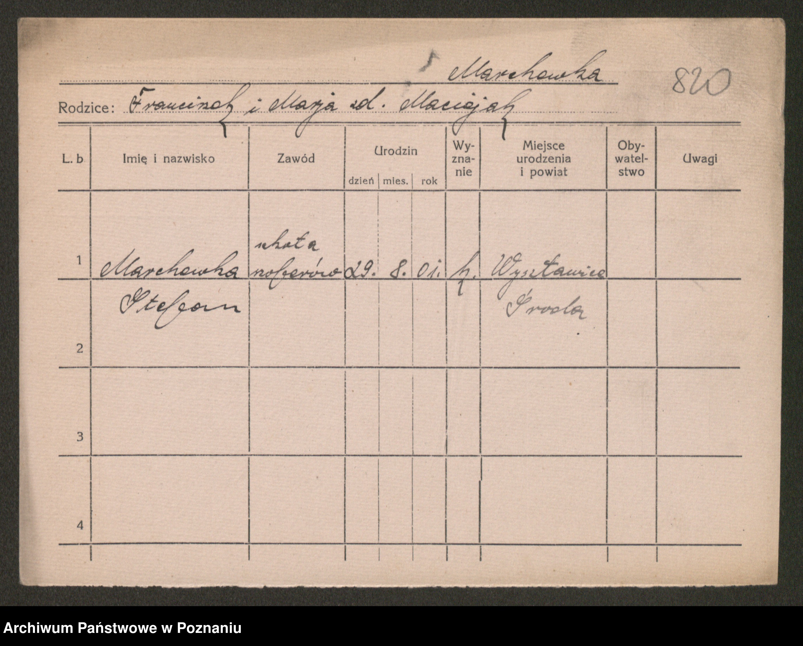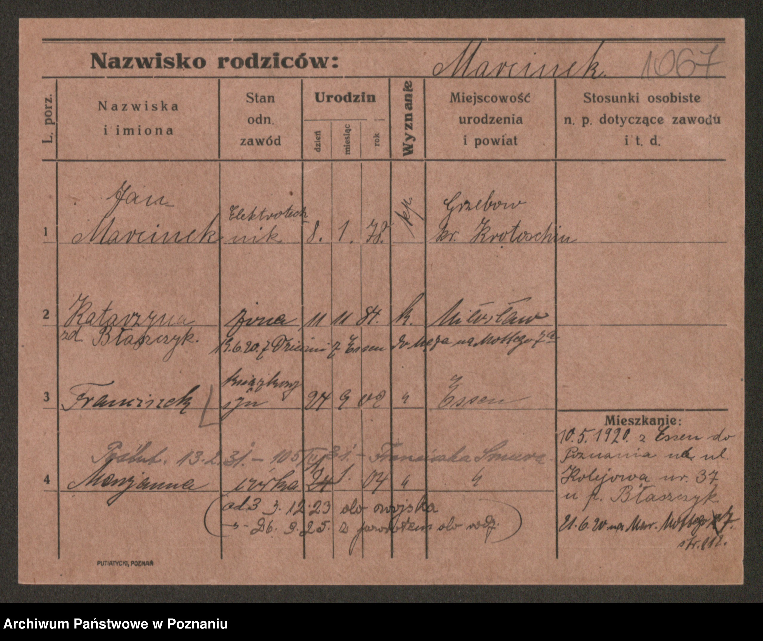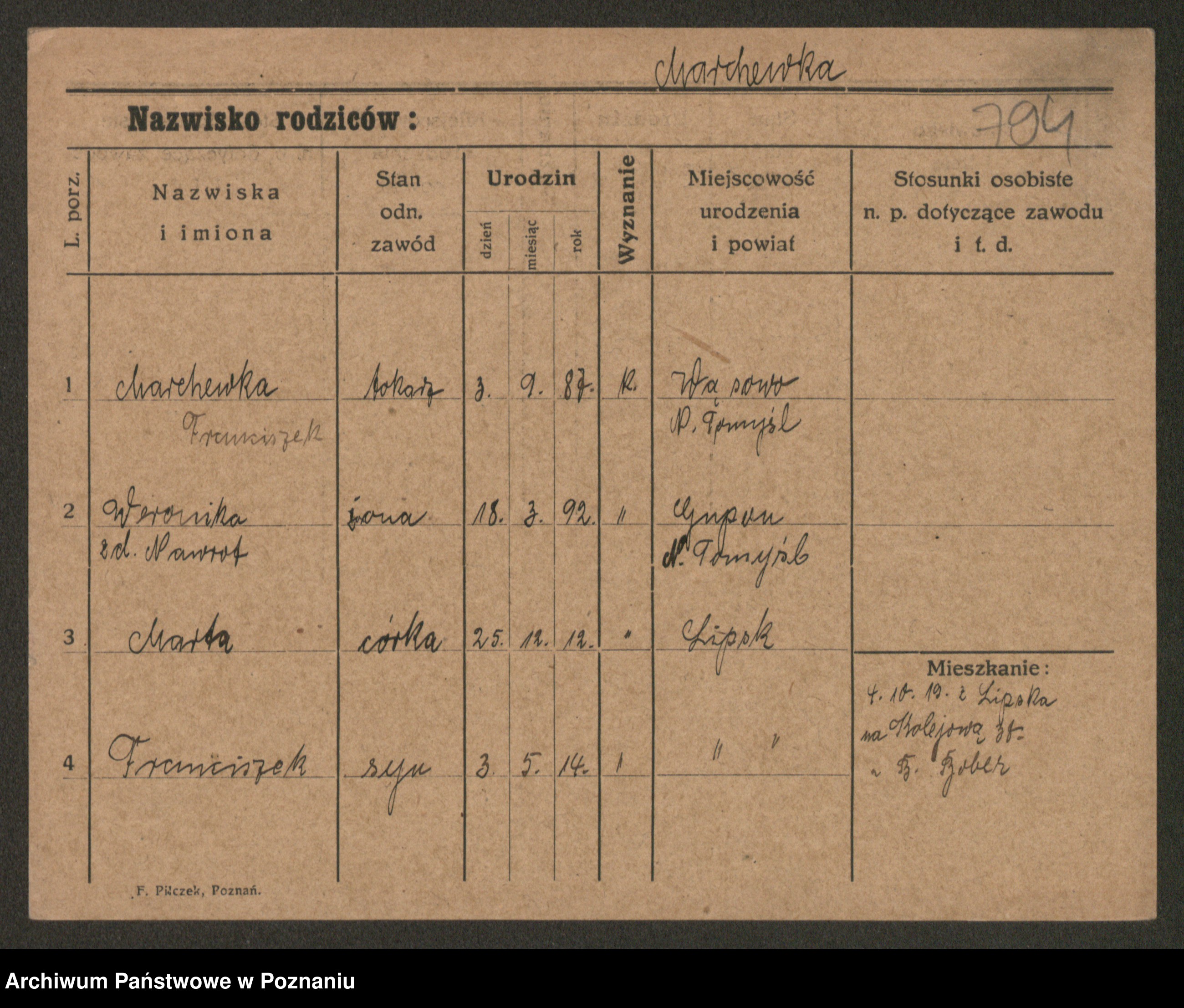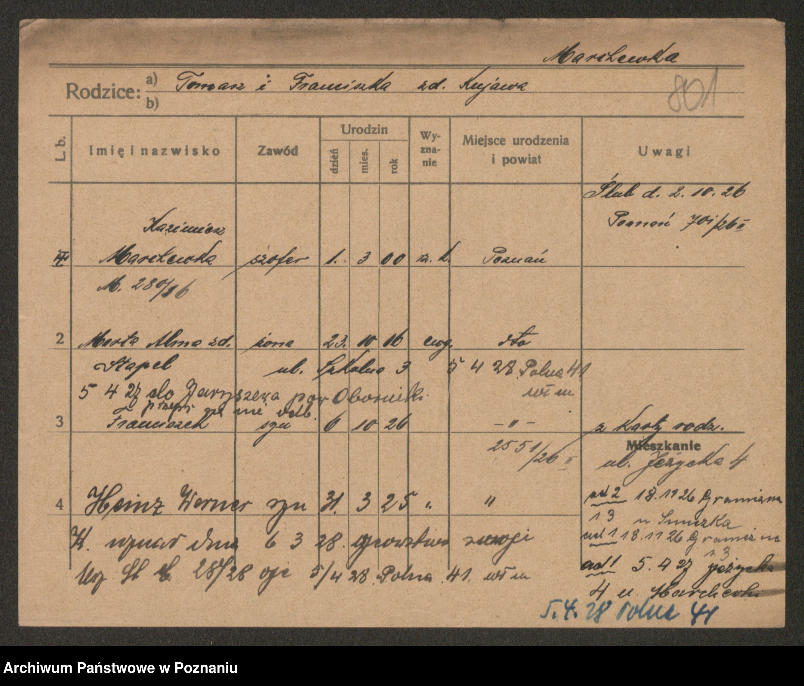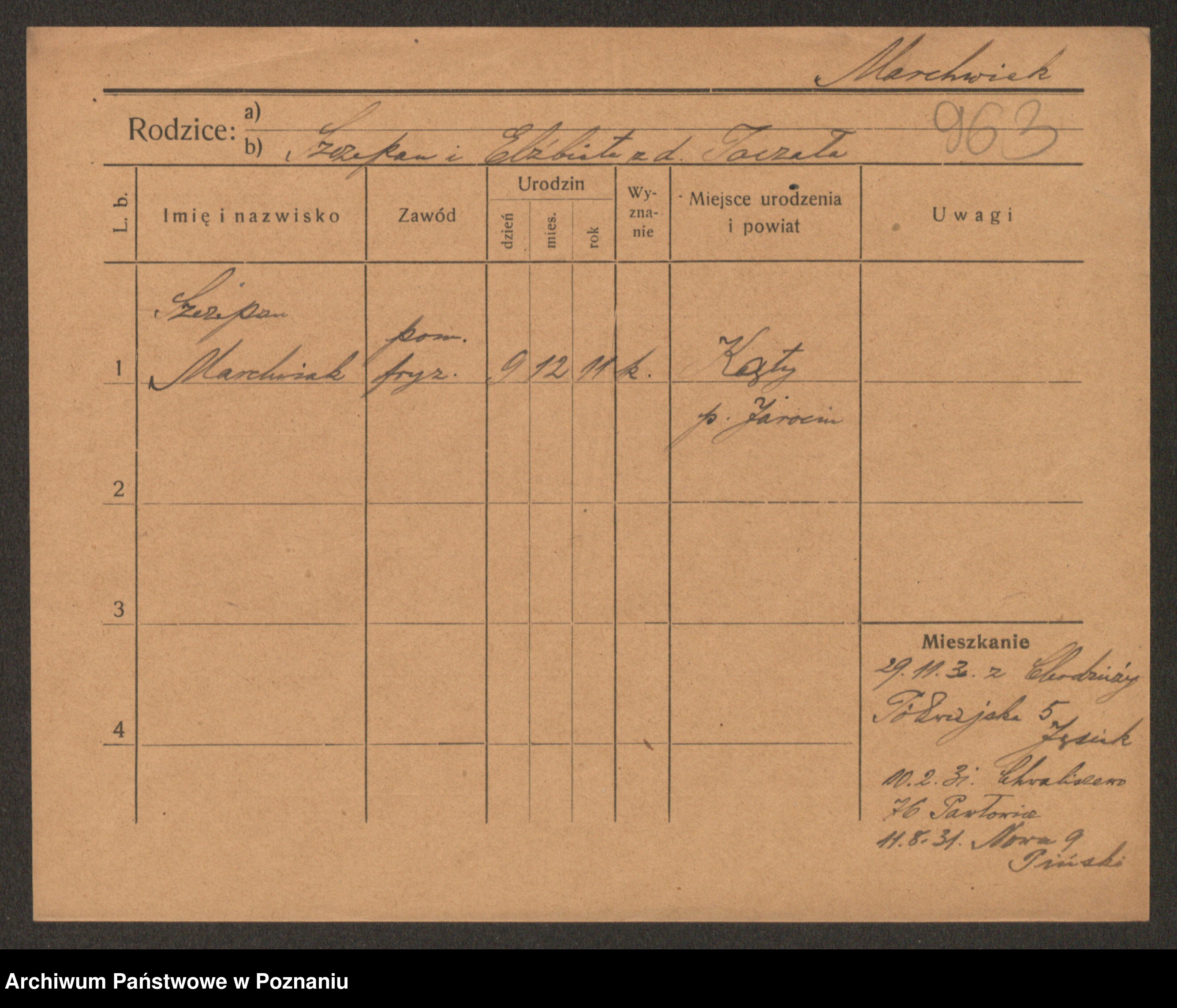 Podgląd karty osobowej dostępny jest po kliknięciu na nazwisko lub ikonkę karty. Można dokonywać powiększenia (ikony na górze) lub przechodzić między kolejnymi skanami (strzałki po bokach).