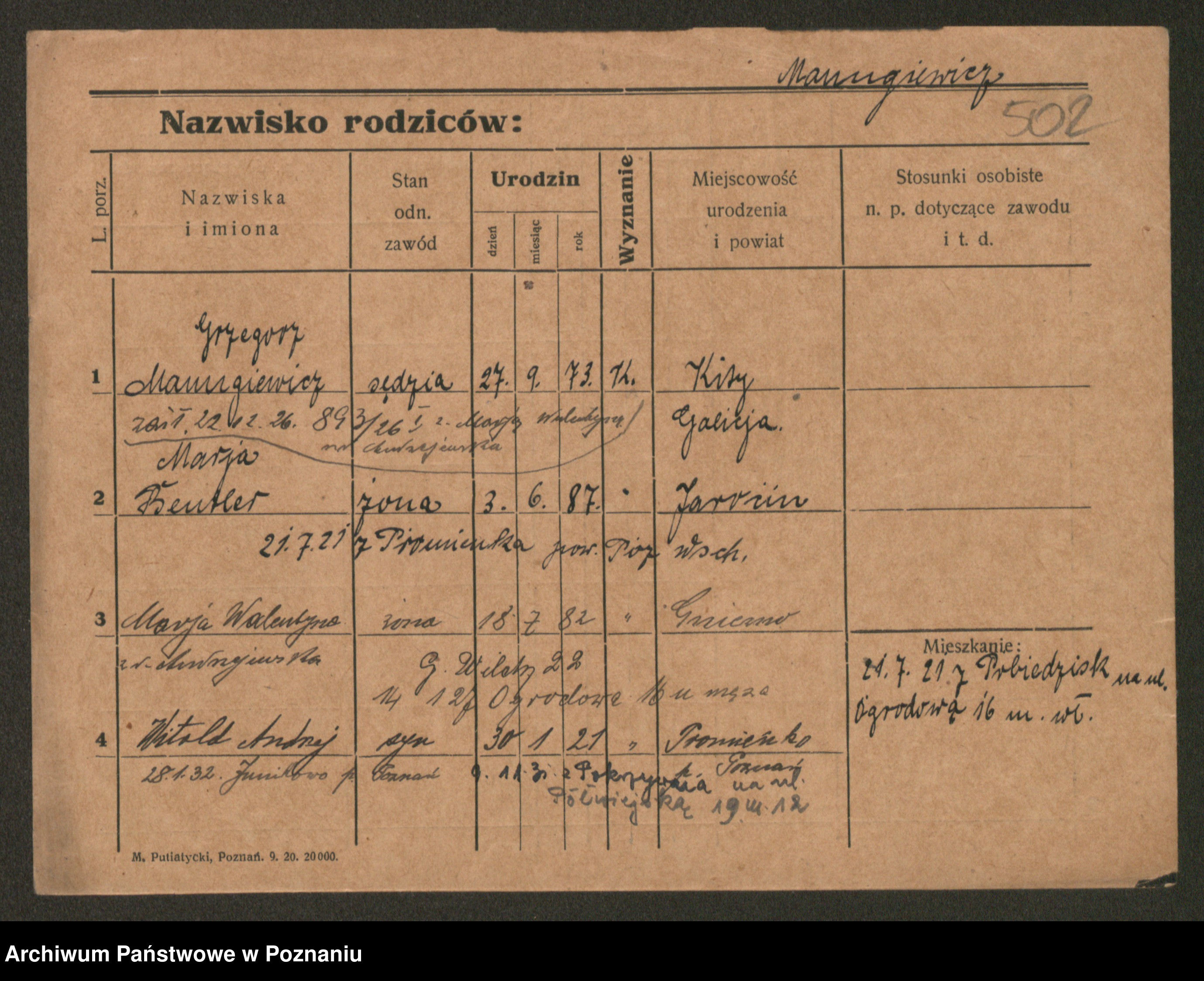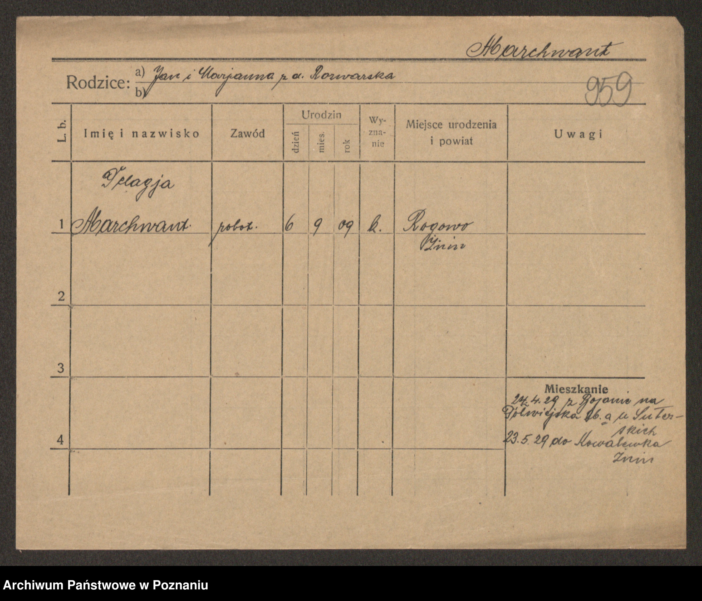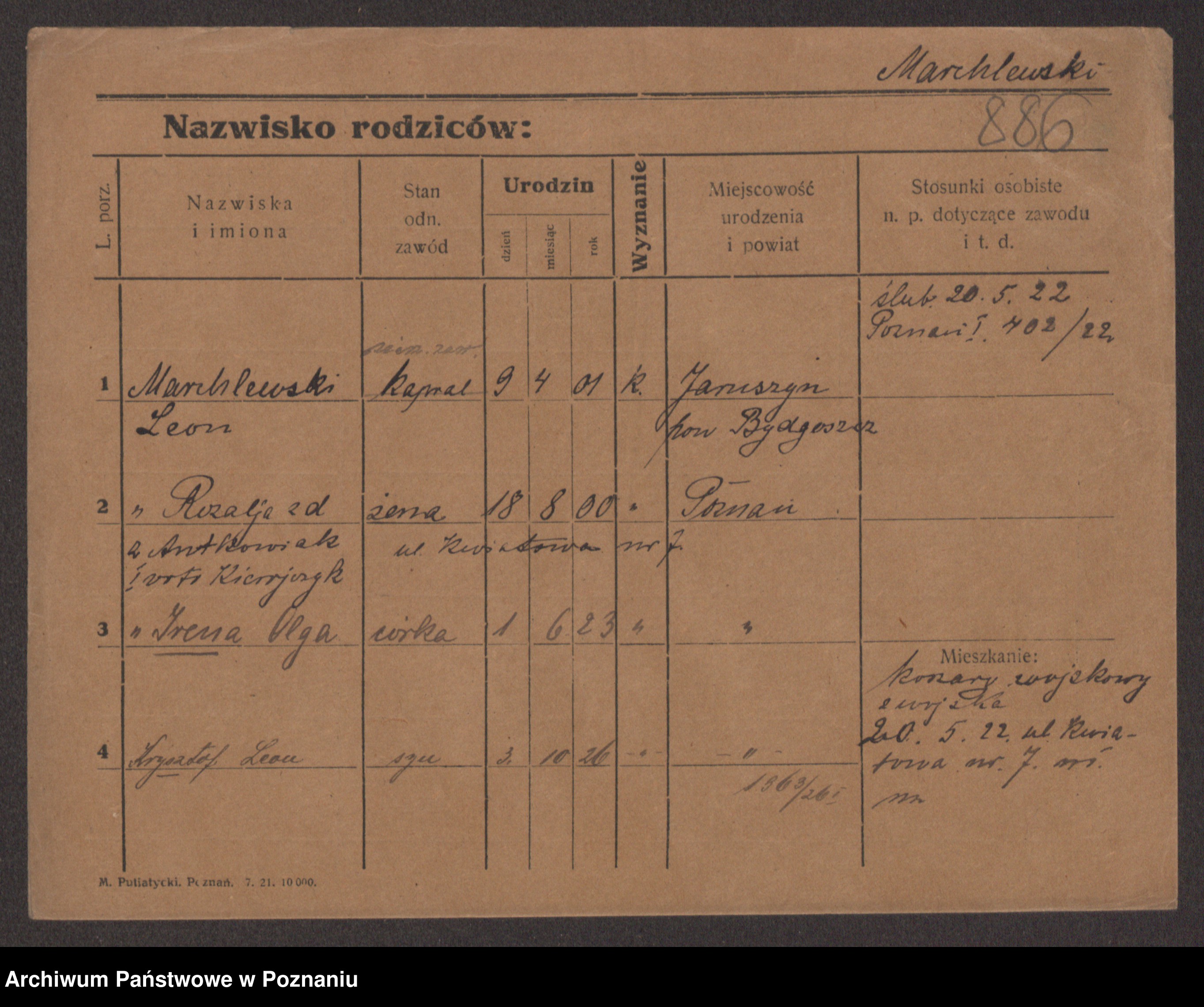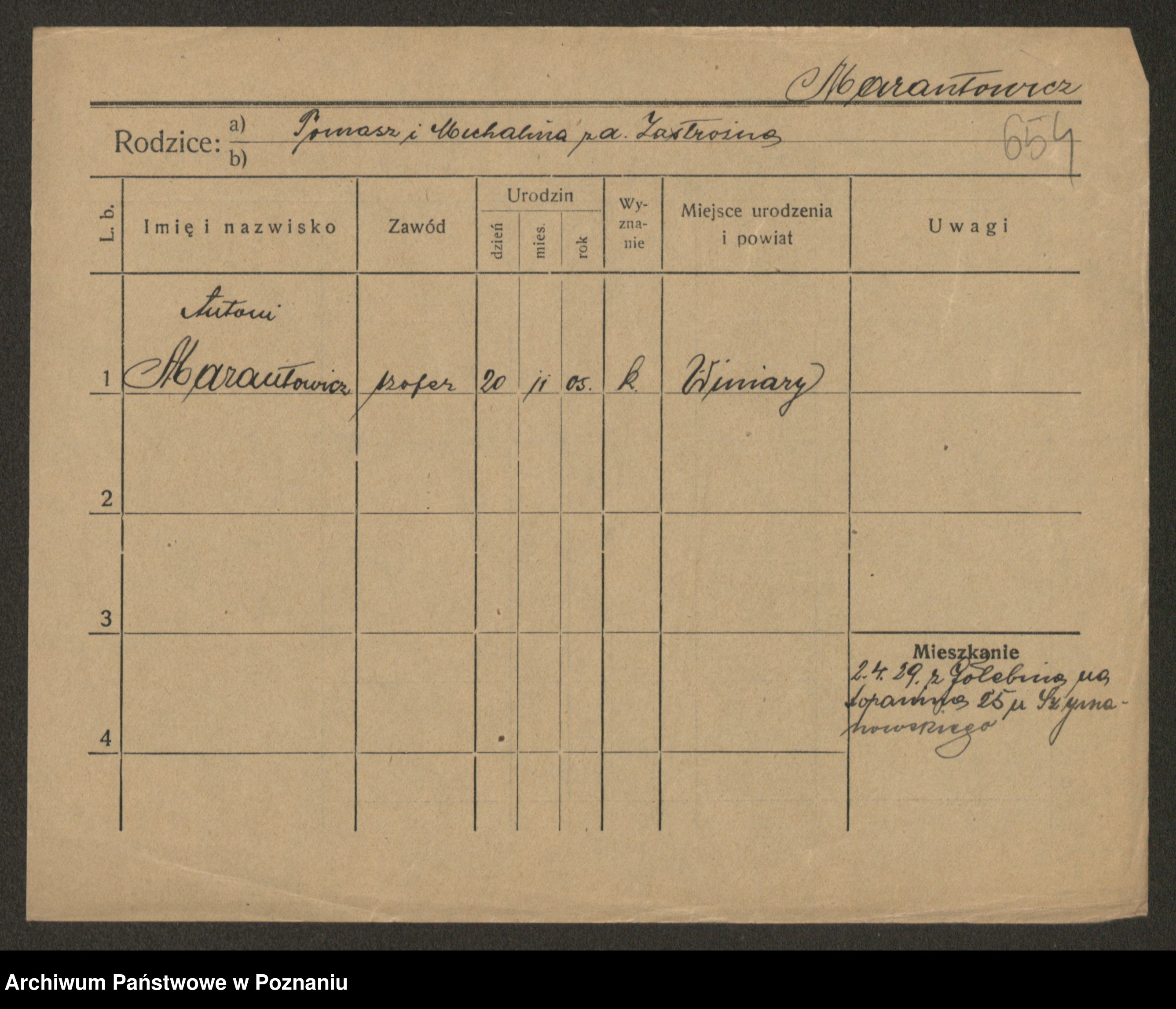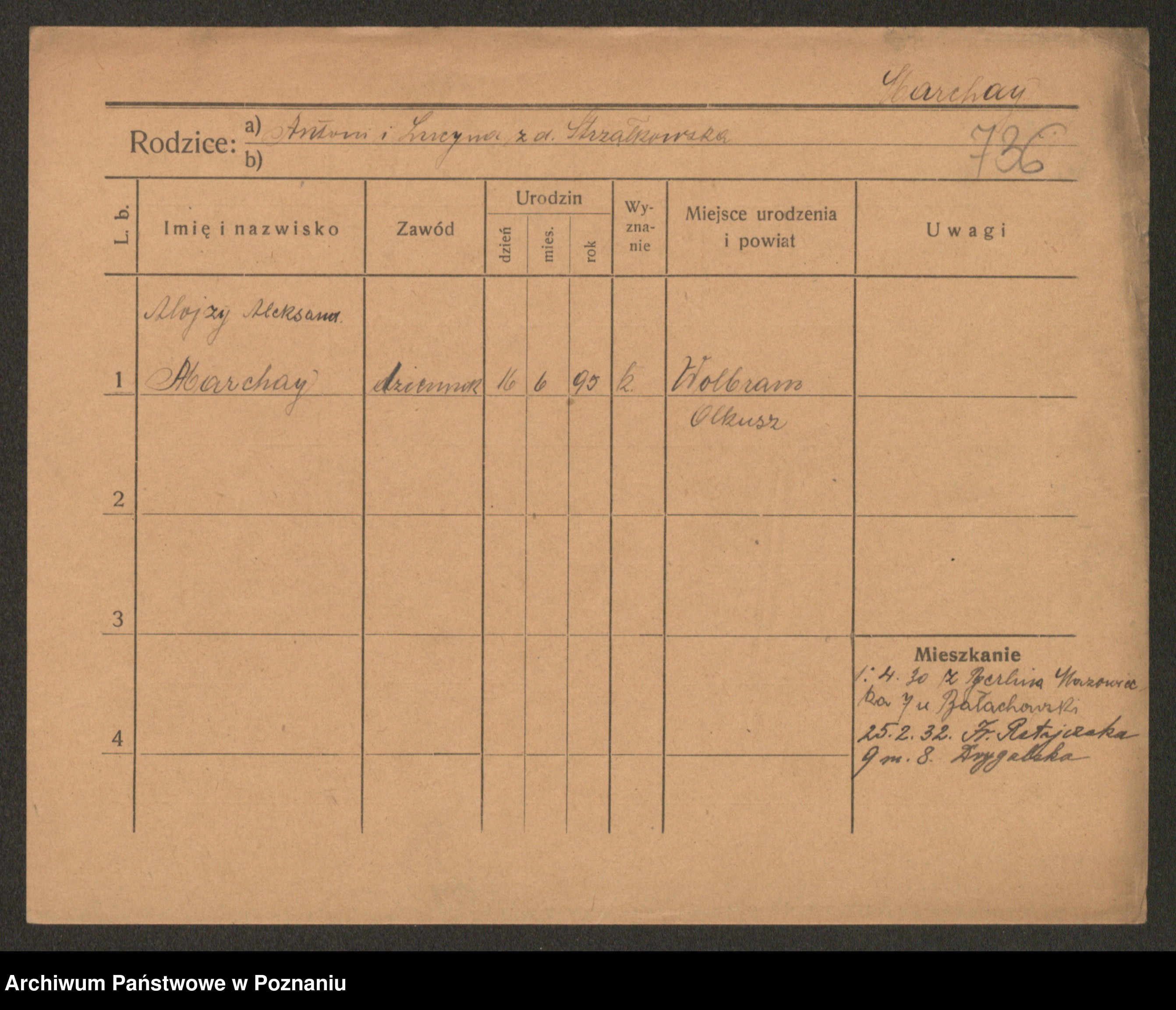 Podgląd karty osobowej dostępny jest po kliknięciu na nazwisko lub ikonkę karty. Można dokonywać powiększenia (ikony na górze) lub przechodzić między kolejnymi skanami (strzałki po bokach).