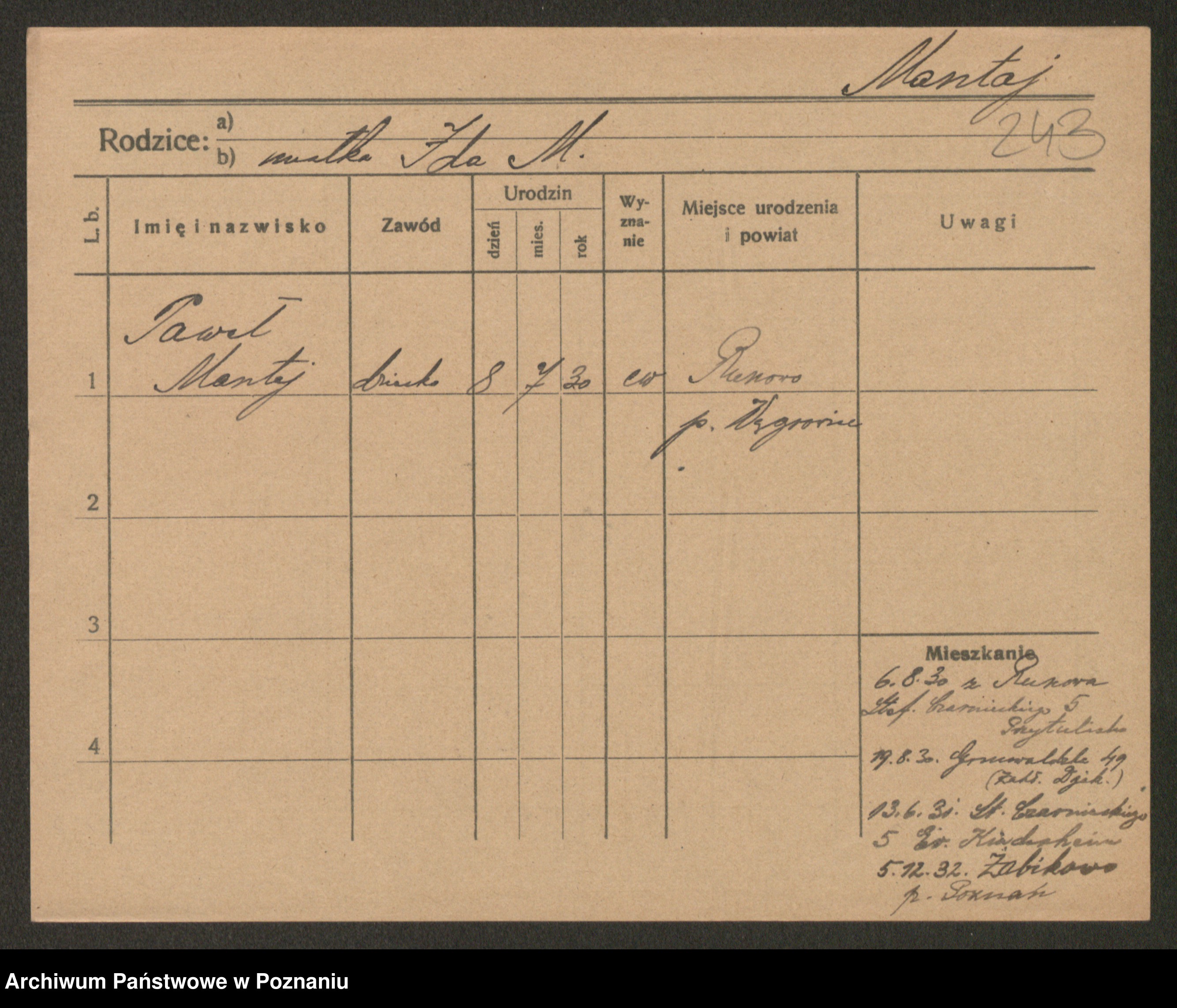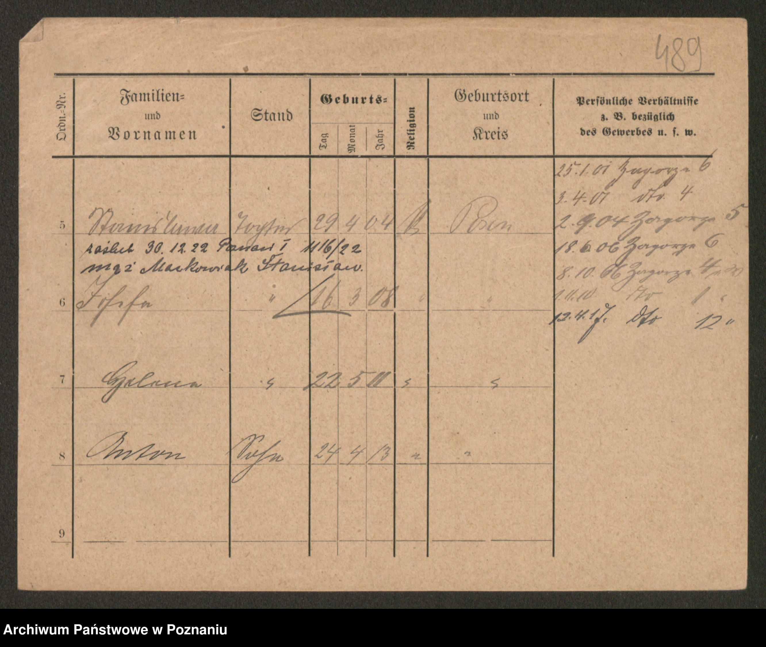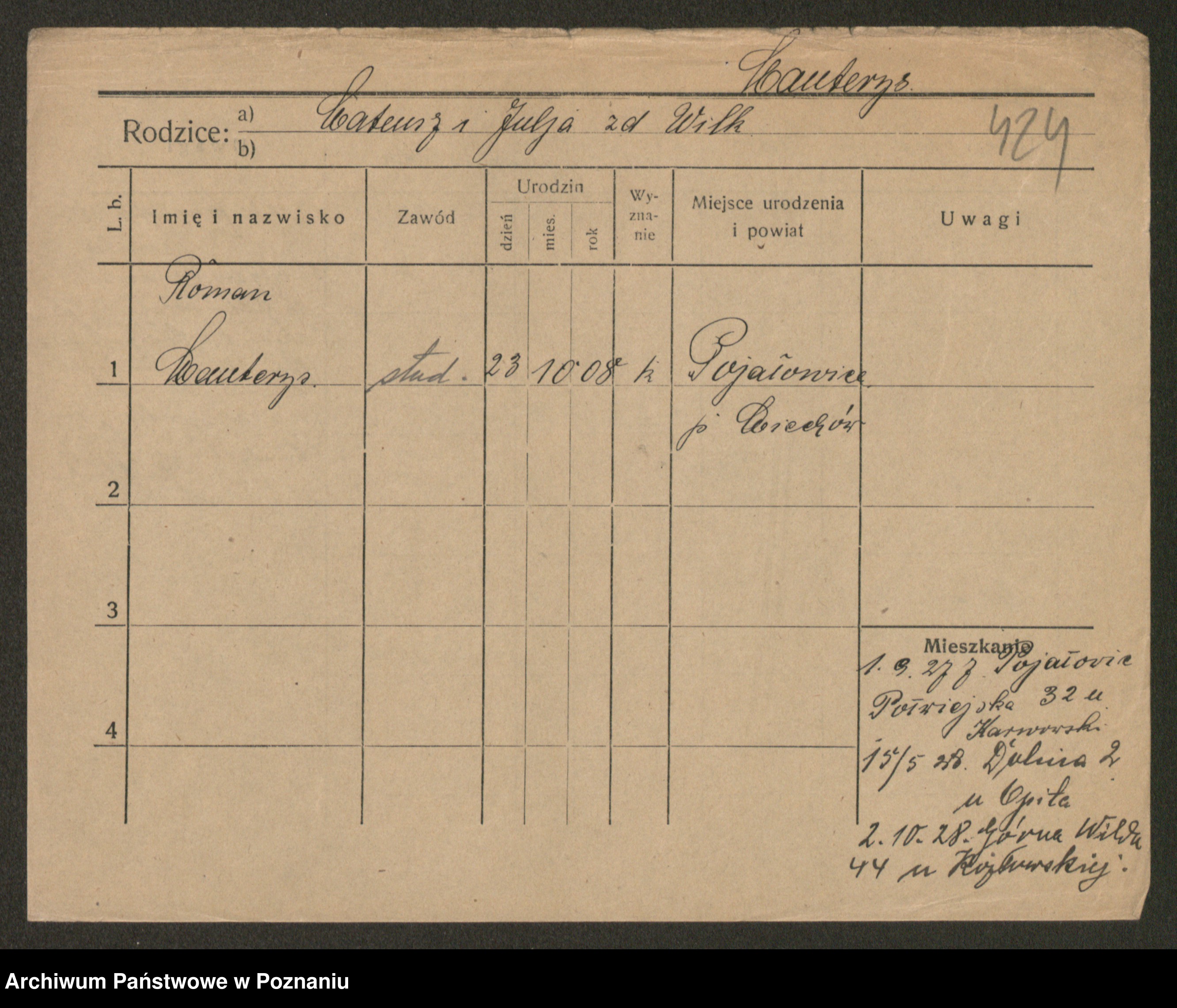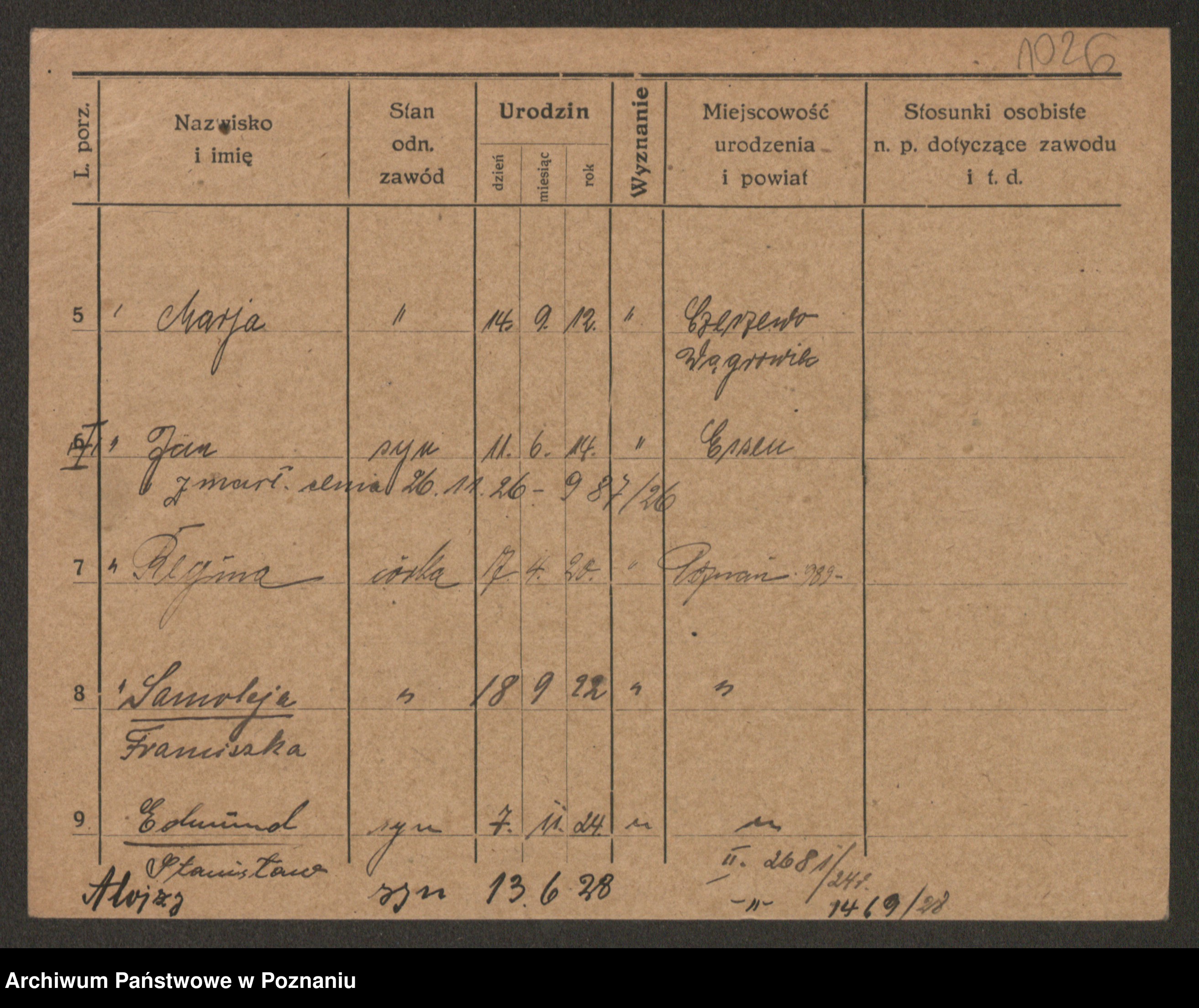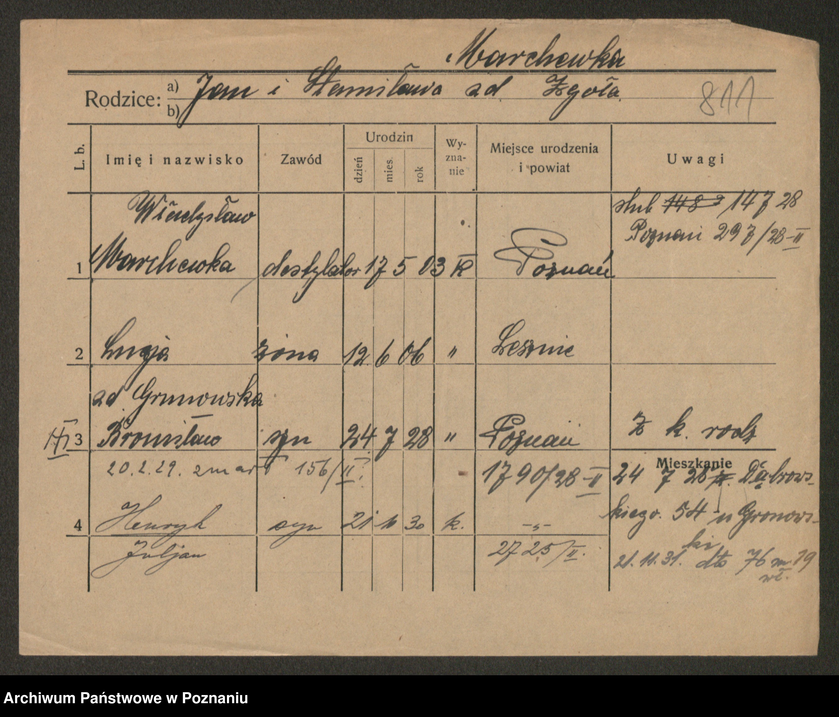 Podgląd karty osobowej dostępny jest po kliknięciu na nazwisko lub ikonkę karty. Można dokonywać powiększenia (ikony na górze) lub przechodzić między kolejnymi skanami (strzałki po bokach).