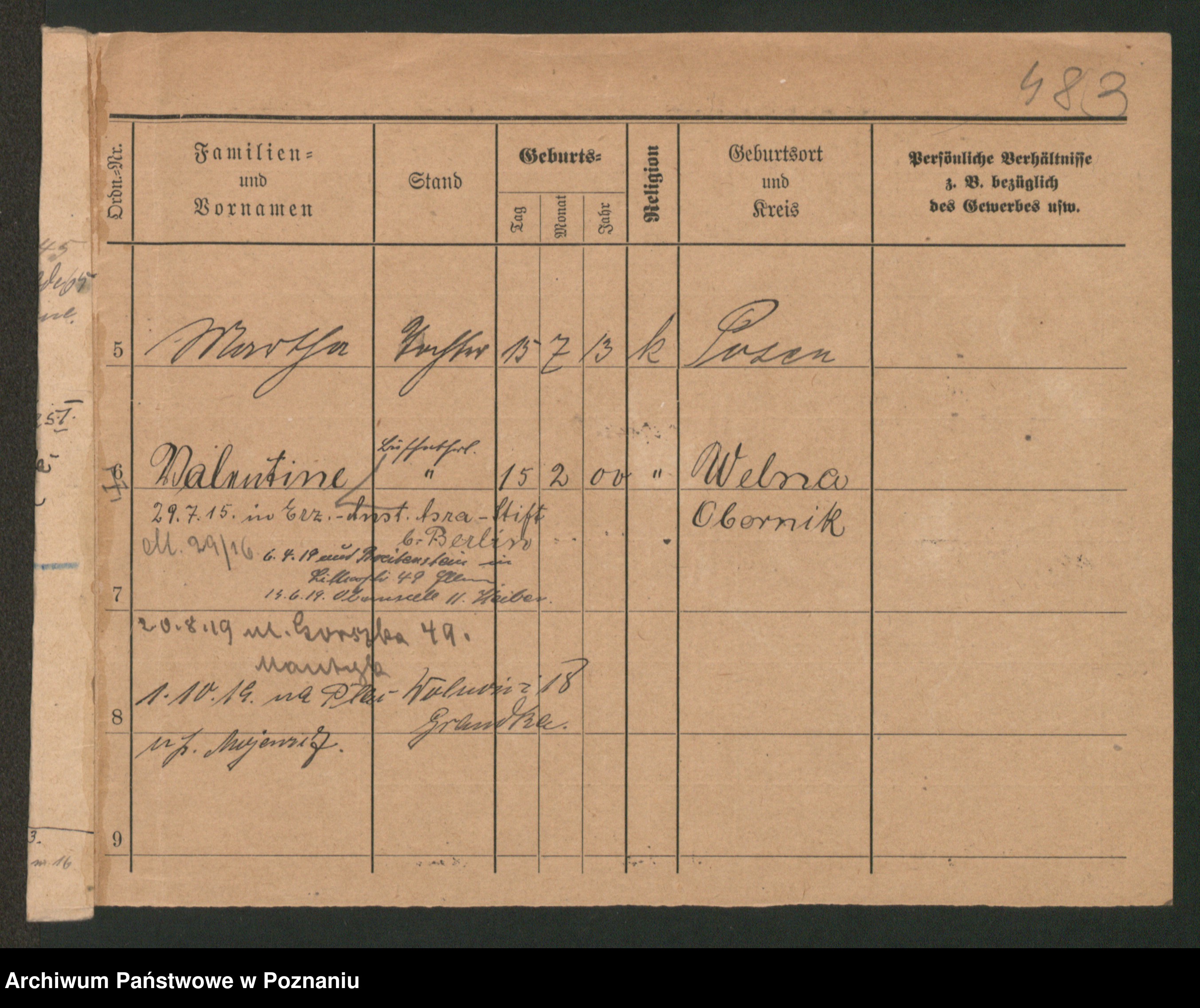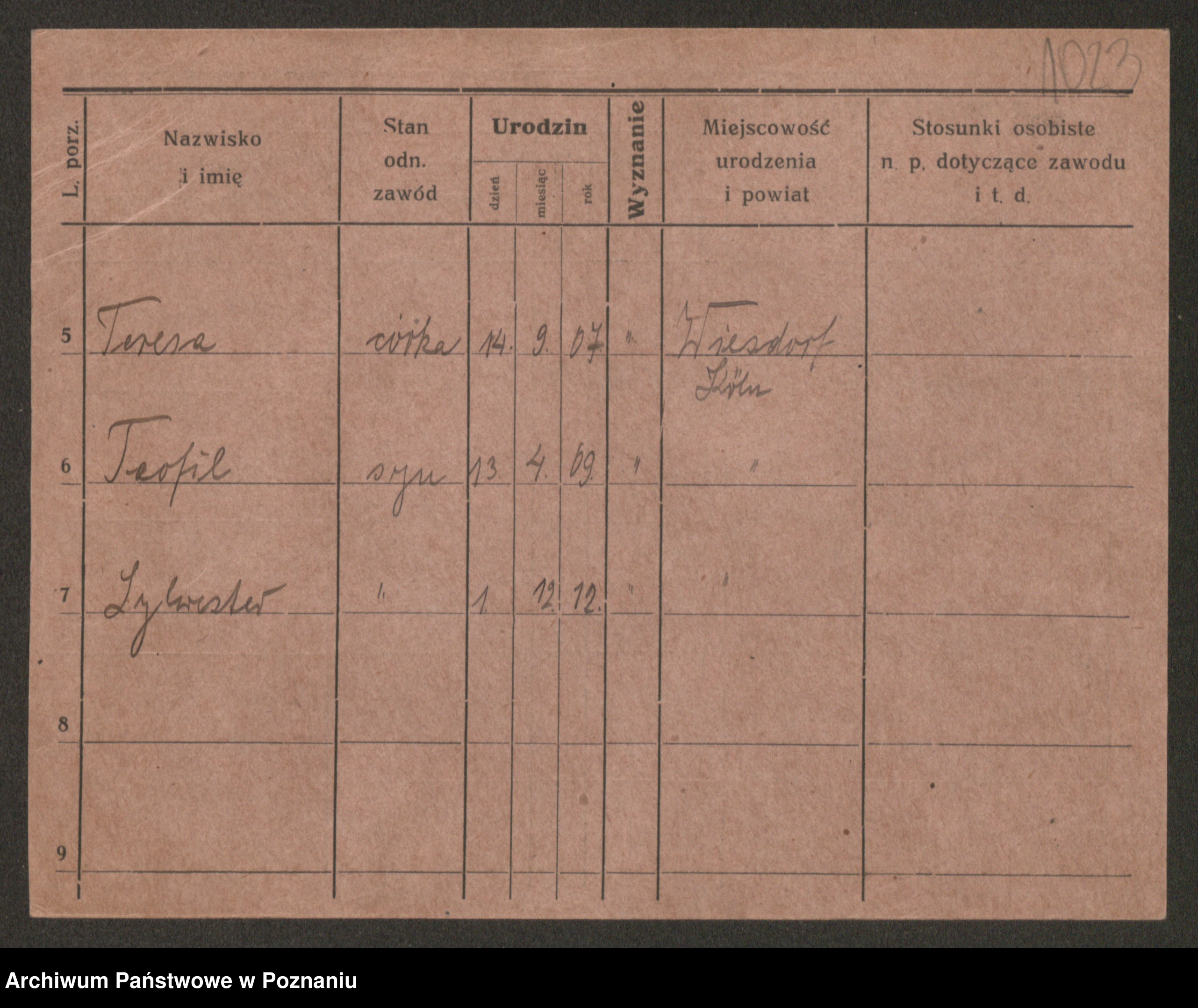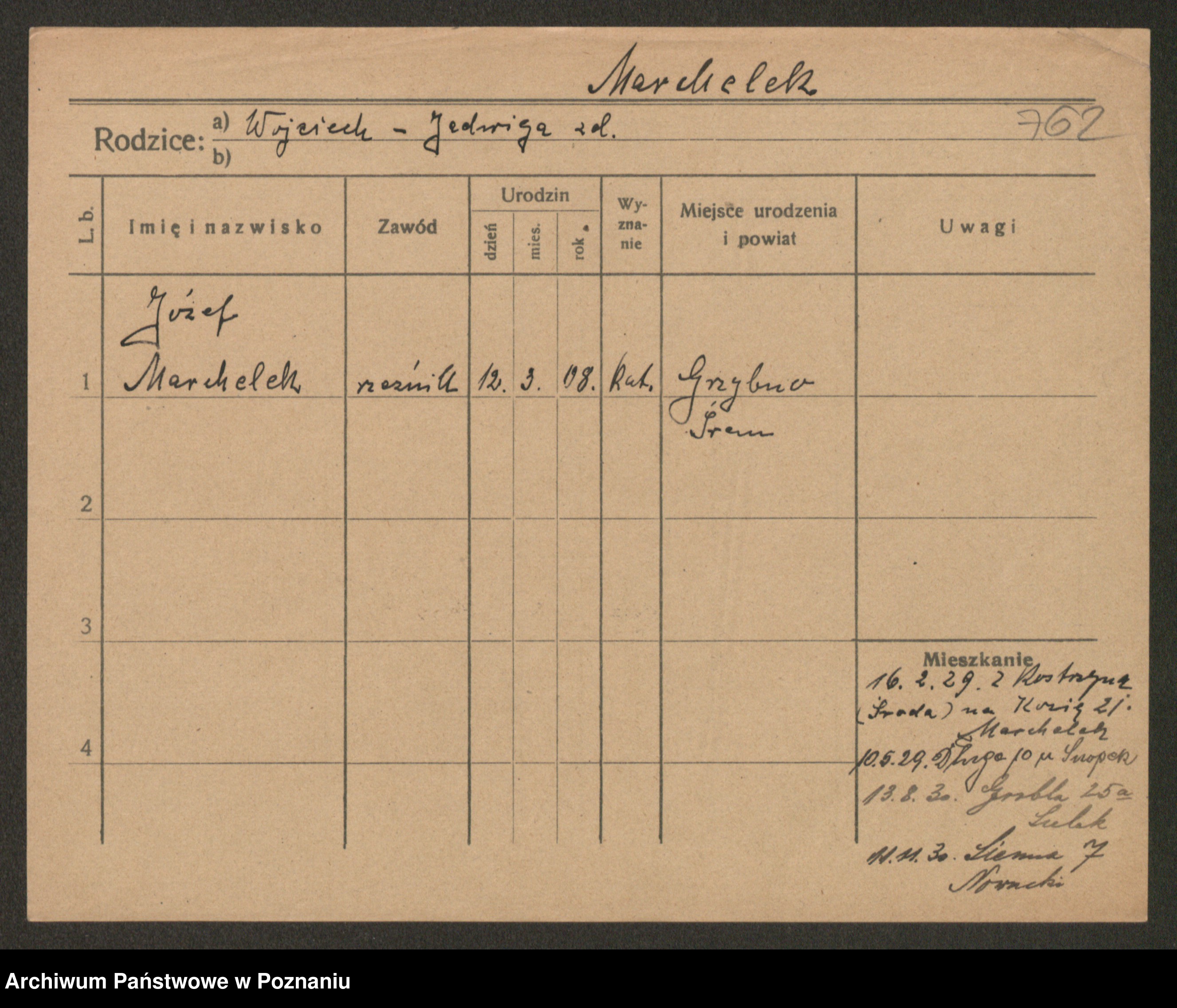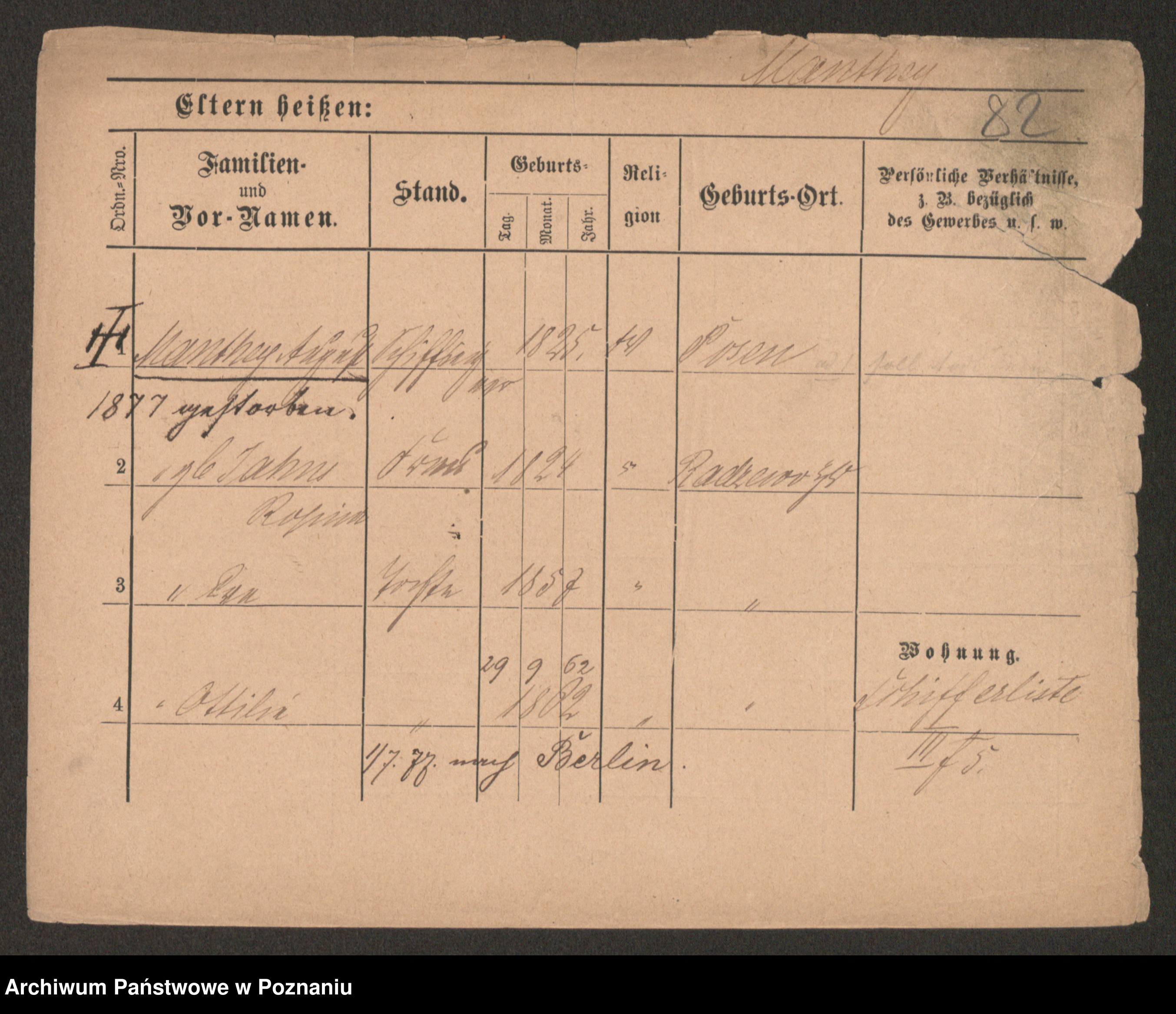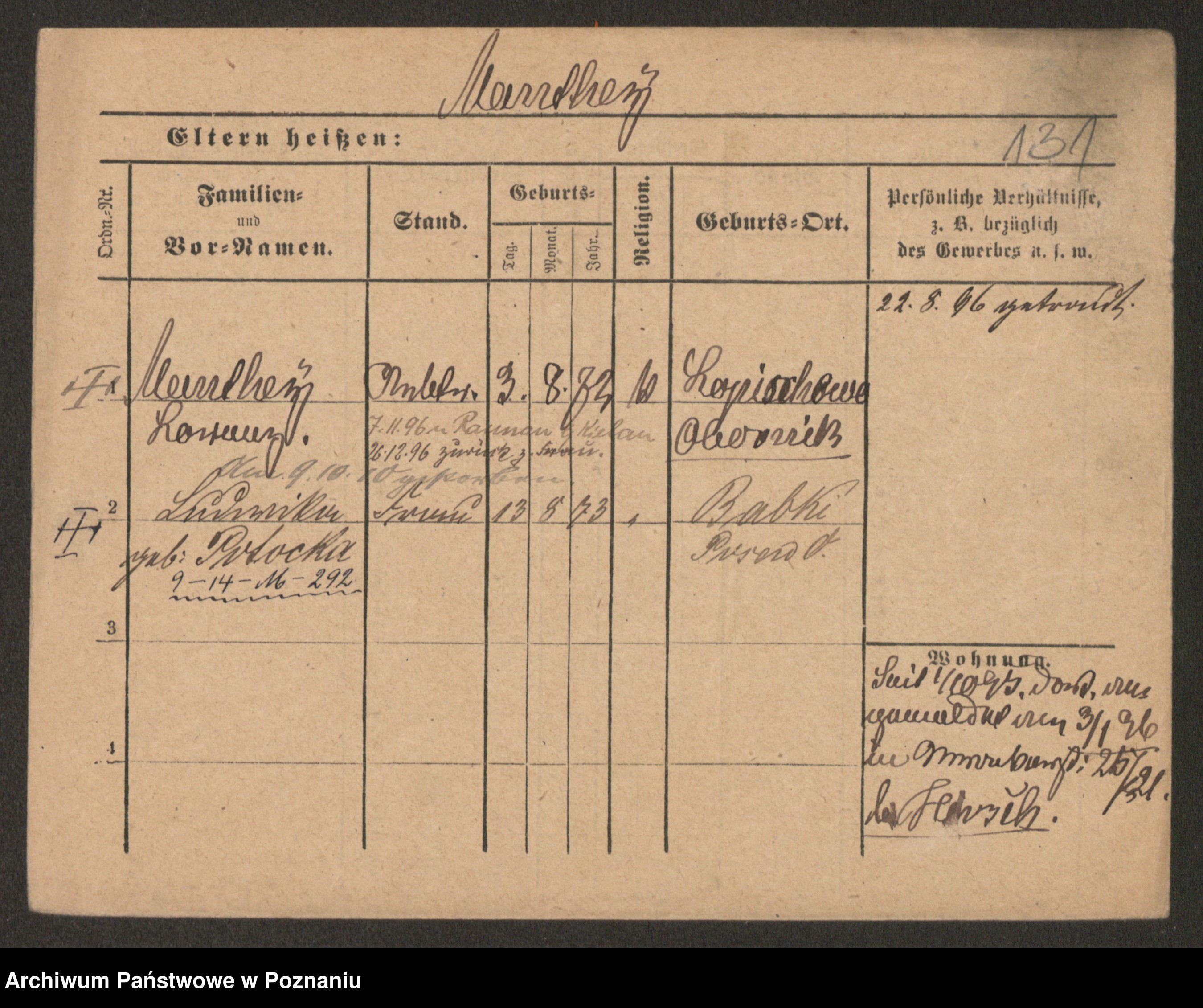 Podgląd karty osobowej dostępny jest po kliknięciu na nazwisko lub ikonkę karty. Można dokonywać powiększenia (ikony na górze) lub przechodzić między kolejnymi skanami (strzałki po bokach).