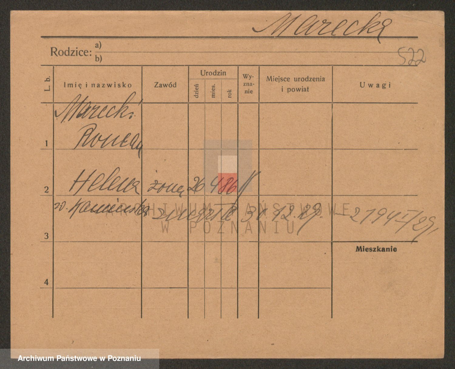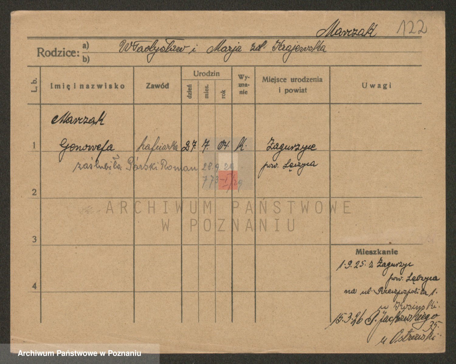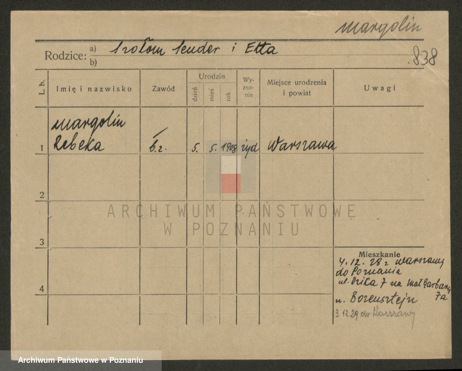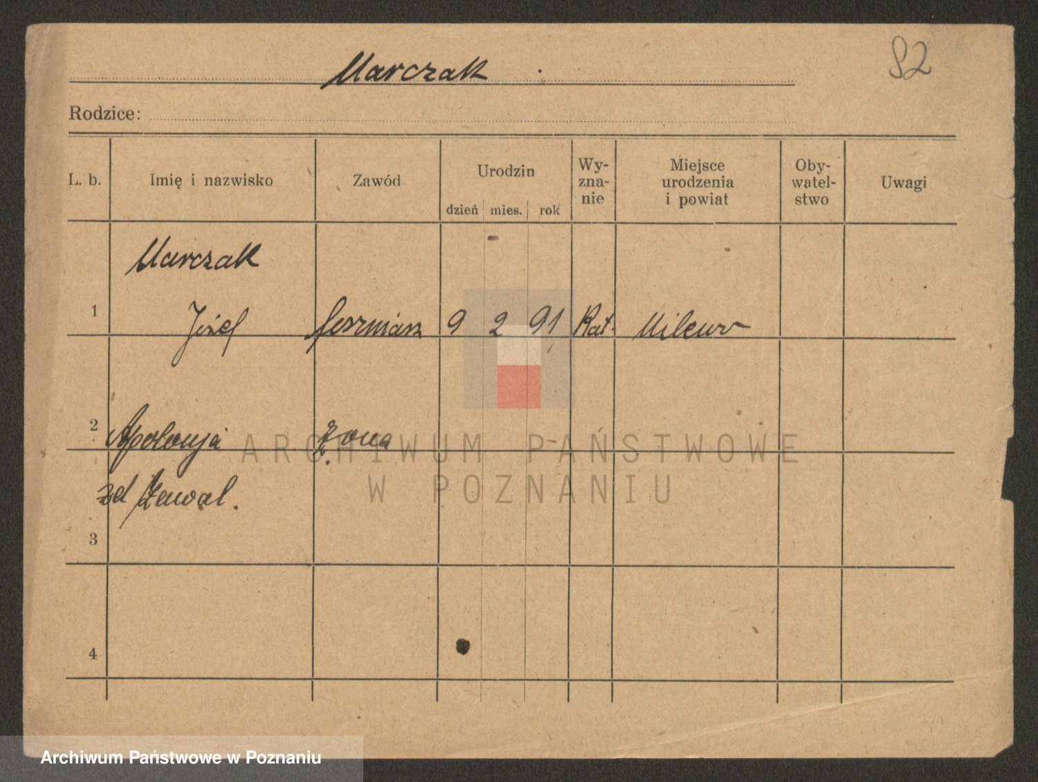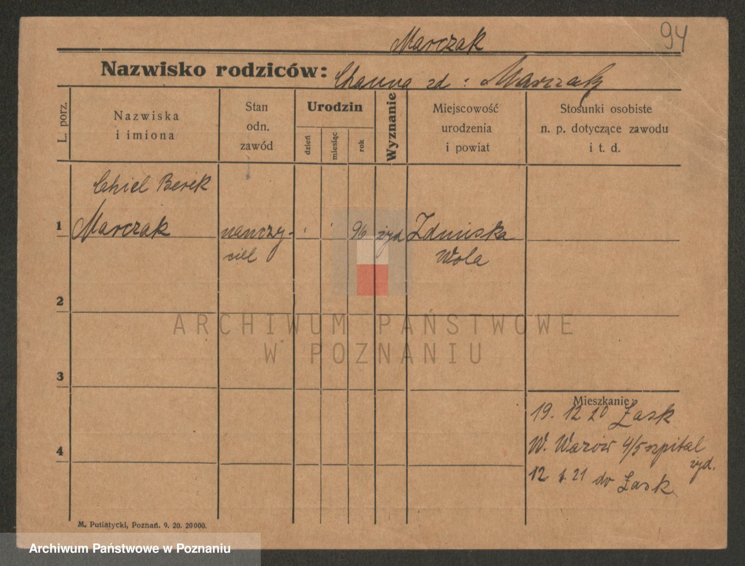 Podgląd karty osobowej dostępny jest po kliknięciu na nazwisko lub ikonkę karty. Można dokonywać powiększenia (ikony na górze) lub przechodzić między kolejnymi skanami (strzałki po bokach).