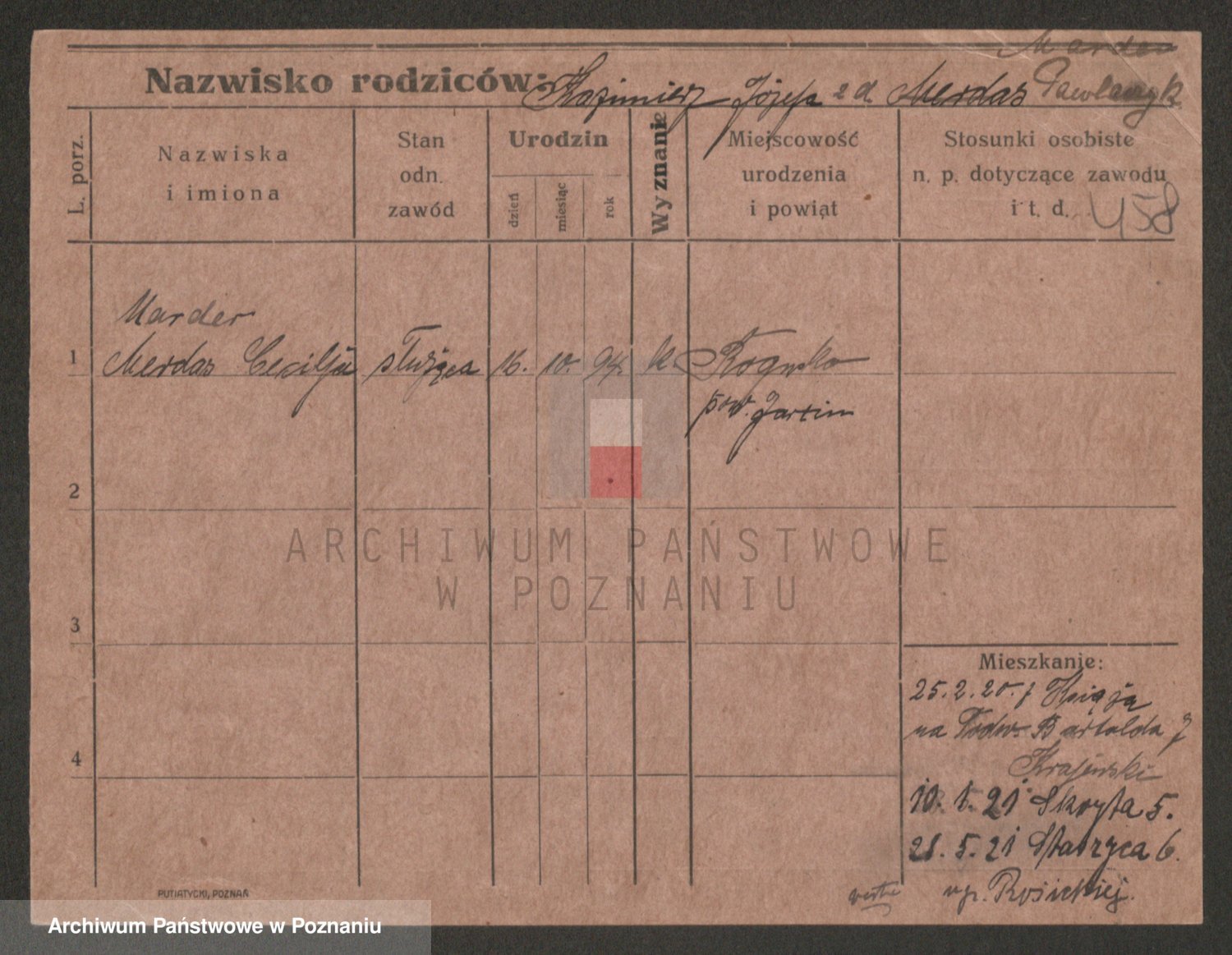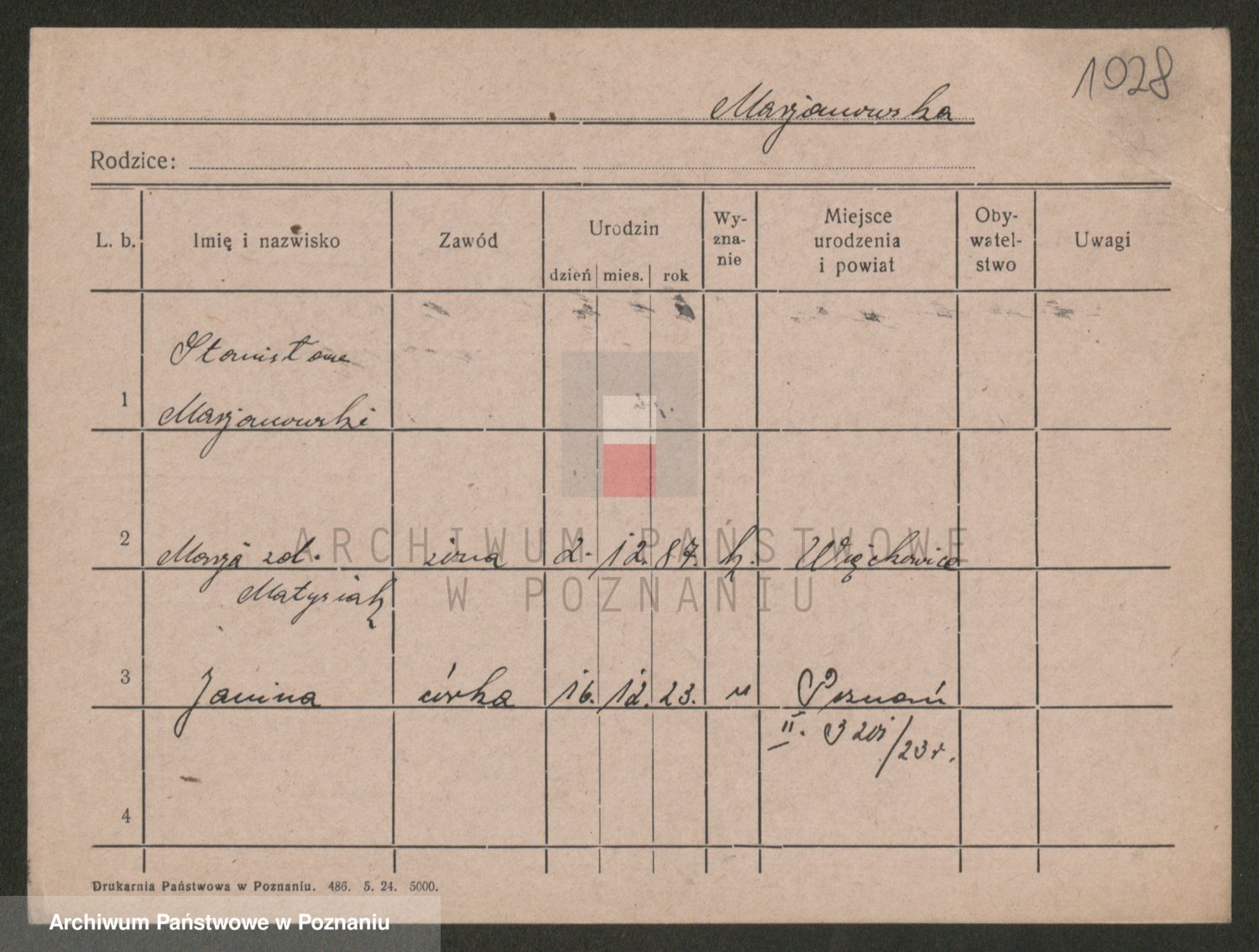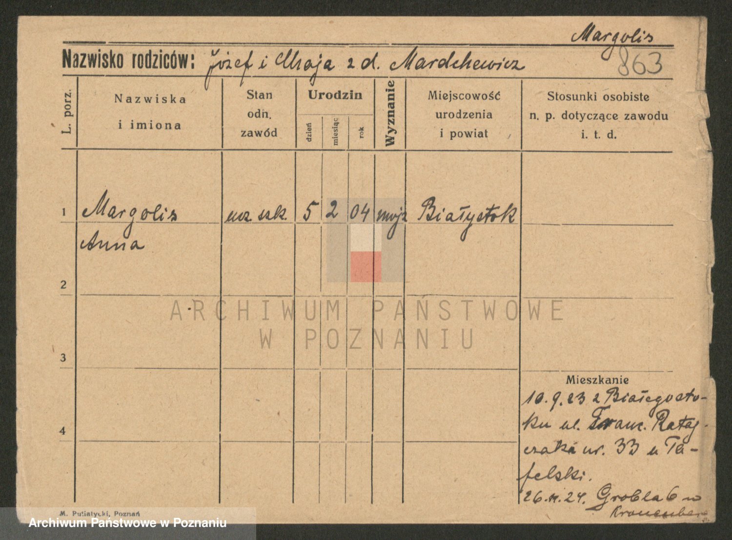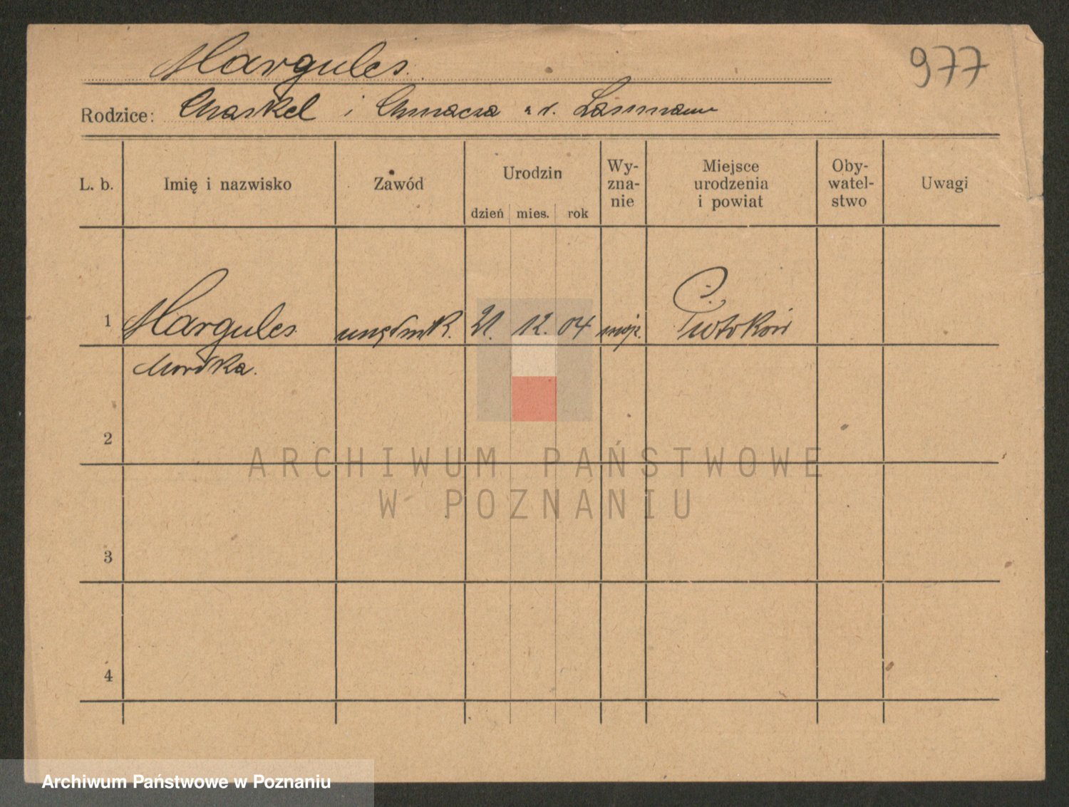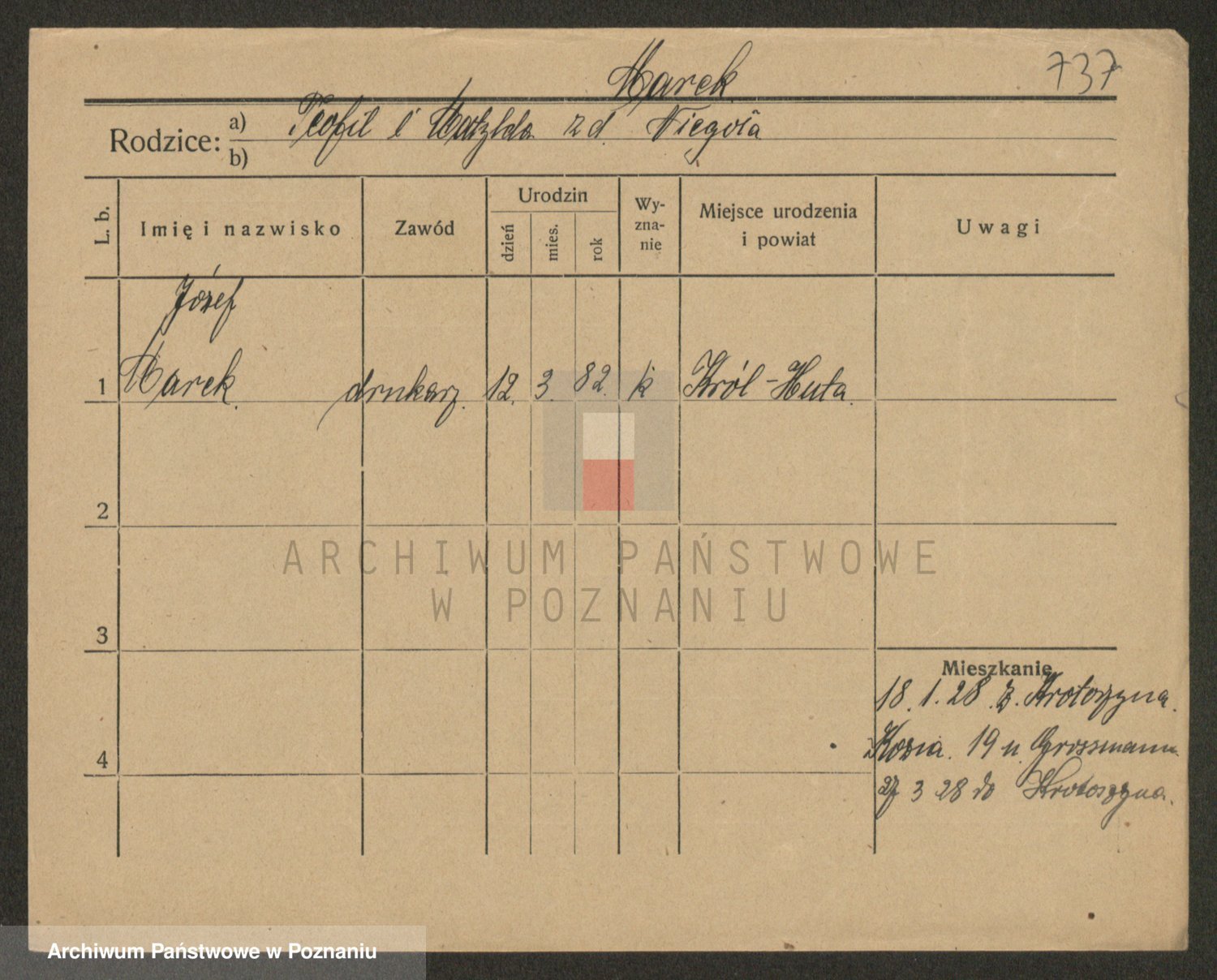 Podgląd karty osobowej dostępny jest po kliknięciu na nazwisko lub ikonkę karty. Można dokonywać powiększenia (ikony na górze) lub przechodzić między kolejnymi skanami (strzałki po bokach).