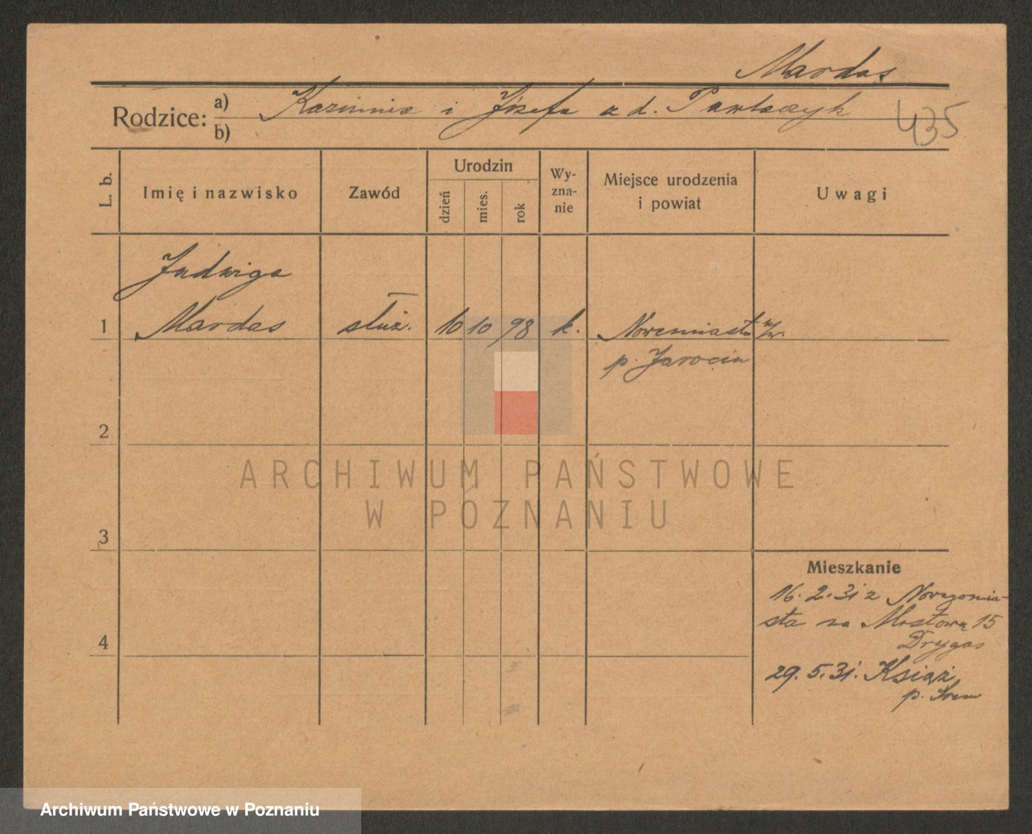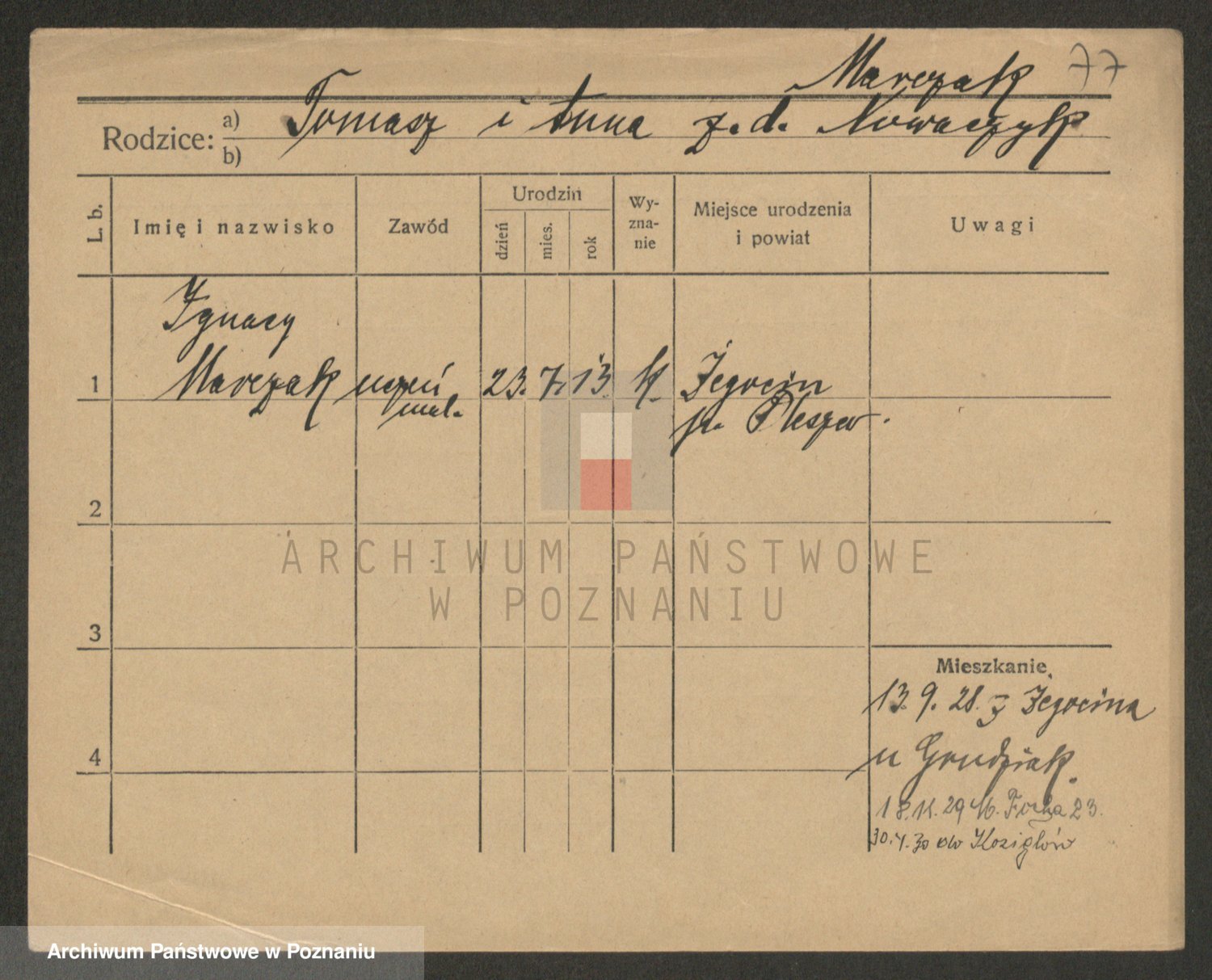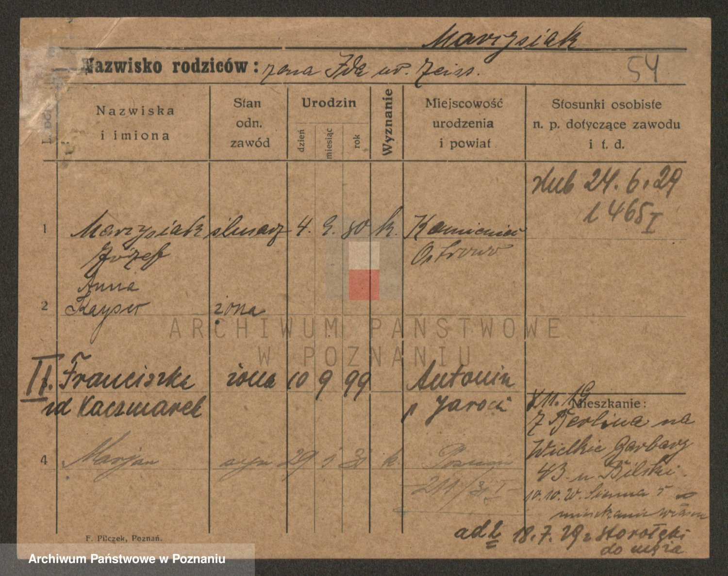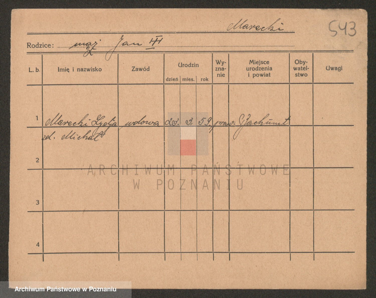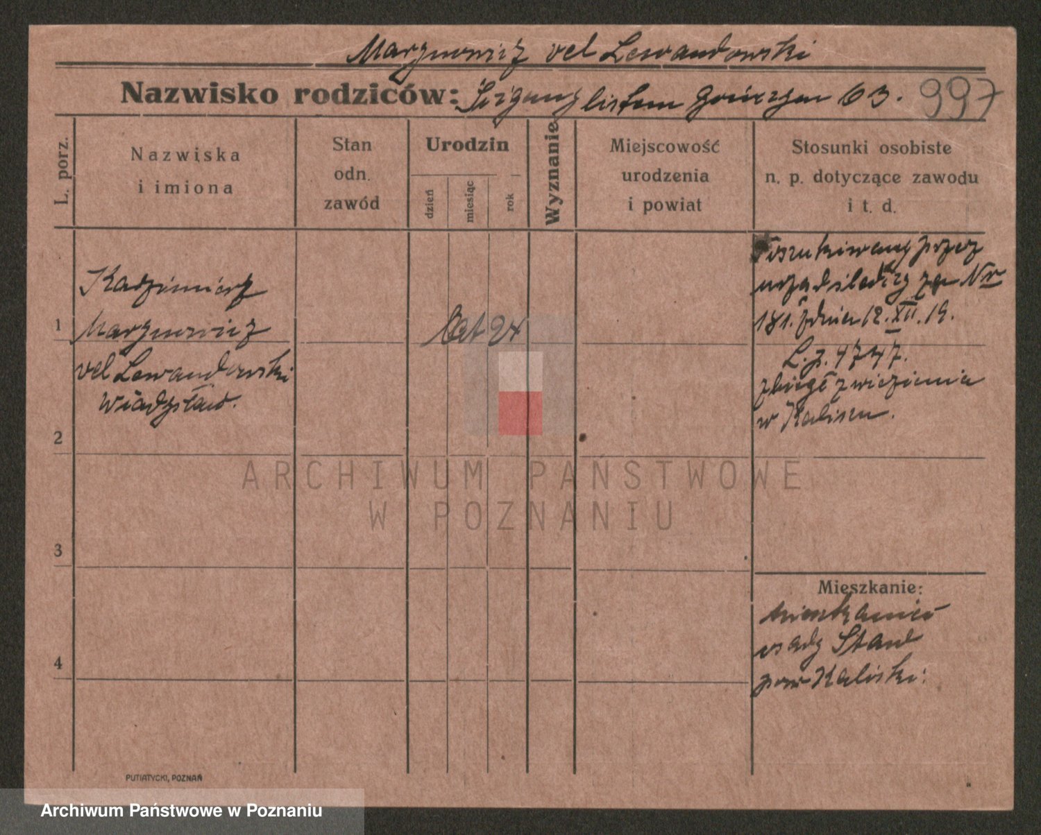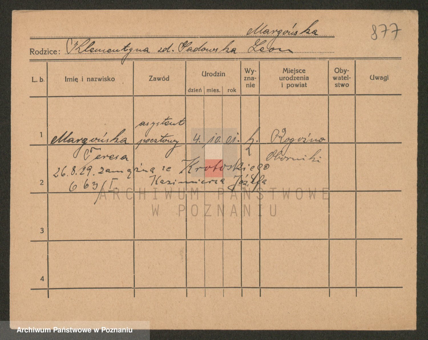 Podgląd karty osobowej dostępny jest po kliknięciu na nazwisko lub ikonkę karty. Można dokonywać powiększenia (ikony na górze) lub przechodzić między kolejnymi skanami (strzałki po bokach).